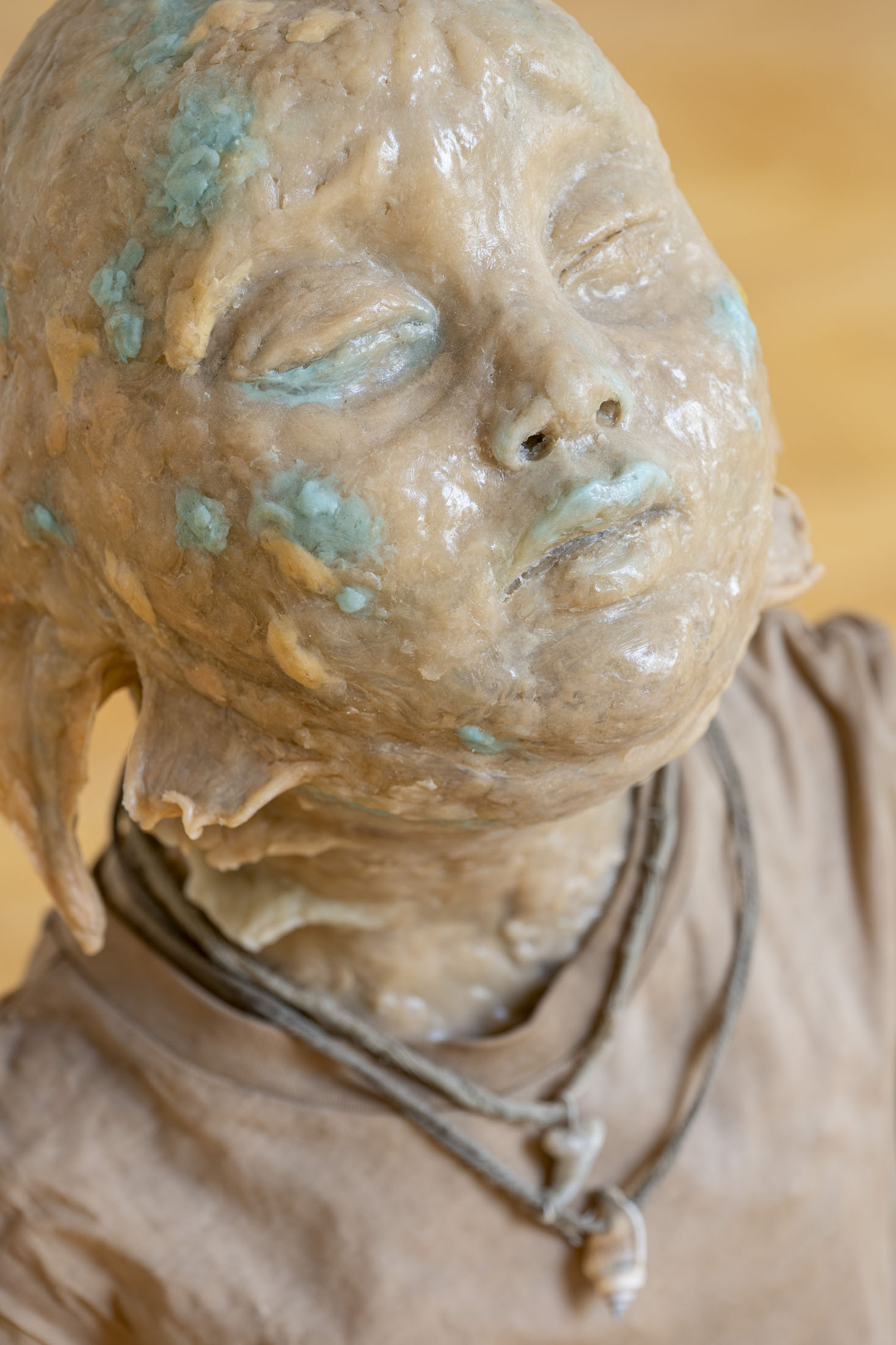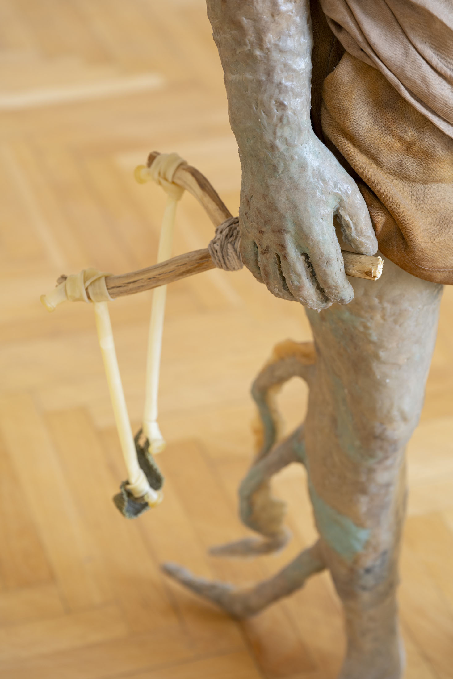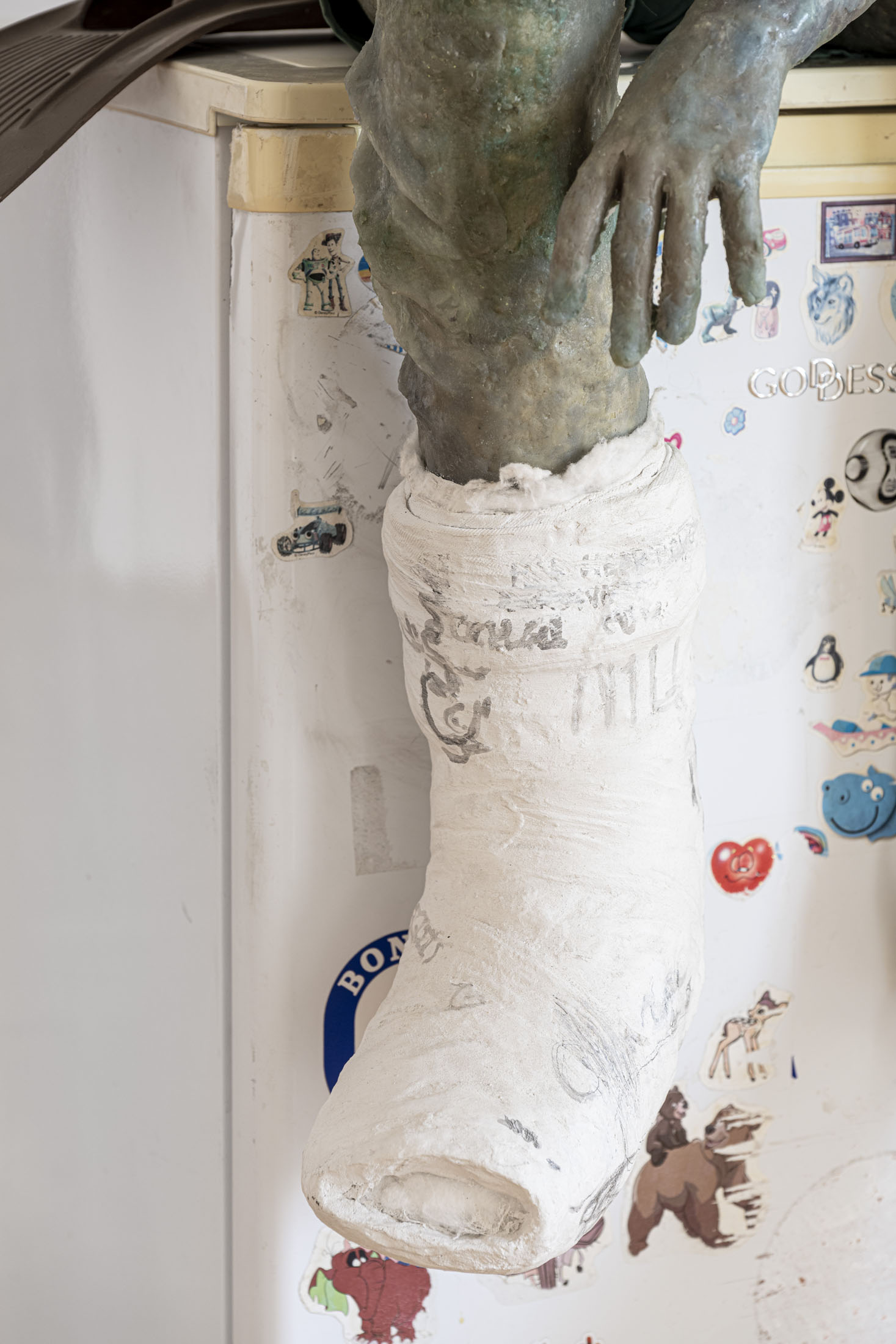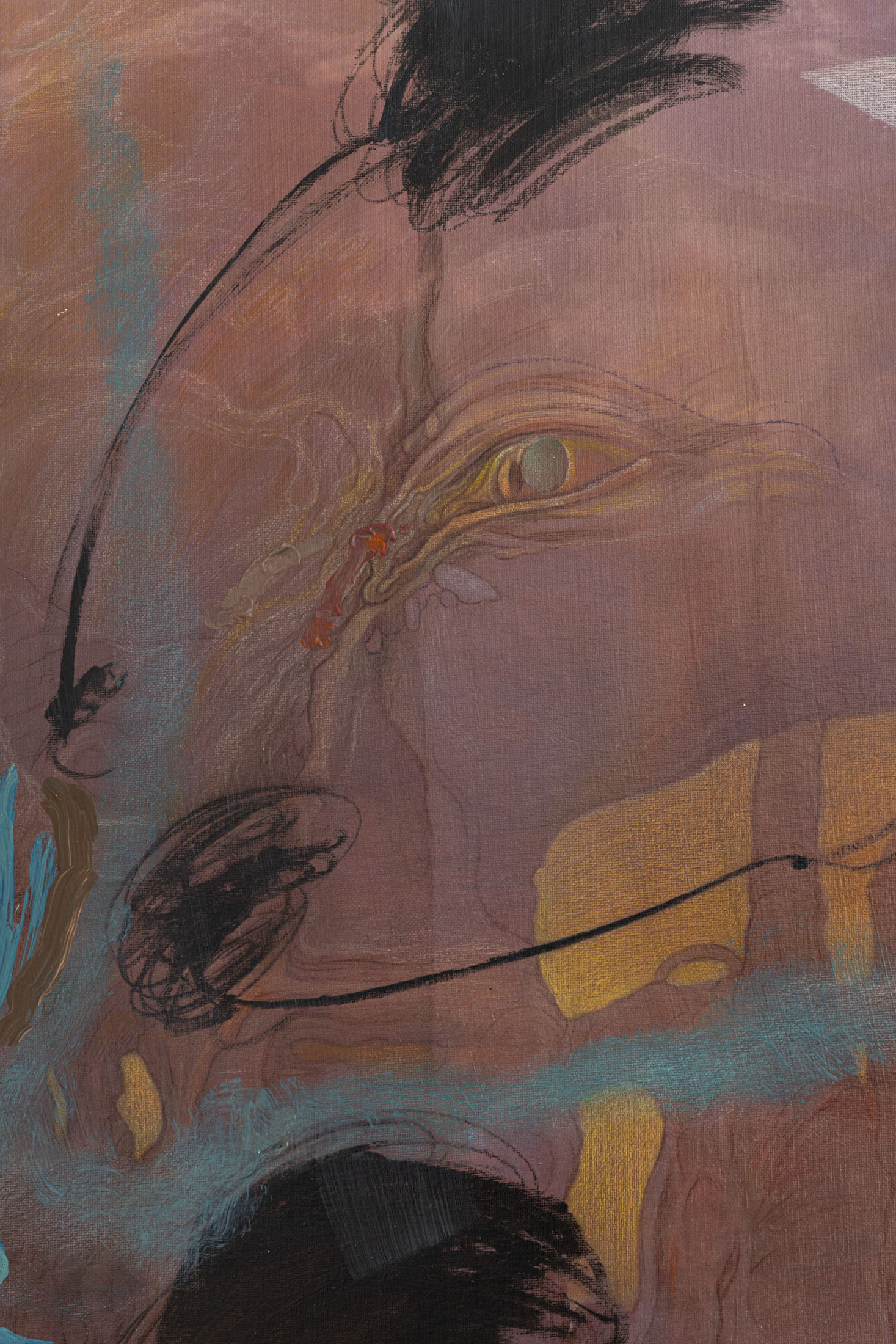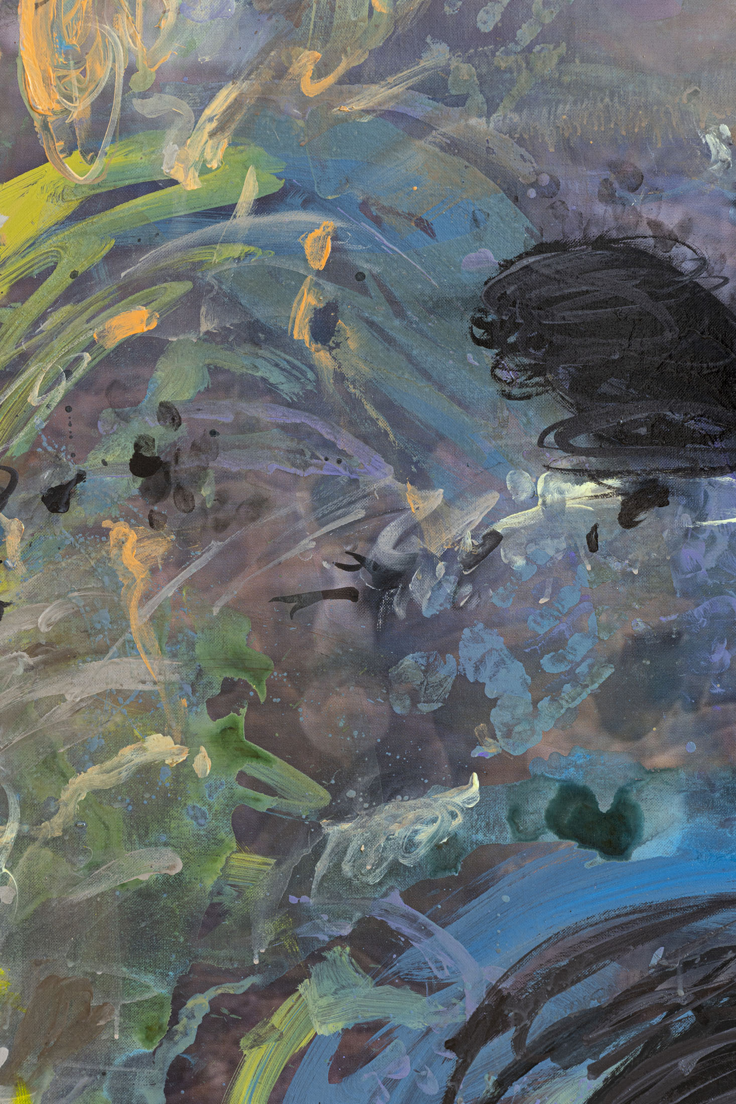 Michele Gabriele (b. 1983, Fondi, lives in Milan) creates fragmentary narratives set in an elusive space-time between the past, the future and a parallel present that comes before the apocalypse or lingers after it. In his original line of hyper-realistic figurative sculptures, he connects mythological creatures – Tritons – with sci-fi and pop culture references and museum aesthetics. The figures appear dreamlike, silent and contemplative. We do not know their origin or fate, yet their presence carries the power of an archaeological find from the future. He complements his vision of his own world with a series of abstract paintings in which gestural strokes and minute details transform noise and digital layers into an intuitive discovery of meanings, drawing on the surrealist practice of decalcomania.