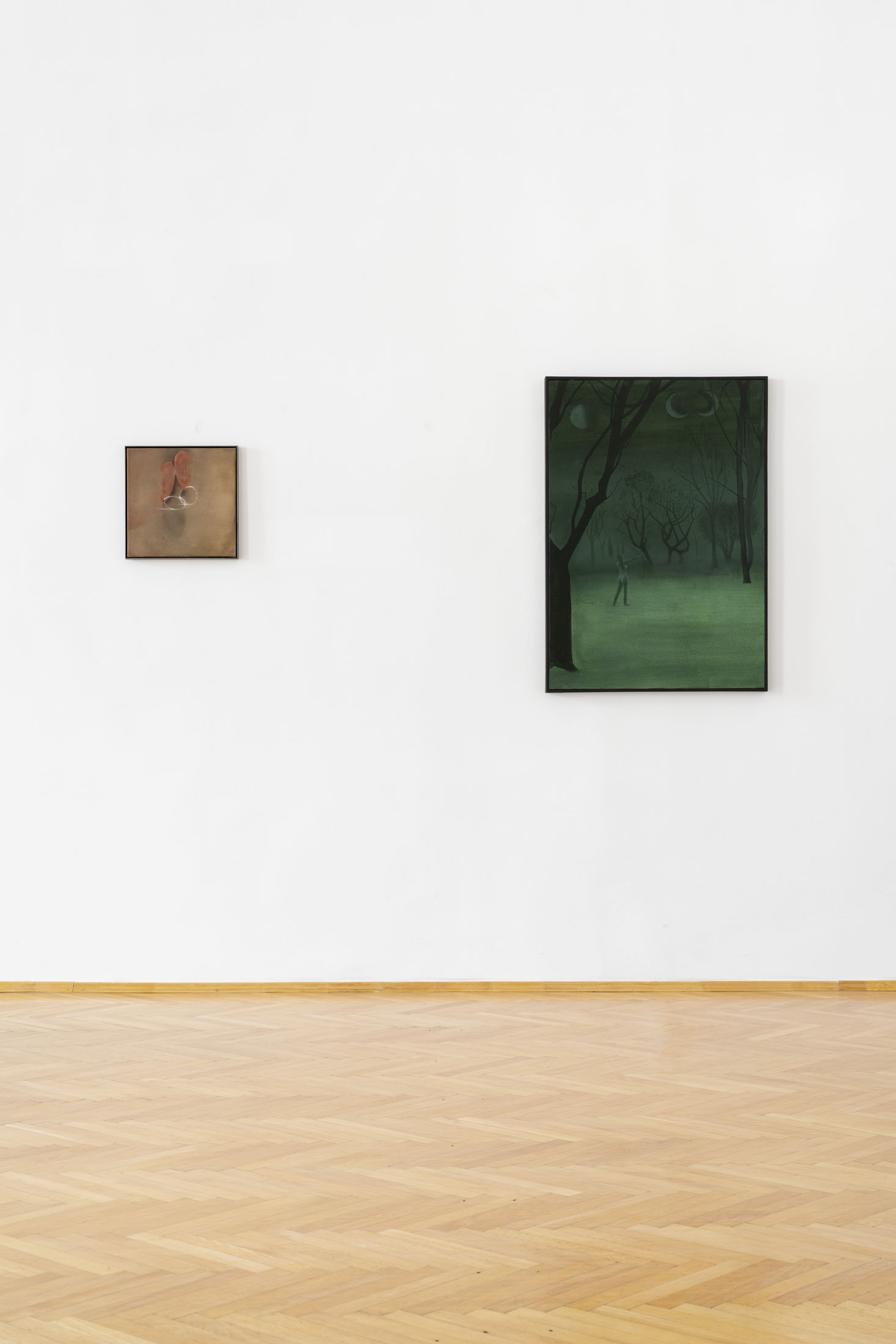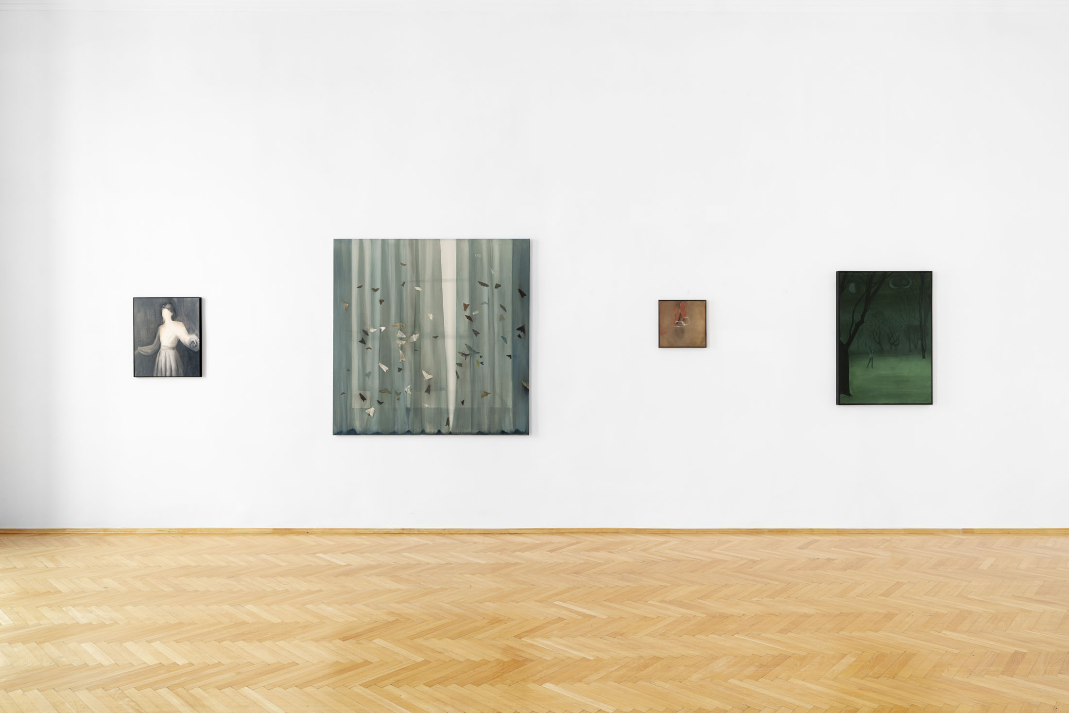 The international group exhibition Fading Moon, Rising Light is a free sequence to the earlier project Full Moon Dreamers (Steinhauser Gallery, 2023). It further explores atmospheres, narratives and a distorted reality rooted in the mystical and surreal realms of night and dreams, focusing on the fragile moment between deep sleep and awakening known as the hypnopompic state. This brief phase, befogging the lines between mental projections and the real world, unfolds in the transition from REM sleep to consciousness. Inner visions dawdle, logic gives way, and the sense of self softens. Unfamiliar voices echo through the space; objects appear eerily familiar and, at the same time, unsettlingly strange. The atmosphere remains quietly charged – as if something happened, yet no one speaks of it.