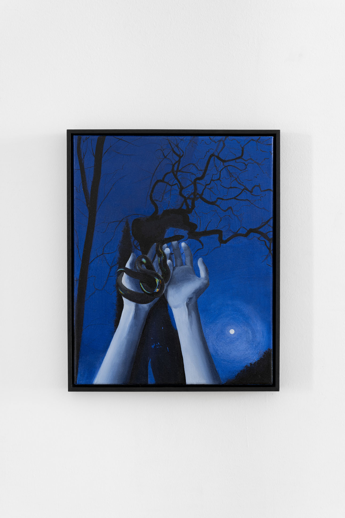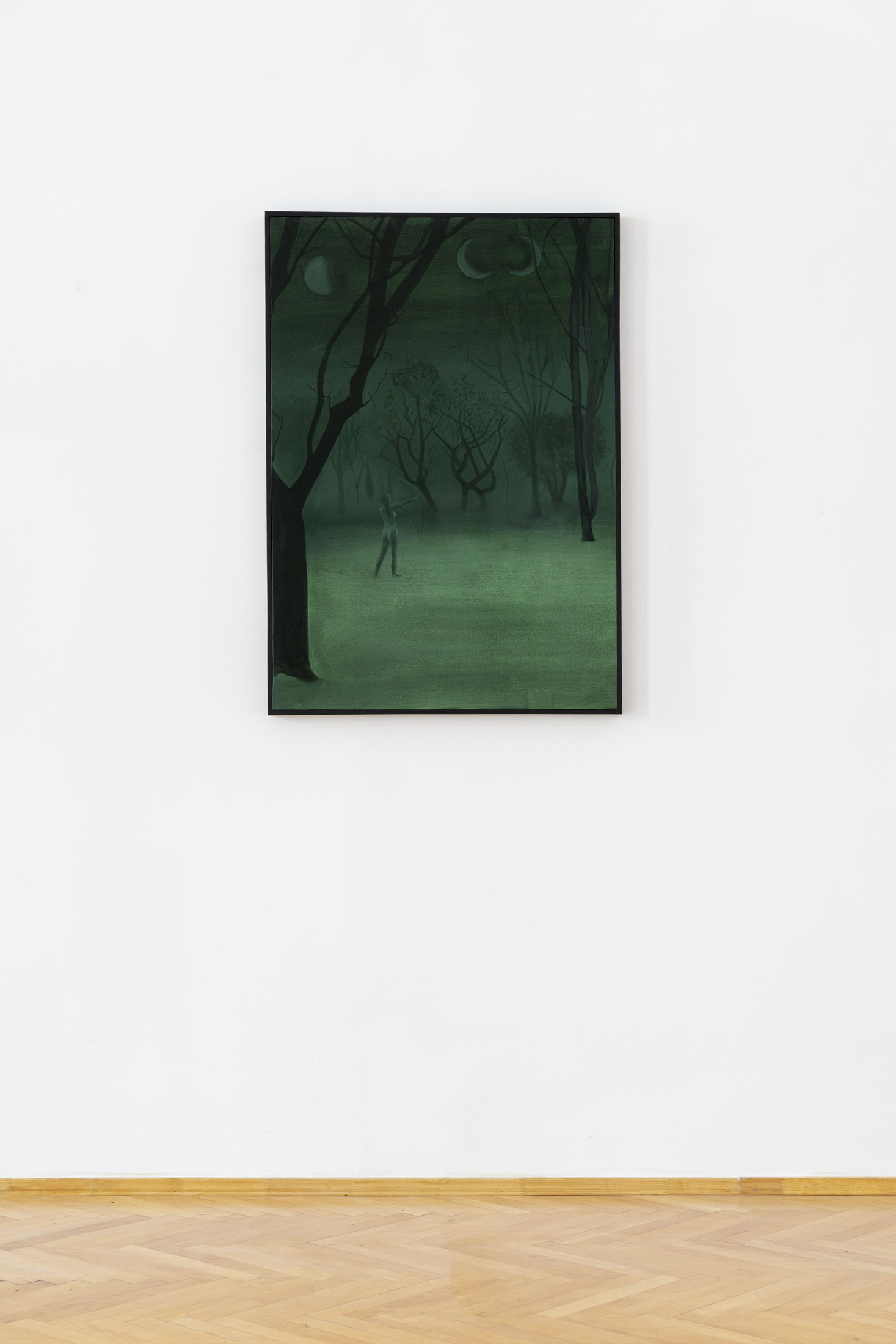 In her intimate oil paintings, Beatrice Alici (b. 1992, Venice; based in Milan) explores the bond between people and nature that appears within night scenes set in undefined historical moments and spaces. Strong heroines rise, enveloped in the mystique of darkness and moonlight, caught in passing moments inspired by folklore and mythology. Through straightforward narratives and thoughtful compositions, Alici crafts a surreal, yet historicising atmosphere that highlights her affinity to psychological depth and symbolism, evoking the sacred and the archetypal feminine.