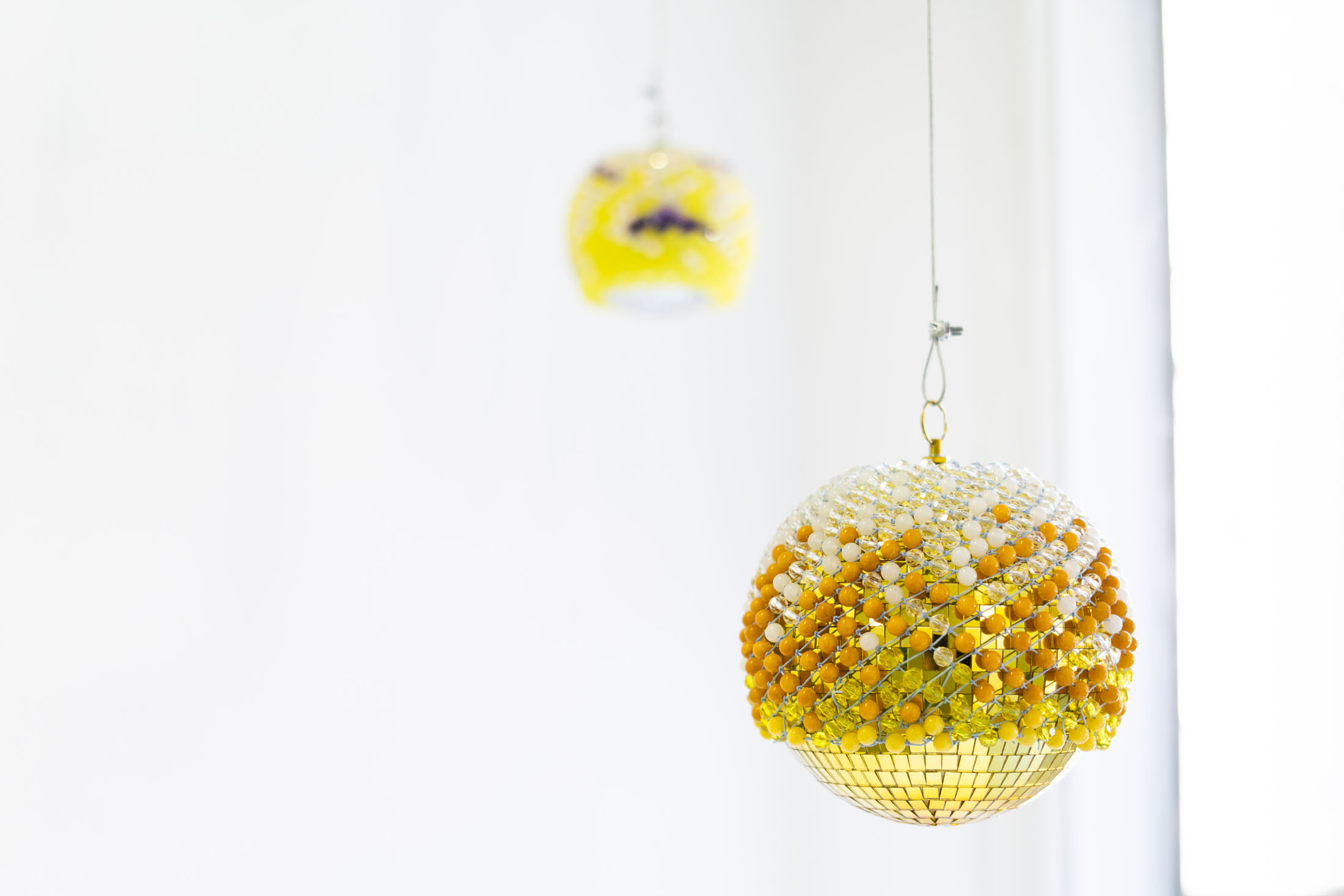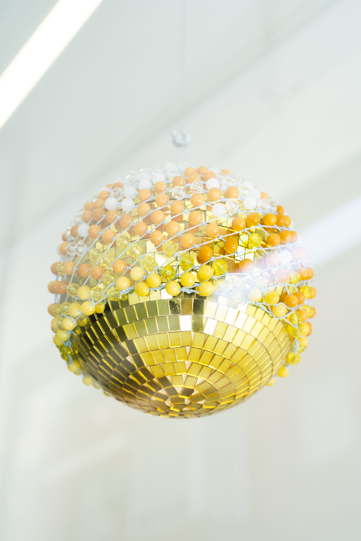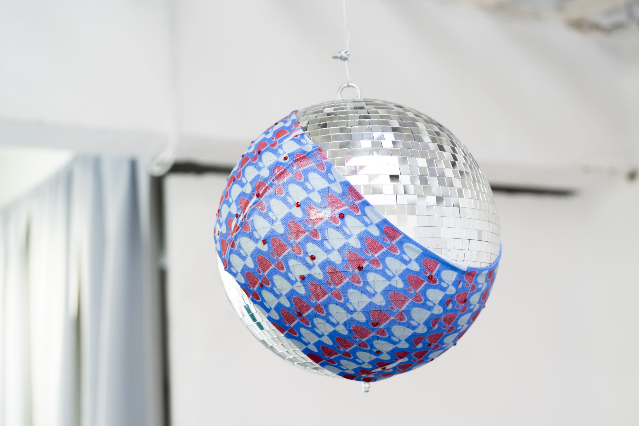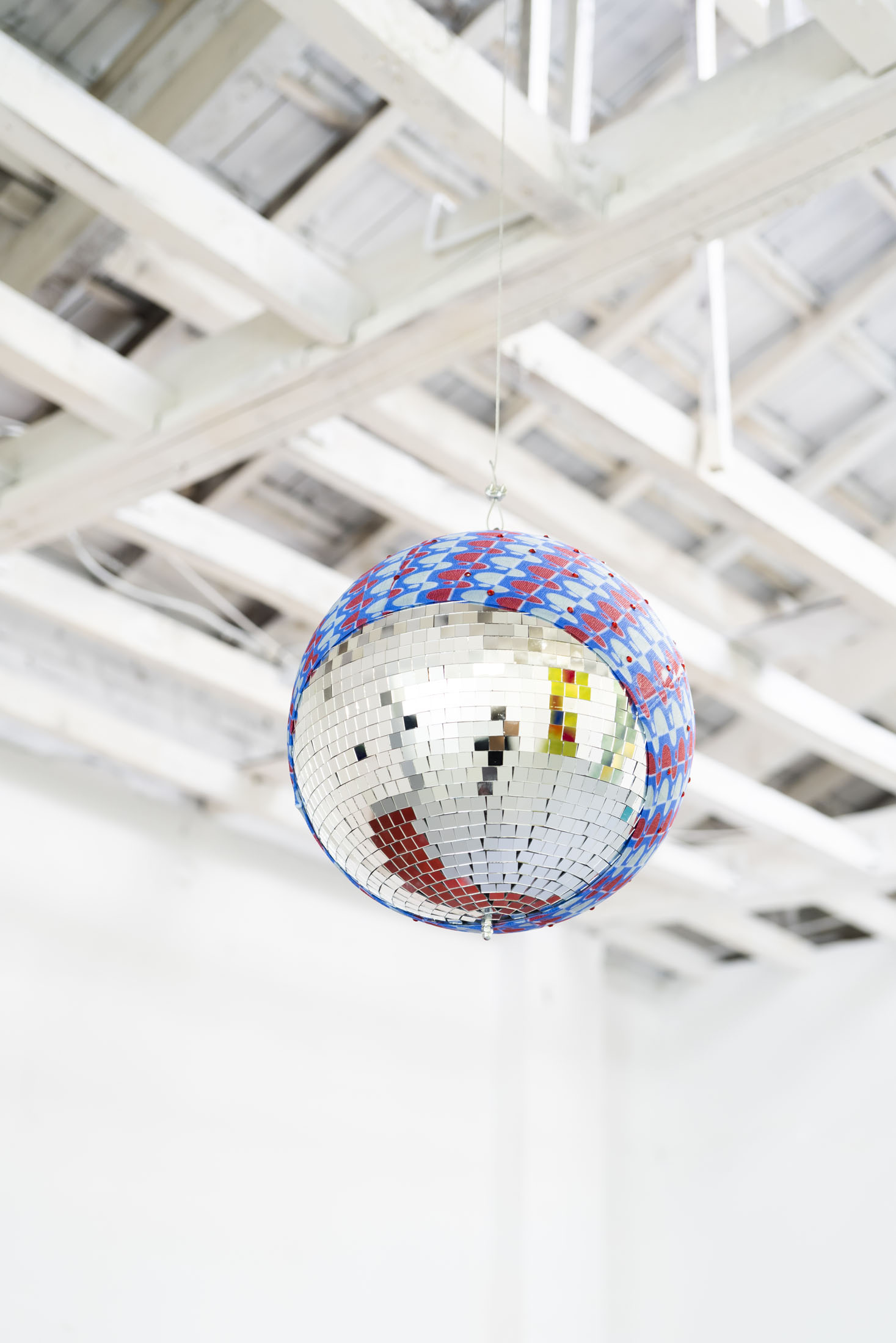 a historical and emotional weight, underscoring the symbolic power of cultural forms that, although not always deeply studied, carry a strong political message. Through her t-shirts, rings, disco balls, the artist draws from romantic ballads and pop music, but also from European modernism, pushing them to the extreme and highlighting the flaws and cracks of aesthetic patterns appropriated by popular culture in its aspiration to symbolize progress.