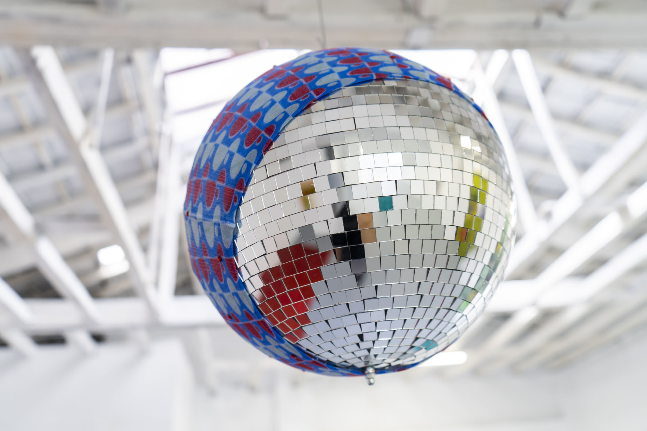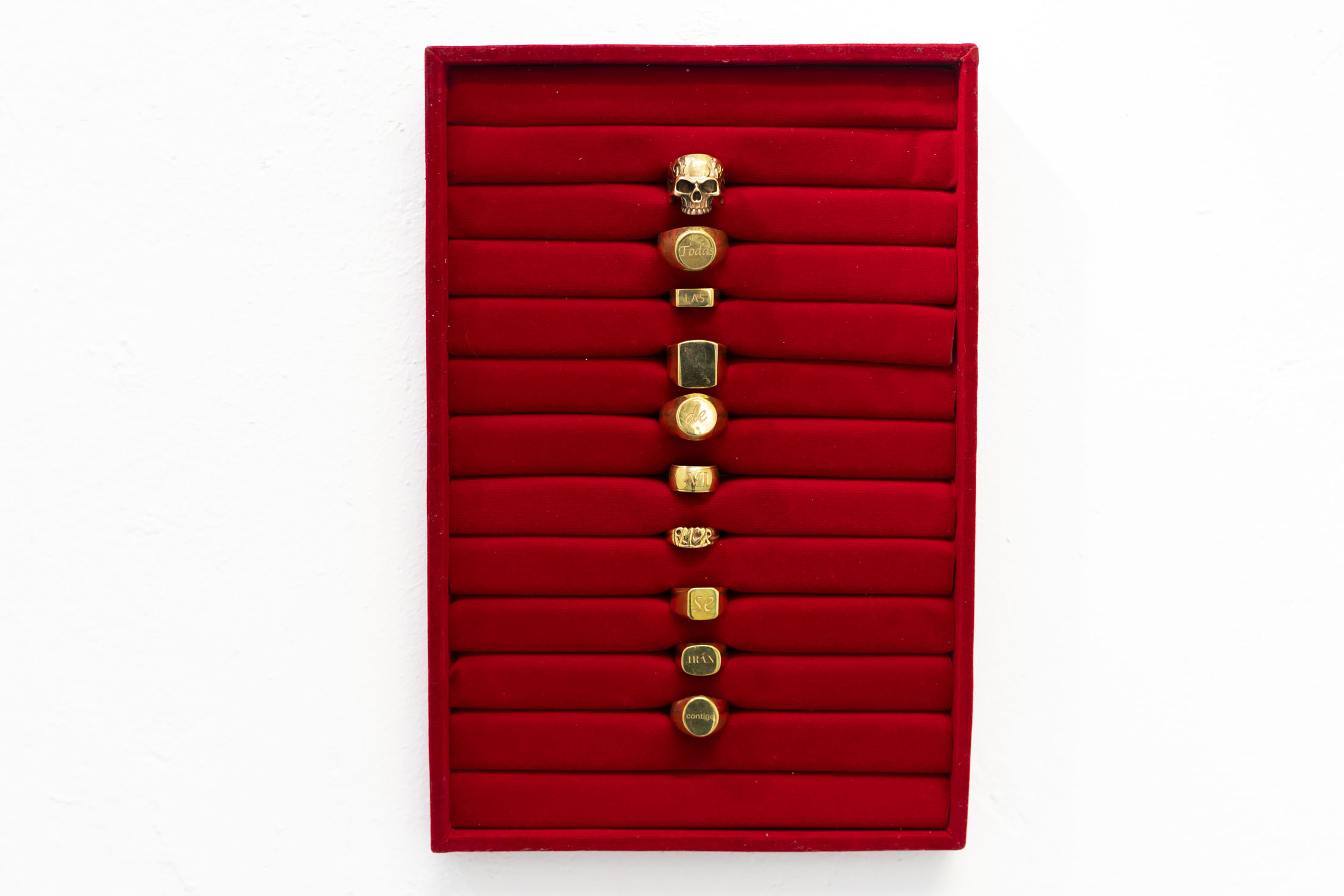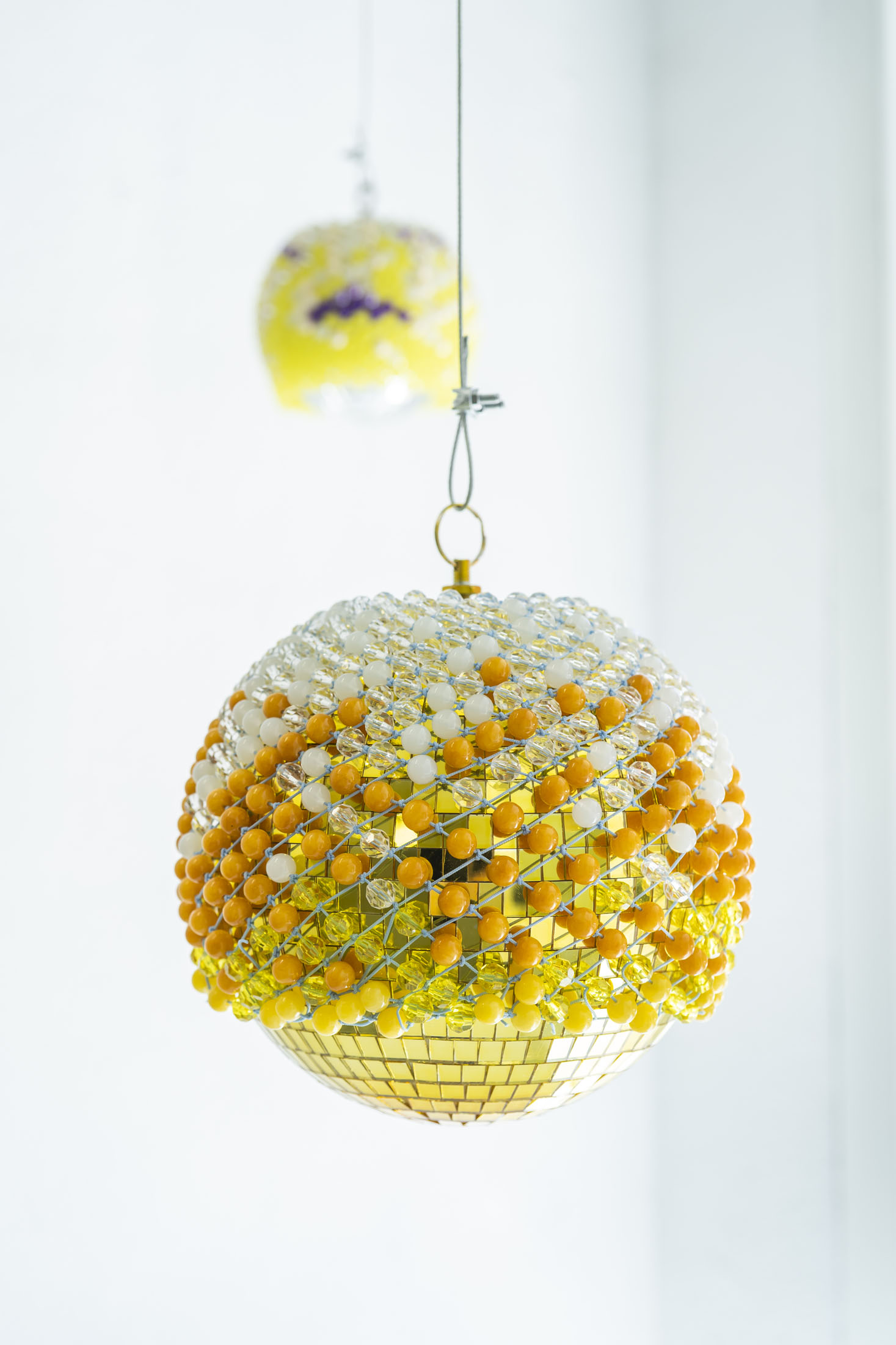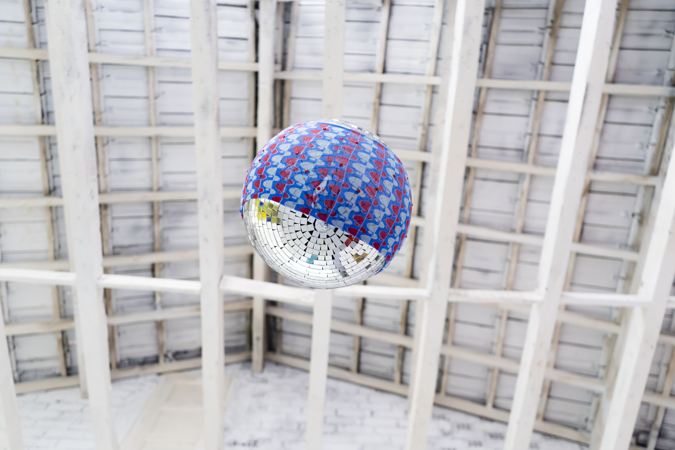 a historical and emotional weight, underscoring the symbolic power of cultural forms that, although not always deeply studied, carry a strong political message. Through her t-shirts, rings, disco balls, the artist draws from romantic ballads and pop music, but also from European modernism, pushing them to the extreme and highlighting the flaws and cracks of aesthetic patterns appropriated by popular culture in its aspiration to symbolize progress.