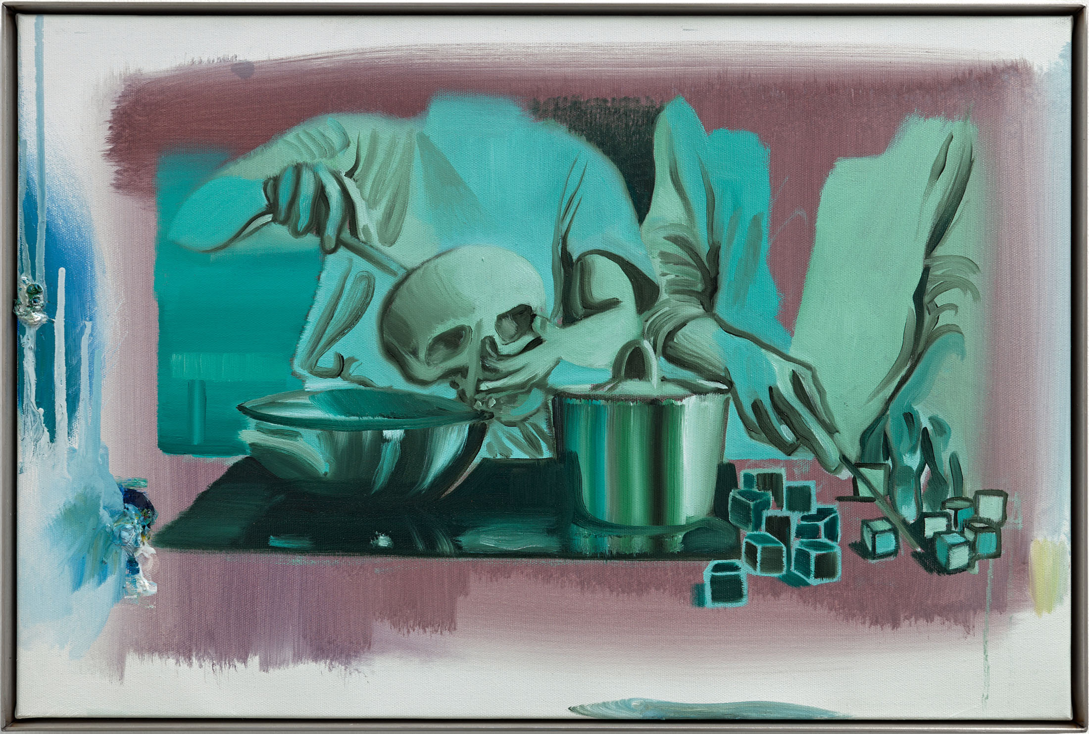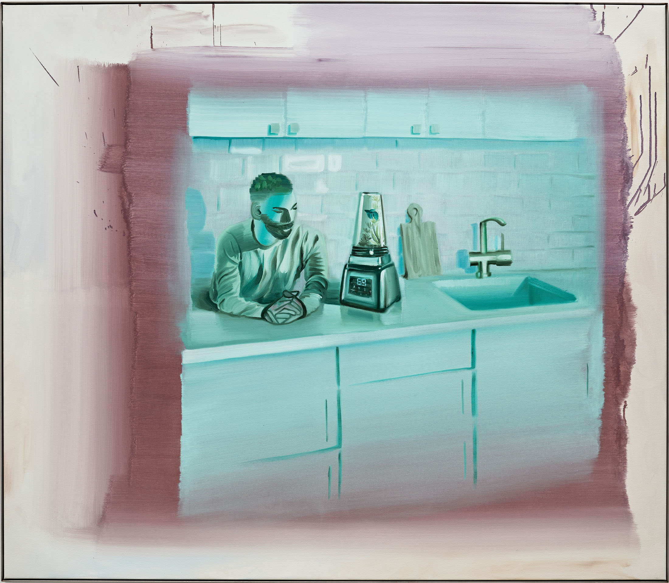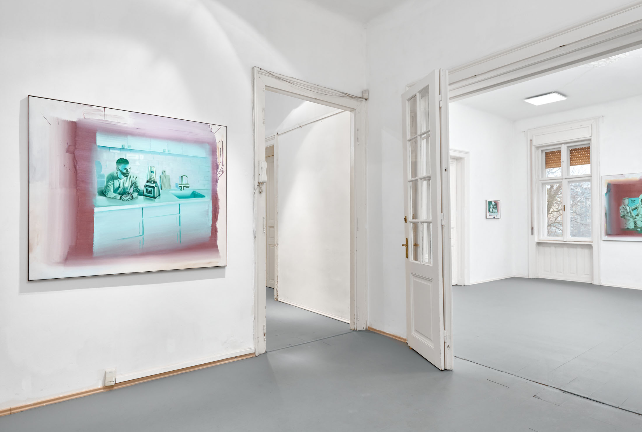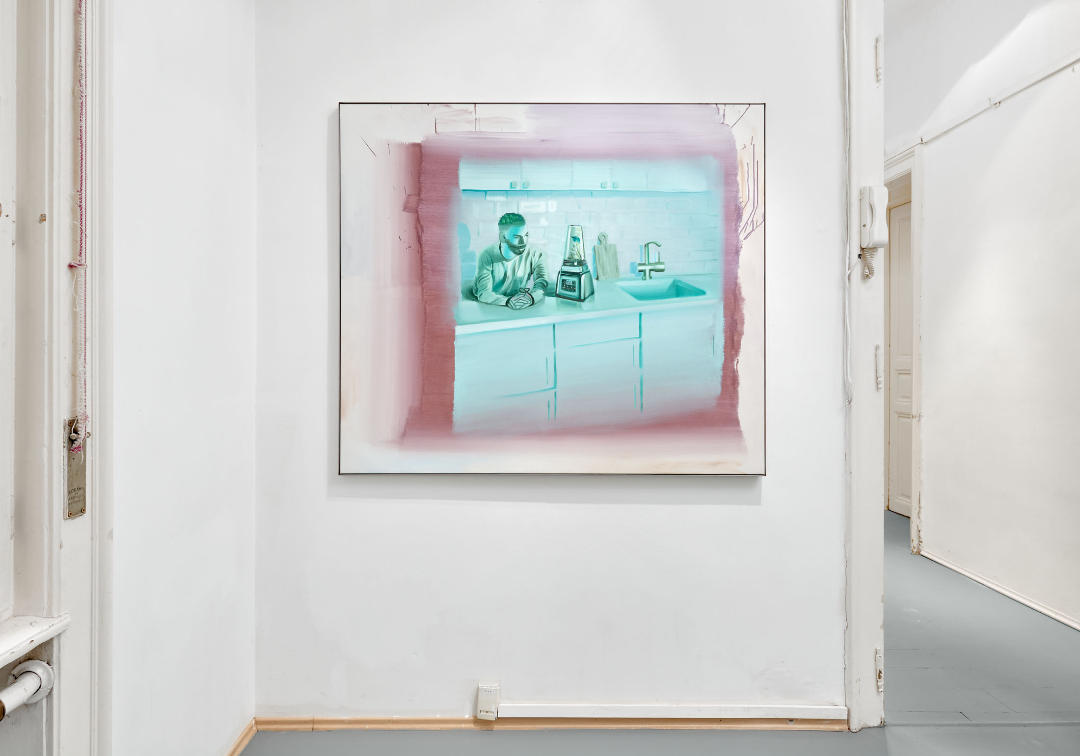 The largest painting in the exhibition is based on a scene of a woman bathing and a man getting out of a car and taking off his shoes. The composition is linked to the rest of the series by an unexpected, conceptual painterly gesture: a hand washing dishes, reminiscent of a Malevich Suprematist composition, transports the viewer back to the kitchen. The closing image thus appears as a concluding, yet thought-provoking act of cooking and being together.