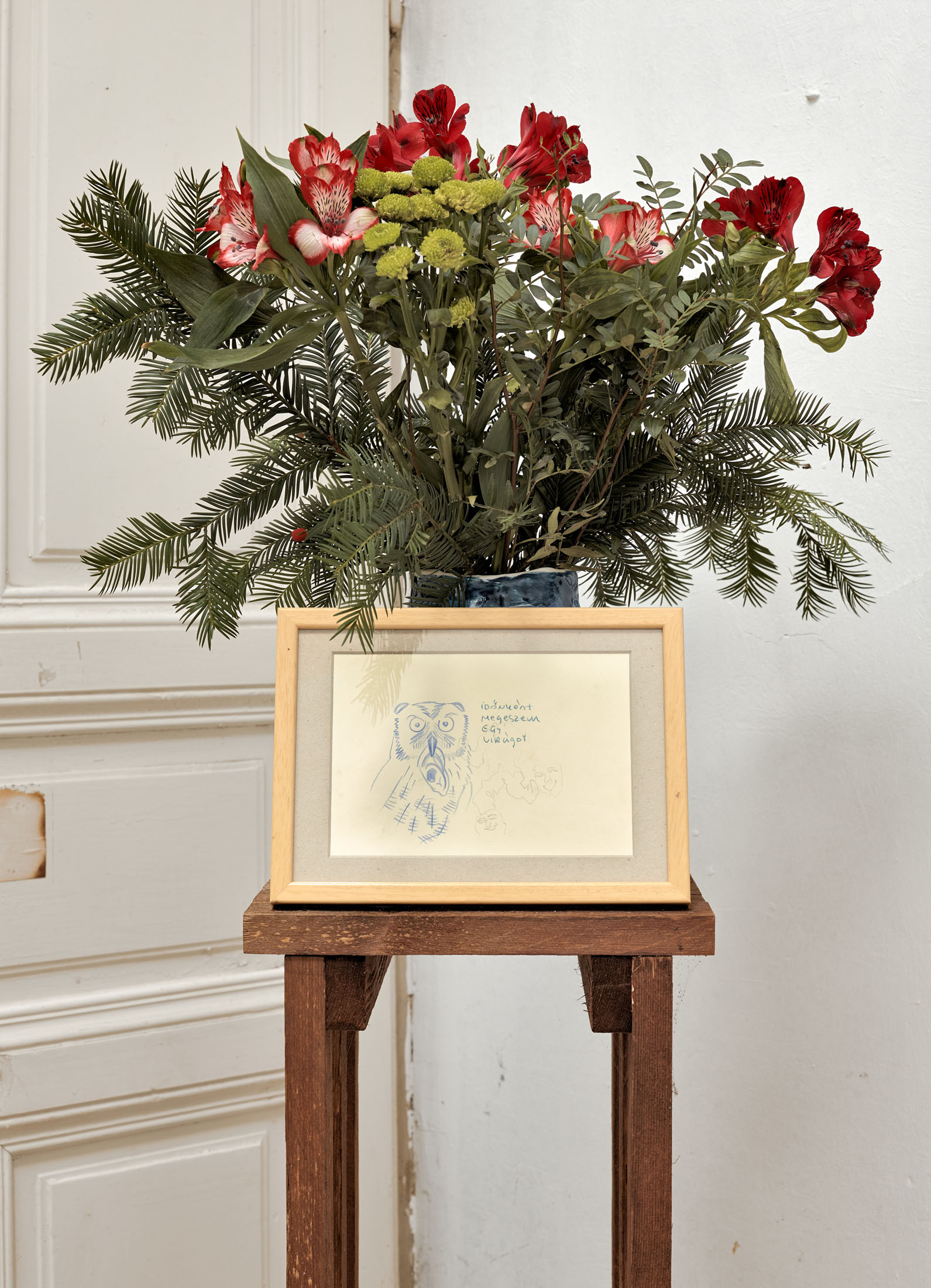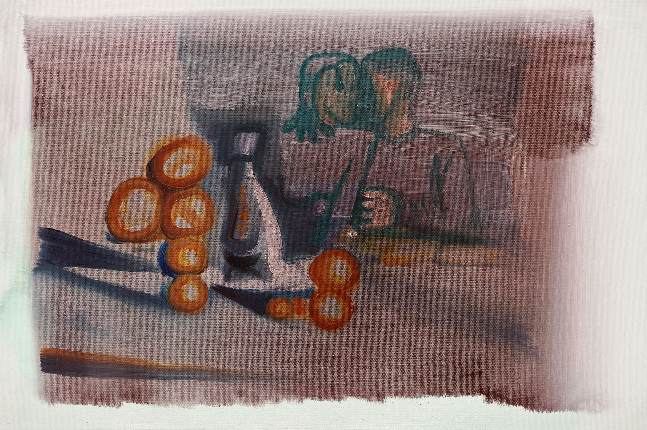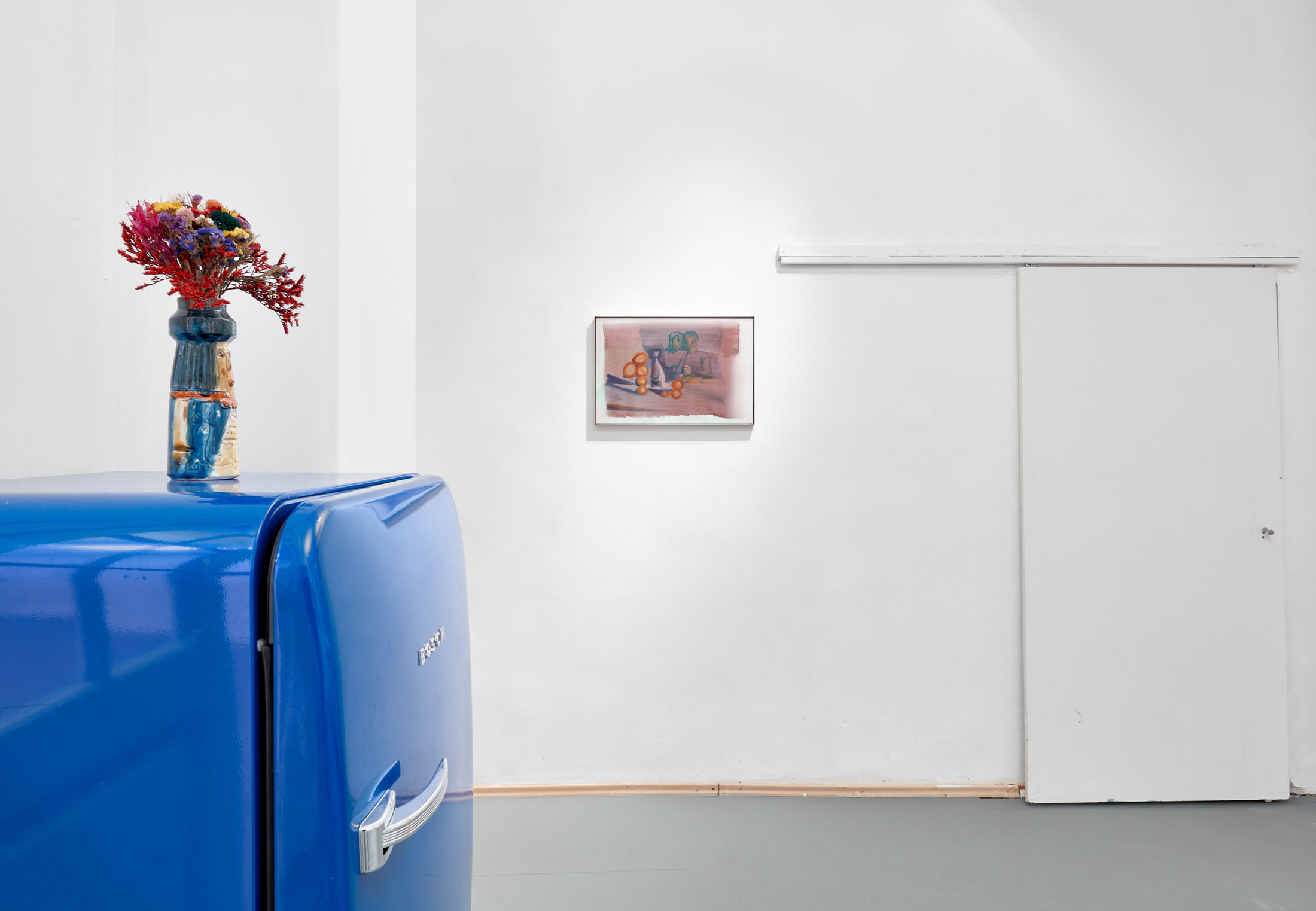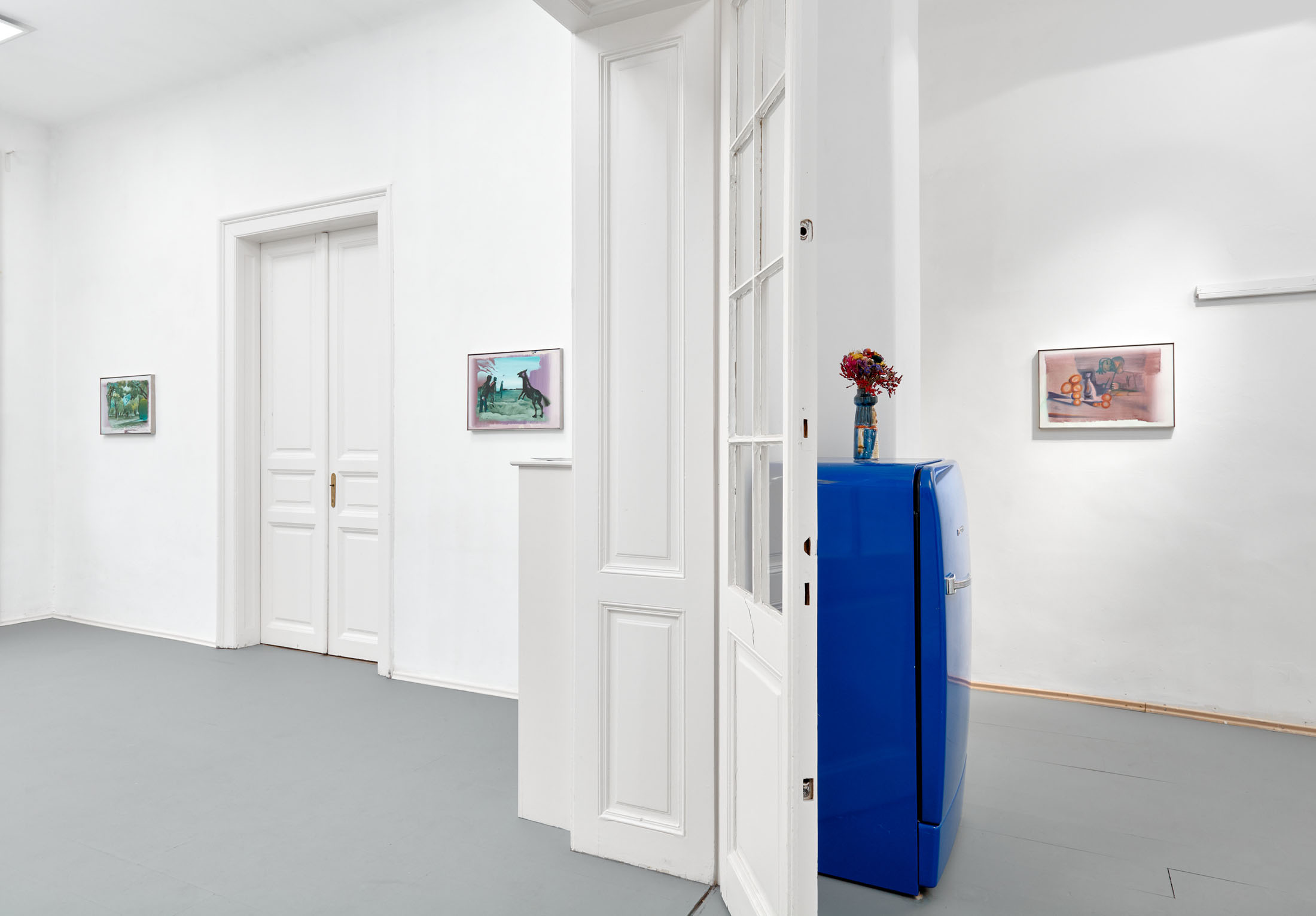 The largest painting in the exhibition is based on a scene of a woman bathing and a man getting out of a car and taking off his shoes. The composition is linked to the rest of the series by an unexpected, conceptual painterly gesture: a hand washing dishes, reminiscent of a Malevich Suprematist composition, transports the viewer back to the kitchen. The closing image thus appears as a concluding, yet thought-provoking act of cooking and being together.