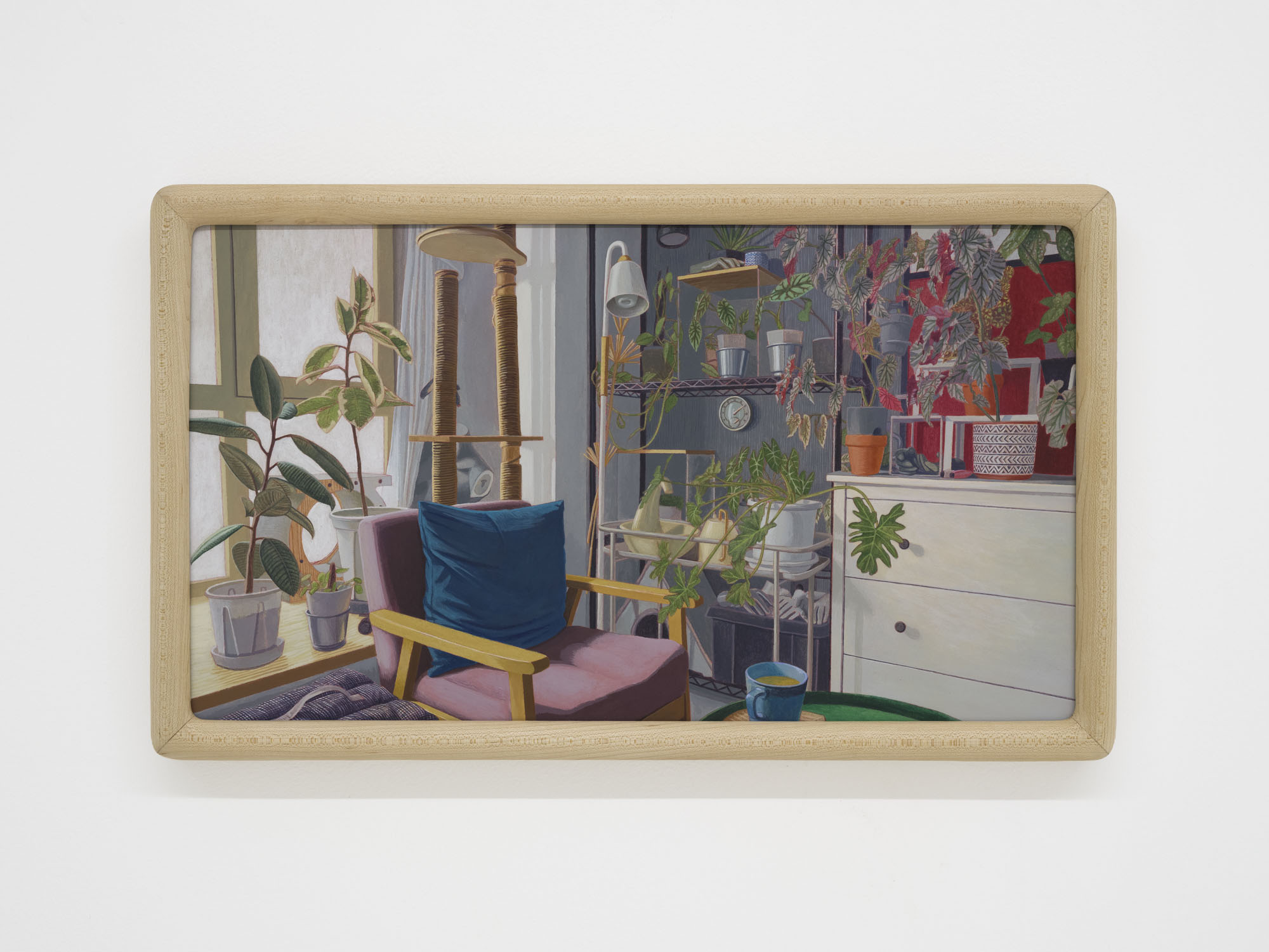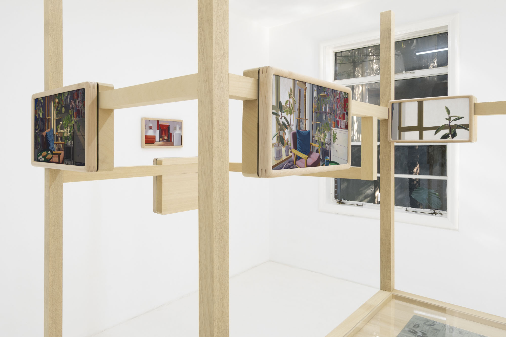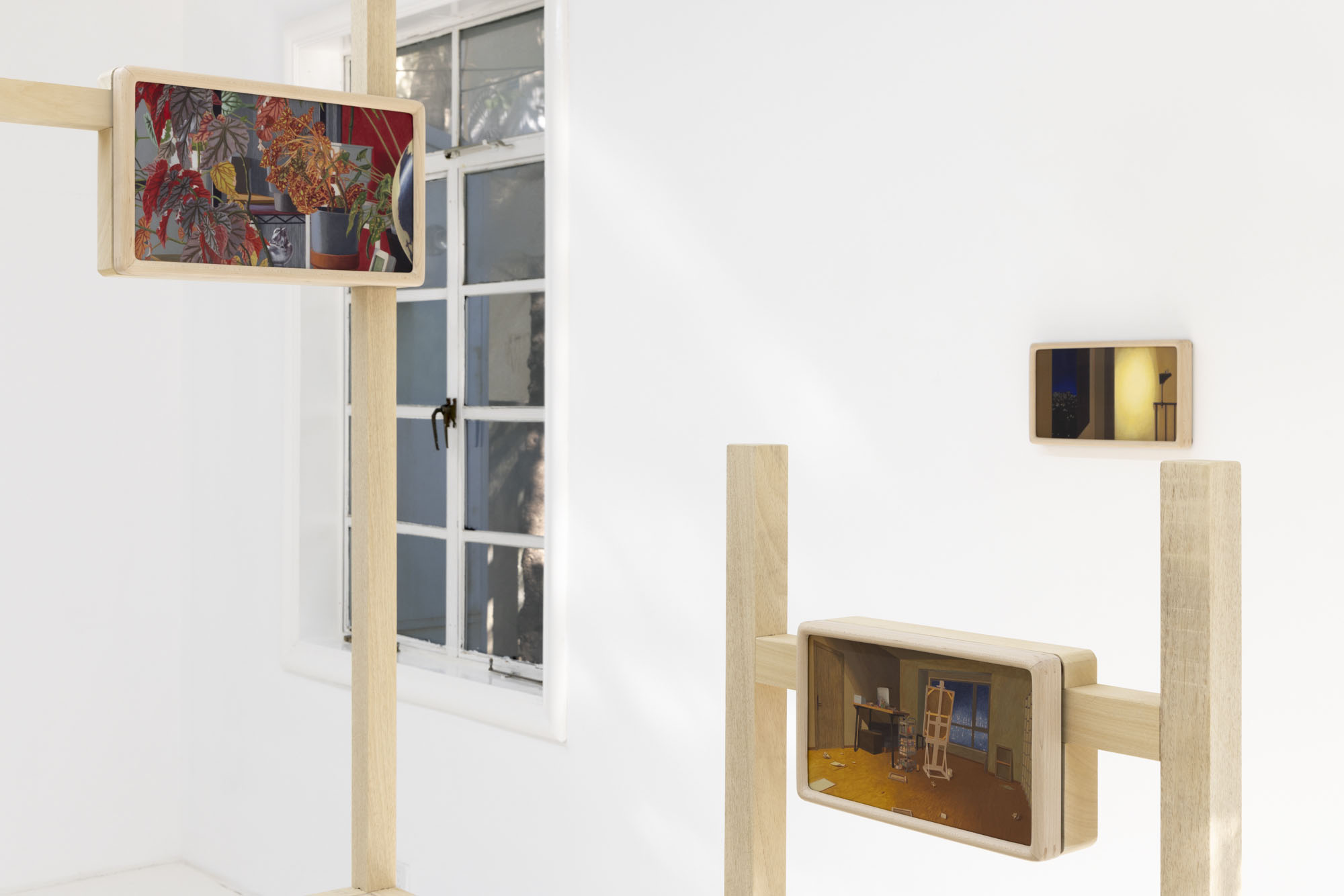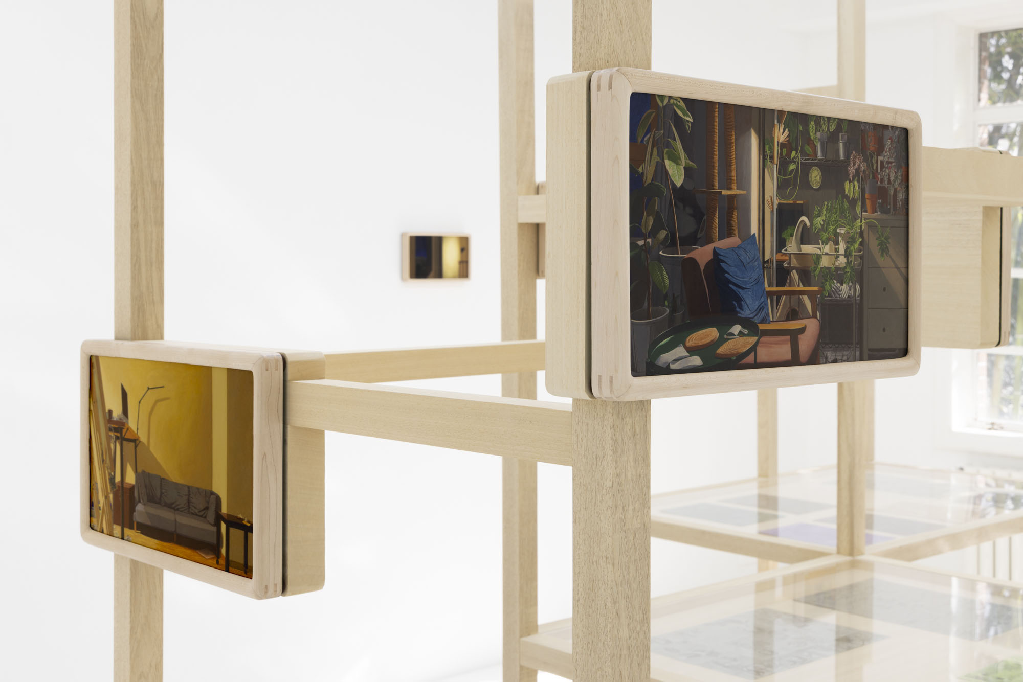 Detail conjures a sense of reality; repetition constructs the dimension of time. The same rooms recur across multiple works, depicted from shifting perspectives, at varying distances, and in changing times of day. Objects altered ever so slightly, shadows rising and receding, color relationships rearranged… Familiar spaces we linger in day after day are constantly shapeshifting through human intervention and the passing of hours. Rather than meeting the works all at once upon the wall, viewers encounter them gradually as they unfold across custom-built wooden structures throughout the gallery. The paintings rest on changing planes, interlaced and offset, inviting viewers not simply to look, but to meander–to peer across gaps, turn back, and double-take. Rooms, plants, windows and vistas reappear like déjà vu from a half-remembered dream, or the sudden flash of memory that arrives unbidden.