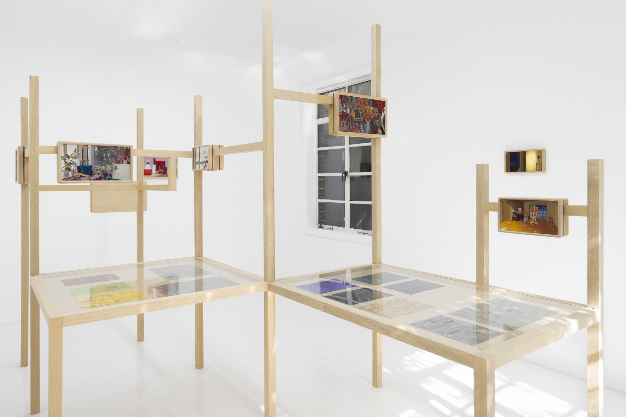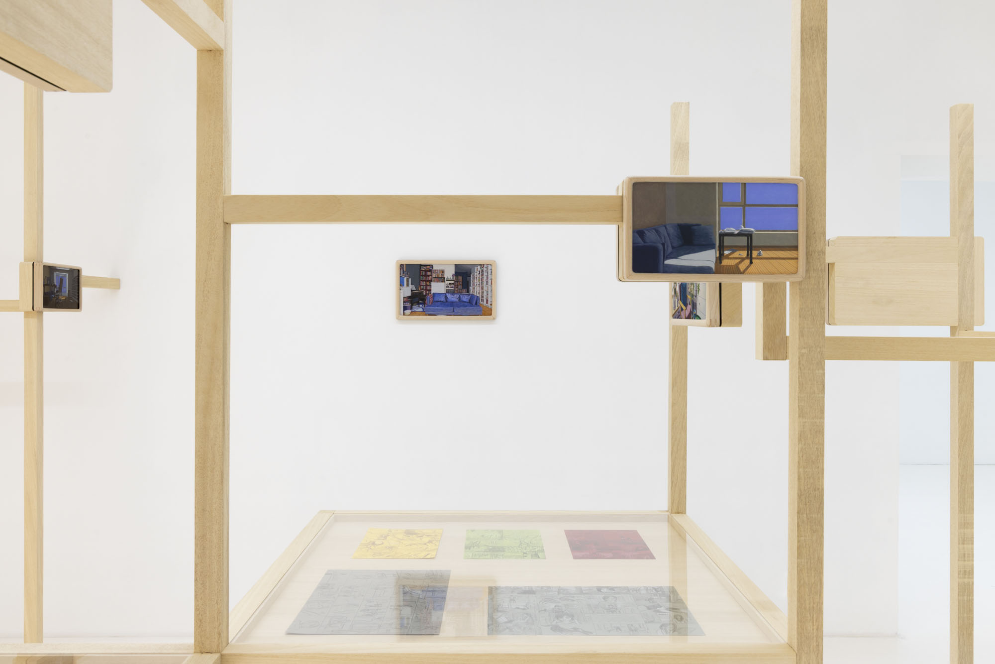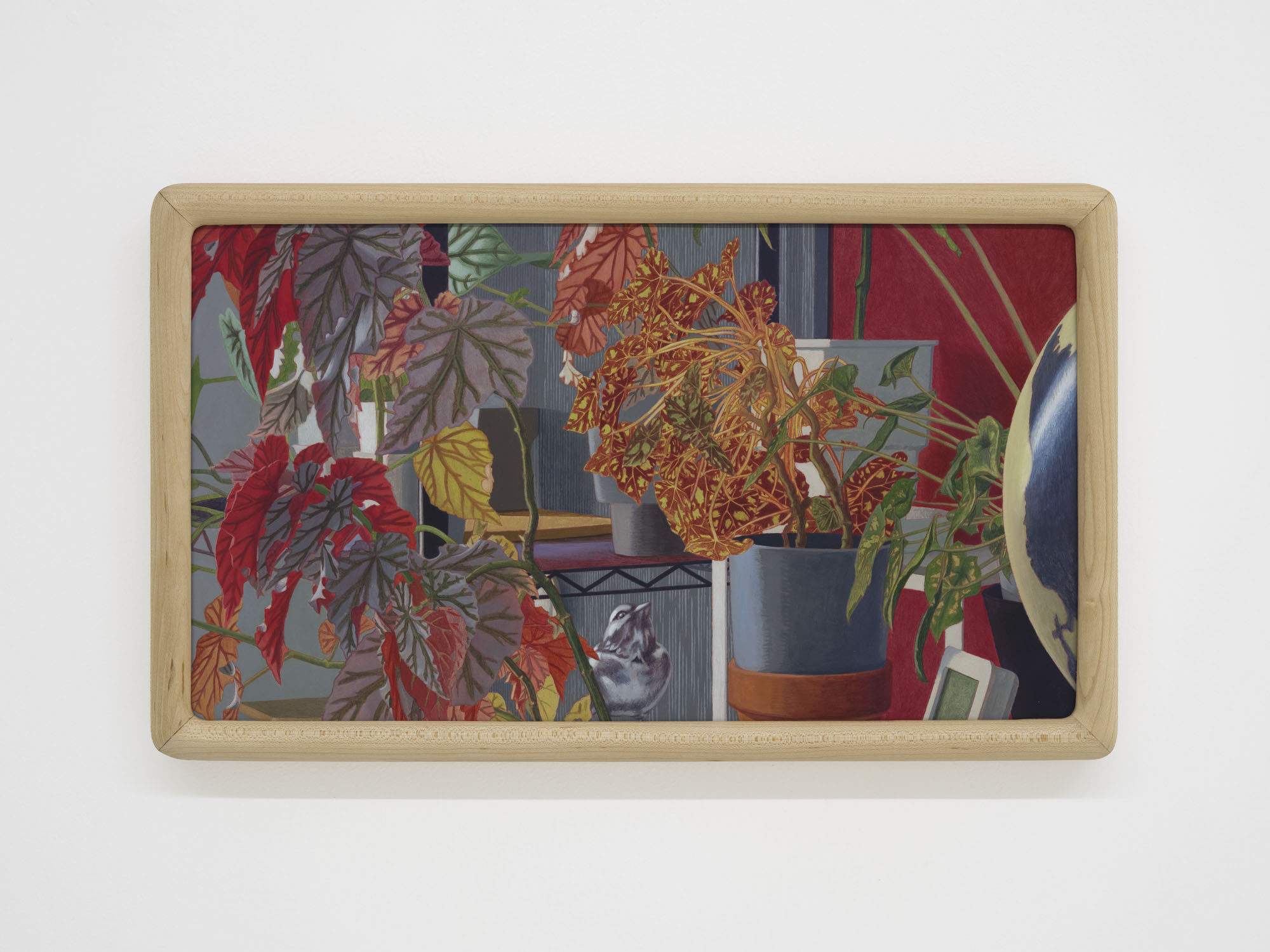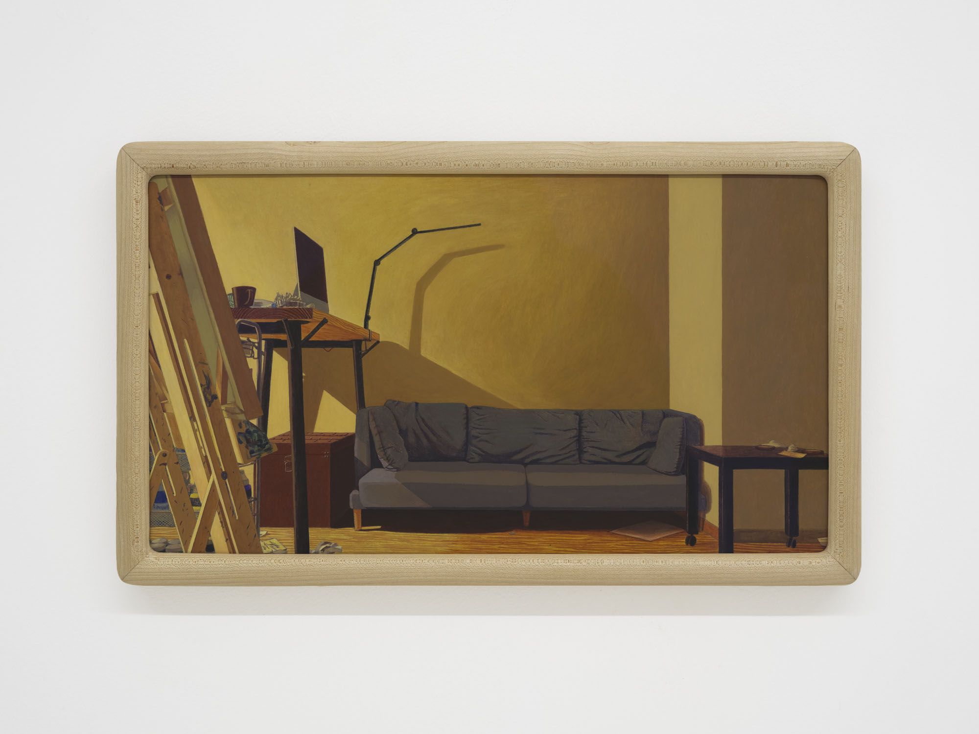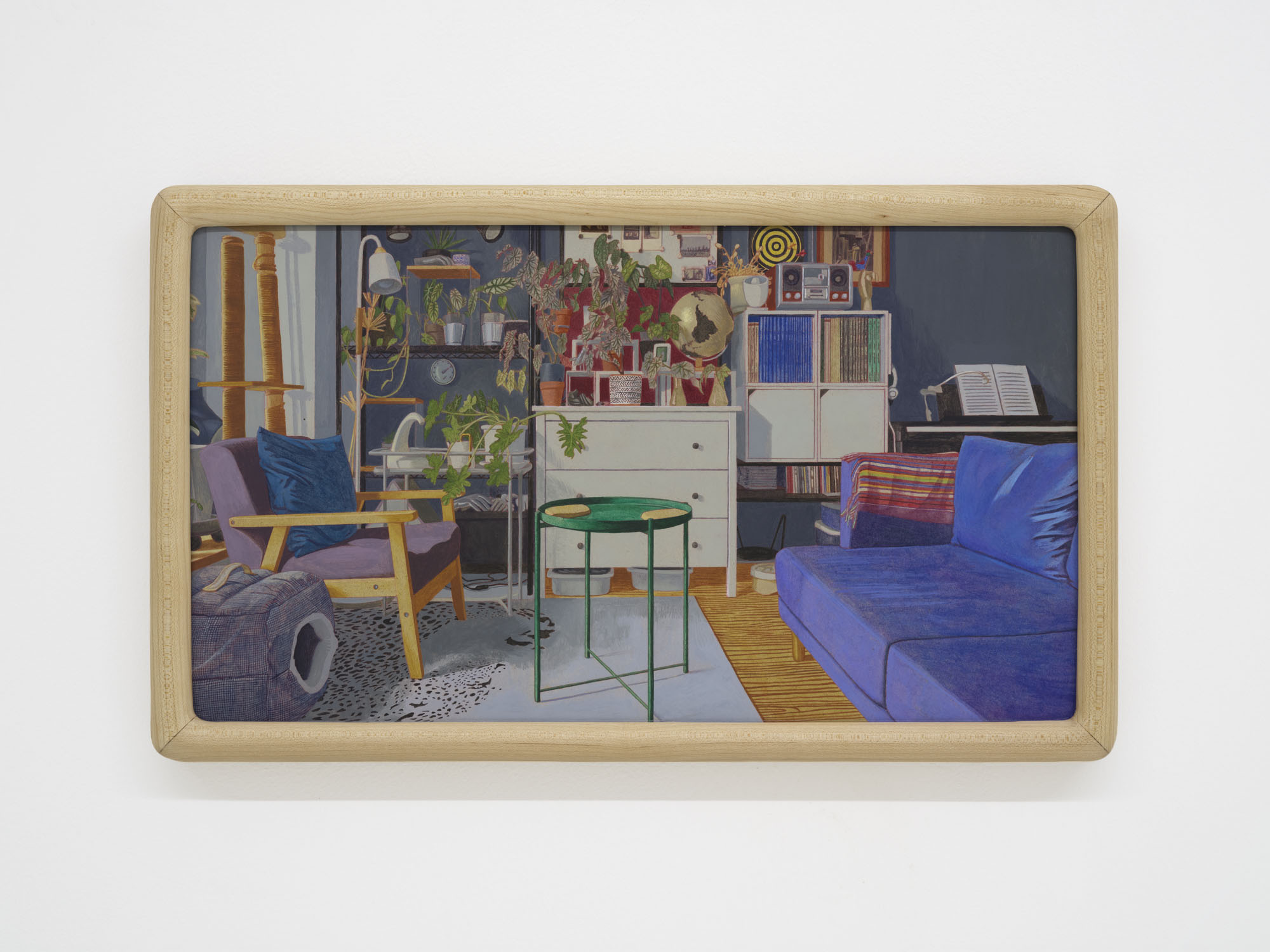 Detail conjures a sense of reality; repetition constructs the dimension of time. The same rooms recur across multiple works, depicted from shifting perspectives, at varying distances, and in changing times of day. Objects altered ever so slightly, shadows rising and receding, color relationships rearranged… Familiar spaces we linger in day after day are constantly shapeshifting through human intervention and the passing of hours. Rather than meeting the works all at once upon the wall, viewers encounter them gradually as they unfold across custom-built wooden structures throughout the gallery. The paintings rest on changing planes, interlaced and offset, inviting viewers not simply to look, but to meander–to peer across gaps, turn back, and double-take. Rooms, plants, windows and vistas reappear like déjà vu from a half-remembered dream, or the sudden flash of memory that arrives unbidden.