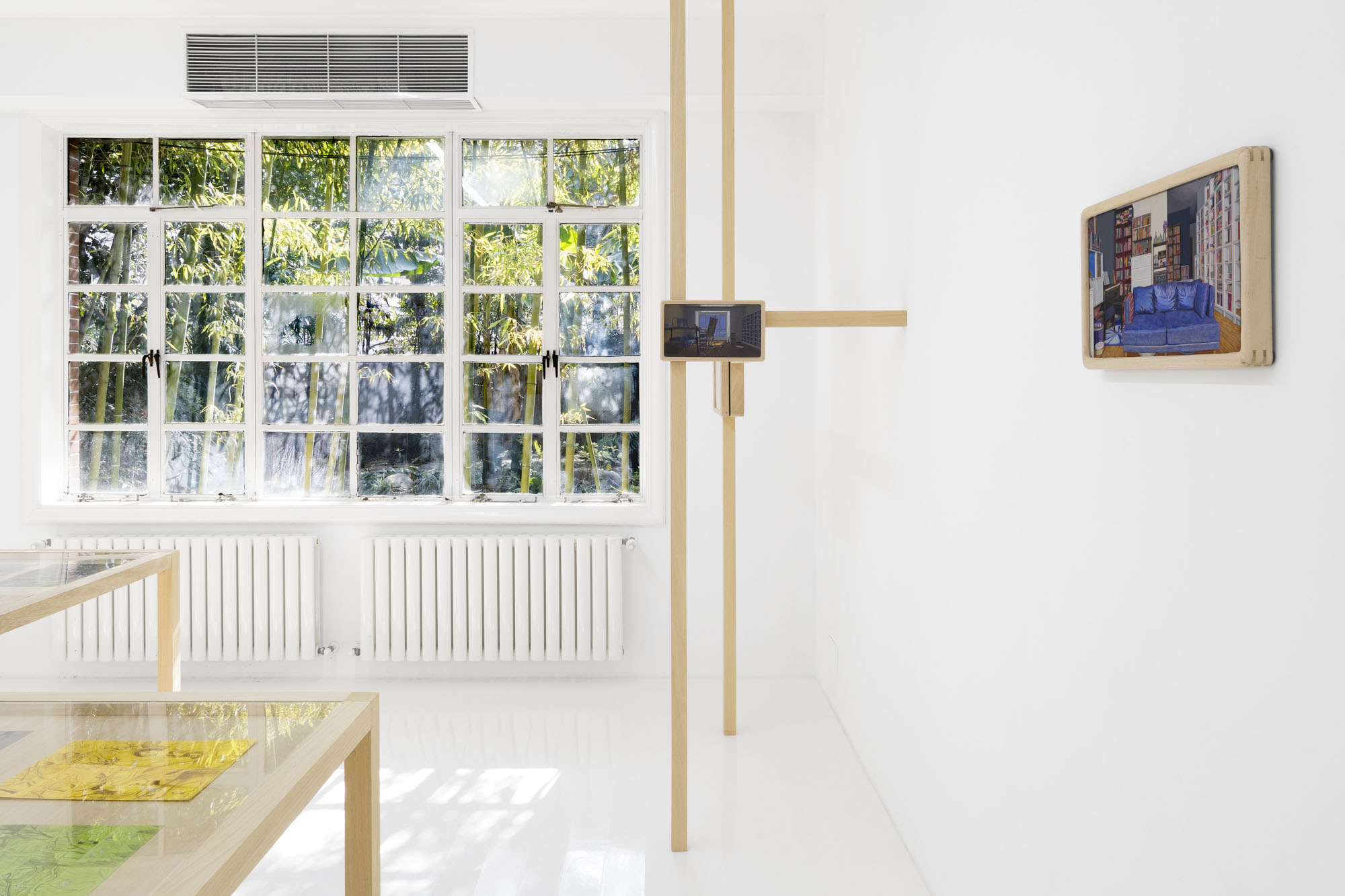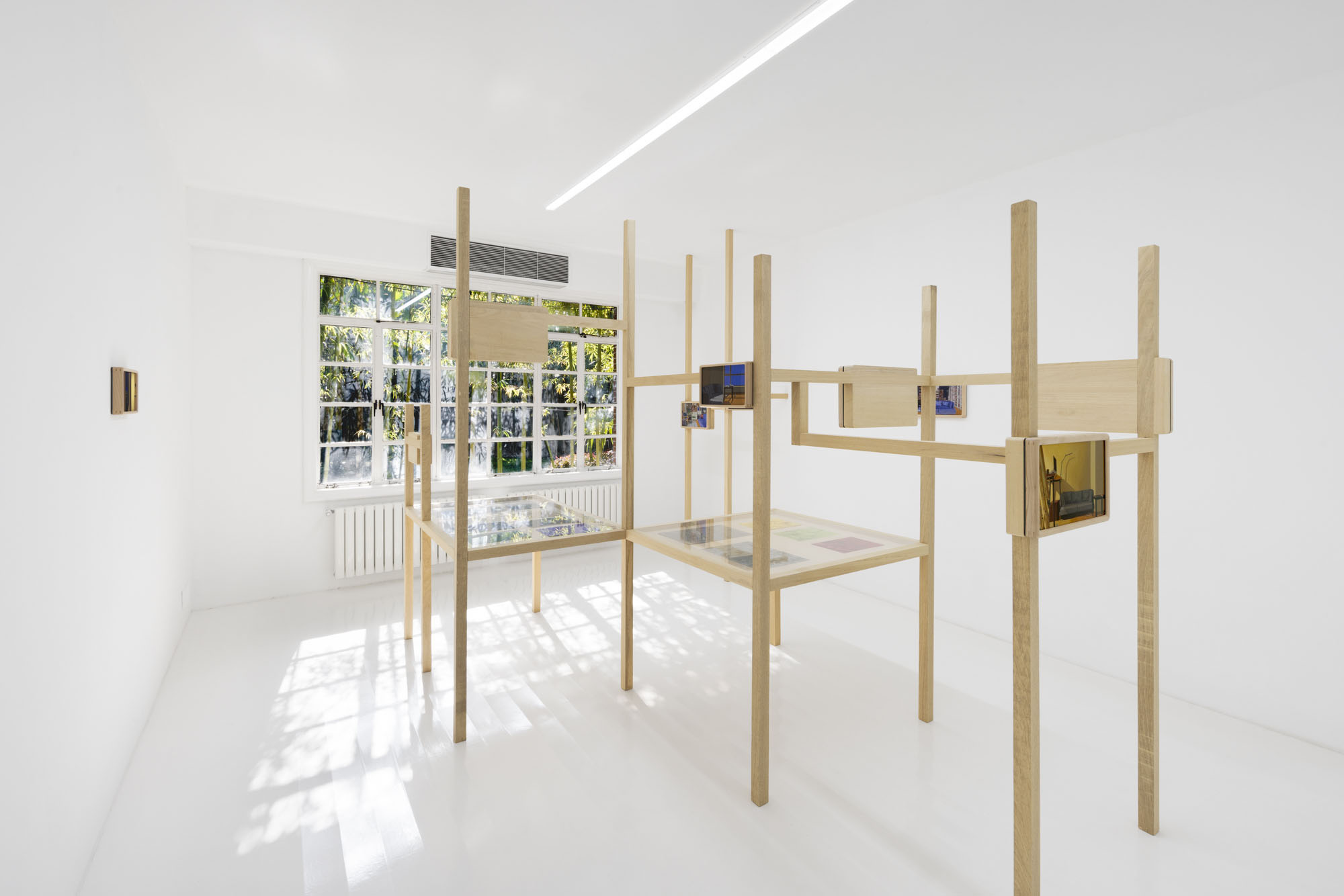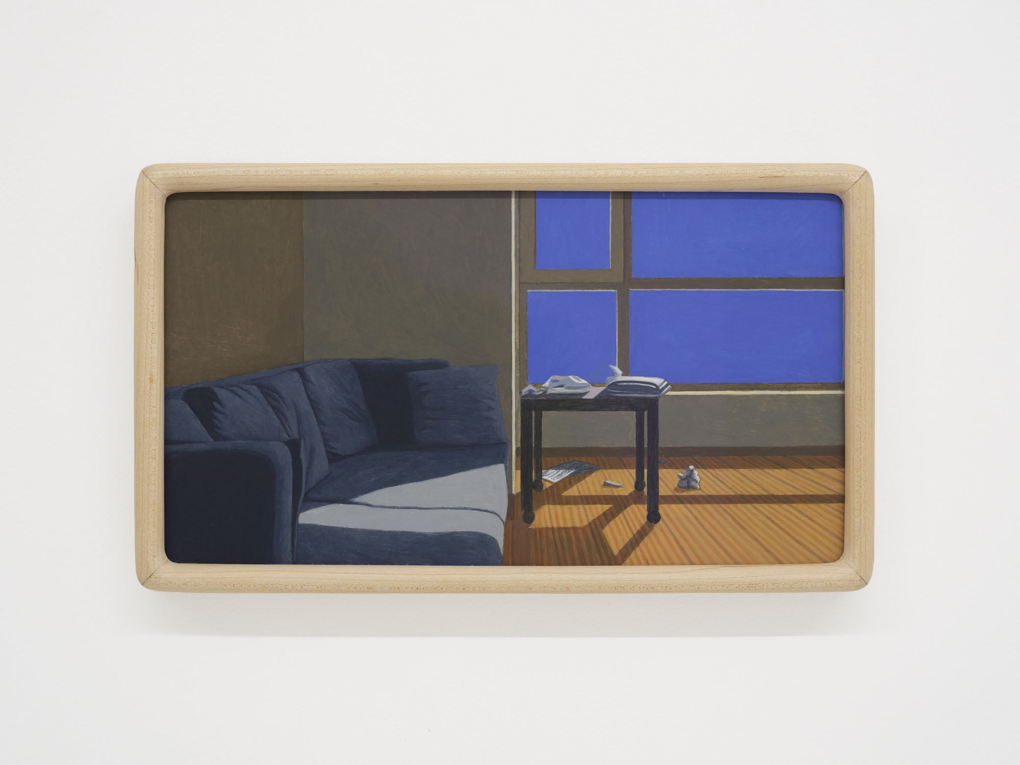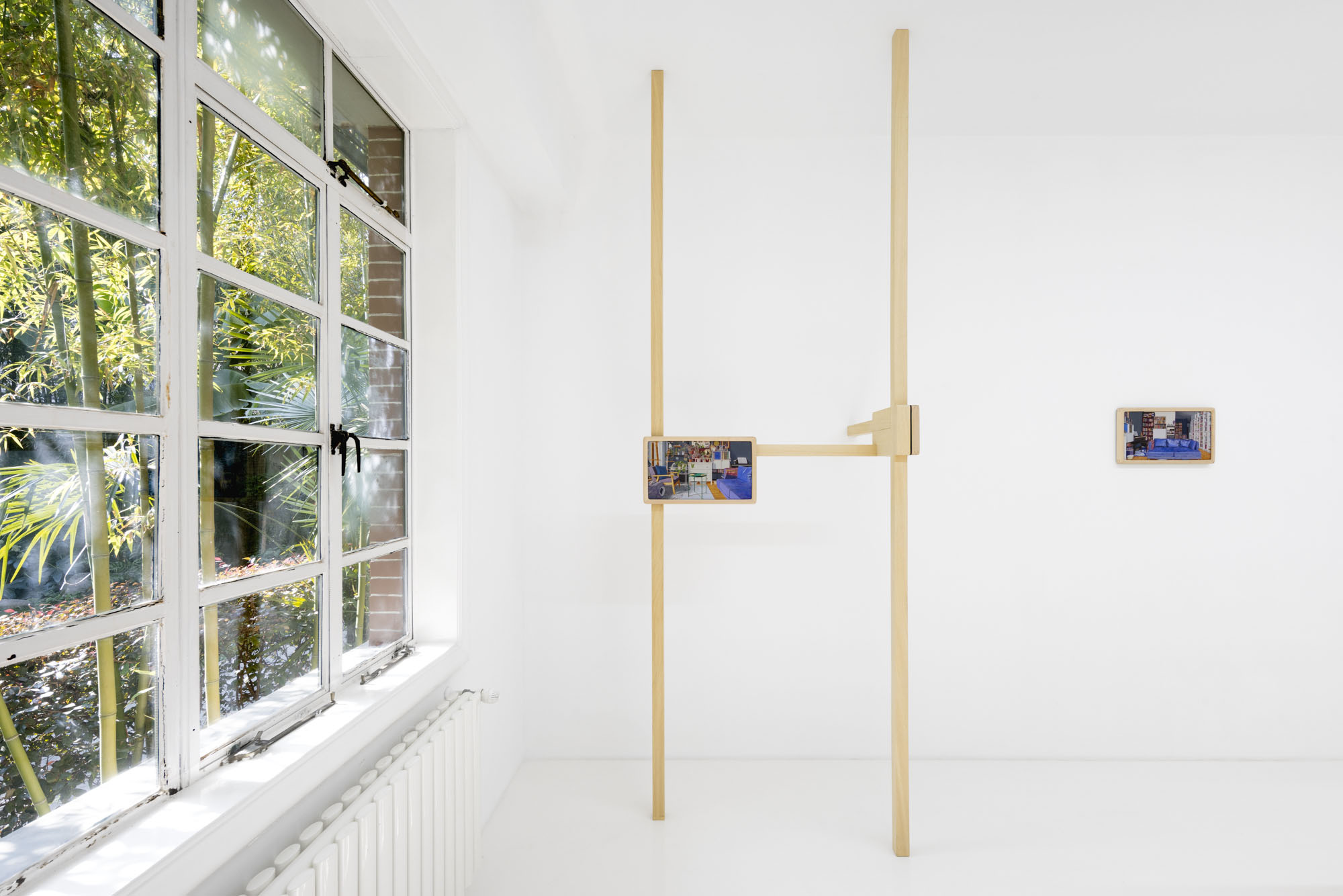 Detail conjures a sense of reality; repetition constructs the dimension of time. The same rooms recur across multiple works, depicted from shifting perspectives, at varying distances, and in changing times of day. Objects altered ever so slightly, shadows rising and receding, color relationships rearranged… Familiar spaces we linger in day after day are constantly shapeshifting through human intervention and the passing of hours. Rather than meeting the works all at once upon the wall, viewers encounter them gradually as they unfold across custom-built wooden structures throughout the gallery. The paintings rest on changing planes, interlaced and offset, inviting viewers not simply to look, but to meander–to peer across gaps, turn back, and double-take. Rooms, plants, windows and vistas reappear like déjà vu from a half-remembered dream, or the sudden flash of memory that arrives unbidden.