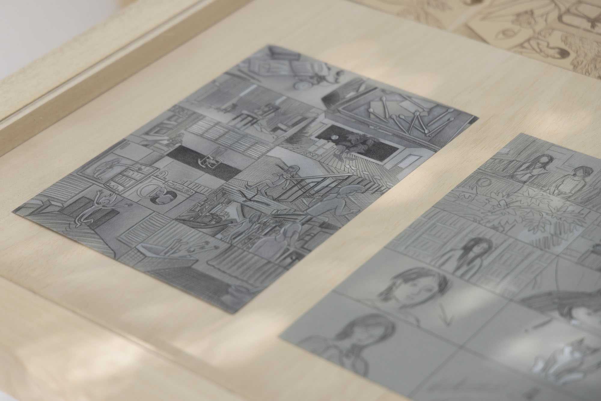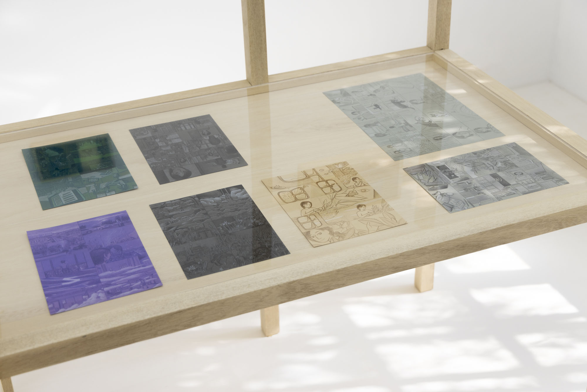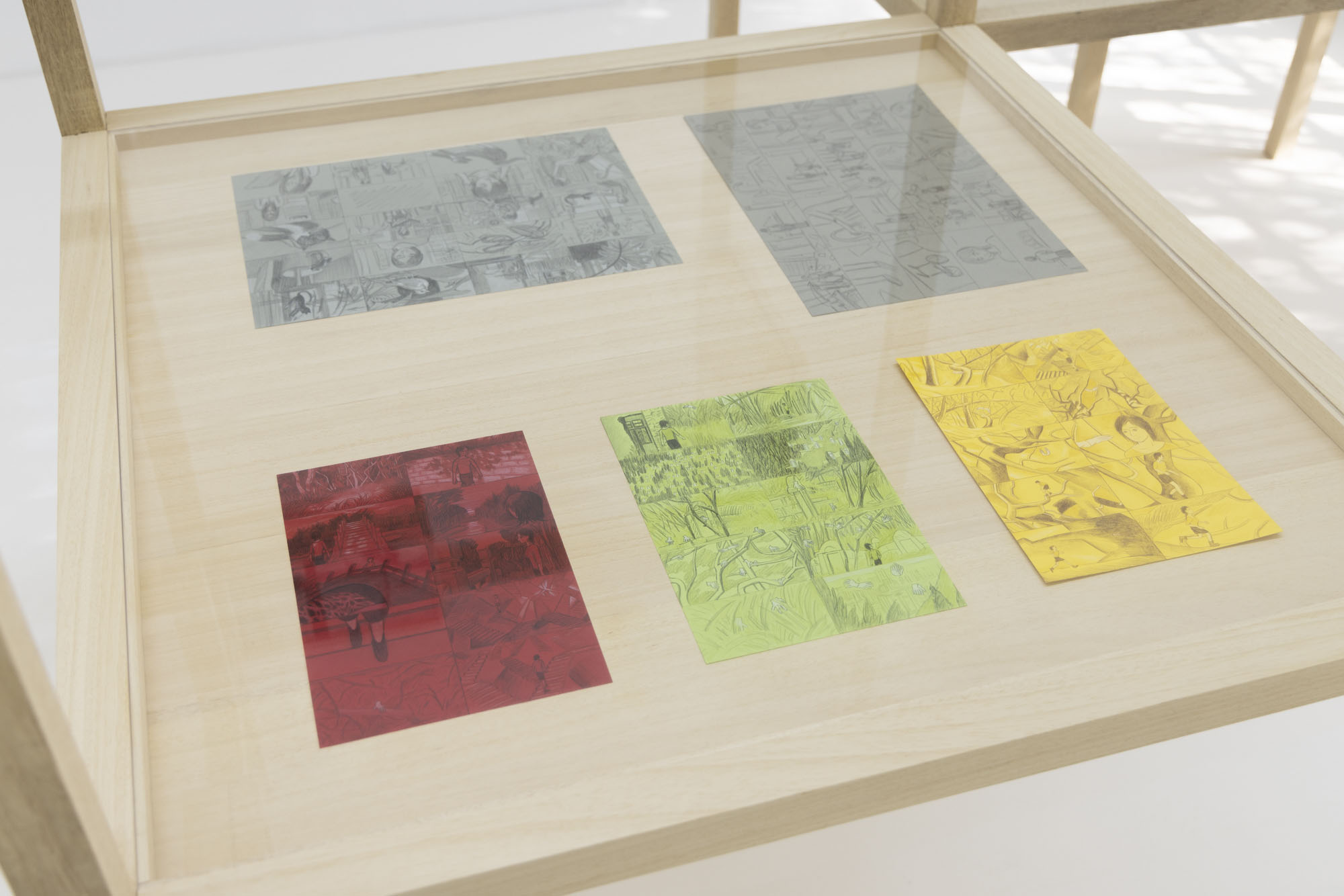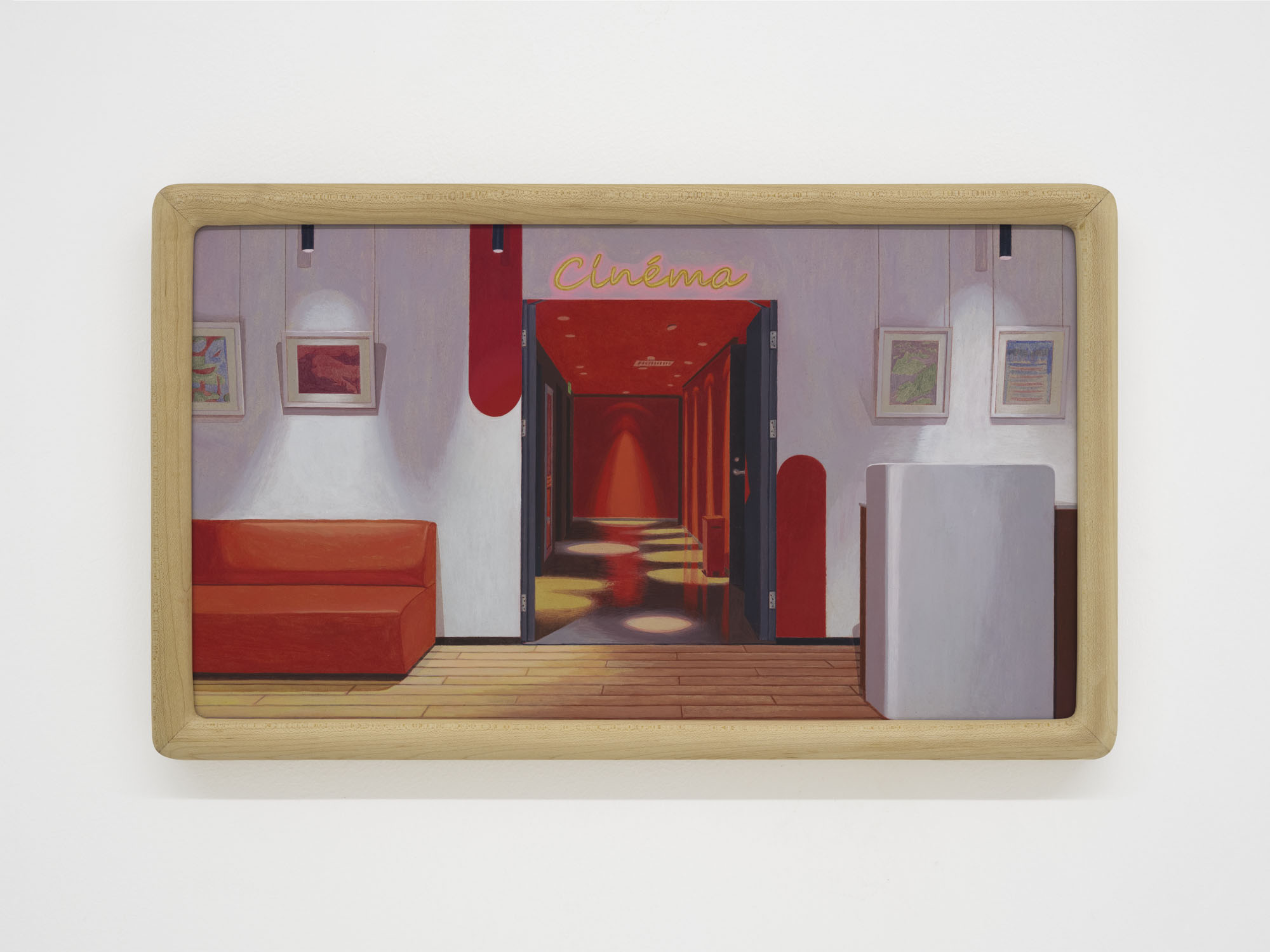 A clue to this suspended storytelling lies in the storyboards displayed within the wooden vitrine. They are drawn for Gao Yuan’s ongoing feature-length animated film Cloud of the Unknown; the acrylic paintings serve as the film’s backgrounds, rendered painstakingly frame by frame. The only work in the exhibition that depicts a non-domestic space, Cinema (2025), reads almost as a double entendre. It is at once a scene from the film itself and a quiet nod to the theatricality nature of all the works on view.