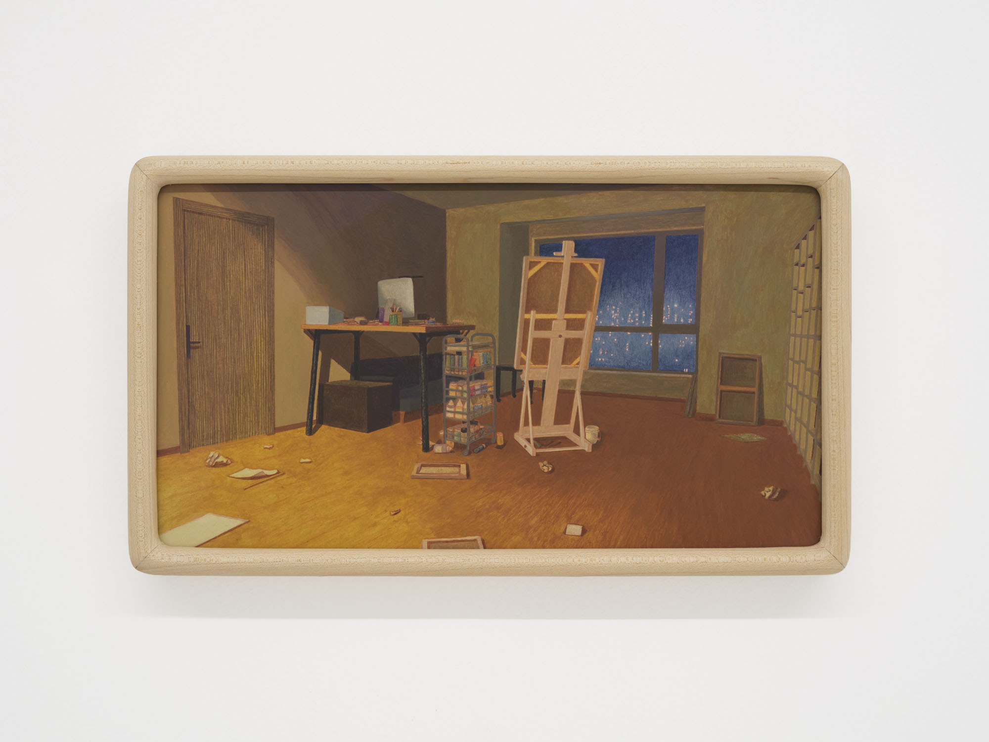 In this group of acrylic paintings on paper, Gao Yuan constructs interior spaces with such precision and detail that they seem less imagined than remembered. They must be real rooms, inhabited by real people, or so the viewer infers. Cat bowls tucked beneath a cabinet, iodine swabsticks left on the coffee table, paint stains accumulated on the easel, an ashtray by the computer overflown with a bouquet of cigarette butts… Every trace of use and care gestures toward the absent dweller. The allure of lived-in spaces lies precisely in what they reveal about their occupants’ routines and temperaments. As the eye lingers over each merticulously rendered detail, the people who once moved through these rooms, and the stories they carried with them, begin to surface in the mind.