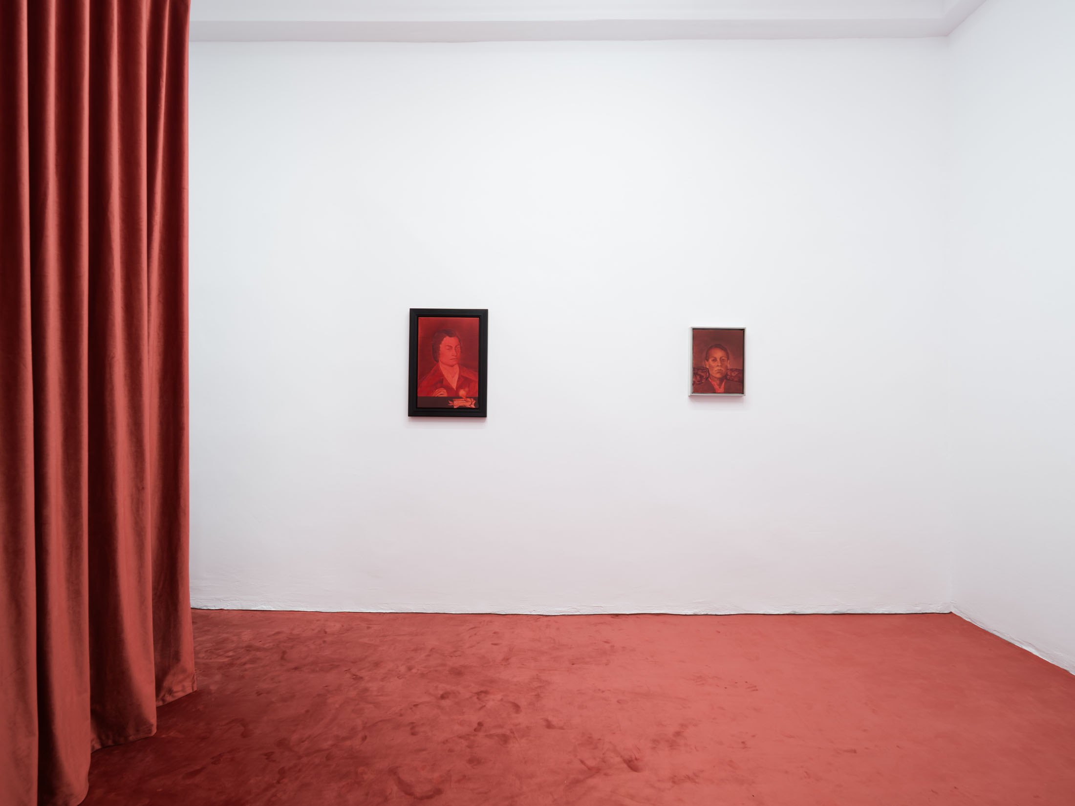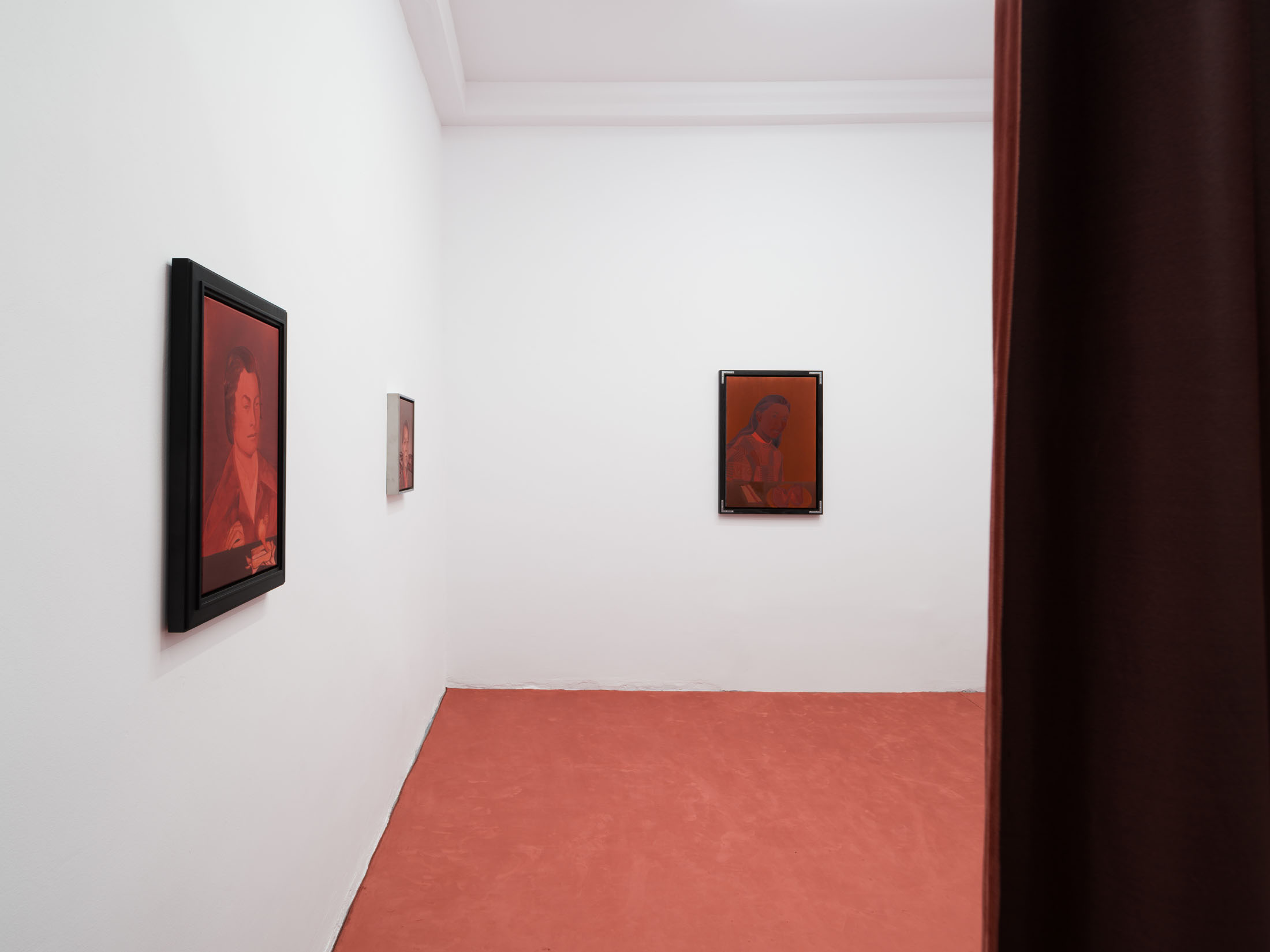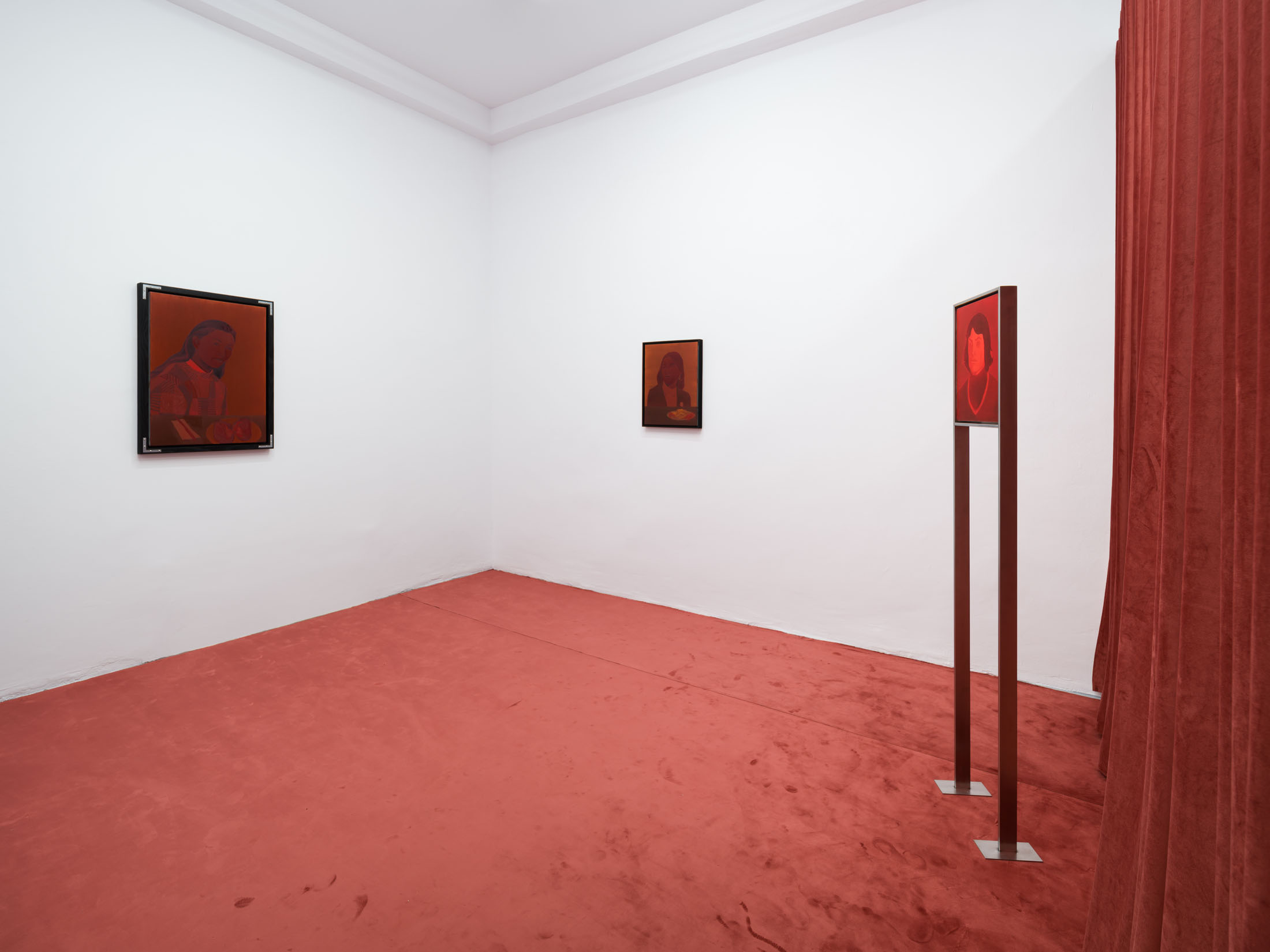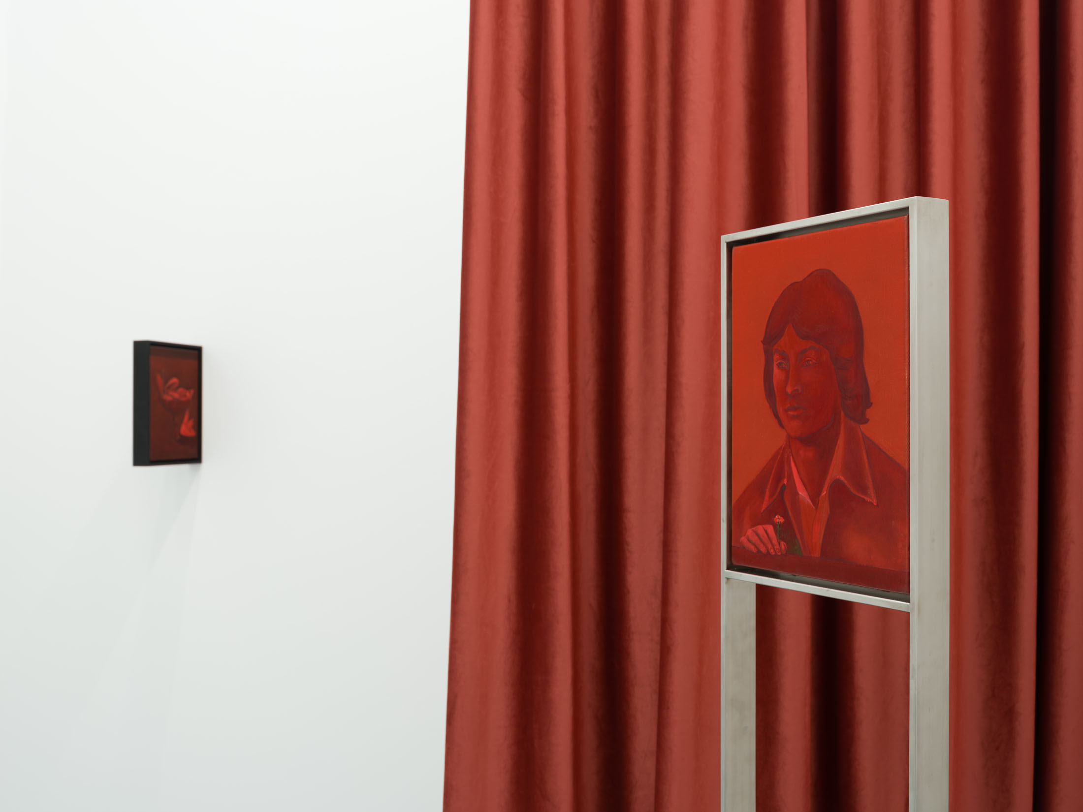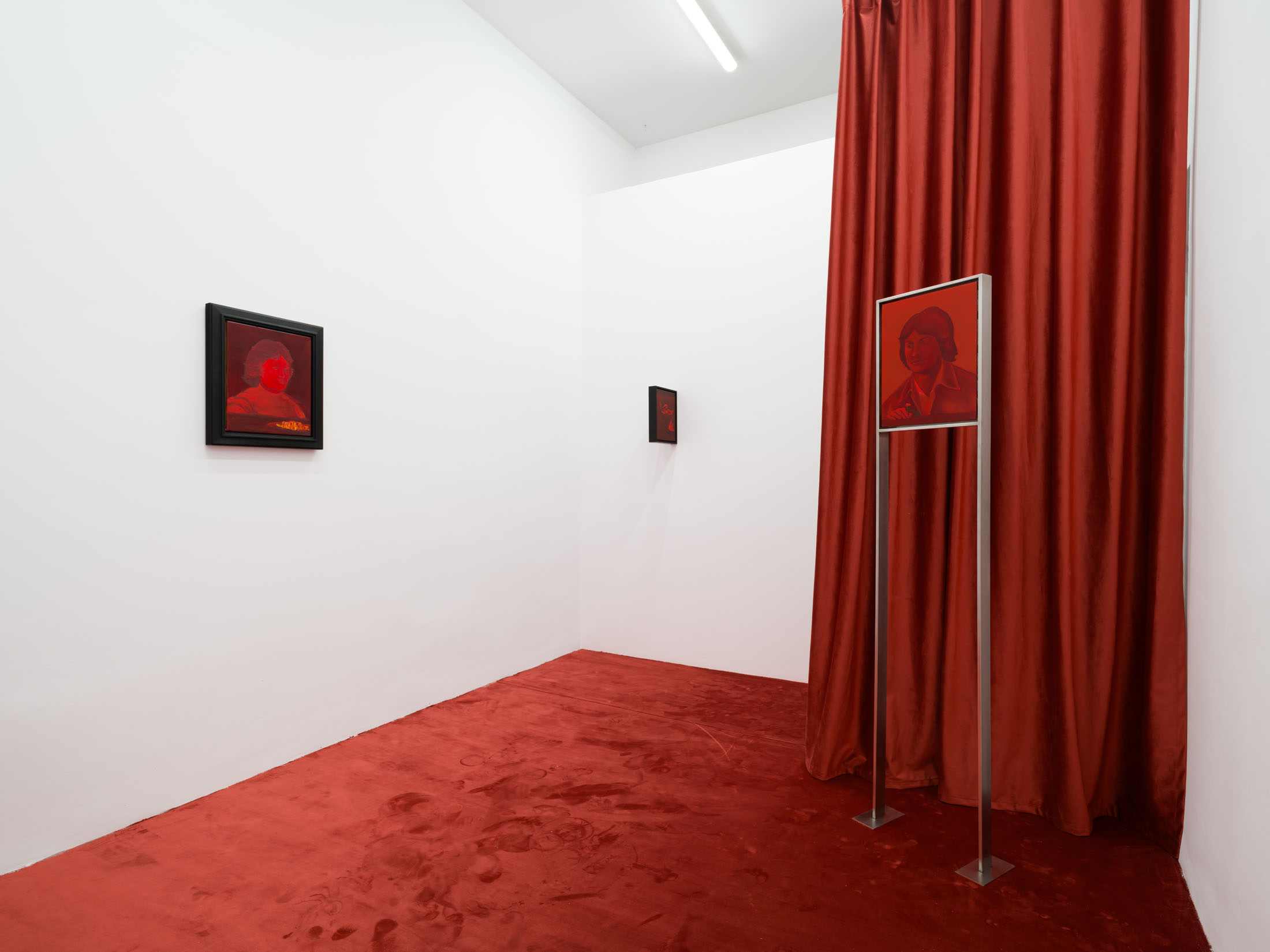 The works create a subtle dialogue between material and perception: the burgundy velvet of drapery, the fabric of the floor, dark tones, and metallic reflections set against stark white walls form a sensorial interplay of textures and atmospheres. These formal choices echo the variability of light and the subjective nature of sight. Semeniuc navigates human essence through the lens of filiation and shared memory, crafting a space where personal mythology meets collective imagination. The Renaissance emerges here not as a historical citation, but as a metaphor for a spiritual renewal—a kind of inner spring.