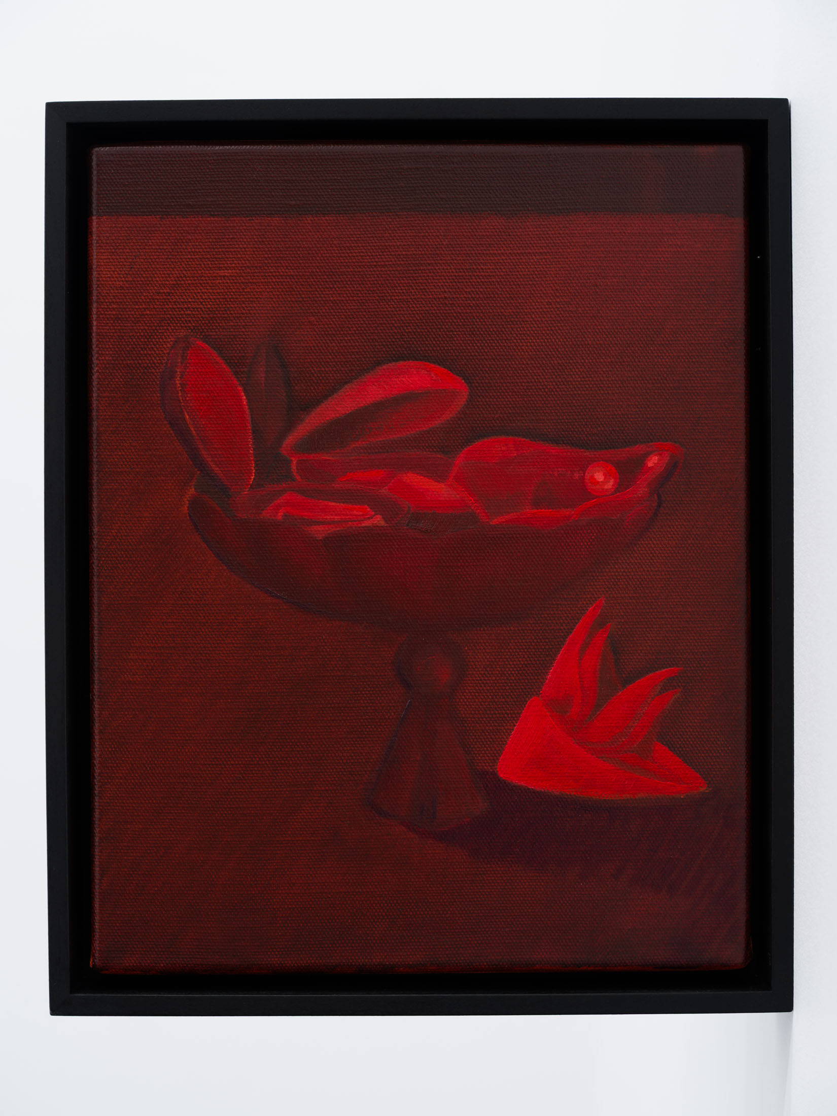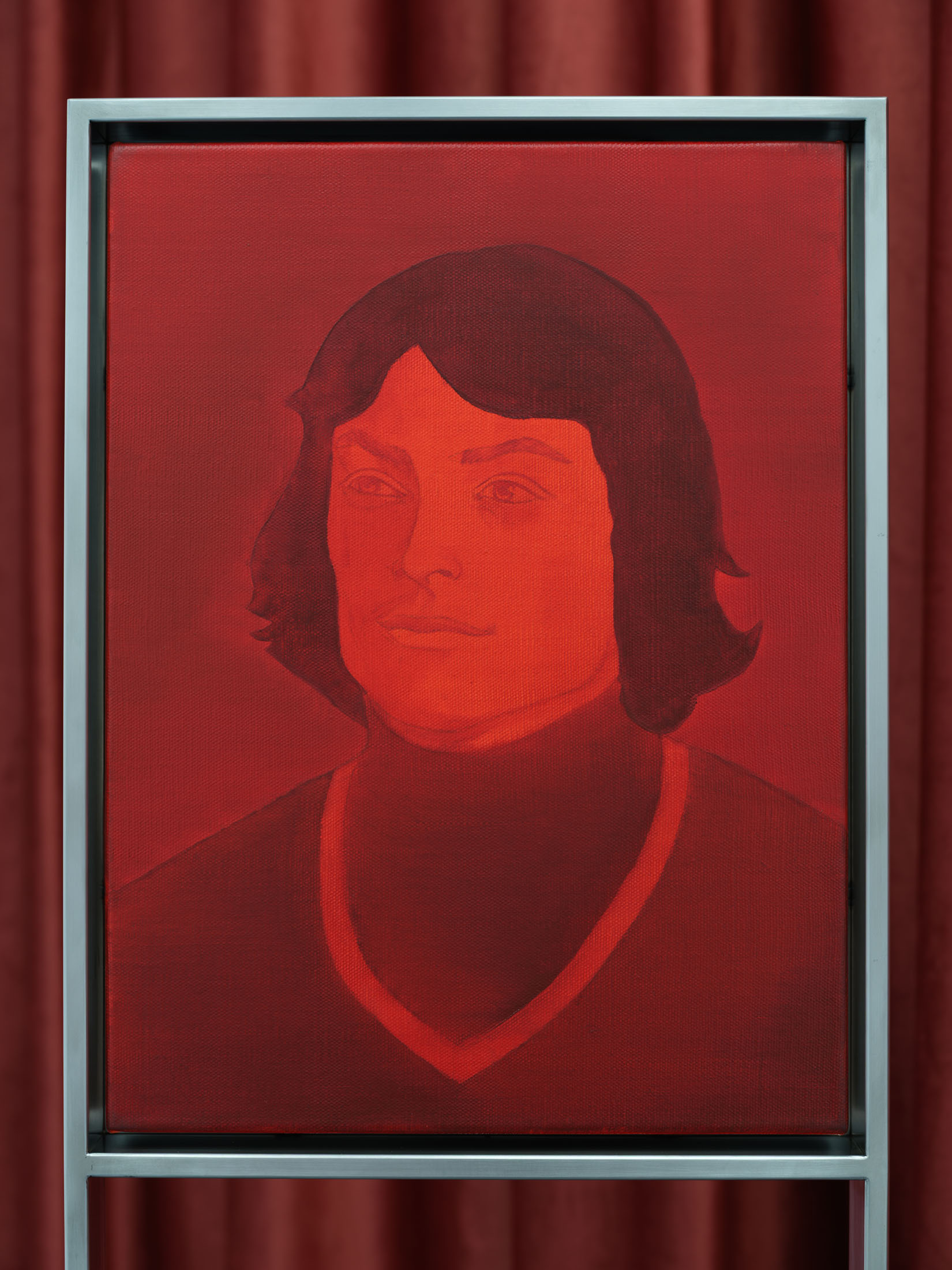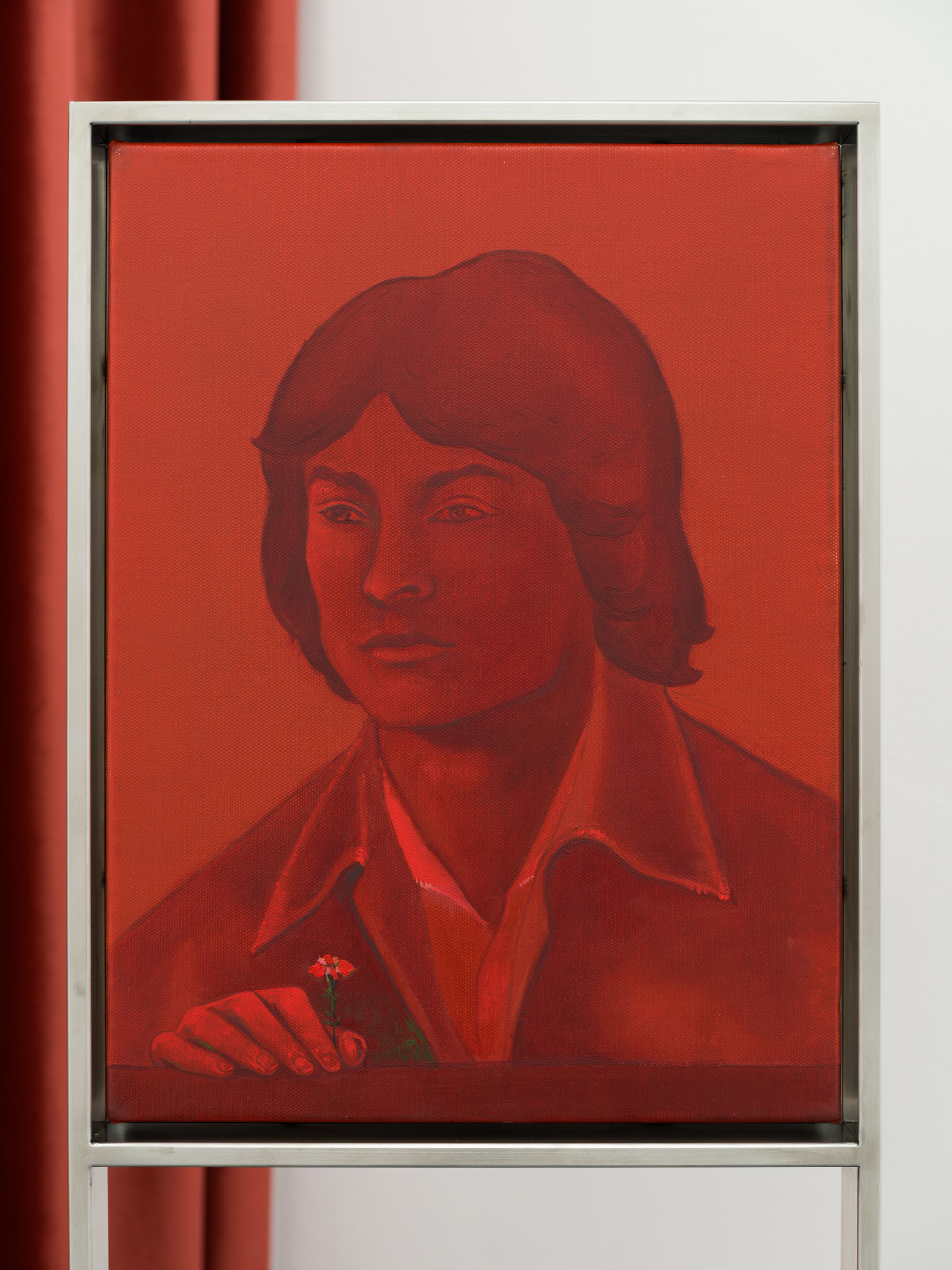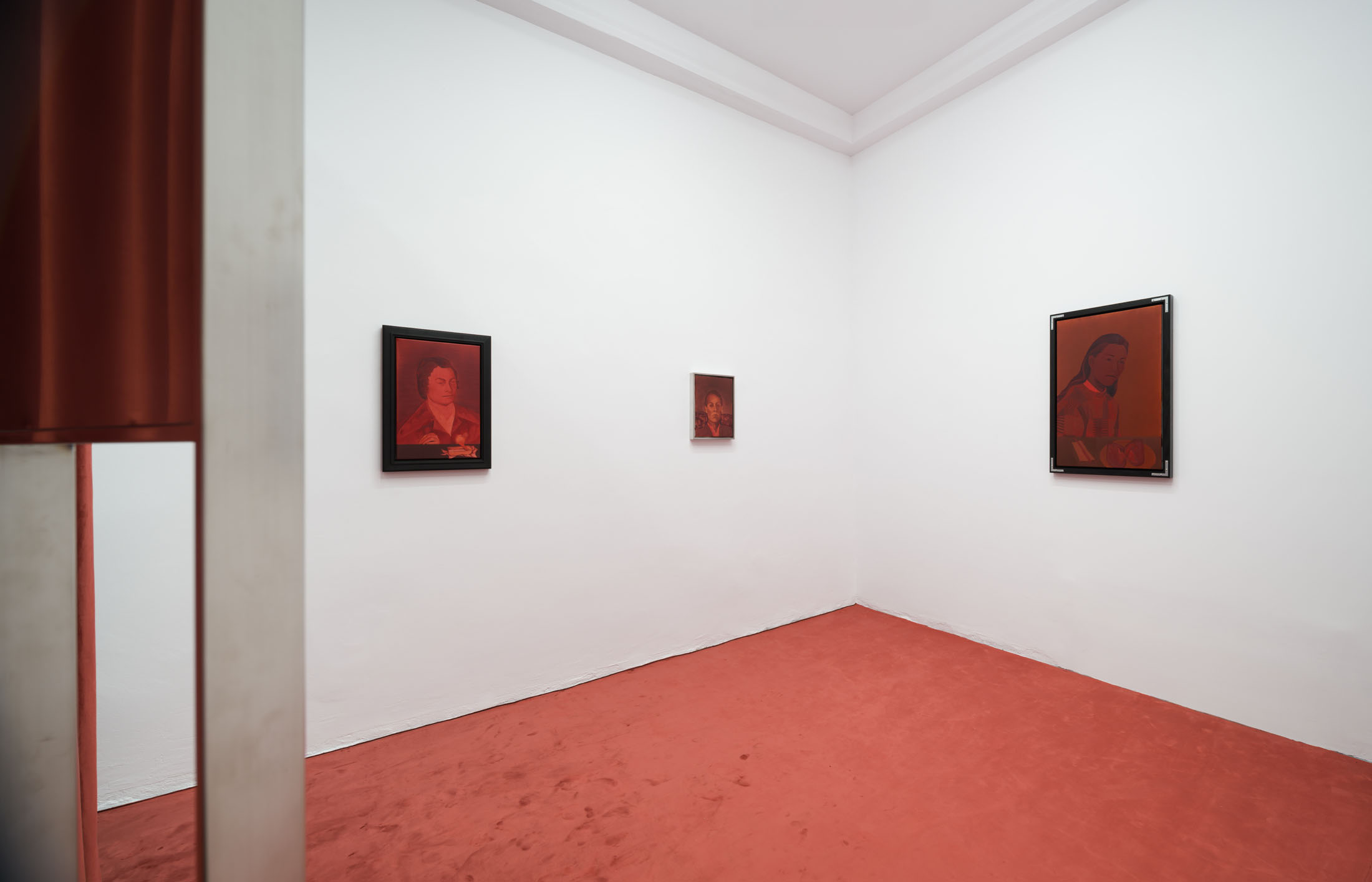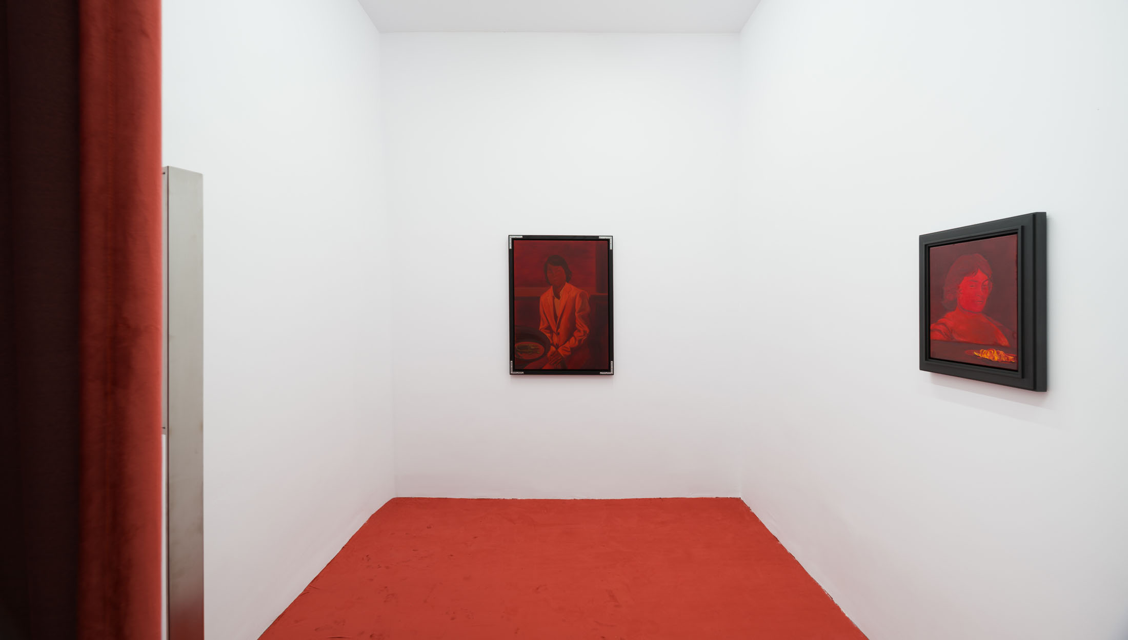 The works create a subtle dialogue between material and perception: the burgundy velvet of drapery, the fabric of the floor, dark tones, and metallic reflections set against stark white walls form a sensorial interplay of textures and atmospheres. These formal choices echo the variability of light and the subjective nature of sight. Semeniuc navigates human essence through the lens of filiation and shared memory, crafting a space where personal mythology meets collective imagination. The Renaissance emerges here not as a historical citation, but as a metaphor for a spiritual renewal—a kind of inner spring.