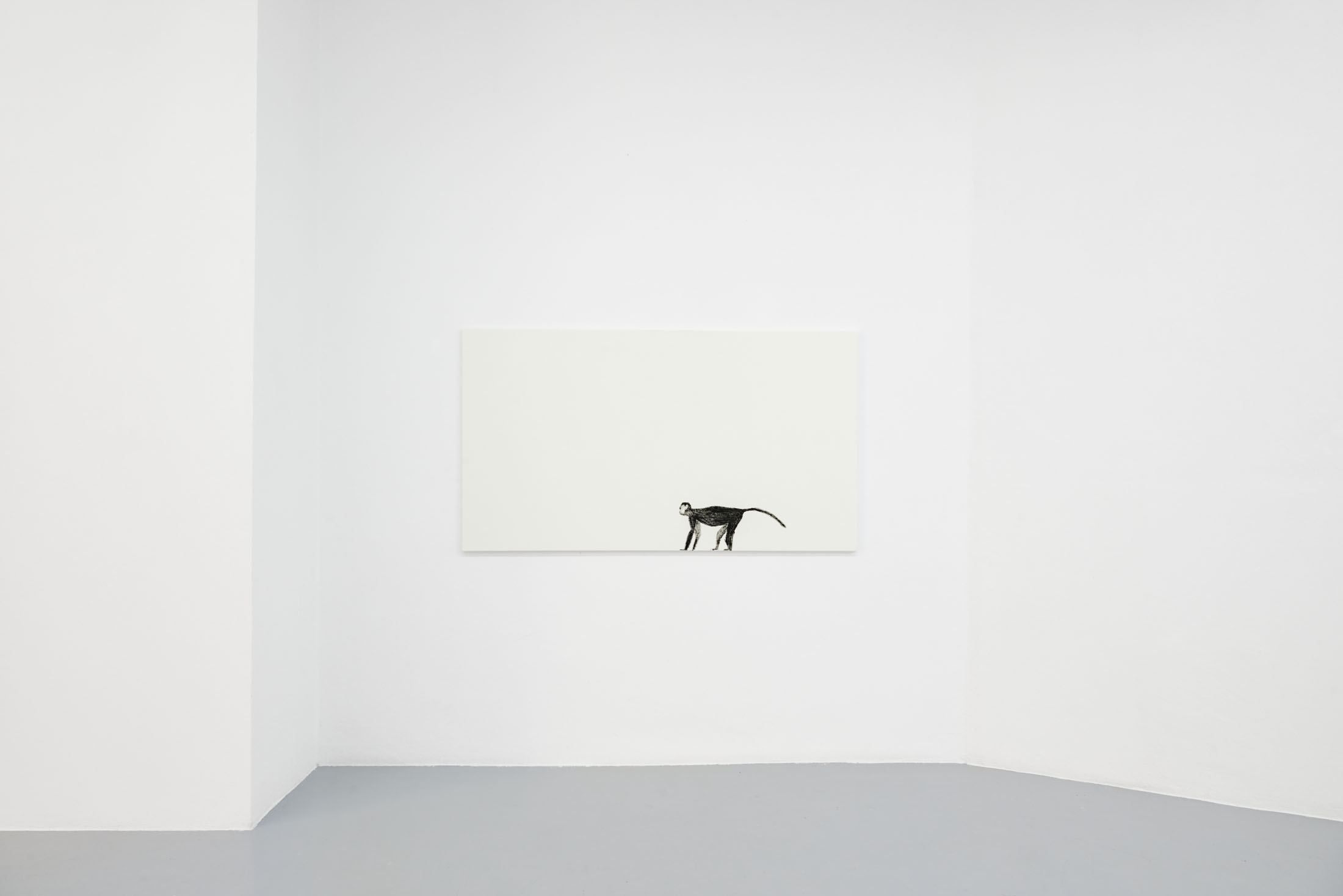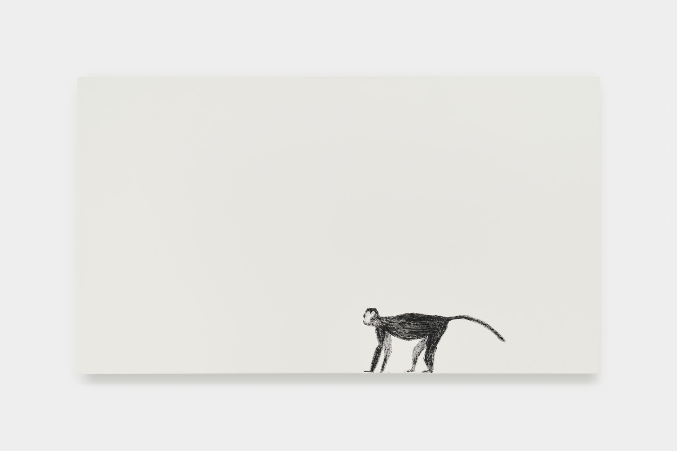 The painting is stripped back to its bare essentials: a monkey waits alone, yearning, on the threshold of the image.