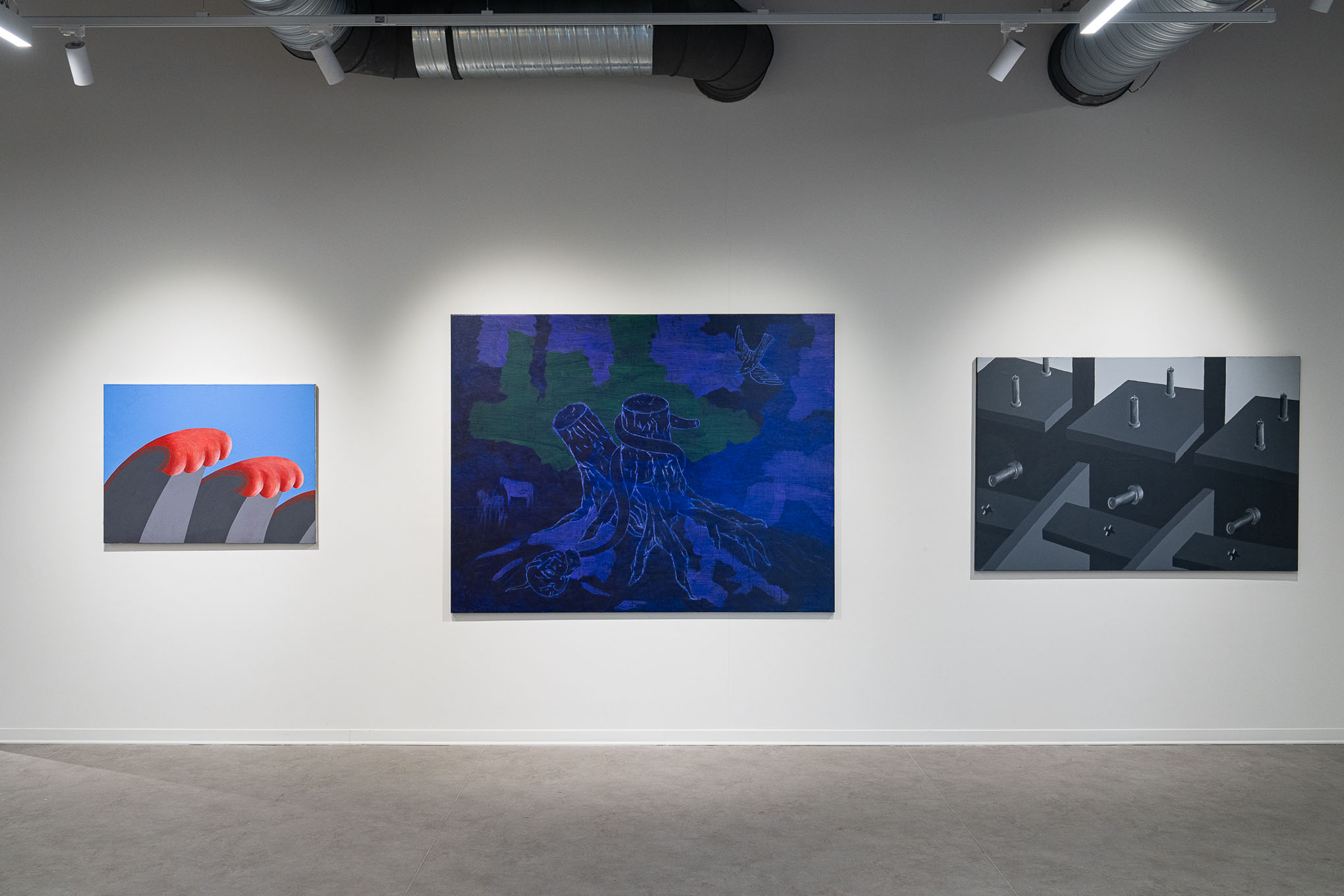 This is a compressed retrospective of the practice of Gili Mocanu (b. 1971, Constanța), one of the most original painters active in Romania today. His idiosyncratic, sprawling, consistent alphabet of forms and operations is approached from the vantage point of the body—sublime and grotesque to equal extents, sectioned and recomposed – and that of text, the script coordinating or confusing the body’s vagrancy through the painter’s oeuvre, text itself reversed or mirrored, amputated, amplified or muffled. Hill with Skull, the 2007 work from which this project borrows its title, is a case study for the formal and conceptual threads which, the exhibition proposes, interweave in Mocanu’s practice. The work is double—two paintings offer chromatic variations of the encounter between a skeletal landscape and a cranial near-abstraction. Rather than elegiac or archeological versions of the scene, the two iterations are neutral renditions of a diagram of spatial disorder, which compresses the play of distances across which those two objects would be seen, resolving it as ghostly simultaneity: to look at the skull is to unsee the hill, to see the hill presupposes a distance which reduces the skull to a speck, a grey smear in the grass, a distance which symbolically renders it inert once more. Text – the title of the paintings—is a dynamic element in the work, intervening in the image to identify spatial interlocutors and to assert their scalar incompatibility, to measure as much as appease the violence of their not fitting together.
