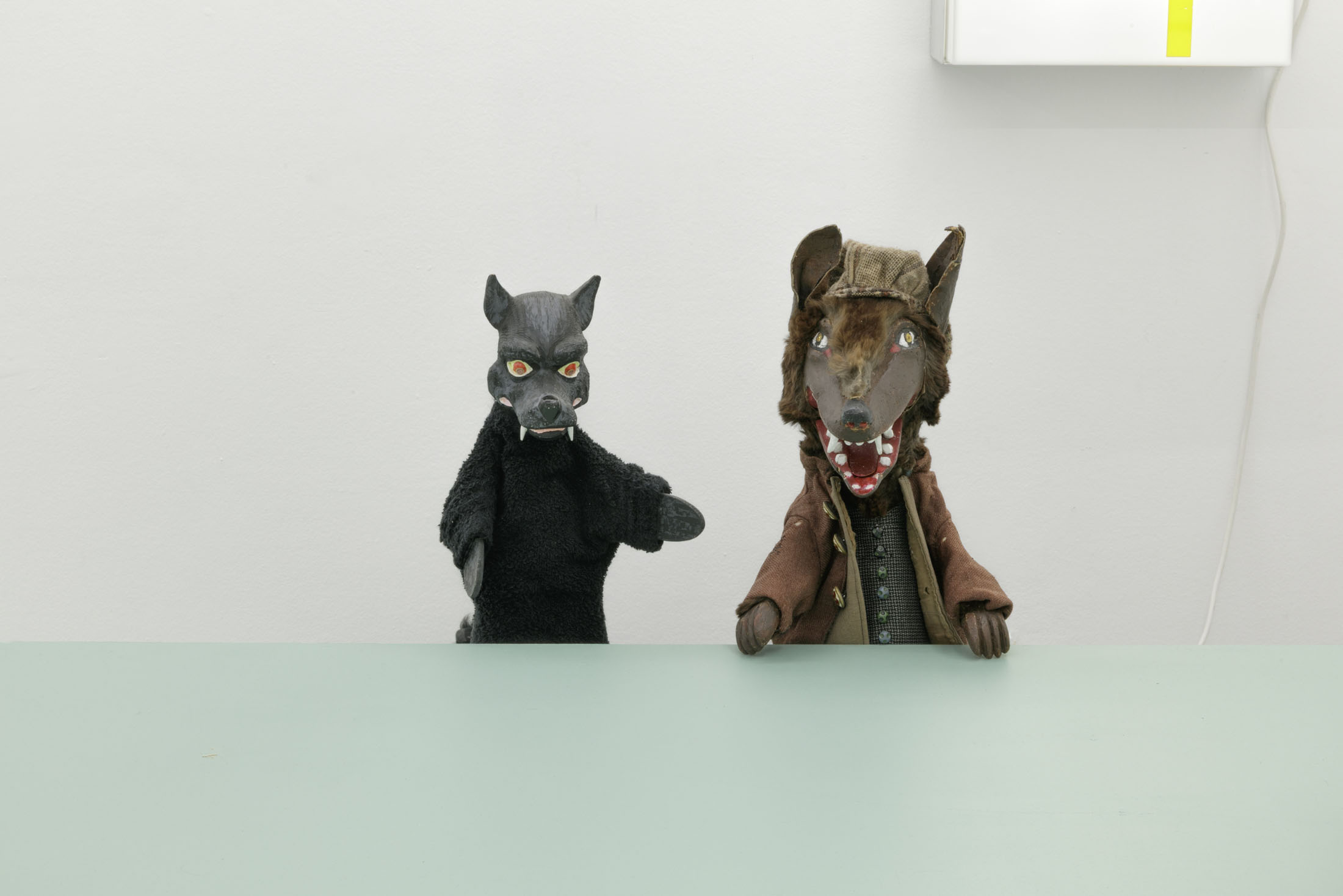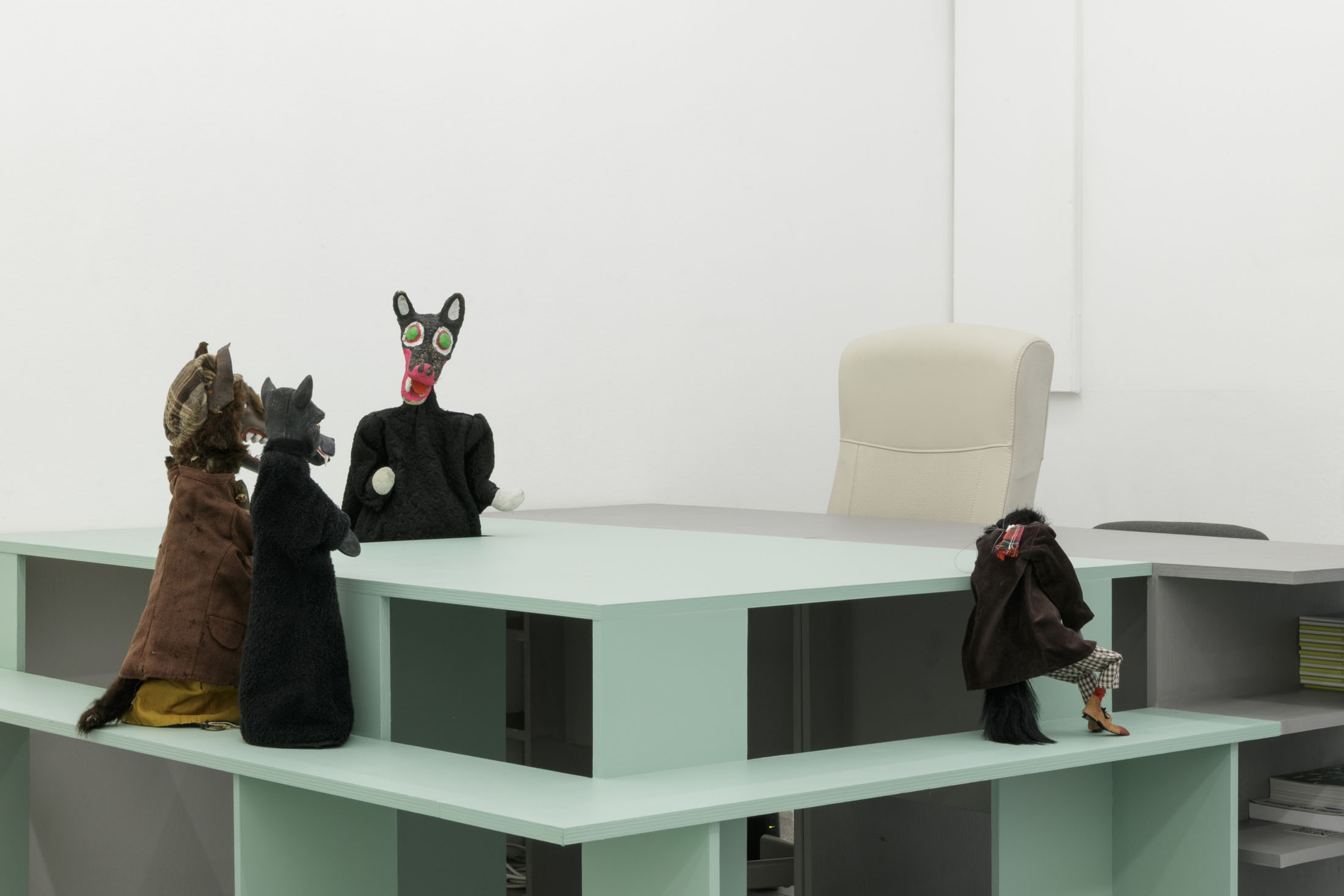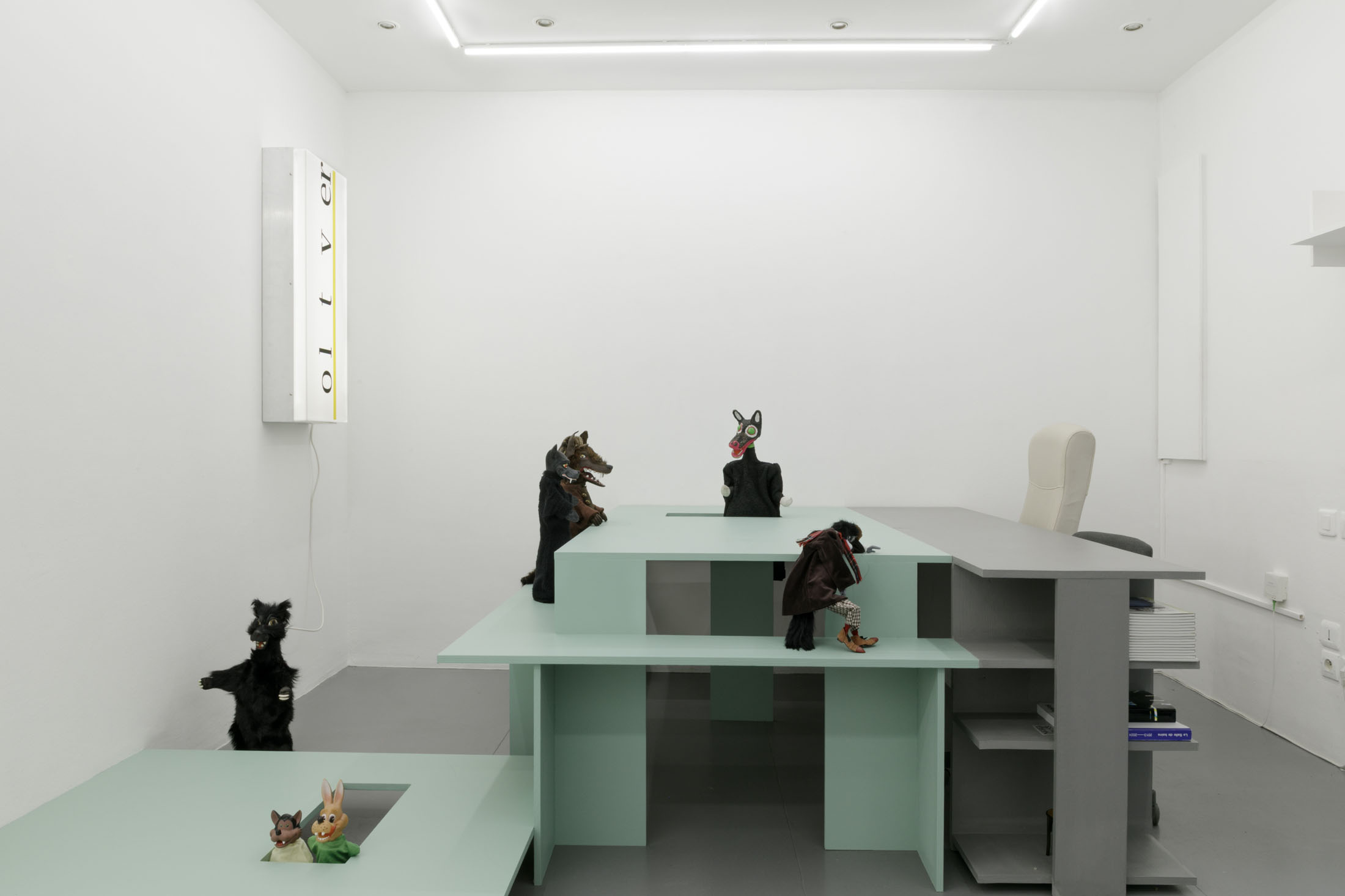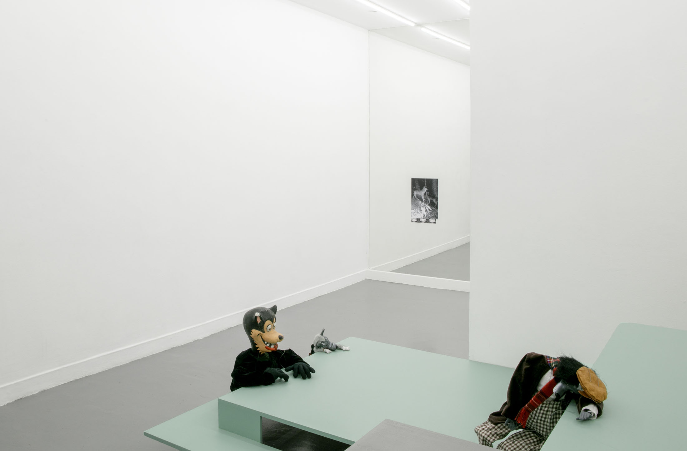 The authoritarian note sounding in the title of her show at La Salle de bains, a statement you might read over a border post or at the entrance to a nightclub or museum – when the exit is final and there’s no going back – flips around two words in the title Anne Carson gave to one of her essays.1 Carson’s text speaks about a threshold, the one the author crosses at night in her sleep, when to be absent from the world amounts to entering the dimension of dreams and surrendering to the laws of the enigmatic, the odd, where everything that was familiar becomes disturbing. At La Salle de bains, visitors may indeed wonder on which side of the threshold exactly the bureaucratic mint-colored setting that features wolf hand puppets falls.