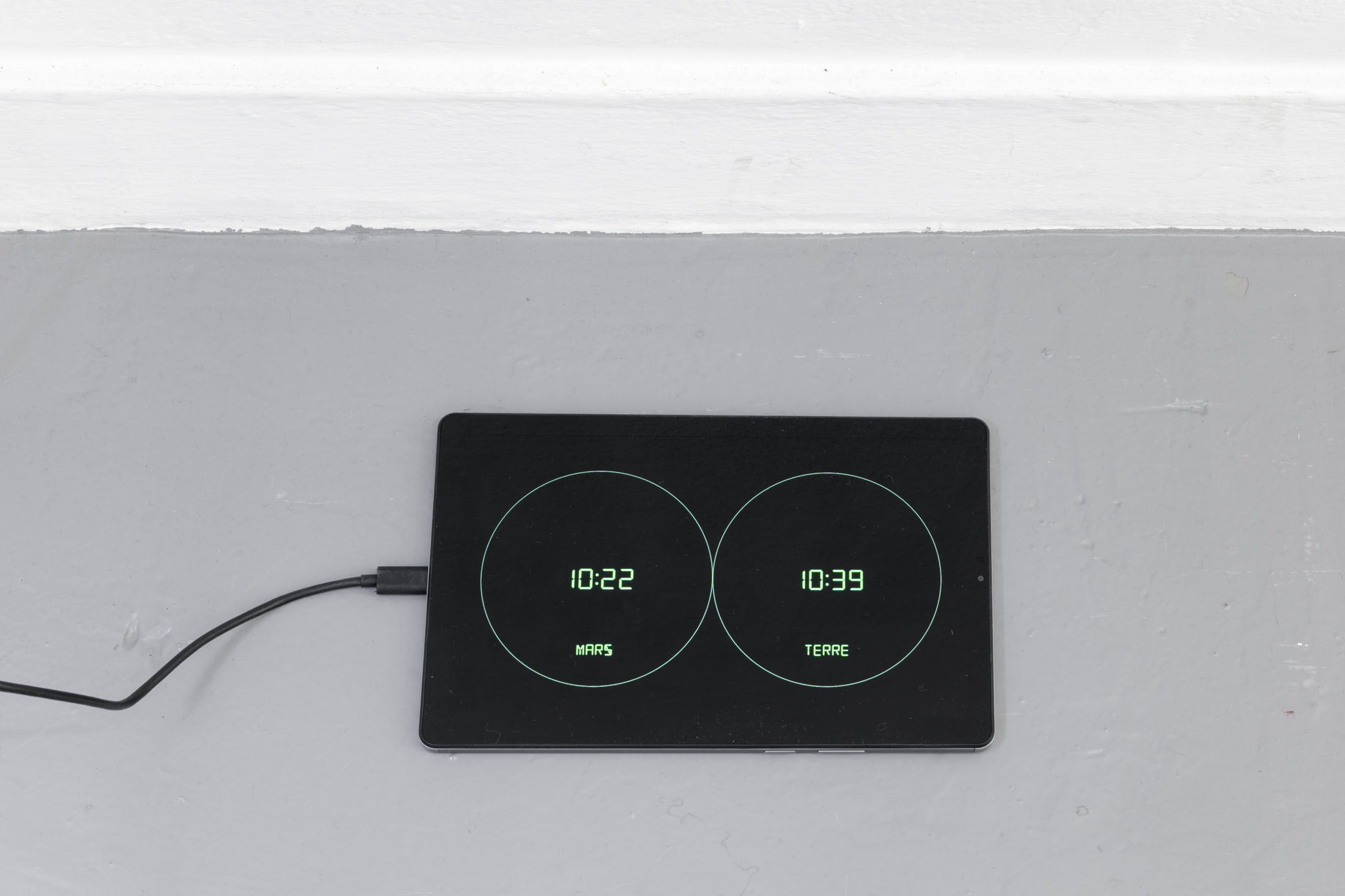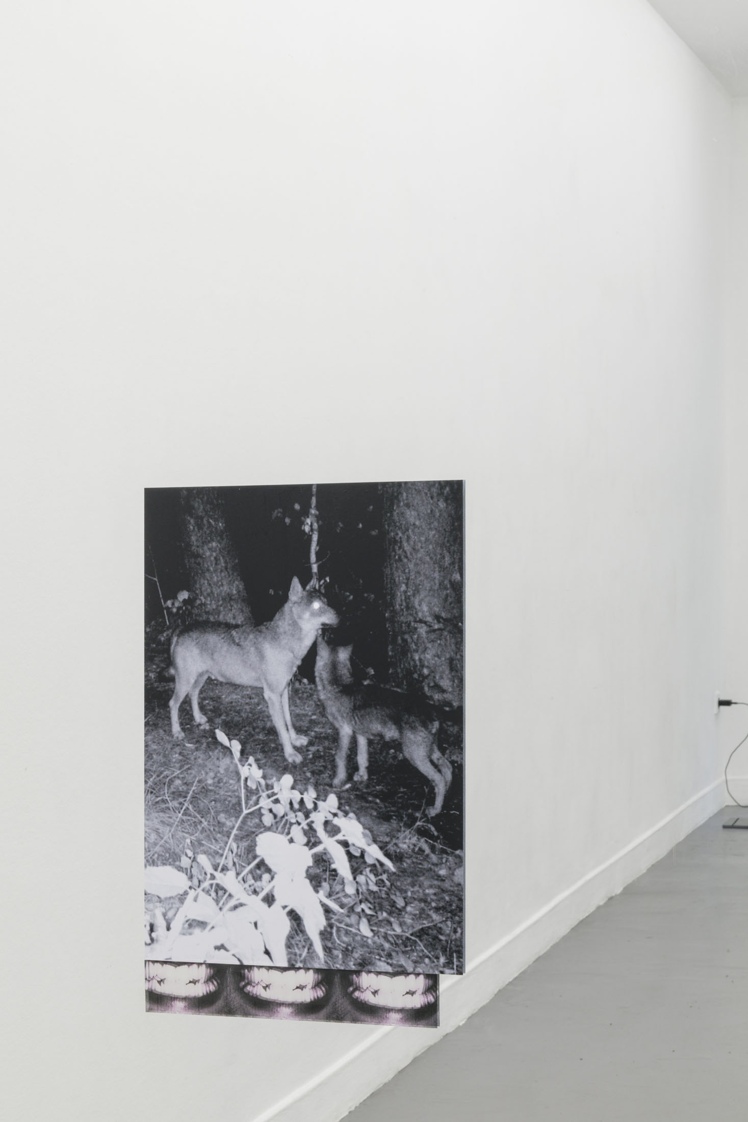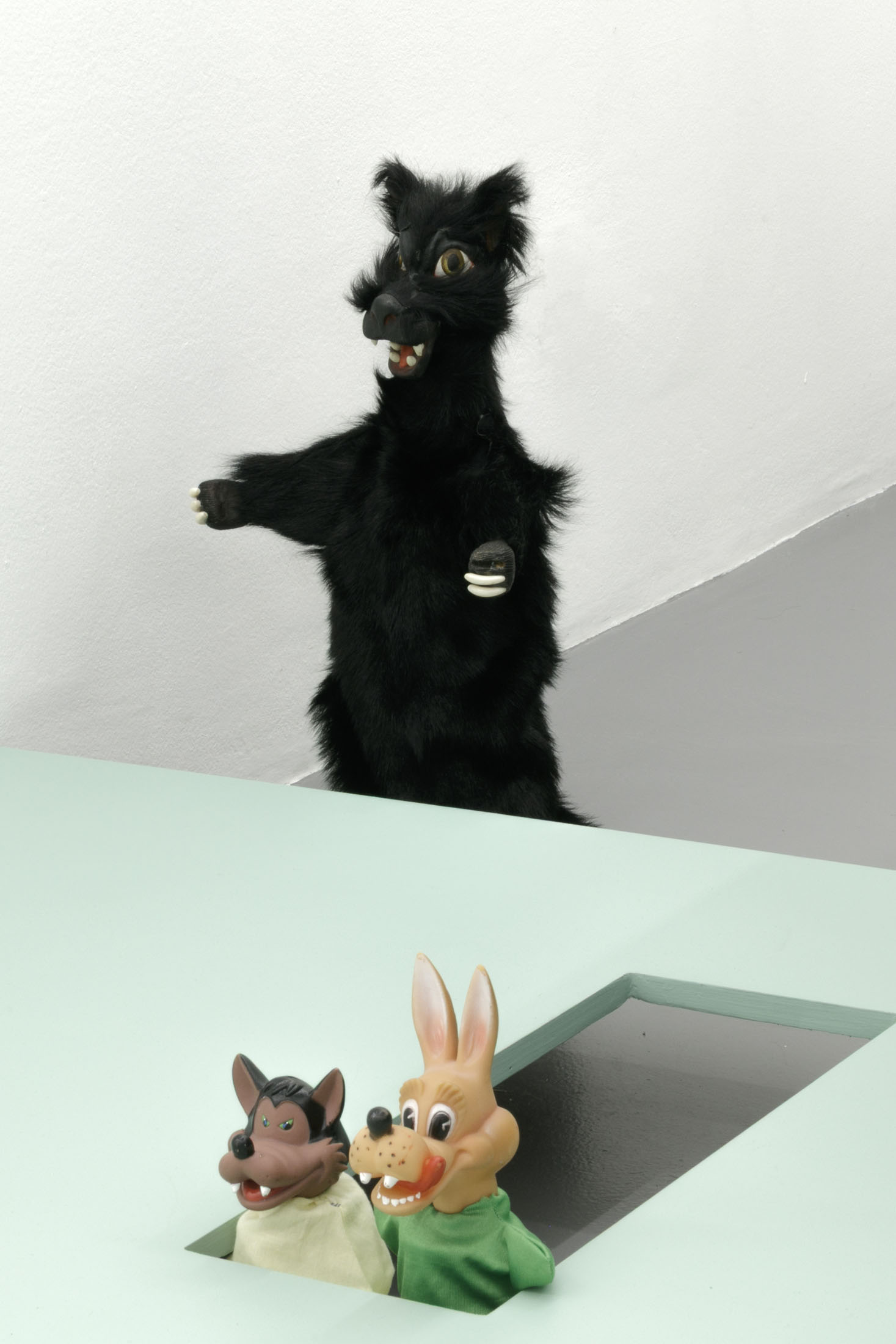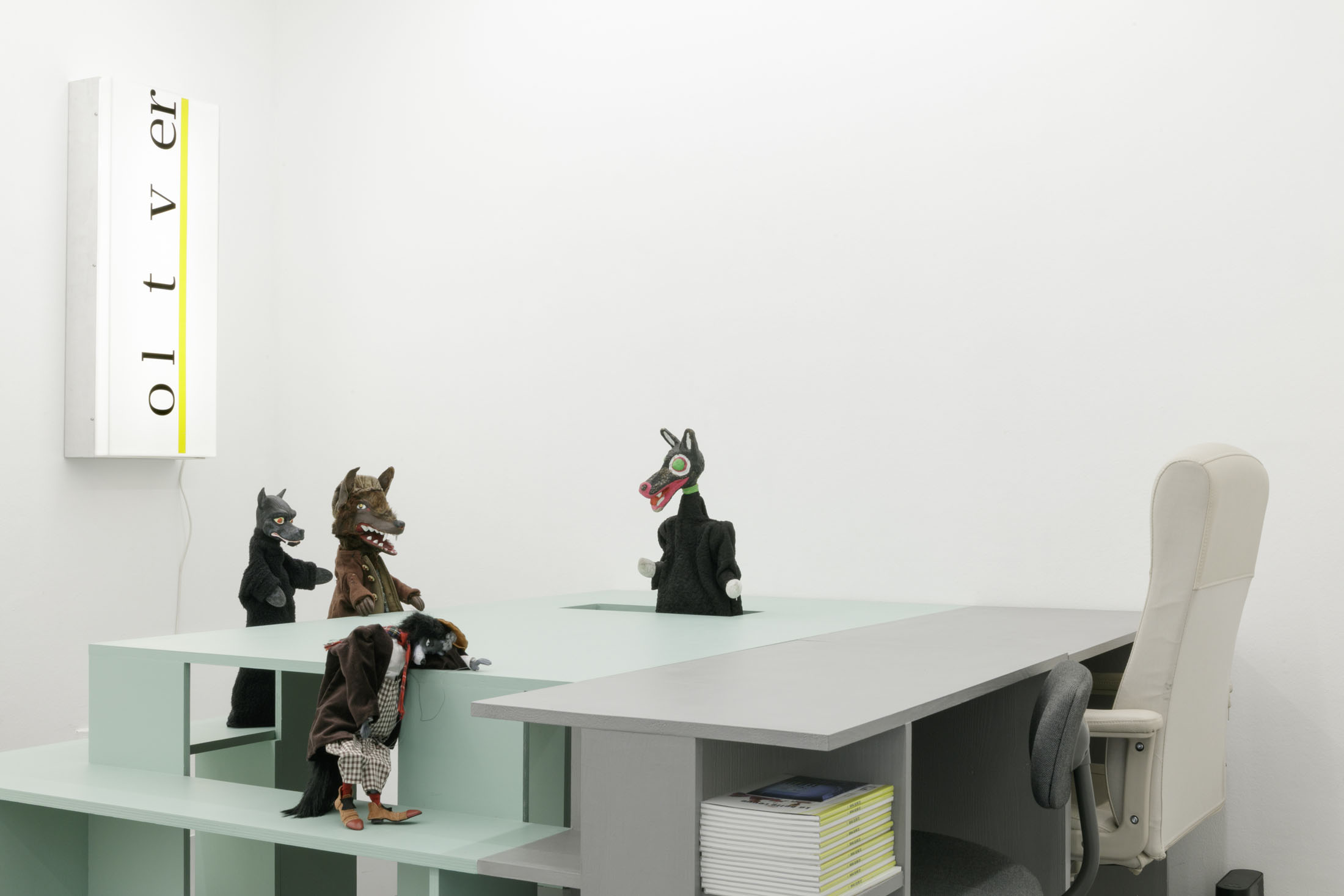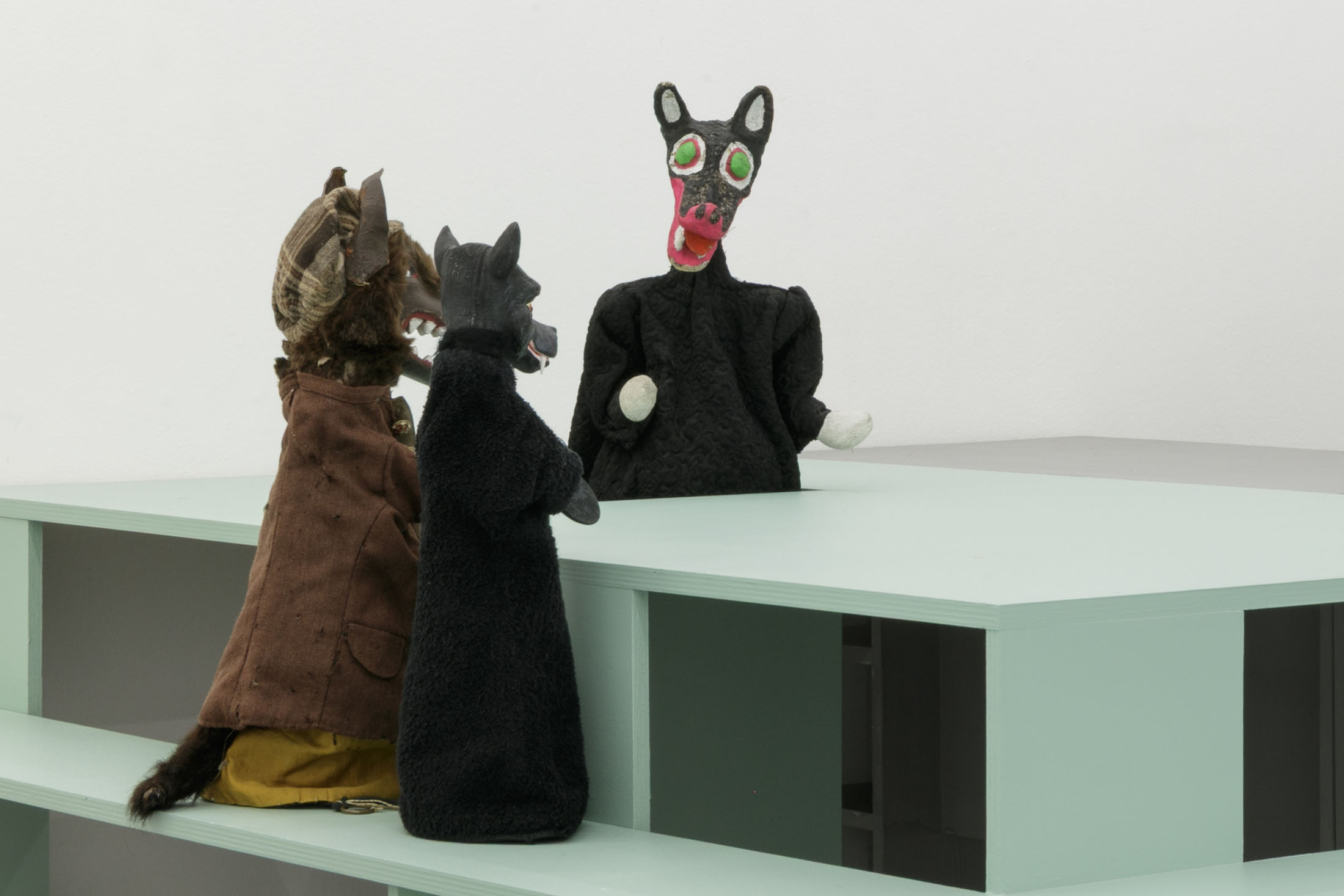 The authoritarian note sounding in the title of her show at La Salle de bains, a statement you might read over a border post or at the entrance to a nightclub or museum – when the exit is final and there’s no going back – flips around two words in the title Anne Carson gave to one of her essays.1 Carson’s text speaks about a threshold, the one the author crosses at night in her sleep, when to be absent from the world amounts to entering the dimension of dreams and surrendering to the laws of the enigmatic, the odd, where everything that was familiar becomes disturbing. At La Salle de bains, visitors may indeed wonder on which side of the threshold exactly the bureaucratic mint-colored setting that features wolf hand puppets falls.