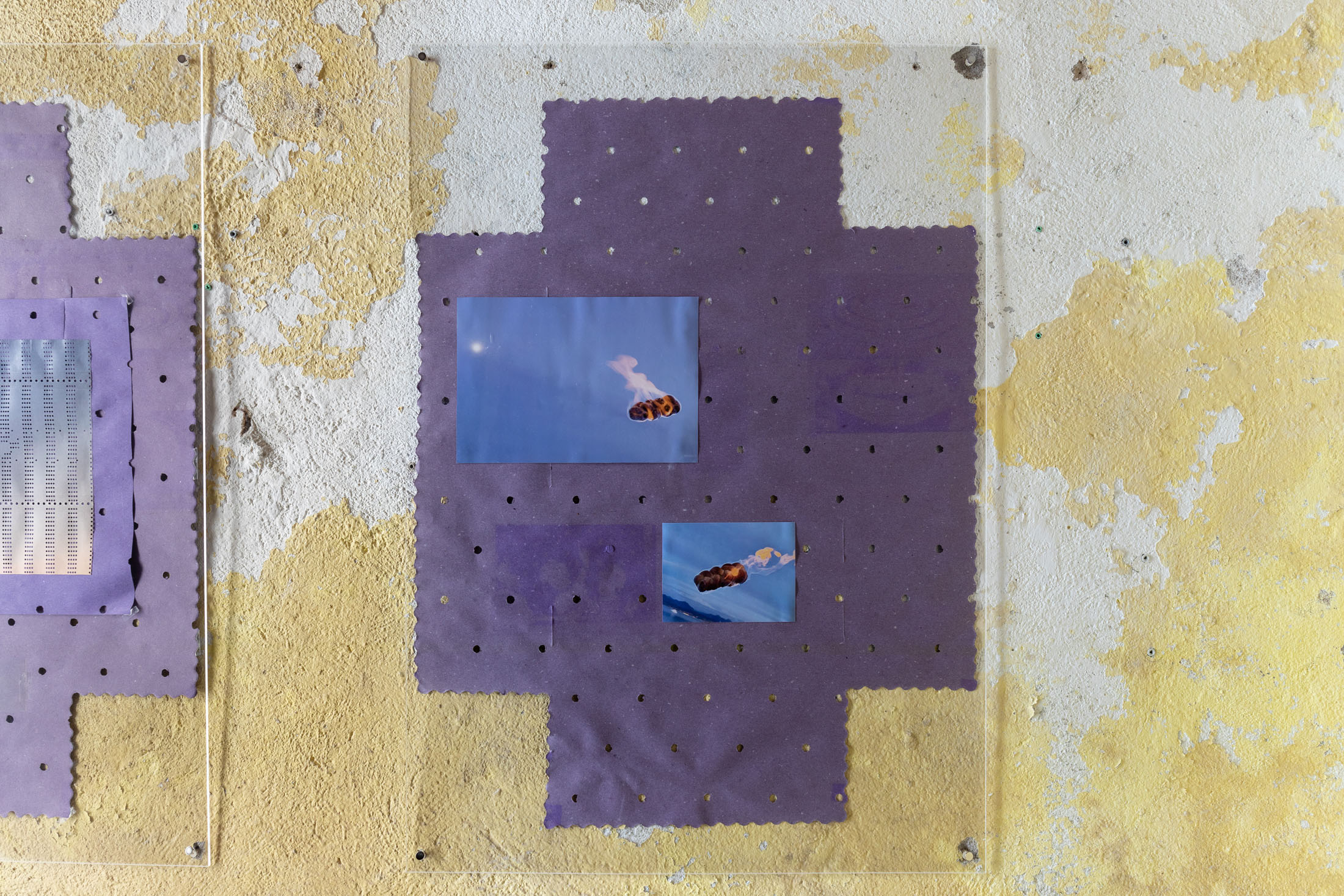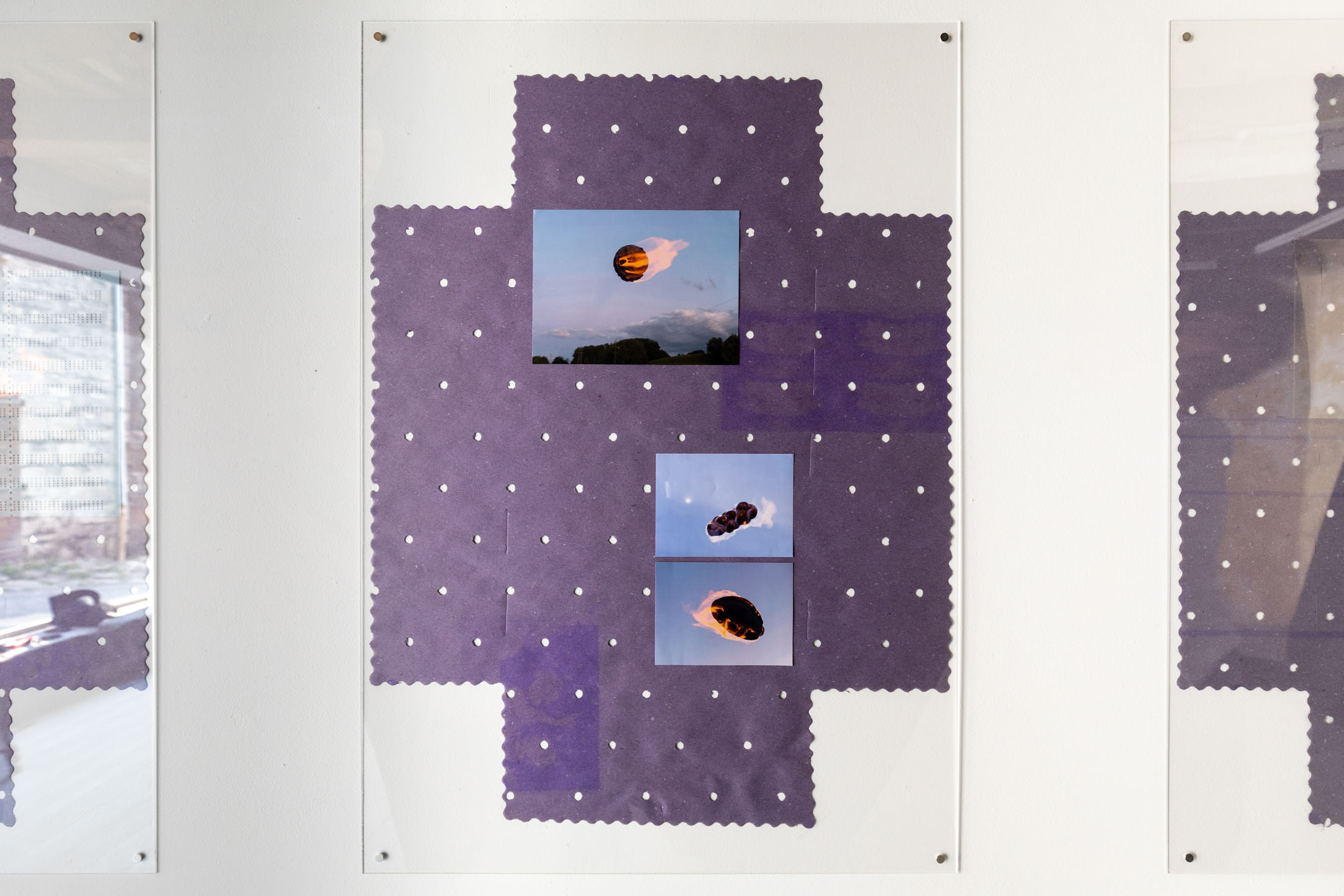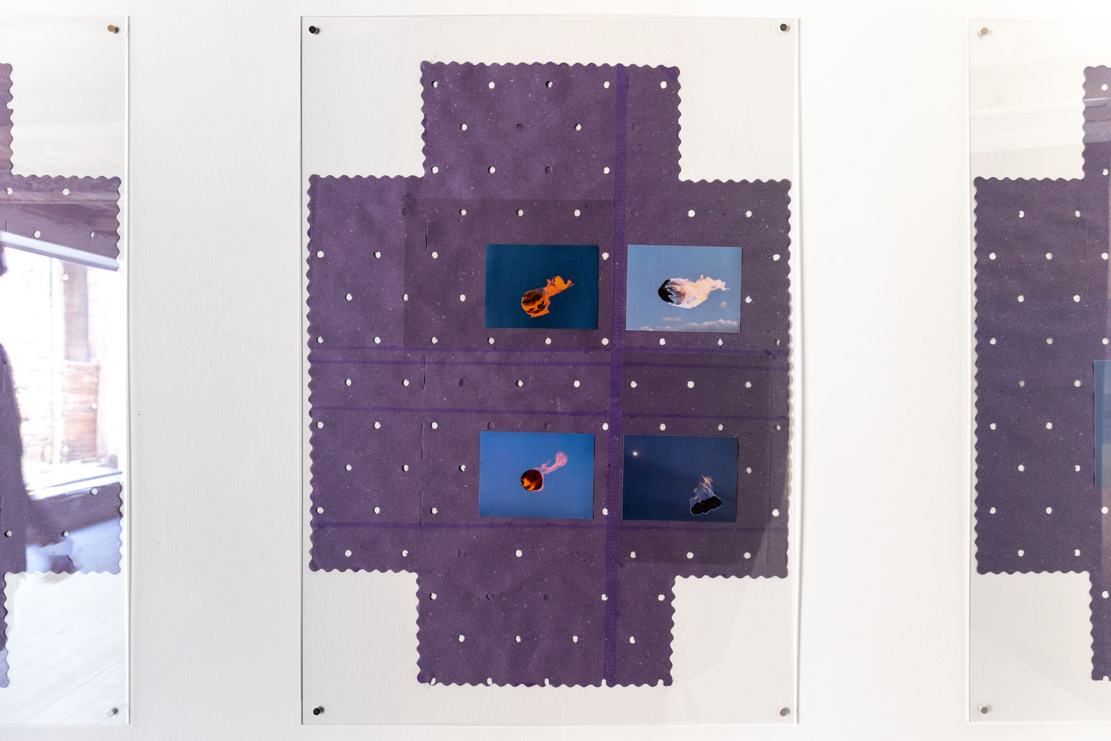 These images also deliberately recall John Baldessari’s series of photographs presenting his most successful attempts to throw three balls in the air in a straight line (Throwing three balls in the air to get a straight line (Best of thirty-six attempts), 1973). Beyond the humorous tone, it reflects the gap between the concept of a work and its realisation, involving a whole host of factors including luck and the weather. Gina Proenza’s pieces, while evoking the legacy of minimalist and conceptual art, are permeated by contingency and embrace variation, thus undermining any form of certainty about the world and art. The way in which these compositions shift images from one medium to another, incorporating other images and papers found during the process, makes them plastic objects of research. The question is always what to do with images and what to do with predictions.