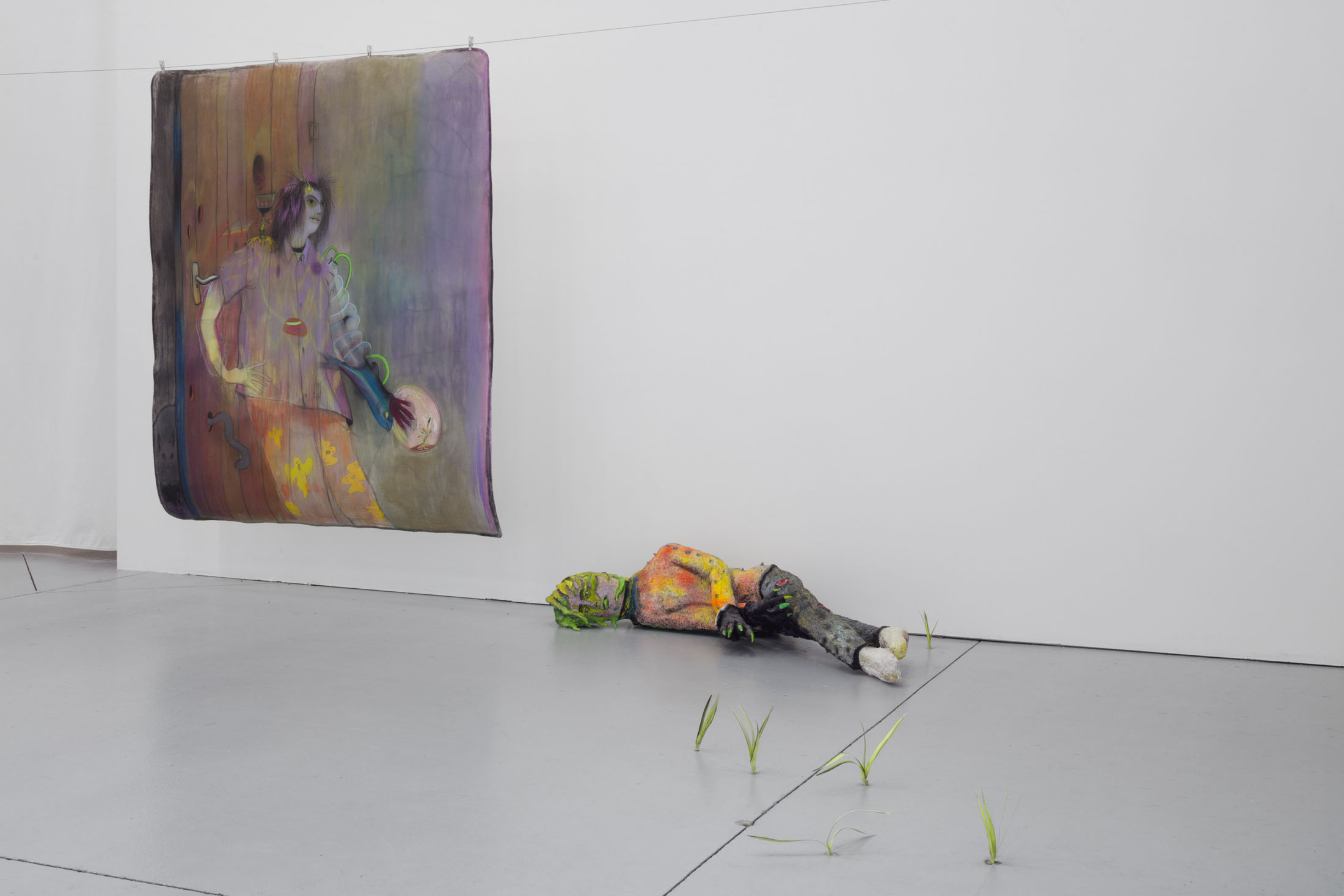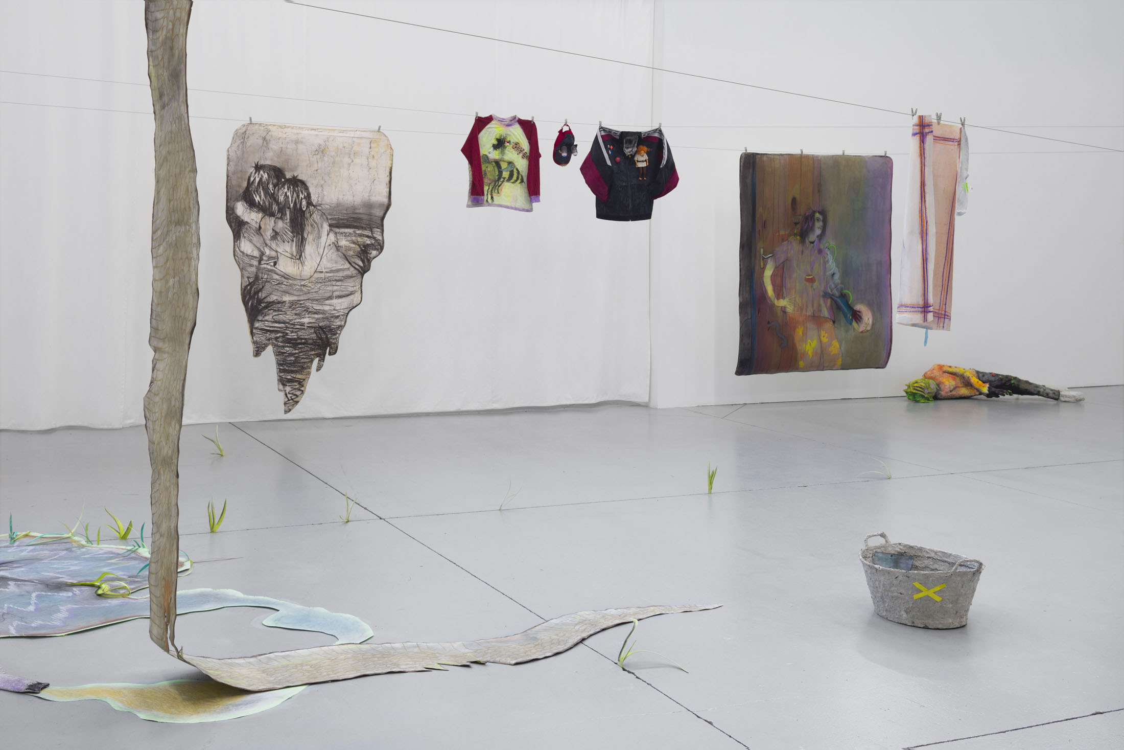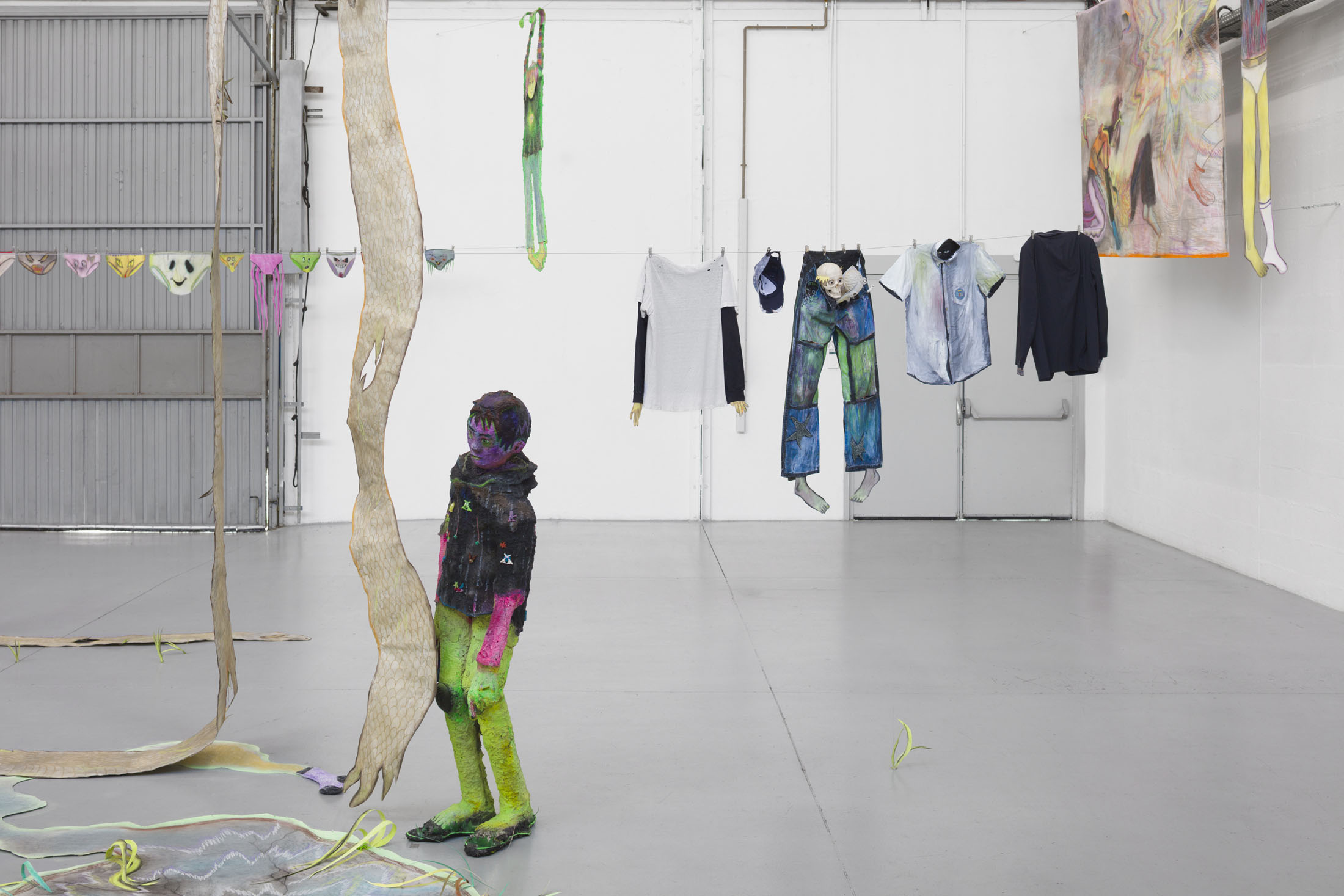If Giuliana Rosso were to launch a fashion line, it would be perfect for the worst imaginable skeletons in the closet—or at least the quirkiest—as her parade of garments, hung like laundry at La Tôlerie, well shows. Dracula’s rubber teeth sprout on a Gatorade cap, creepy masks pop out of pullovers, and a cringe green Huggy Wuggy comes alive on an equally colored, piss-stained pair of jeans. These are just a few examples of a new series of painted second-hand clothes tailored with the inclusion of a variety of vintage toys, avidly accumulated over early morning flea markets scavenges as well as late night Vinted hunts. It’s the first time that the artist paints on clothes, yet it comes as no surprise that it’s not on canvas where paint is to be found, typically accompanied by a series of numerous drawings on dusting paper, also pivotal within her practice. Painting, in Rosso’s clutches, is often pushed beyond its physical boundaries. It manifests in expanded forms; as site-specific interventions, or covering objects of various nature and papier-mâché sculptures. And even when more “classically” placed on canvas, thick layers of pigment spill over the edges, leaving jagged contours as if the paint were being propelled outward into space—defying gravity until there’s nothing left to hold it in place. On this specific occasion, figuration—pivotal in Rosso’s artistic expression at large—is treated in such a literal fashion that it tips into abstraction, as vivid monochrome brushstrokes leave the task of representation to actual objects, allowing for existential tones to emerge together with narrative ones. Analogously, the real is depicted in all its precarity, reaching irreal terrains where each one’s internal demons become disturbingly possible. It makes perfect sense, then, that a miniature Buffy’s flipper floats in a laundry basket, just as a series of cut-into-shape drawings of underwear give a personality to chastity, menstrual discomfort, wounded feelings or disinhibited sexuality: not fantasy nor surrealism, but reality made unstable, porous, and susceptible to emotional and psychological overflow.