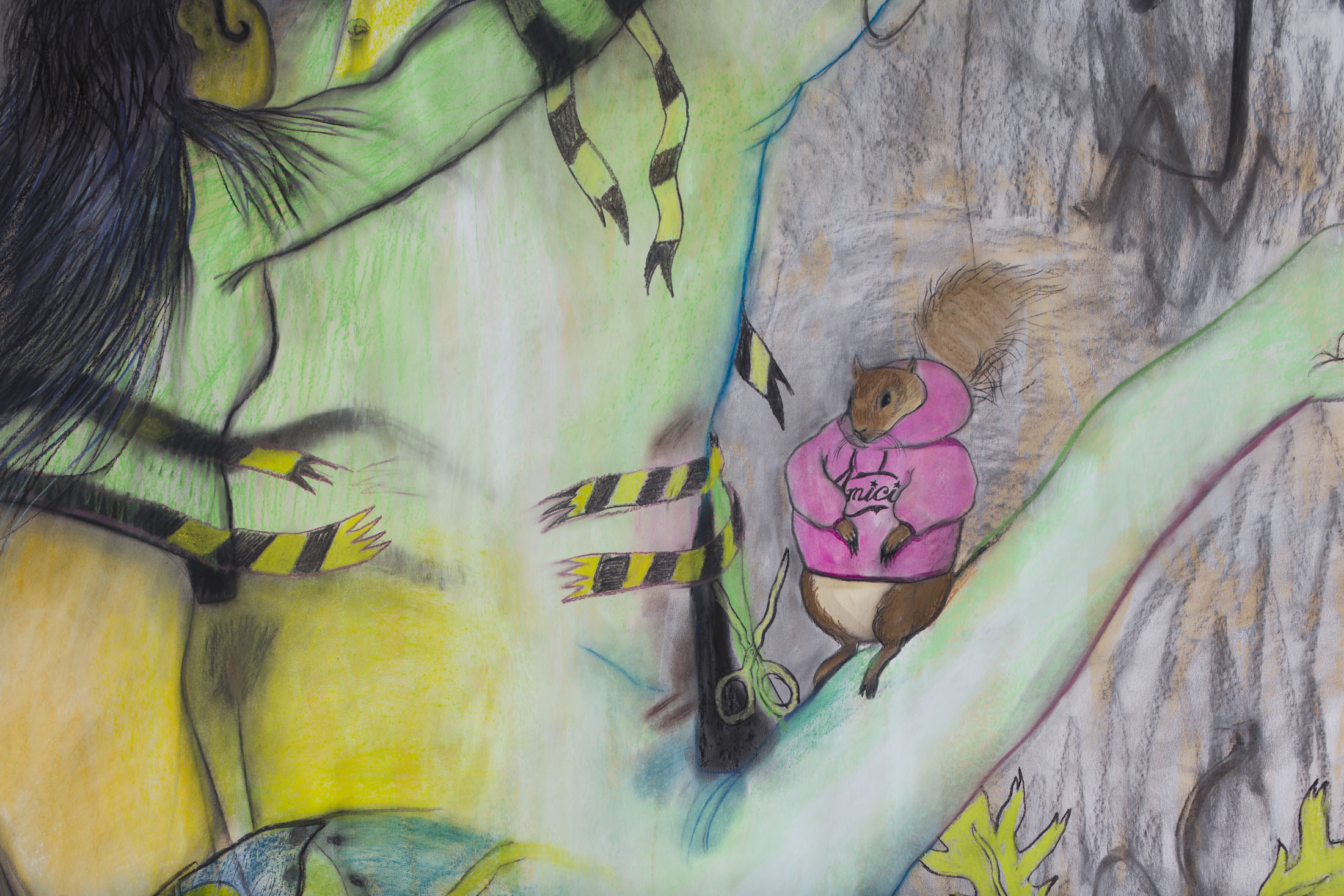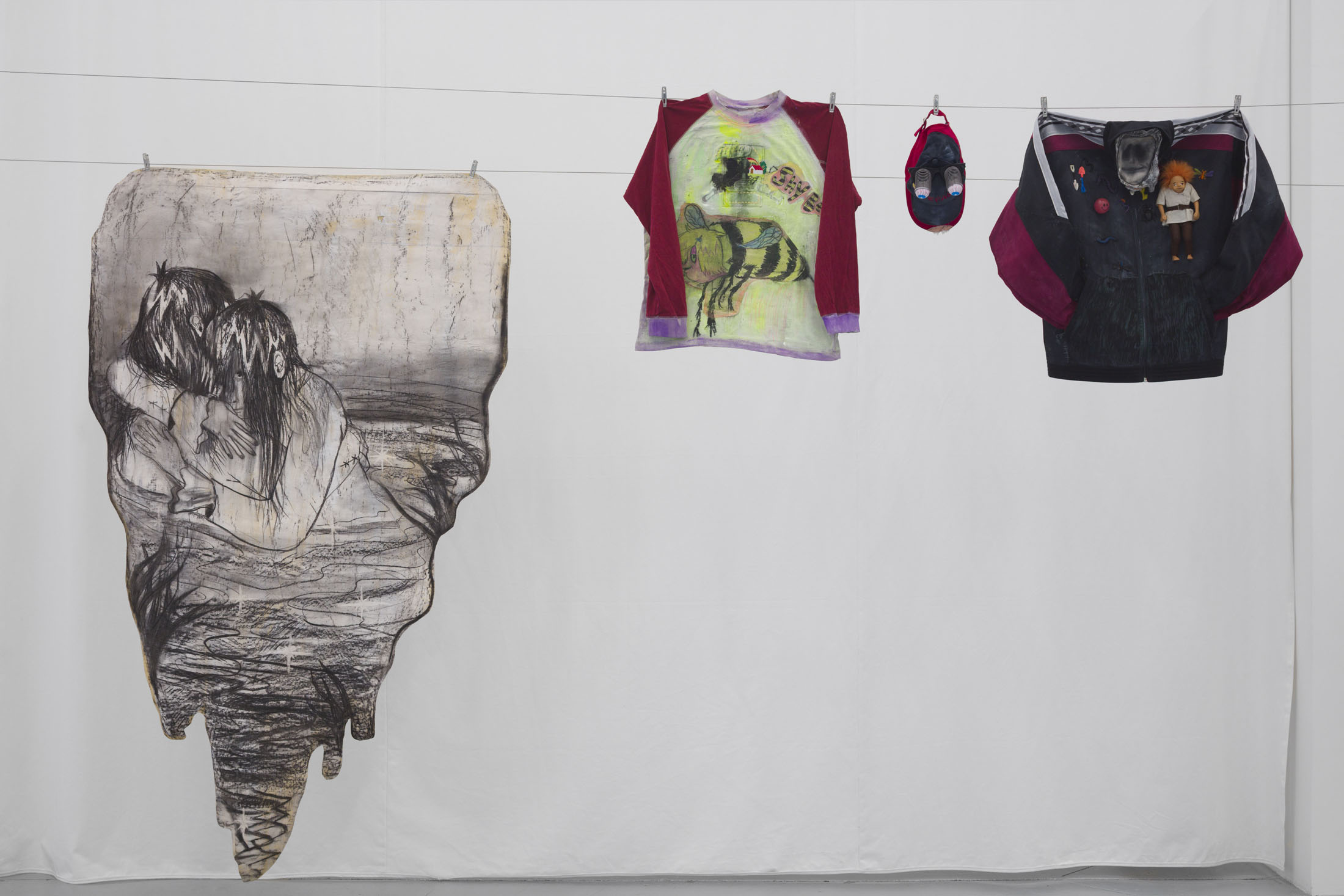 In Rosso’s universe, the everyday is cracked open just enough to let inner perceptions come into shape. Adolescence, in all its sensitiveness, is where the artist temporally and visually places her oeuvre, letting such a collectively shared phase of life become a potent metaphor for a human condition in which chaotic psychological clumps—of shame, aggression, desire, anxiety, or solitude—are told in all their frictional essence. It will be easy to notice visual references to 90s toys and 2000s early internet culture, as well as the depiction of young figures in states of vulnerability or introspection, who navigate a world where the deepest fears materialise and where what’s normally labelled as imaginary or supernatural manifest in moments of impotence. For instance, in Mouse Trap (2025)—the largest-scale chalk and charcoal drawing on dusting paper included in the show— a girl climbs up a tree’s mirroring bark. She has her trousers bent down and a preoccupied expression, visible from the reflection on the strange surface she barely holds to. Both the tree and the girl emanate a precious brightness that stands out precarious in a rather doomed environment, where two cruel figures wait devilishly. One will likely spot many other half-naked figures in the show, as well as references to genitalia. While there is a sense universality from Rosso’s tackling of sexuality and its taboos, ranging both irony and anguish, her androgynous figures also specifically expose the complexities of gender identity in ever more violent heteronormative environments, from current far right political orientations to family’s nucleus mindset, unveiling the fear and horror of not being able to come of age as queer or trans subjects. The same choice of proposing a hanging system inspired by laundry lines hints at a private dimension, traditionally domestic. In Italian, there is a common proverb, i panni sporchi si lavano a casa propria, indicating that the dirtiest and shameful aspects of life should not come out of one’s household. Here we are, back to the skeletons in the closet! Overall, the painted and drawn garments that fill the space become more than clothing: they are surrogate skins and bodies’ extensions, bearing traces of personal and collective testaments very much alive in all their hunting spectrality.
