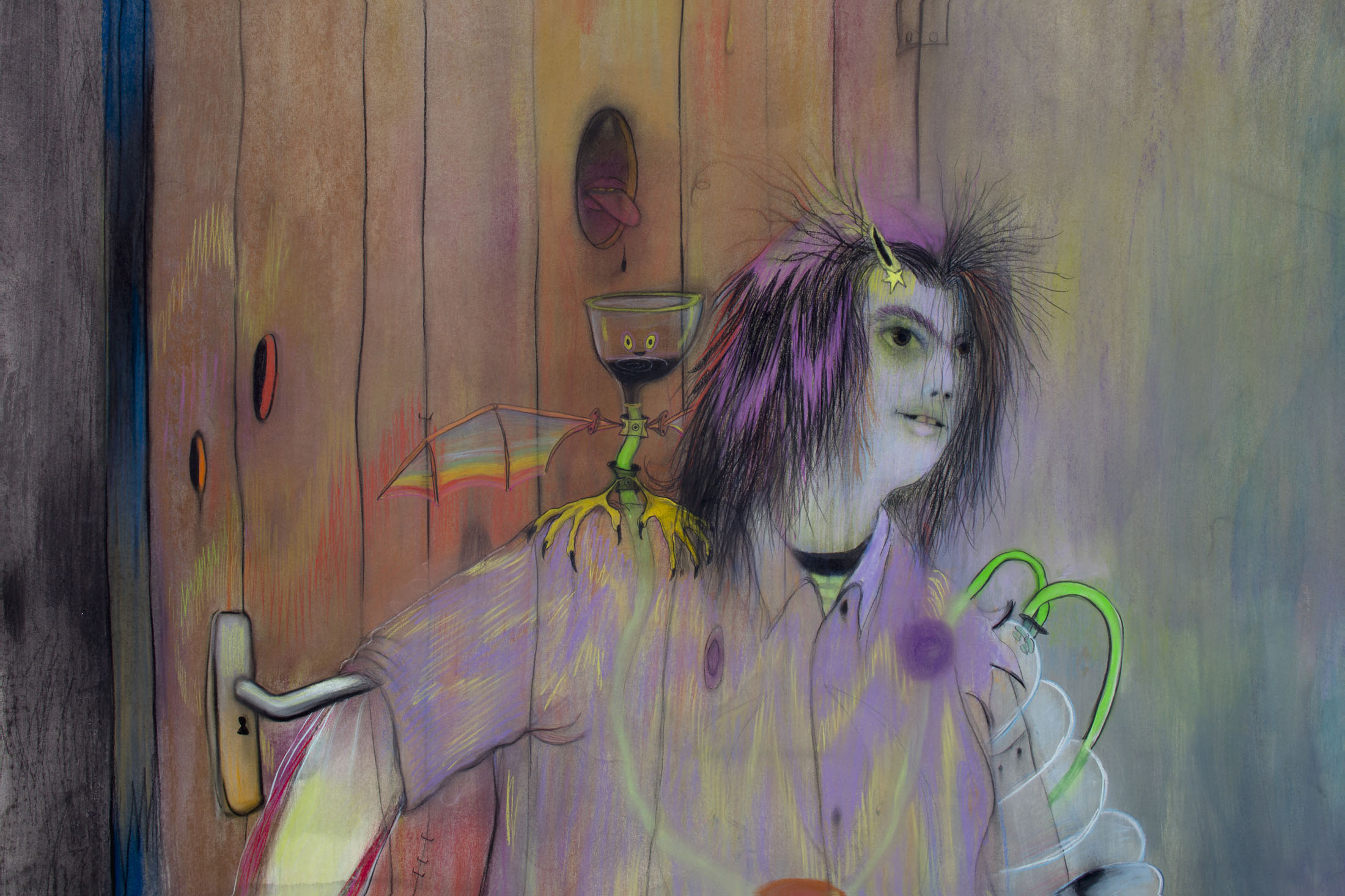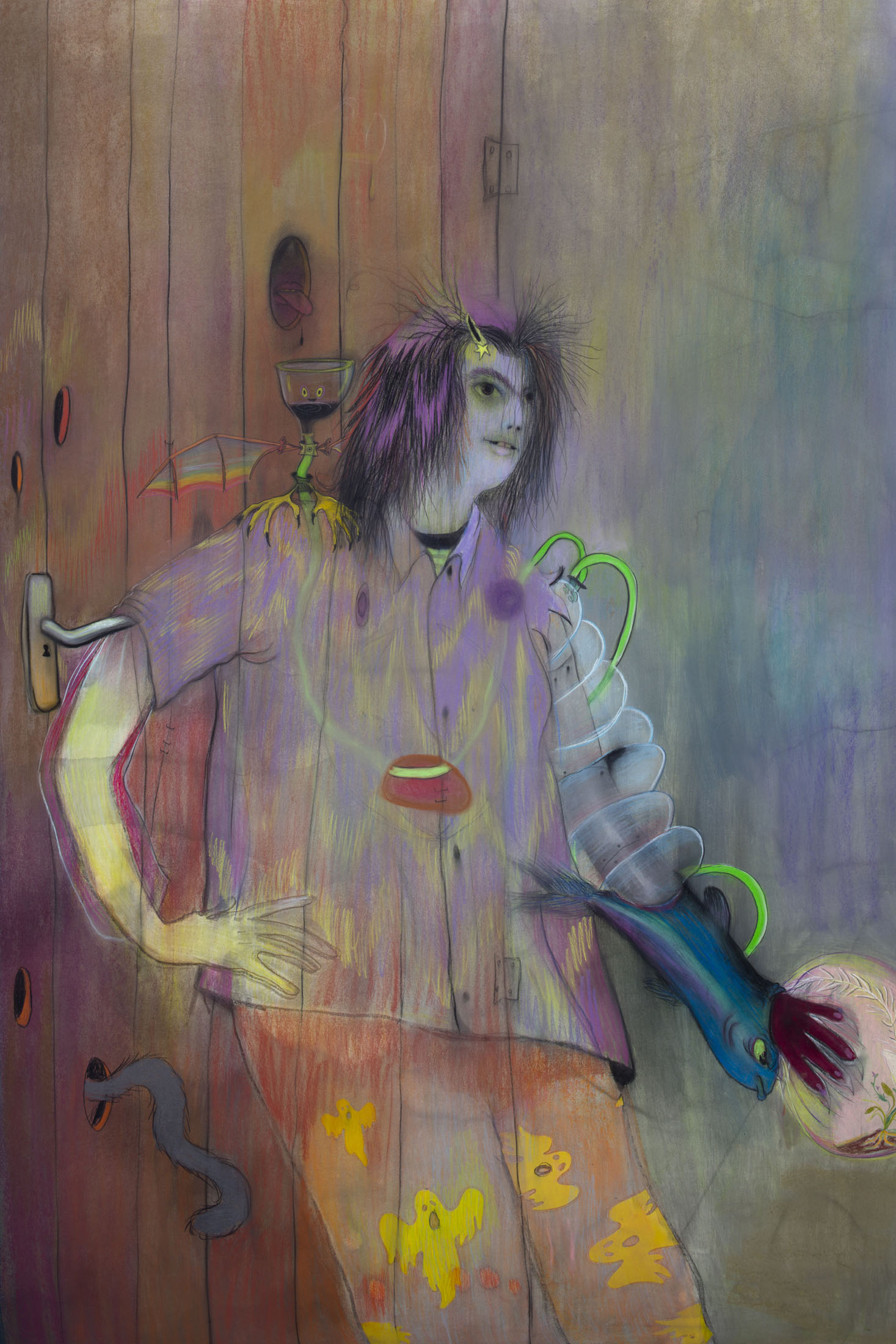 The motif of the double recurs frequently too, addressing the most untangled relations of self and other within settings, such as forests or bodies of water, which are perfect tropes for inner and intimate states. Possa qualcuno che non ho visto, che non vedrò mai (2023) is one of my favourite works ever made by Rosso. It shows a beautiful figure embracing another one, submerged in a spiral-shaped pond. The hug feels tender, melancholic. It’s intimate. There is a sense of quietness, perhaps an invite to trust and let go to the fluid, watery essence of emotion. The hairstyle and clothing of the two figures are identical, suggesting the two might as well just be one, while a six-fingered hand is a subtle acknowledgement of the imaginary nature of the scene. Its spontaneity offers a softness that is important to mention as lightness is, in fact, a key component despite the intense emotional terrain that Rosso covers. Her works range loosely across various artistic disciplines (collage, drawing, painting, sculpture), letting free expression candidly manifest in all its splendour. Here, clumsiness is beauty: wild and fragile like a blade of grass. There are guardians and protectors in the show, from the squirrel perched on the tree’s mirrored branches in Mouse Trap (2025), to the chicken-legged wine glass over a boy’s shoulders approaching the unknown in The World is a Vampire (2024). Even a mischievous mosquito on a starry blanket in Terapia (2025) acquires cute notes, bringing pep to the feeling of suspension that characterises the entire show. Among the few works that touch the floor, Muta di Basilisco (2025) is a giant Basilico’s discoloured shed skin flopping inert. As the king of all evil looks like a fading memory, it serves as a reminder that what Rosso brings forward is a site of recognition, rather than a battleground, dedicated to all that is repressed, unspoken, disallowed—yet alive, thus worthy of a name. We decided to personify all this as a group, under the name of The Hoverers. They are those who inhabit the most intimate dimensions, and that will make one feel naked, perhaps finally light. What words cannot express will be lived in the show.