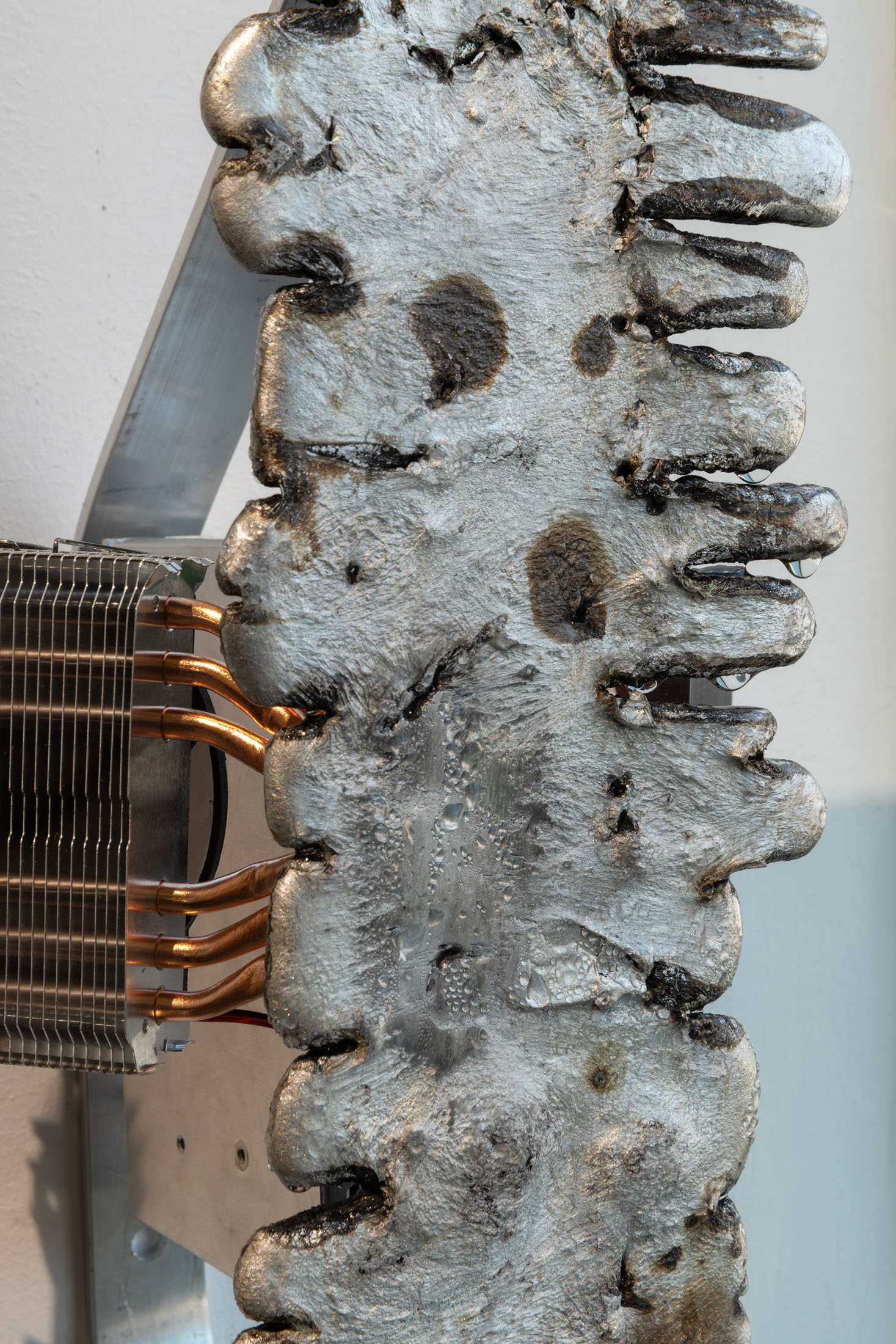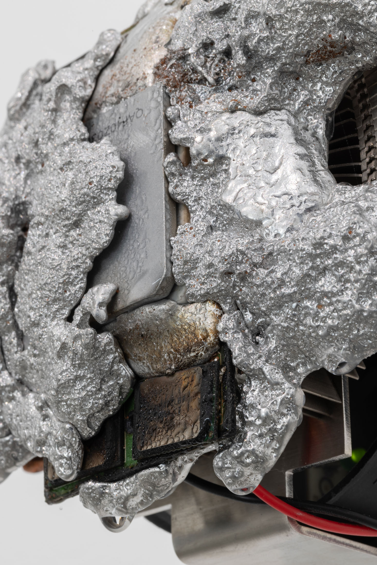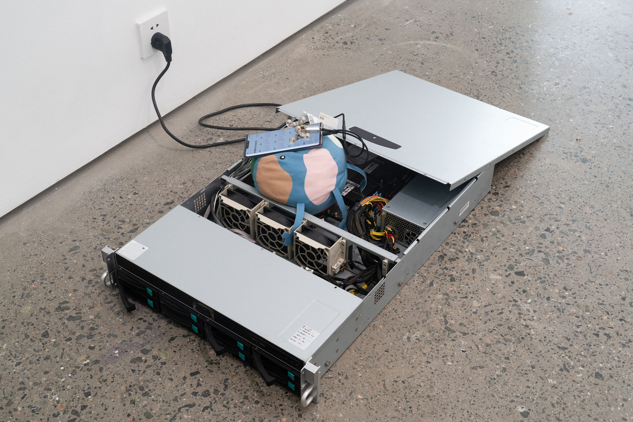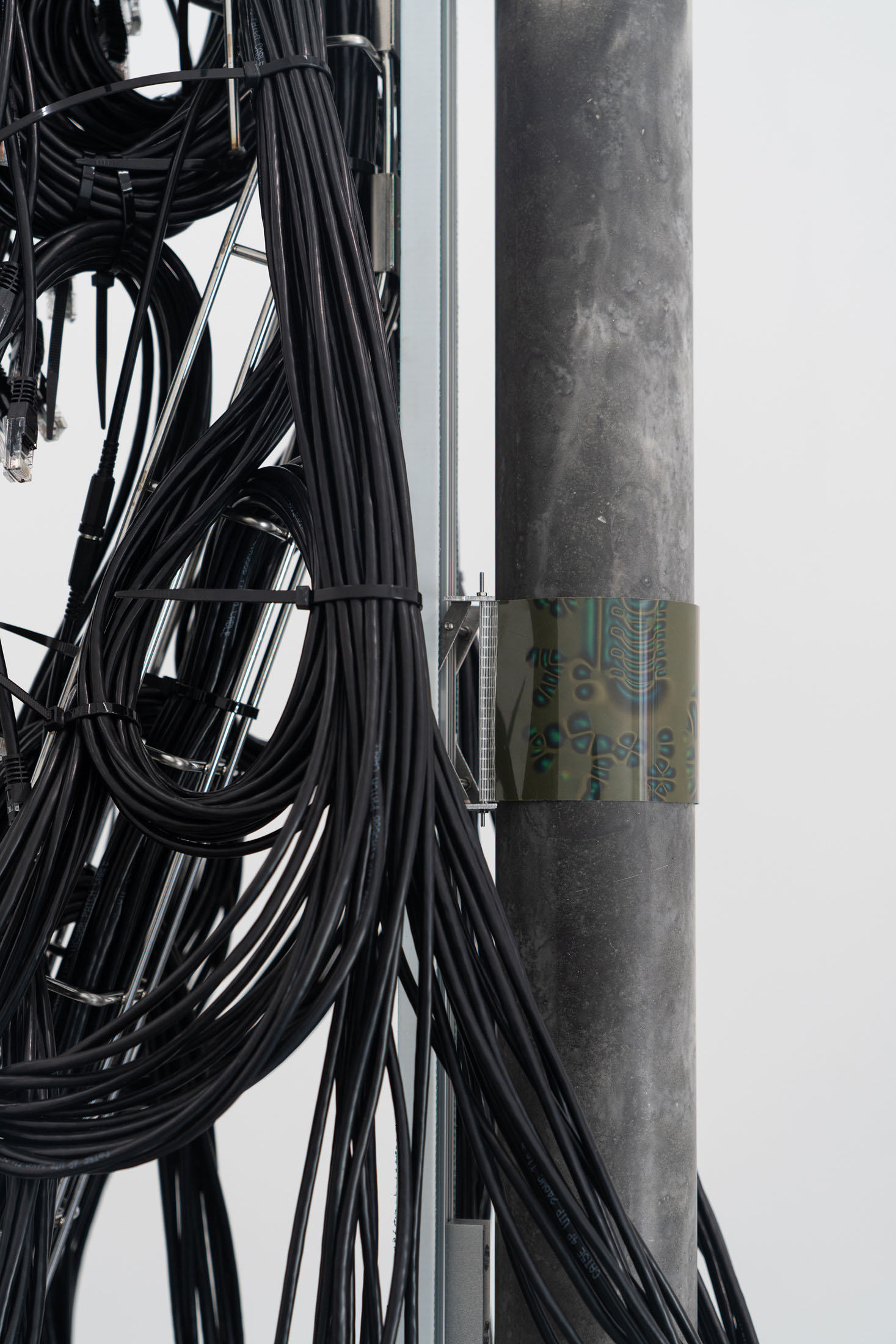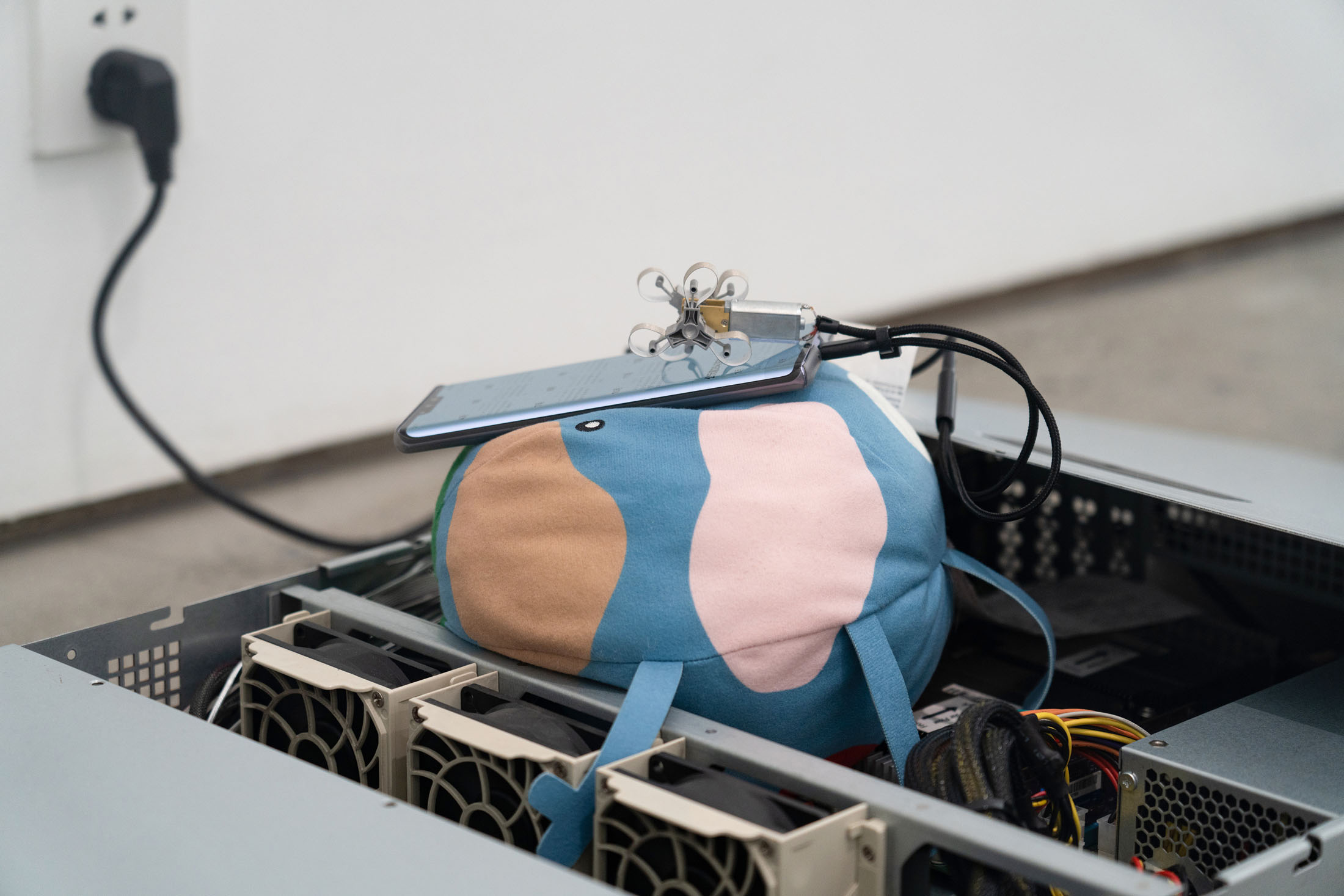 Entering the data center, two slowly rotating rock cores are wrapped in clusters of network cables cascading from overhead cable trays. As a green film sweeps across their surfaces, the rock cores reveal primordial soup-like totems resembling cellular structures or organic markings. In the corner, a server hosts a smartphone pressing against an Earth-shaped fabric toy, running a calendar app programmed to last until the system’s temporal limit—approximately 29.2 billion years, significantly exceeding the known age of the universe. This piece alludes to the anthropomorphization and commodification of the environment, highlighting the technological infrastructure’s consumption of geological resources. Nearby, chips encased in molten metal hint at the destructive potential inherent in technological advancement.