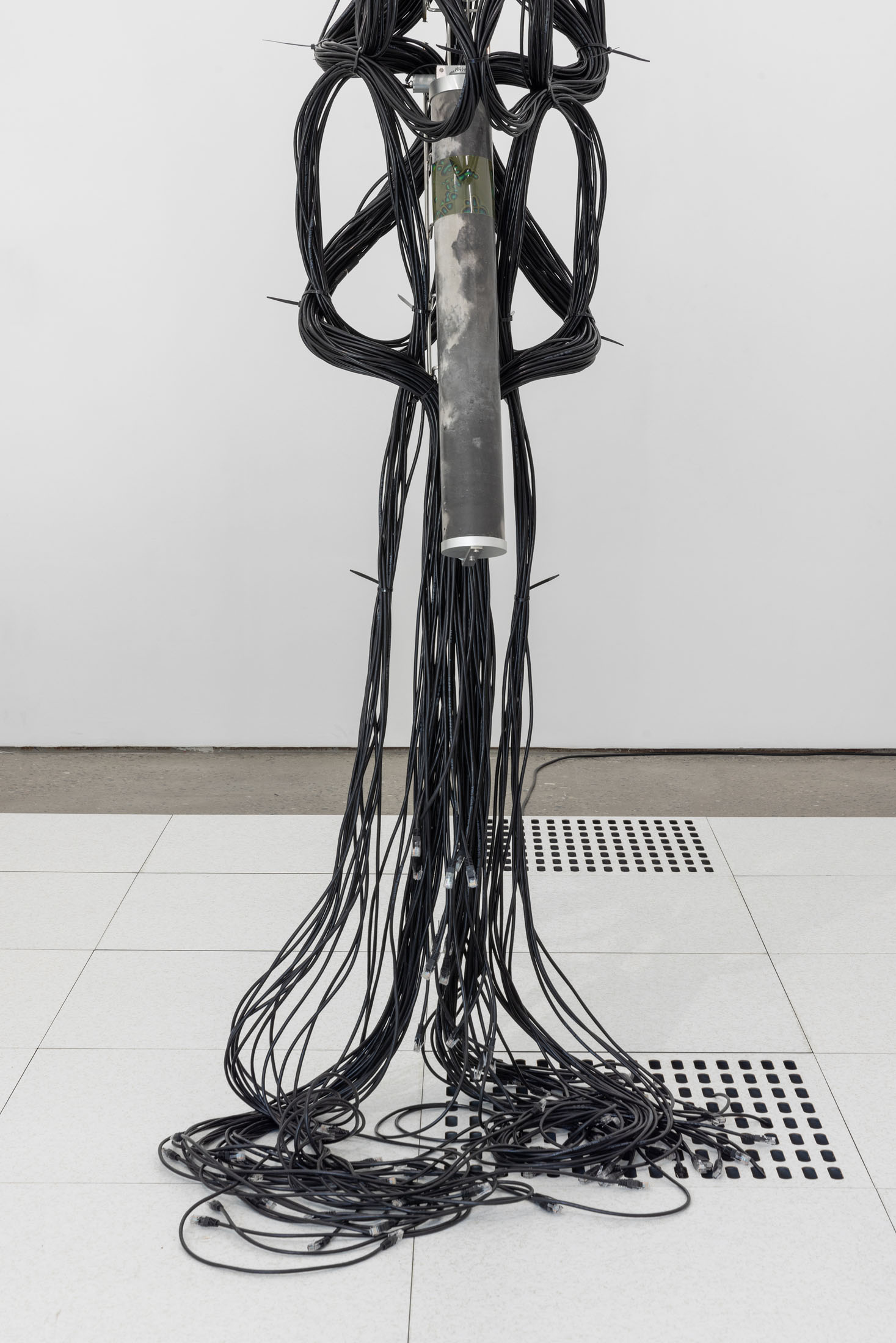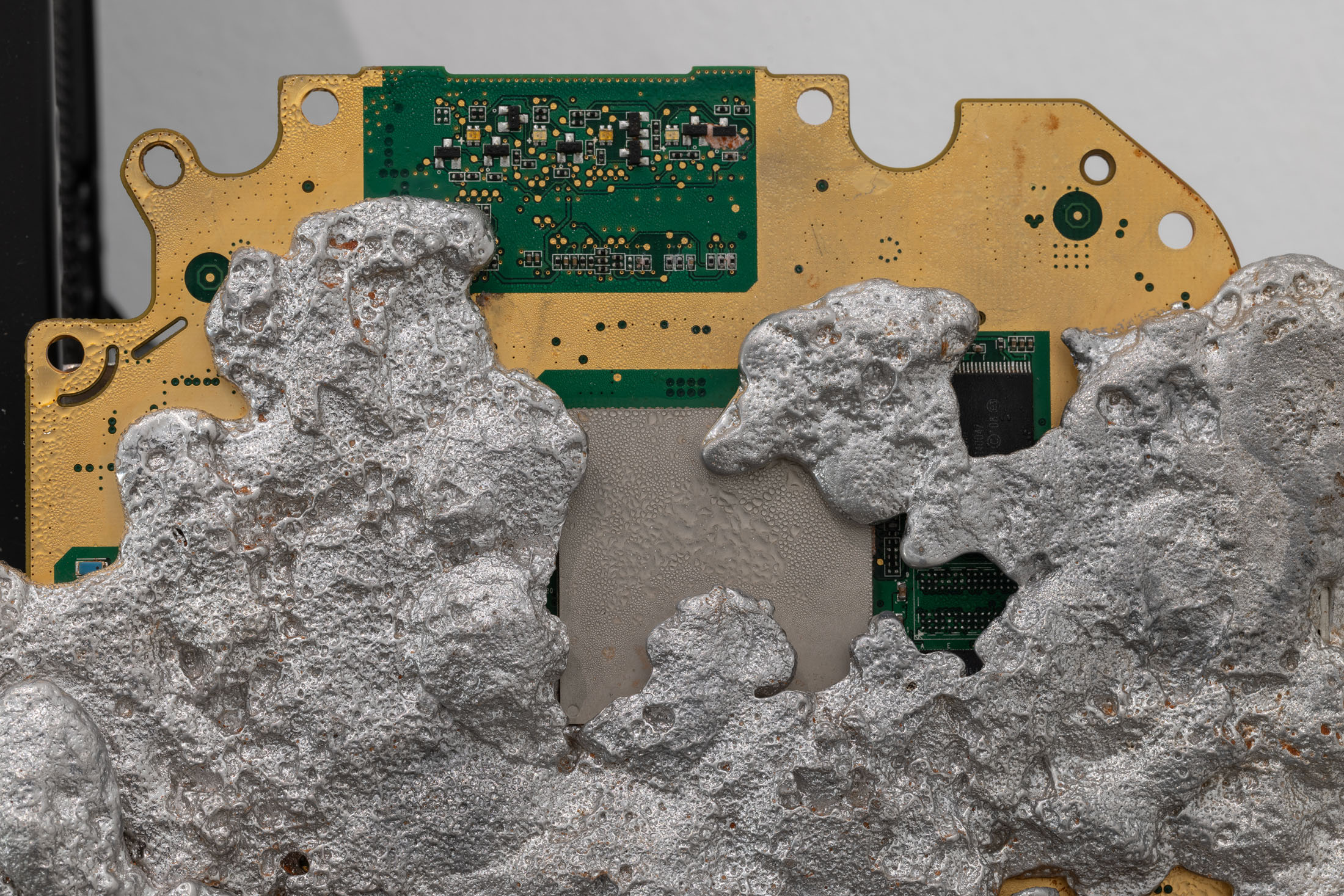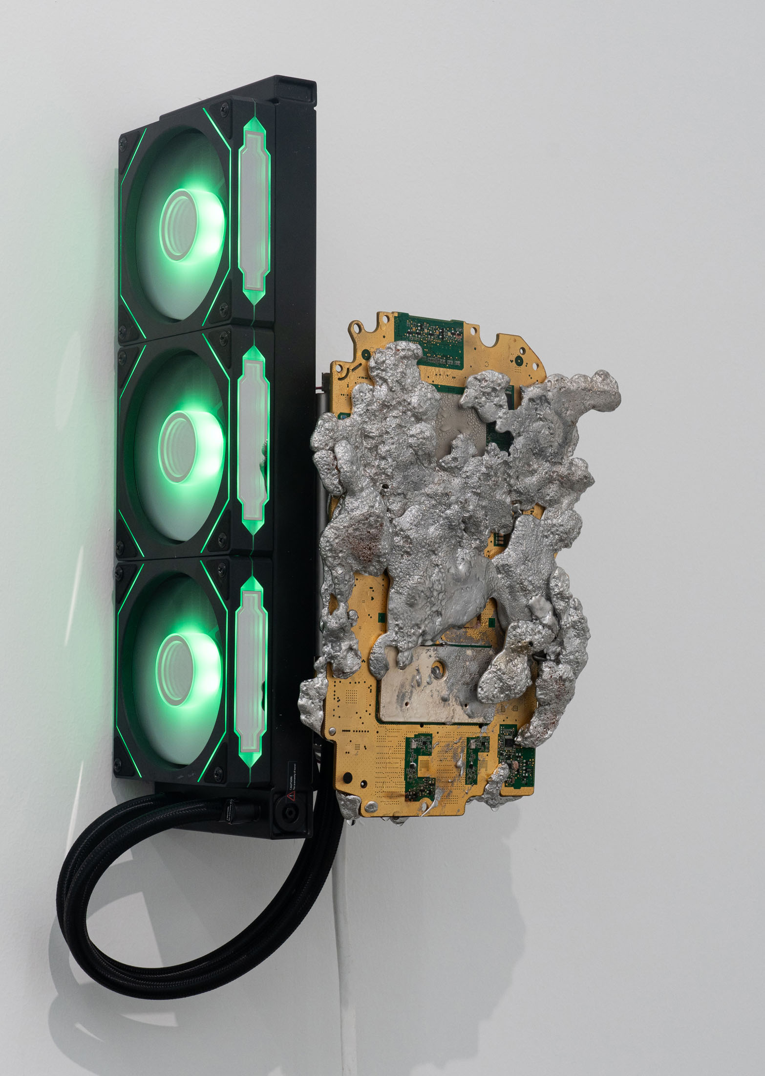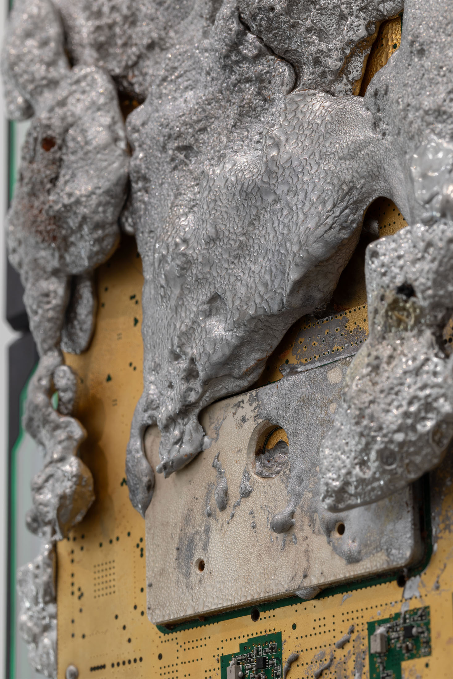 Entering the data center, two slowly rotating rock cores are wrapped in clusters of network cables cascading from overhead cable trays. As a green film sweeps across their surfaces, the rock cores reveal primordial soup-like totems resembling cellular structures or organic markings. In the corner, a server hosts a smartphone pressing against an Earth-shaped fabric toy, running a calendar app programmed to last until the system’s temporal limit—approximately 29.2 billion years, significantly exceeding the known age of the universe. This piece alludes to the anthropomorphization and commodification of the environment, highlighting the technological infrastructure’s consumption of geological resources. Nearby, chips encased in molten metal hint at the destructive potential inherent in technological advancement.