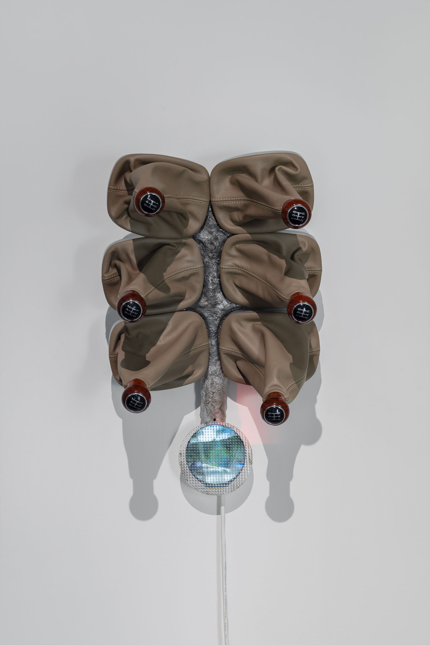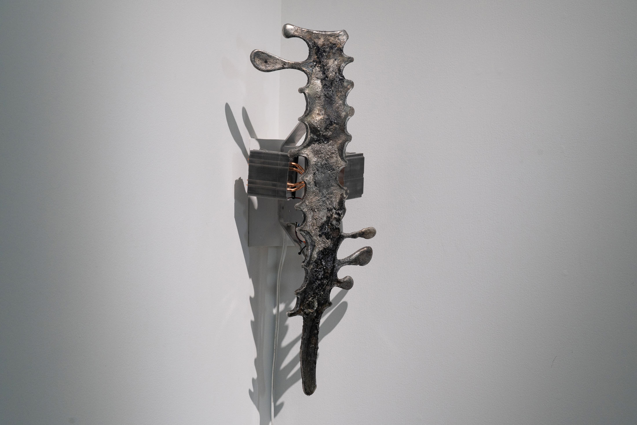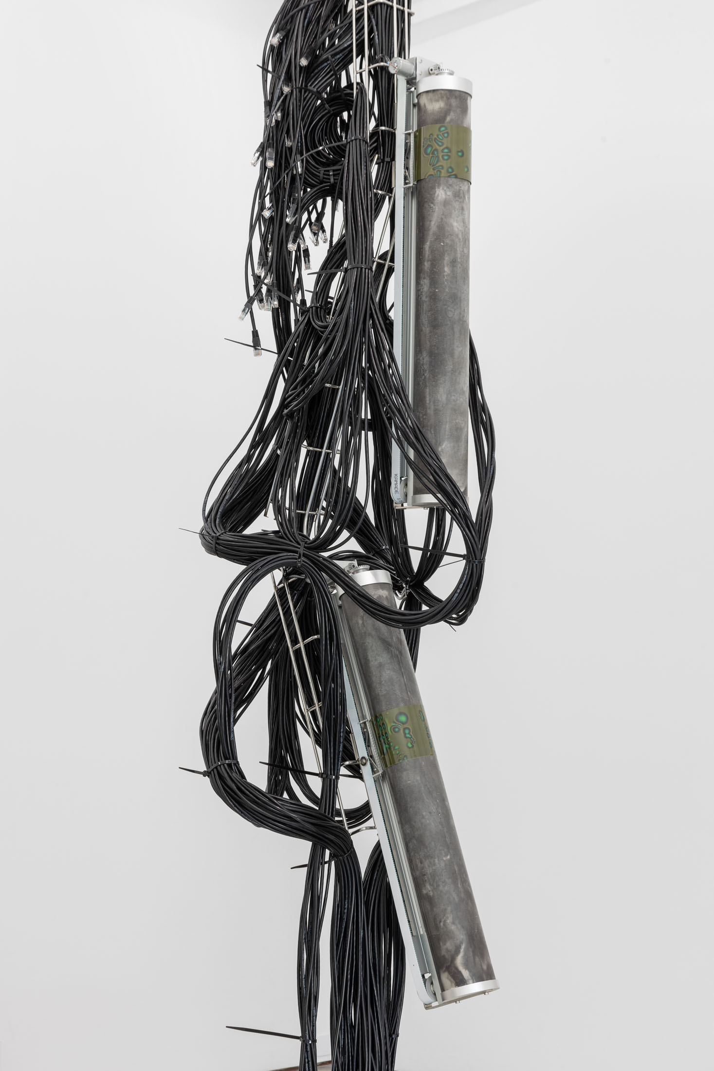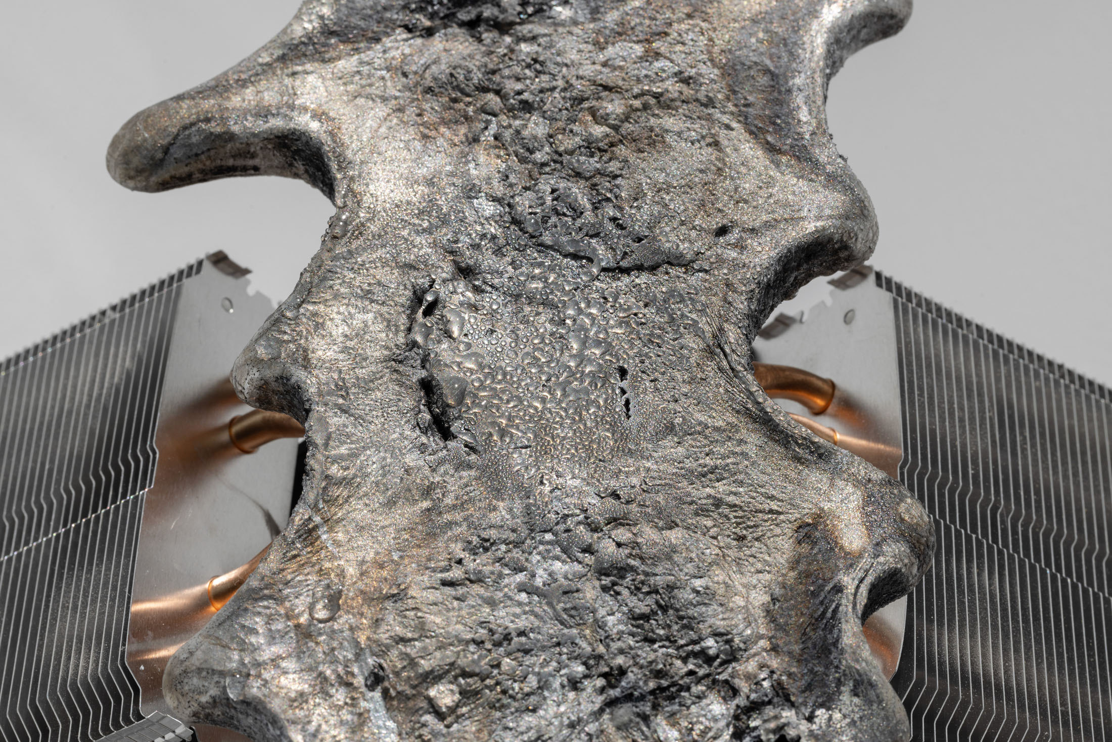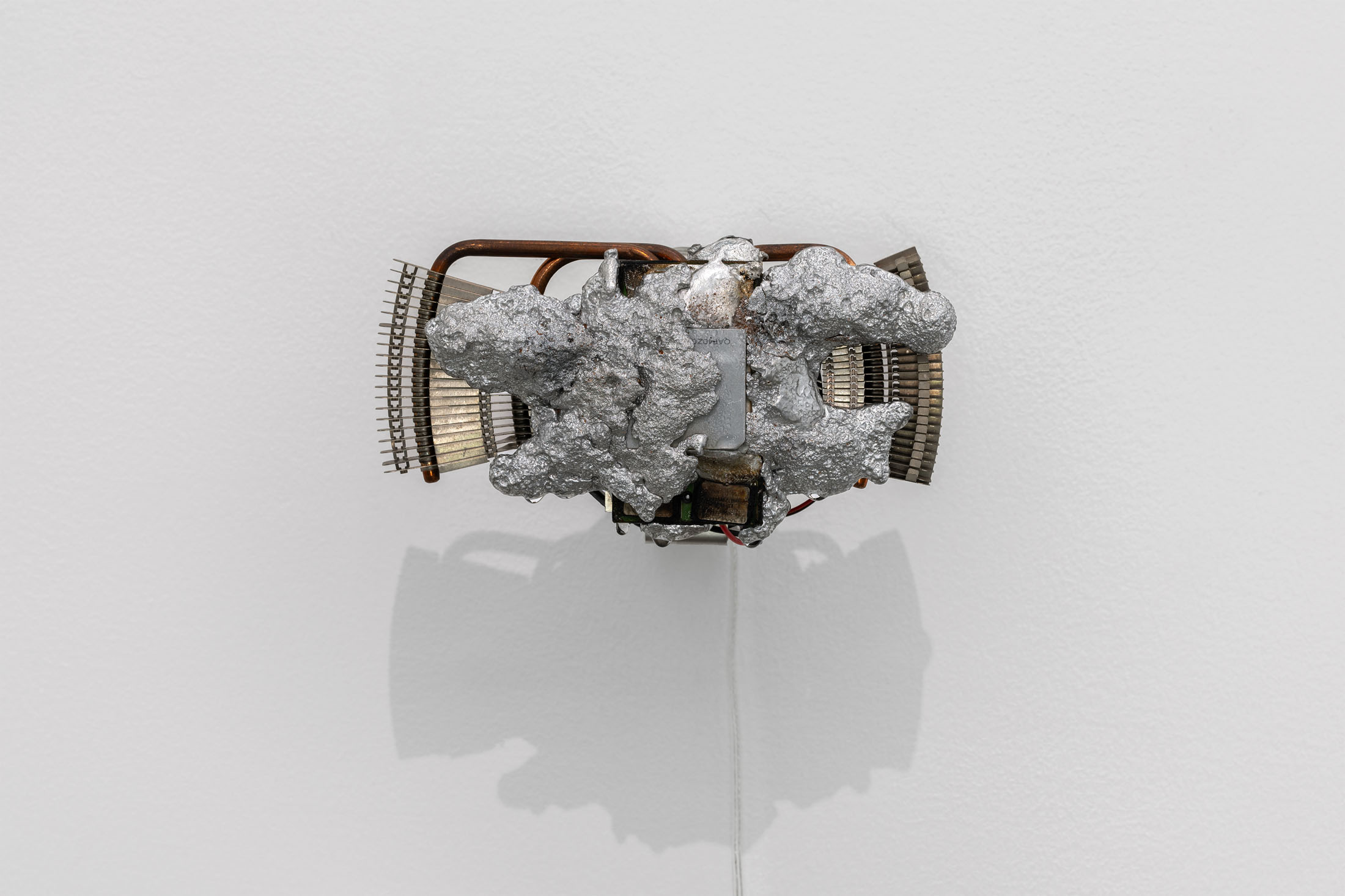 Entering the data center, two slowly rotating rock cores are wrapped in clusters of network cables cascading from overhead cable trays. As a green film sweeps across their surfaces, the rock cores reveal primordial soup-like totems resembling cellular structures or organic markings. In the corner, a server hosts a smartphone pressing against an Earth-shaped fabric toy, running a calendar app programmed to last until the system’s temporal limit—approximately 29.2 billion years, significantly exceeding the known age of the universe. This piece alludes to the anthropomorphization and commodification of the environment, highlighting the technological infrastructure’s consumption of geological resources. Nearby, chips encased in molten metal hint at the destructive potential inherent in technological advancement.