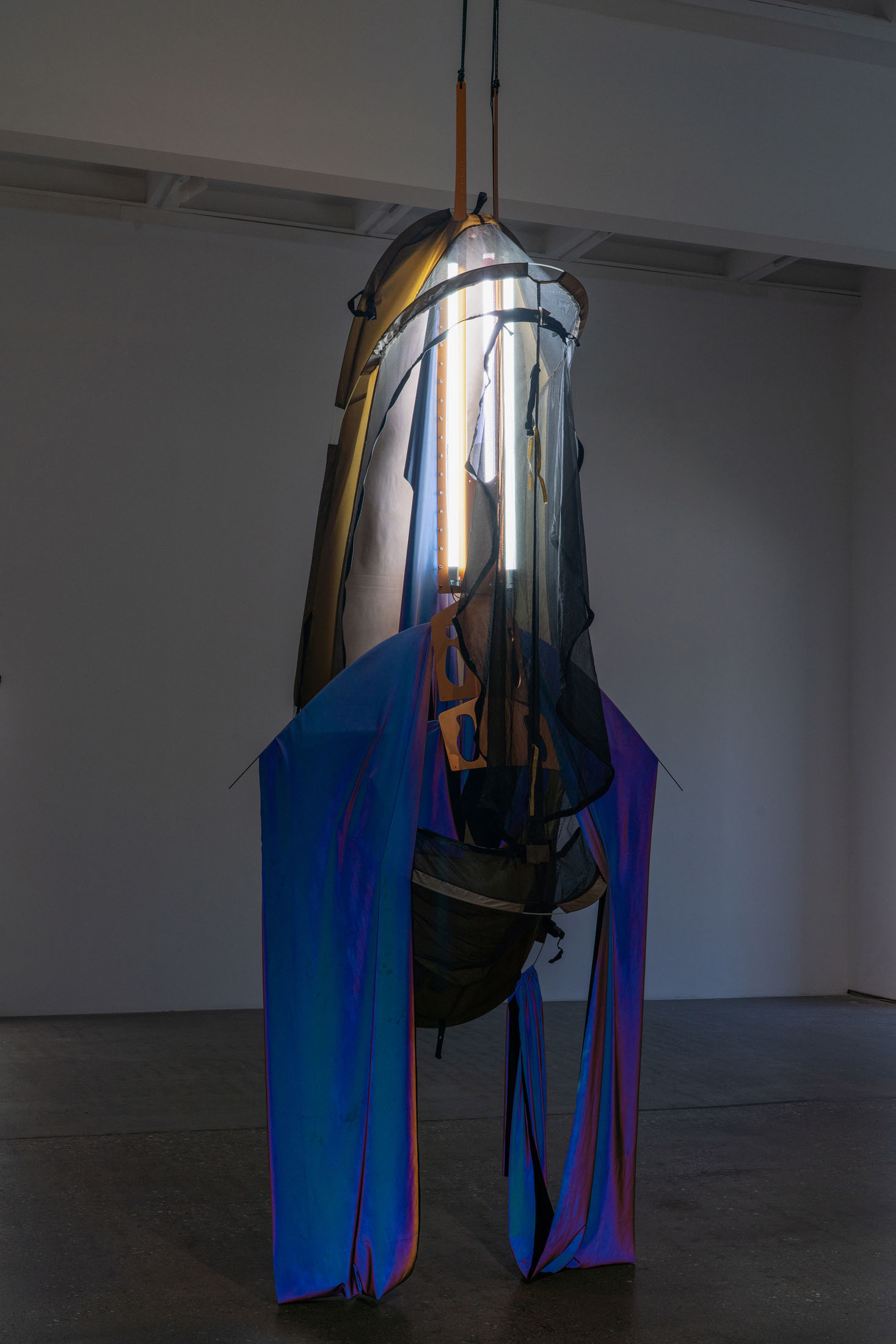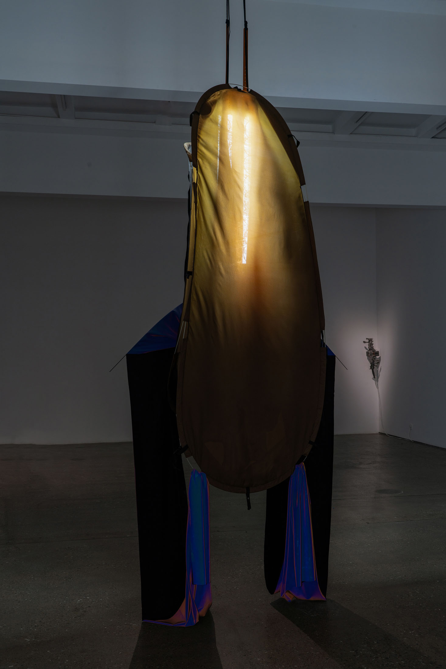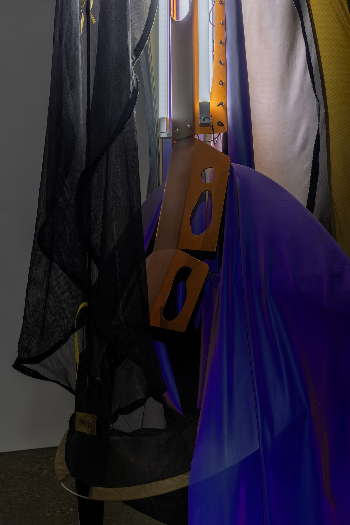 Passing through the “window” into the second scenario, viewers encounter a luminous tent installation inspired by Guo Cheng’s experiences of attracting insects with artificial lights during field research in Motuo. One hypothesis about nocturnal insects being drawn to light is that they use moonlight to navigate, and artificial illumination disrupts this mechanism. Visitors approaching the installation mimic the insects’ phototactic behavior. Works within this same area can be seen as “quasi-objects,” forming a complex network composed of contemporary technological infrastructures—roads, power generators, cables, condensers, and their byproducts. Simultaneously, these pieces demonstrate nature’s resilient mechanisms of self-regulation, which remain uncontrollable and constantly in dynamic equilibrium.