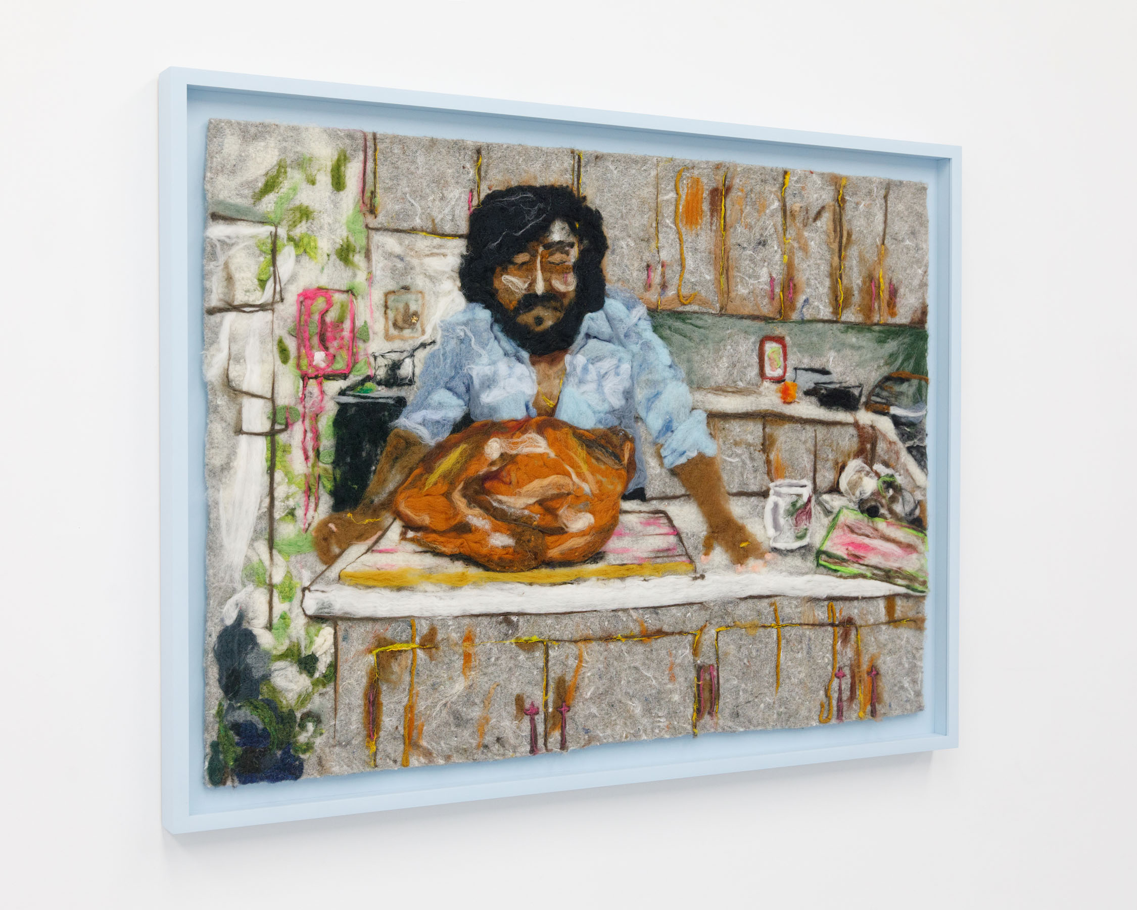 Across the works presented in this exhibition, food appears as both subject and symbol—a conduit for memory, a site of intimacy, a language of belonging. Joseph’s felted compositions soften archival images of family memories related to shared meals, transforming them into dreamlike impressions of family, diaspora, and time’s quiet erosion. Amiri’s sewn textiles reconstruct intimate scenes of dining tables, celebrating spaces where cultural identity is prepared, consumed, and passed down. In her works, food is both nourishment and nostalgia, a reminder of places left behind and those reimagined in new lands.