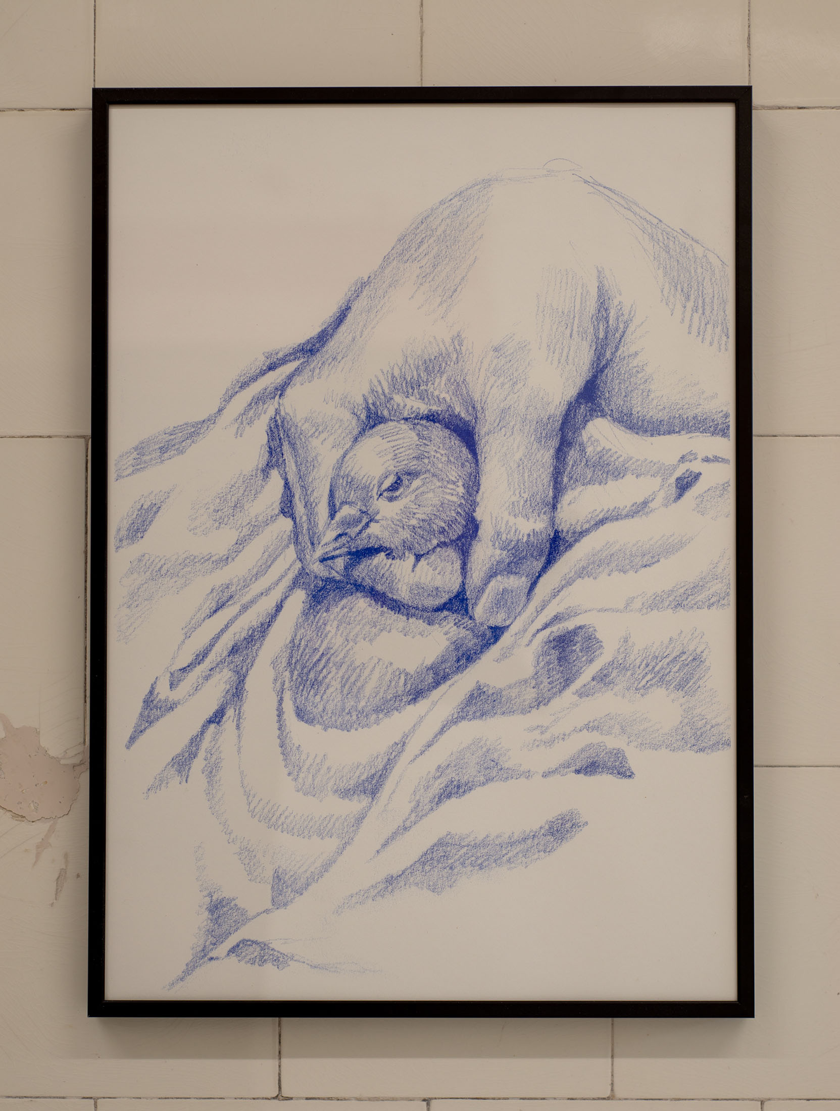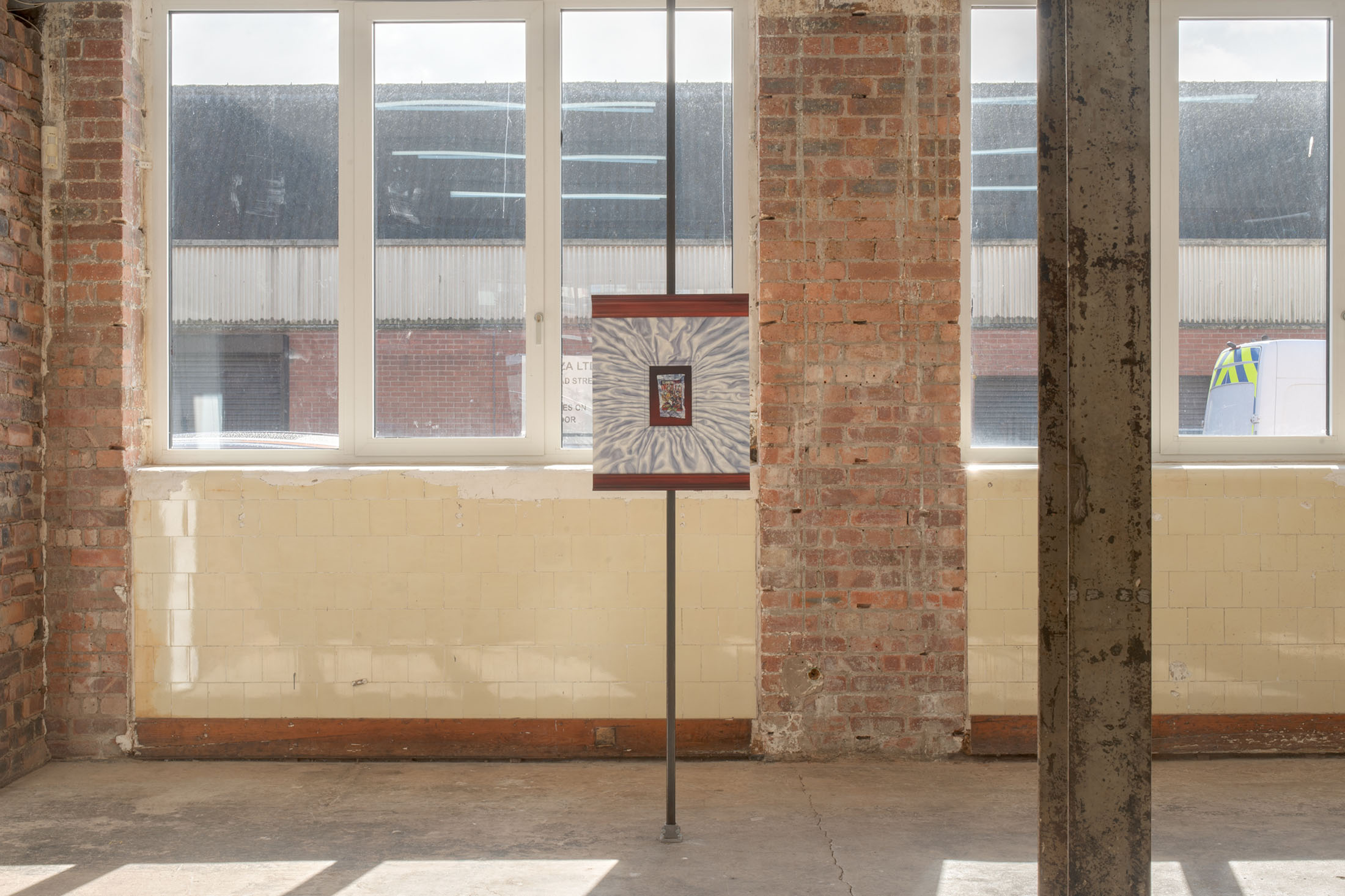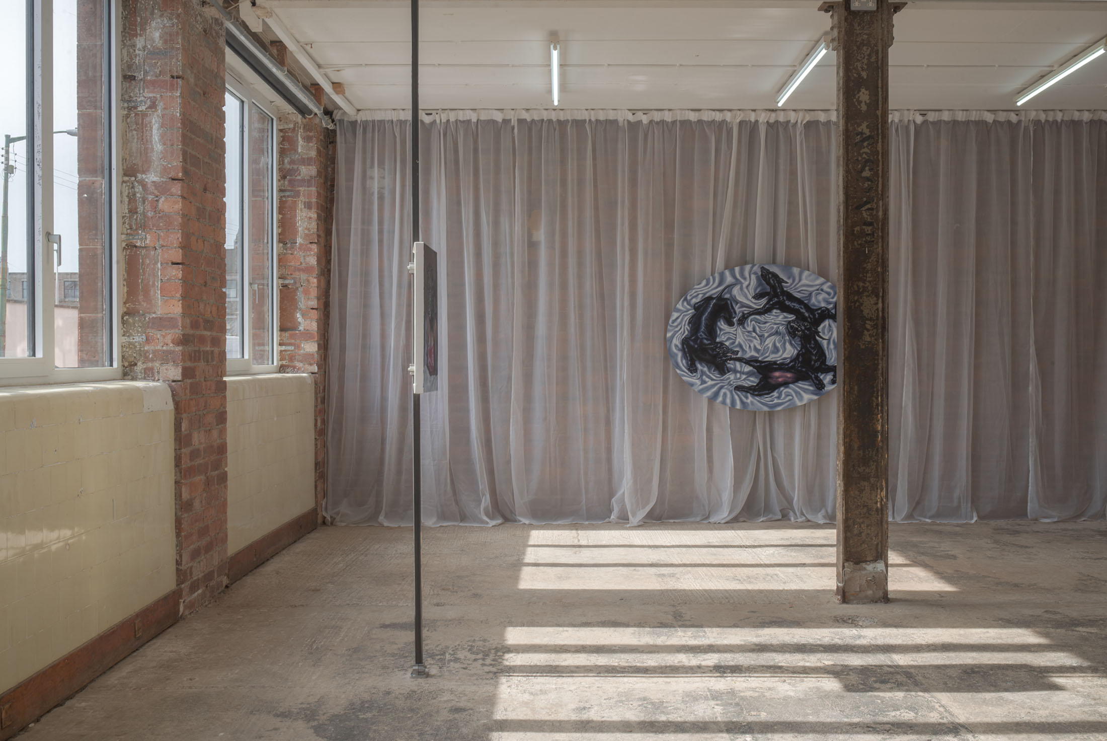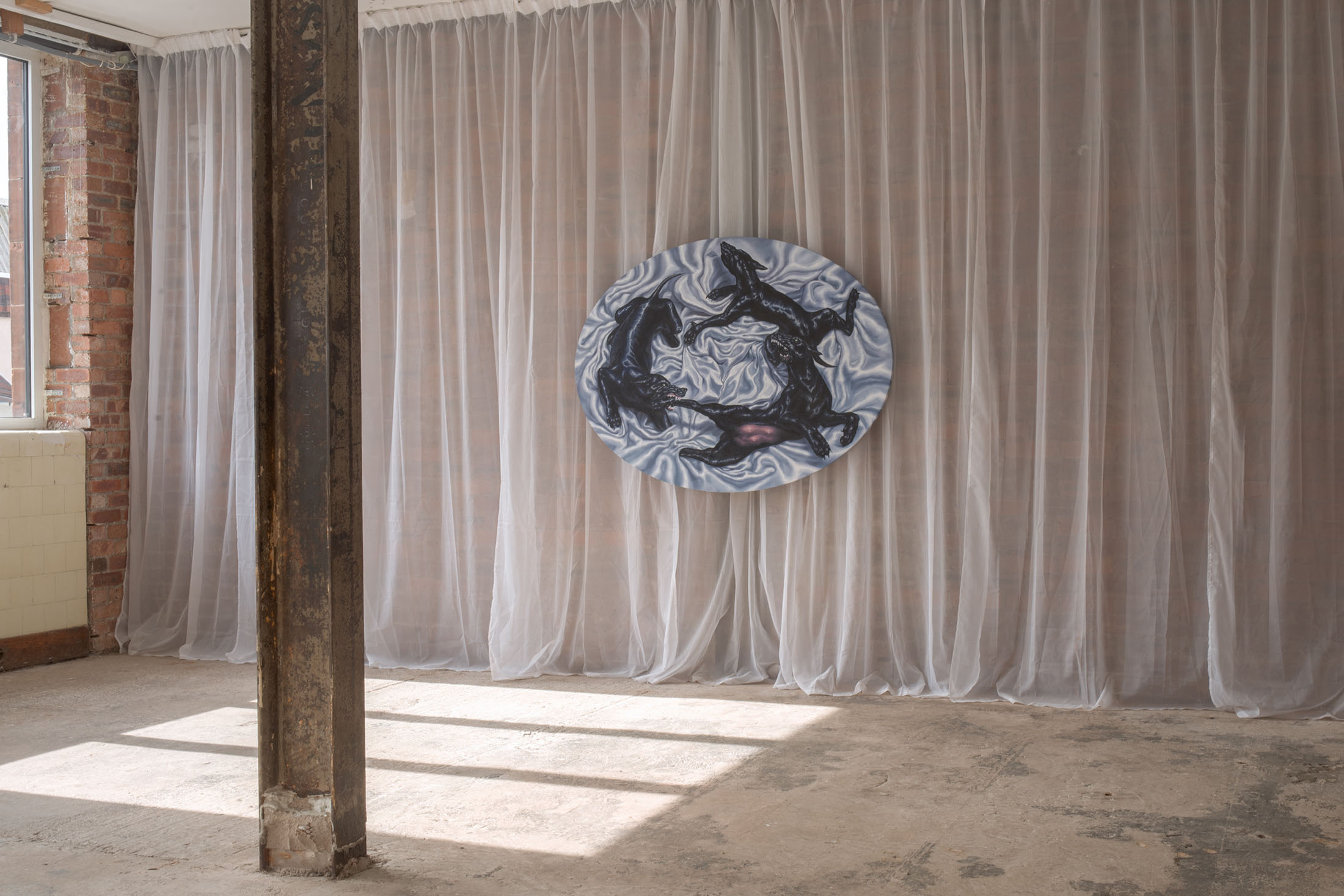 Her signature metaphor multiplied into a vicious cycle of bloodless bites. Grandmother, mother, daughter. Violently protective by nature and necessity. Subjects swathed and surrounded by cloth. A theatrical presentation of the transfer through generations of anxieties and traumas. She pays close attention to framing these things. This is about inherited emotional patterns between mothers and daughters. It is hypnotic with its combination of directness (it is all here, on the surface of things) and yet because of that, it almost has the opposite effect of an optical illusion, cropped so tightly with dizzying painted motion. Silk sheets swirling into a timeless storm. A sense of laboured time and care prevails.