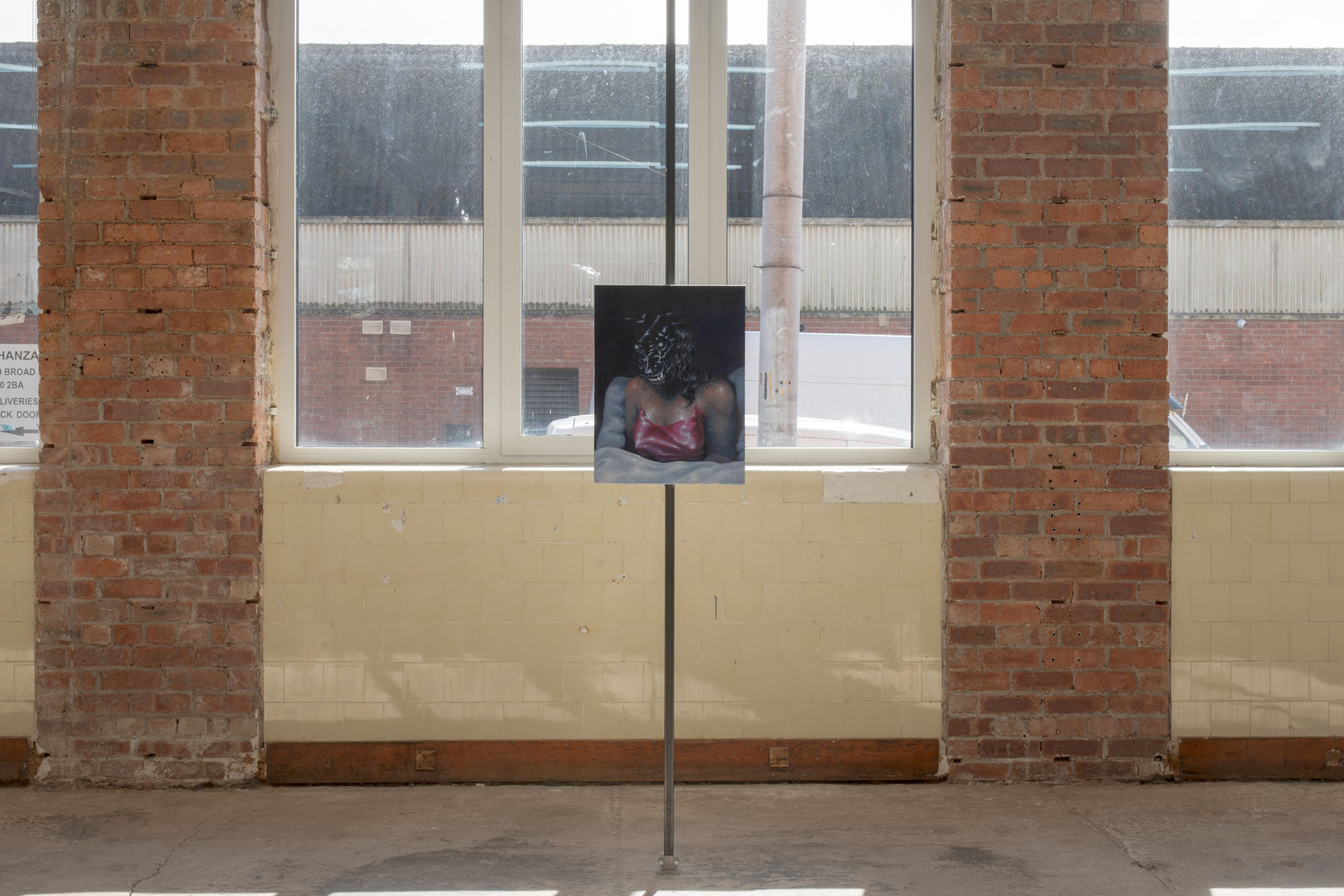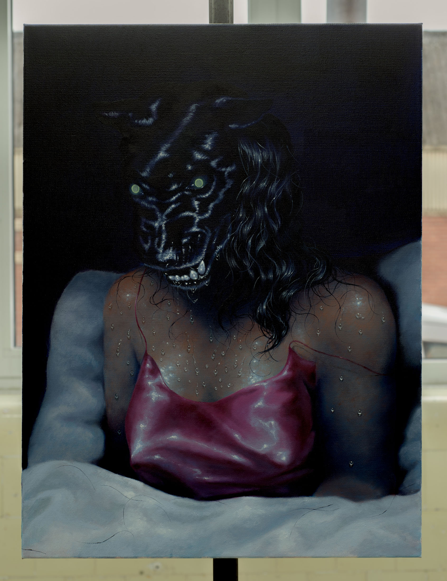Growling anxiety and disrupted slumber. Waking into a bad dream, sweating amongst the comforts of her bed. A vulnerable, poisonous tension. These paintings reinforce the value of visual drama to understand invisible curses. This is deeply personal, and so the bedroom. And in her bedroom, she suffers in silence. Violence and sensuality, bowed head and heavy thoughts. There is a fixation, a singularity here (she is ready to?). She says the bedroom is a space where emotional inheritance and bodily memory accumulate over time, fixed in the shoulders and the brow.