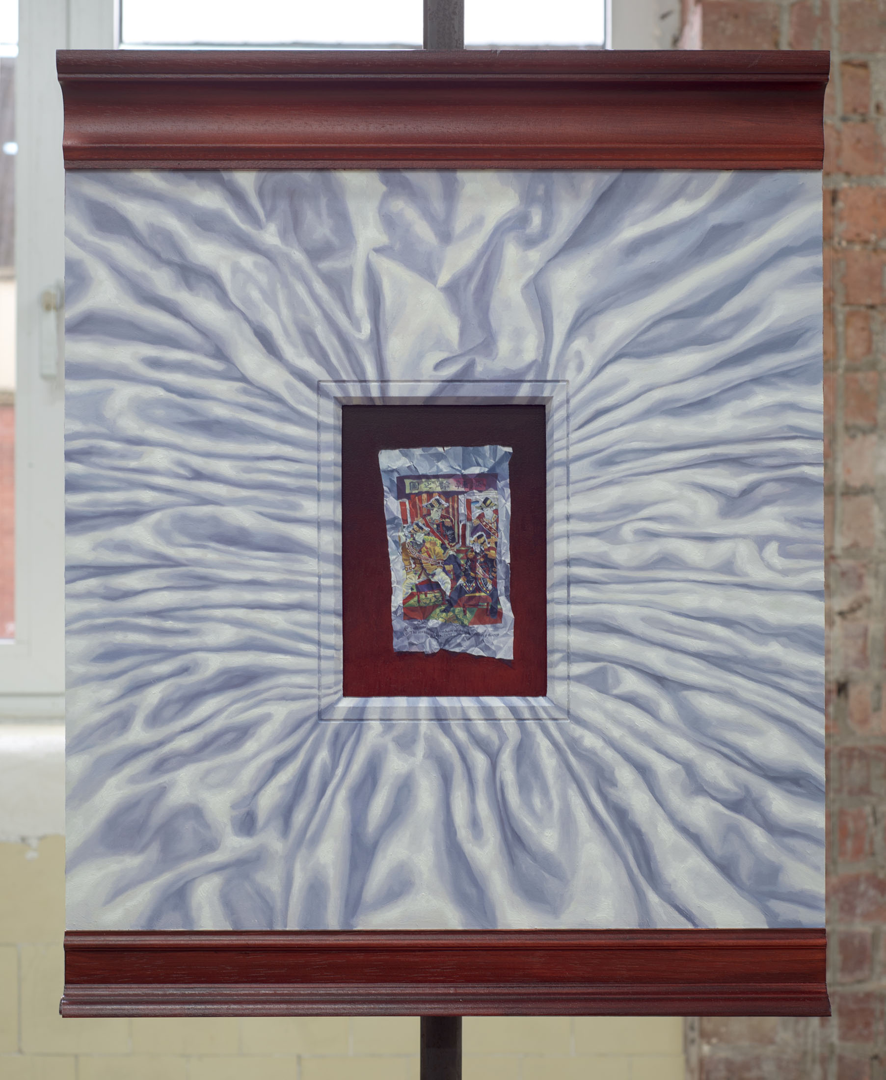 Alluring cherry wood and white silk sheets triple-frame a blood-stained fragment from an art history book