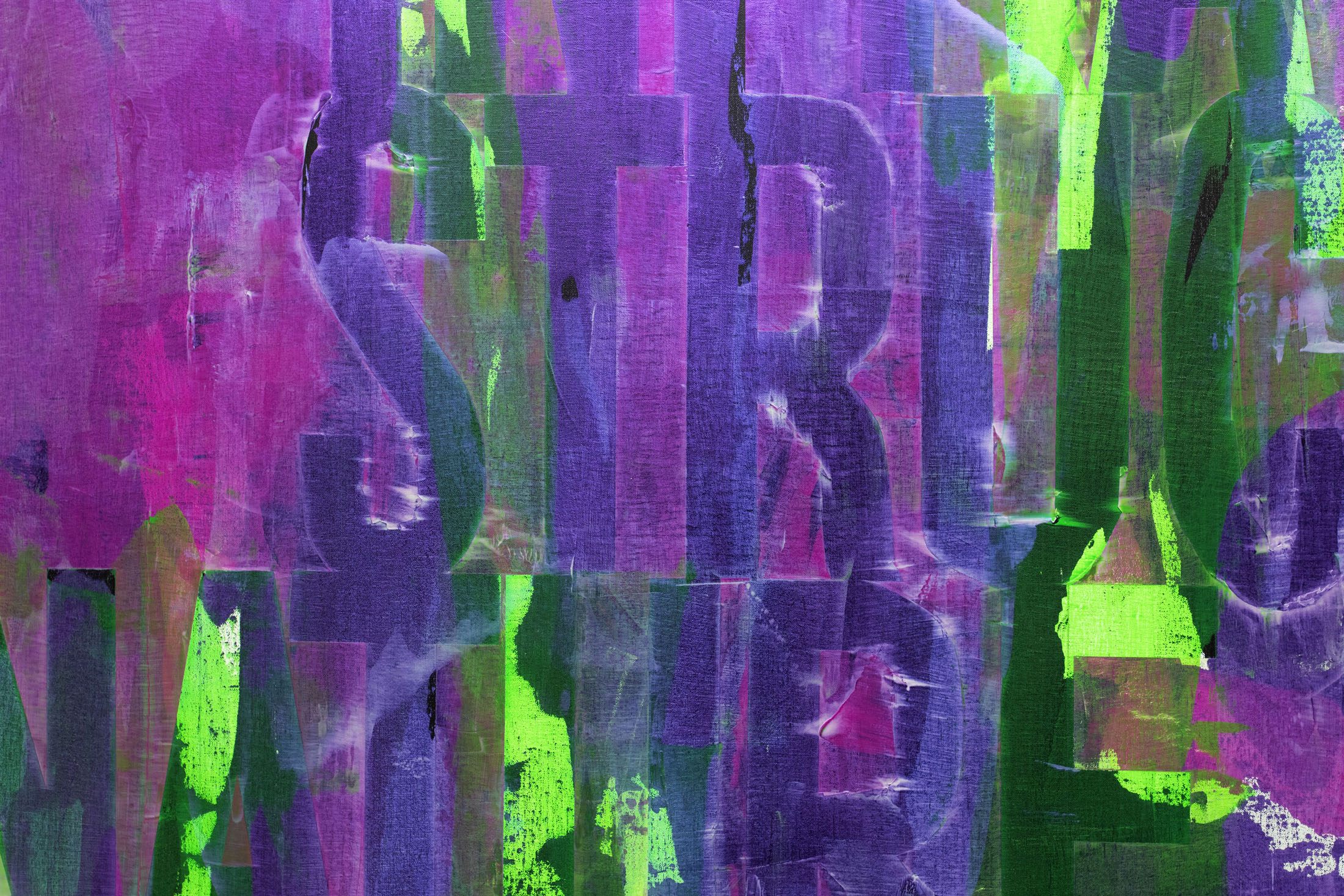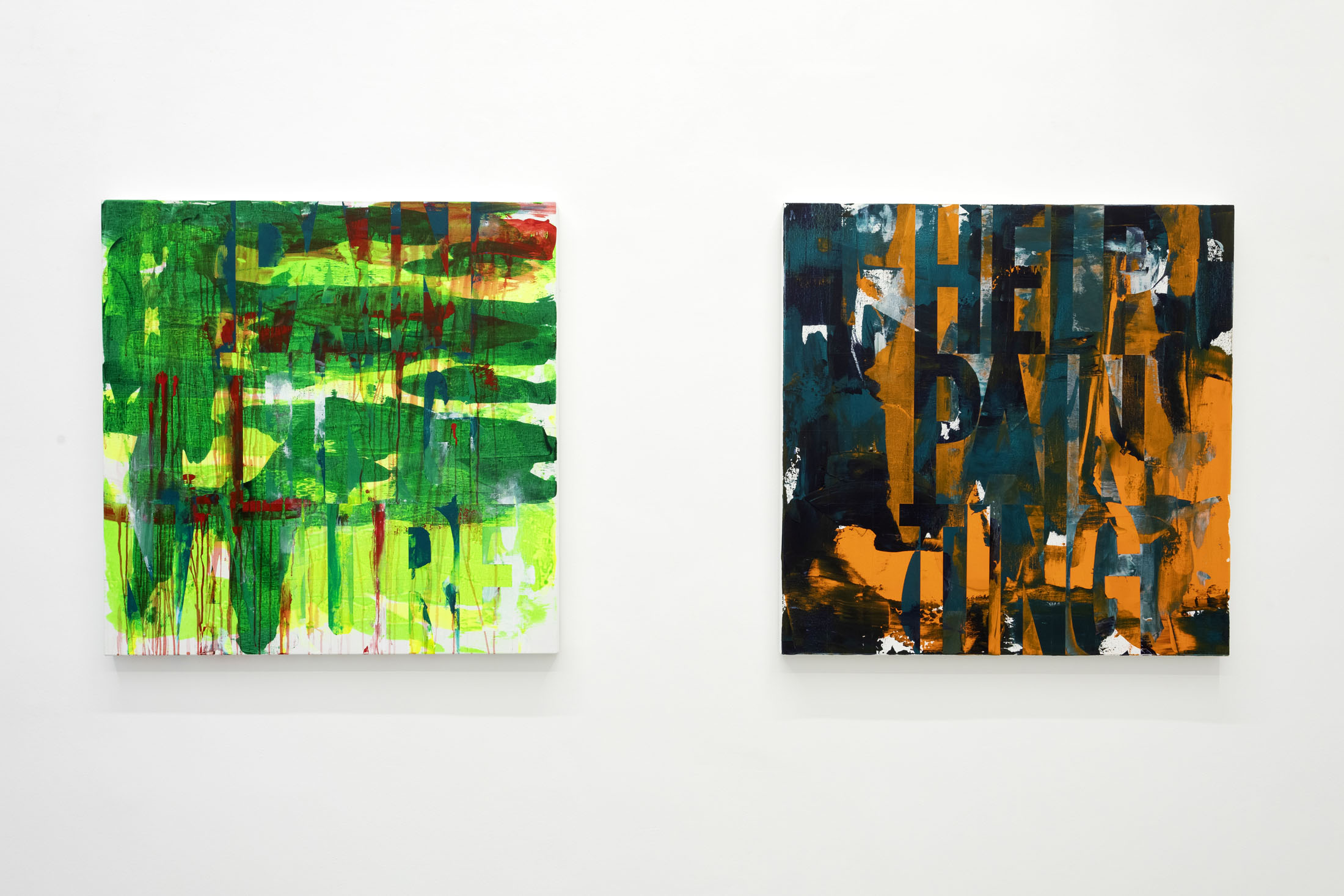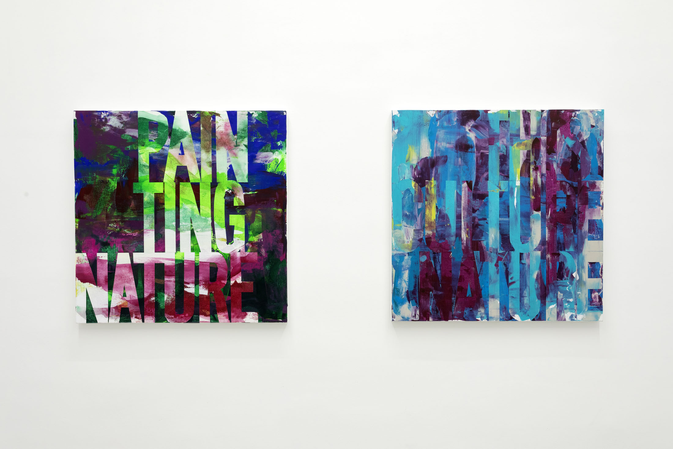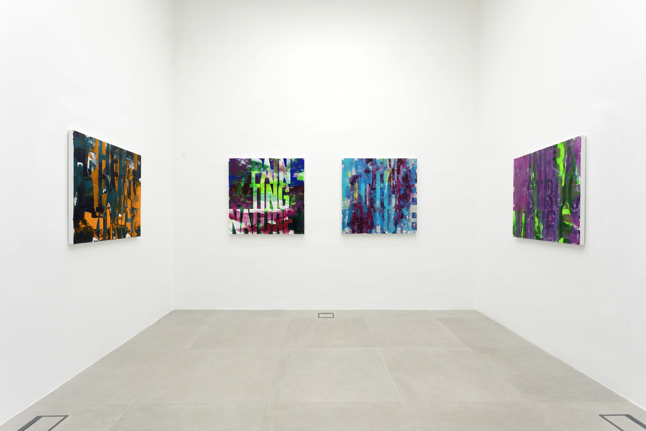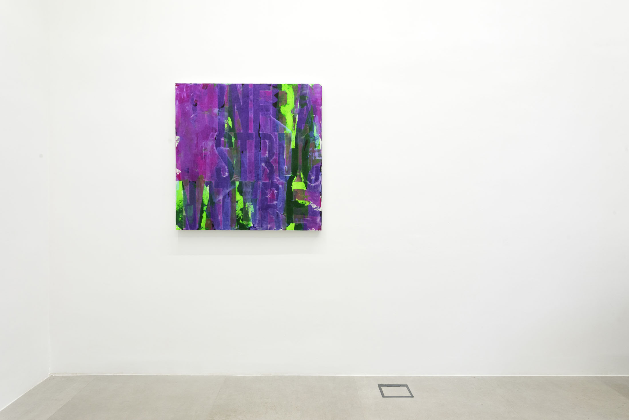 After a prolific period of video and film production, the artist turned to painting, extending his exploration of artistic and media language. Here, the canvas functions as a cinematic frame and becomes an image that “emits” specific meaning through bold colors and the suggestion of forms and words transformed into visual signs. As critic Dimitris Lempesis observed in Presentation: Heimo Zobernig, painting, along with sculpture, film, performance and design, is a central component of Zobernig’s intermedia art. Since the beginning of his artistic practice in the early 1980s, the artist has built up a comprehensive painterly oeuvre, always based on his attempts to explore color like a “scientist”. Thus, in Zobernig’s work, painting has become a machine for the creation of insight. Characteristics of the artist’s method in this context are strategies of simplification, standardization and systematization using predefined rules and the artistic appropriation of industrial norms and widespread samples. The works created in 2021 continue this trajectory and, deliberately left untitled, resist the imposition of labels, instead directing attention to the content of the paintings themselves. Conceived as a code, they connect color with encrypted messages built on wordplay. Sequences such as HELP PAIN TING, PAIN/TING NATURE, and INFRA STRUC NATURE exemplify Zobernig’s conceptual method: rather than depicting motifs literally, he uses painting as an analytical tool of enquiry. By breaking down words, Zobernig emphasizes their multiple meanings and links language with visual elements, blurring the contours of the words with strong colors, from which the words surface to suggest associations – such as the interplay between help and pain – thus turning the word itself into an object of experimentation. Arranging the semantic elements into larger units (help painting), the artist questions the very function of painting today; the fragmented words indicate his systematic exploration of color and form, exposing the ties between art, industrial standards and everday visual patterns to reveal how the structure of the visual world shapes perception. These works demonstrate Zobernig’s ability to transform painting into a medium of critical reflection and inquiry, where both language and visual media turn into experimental systems.