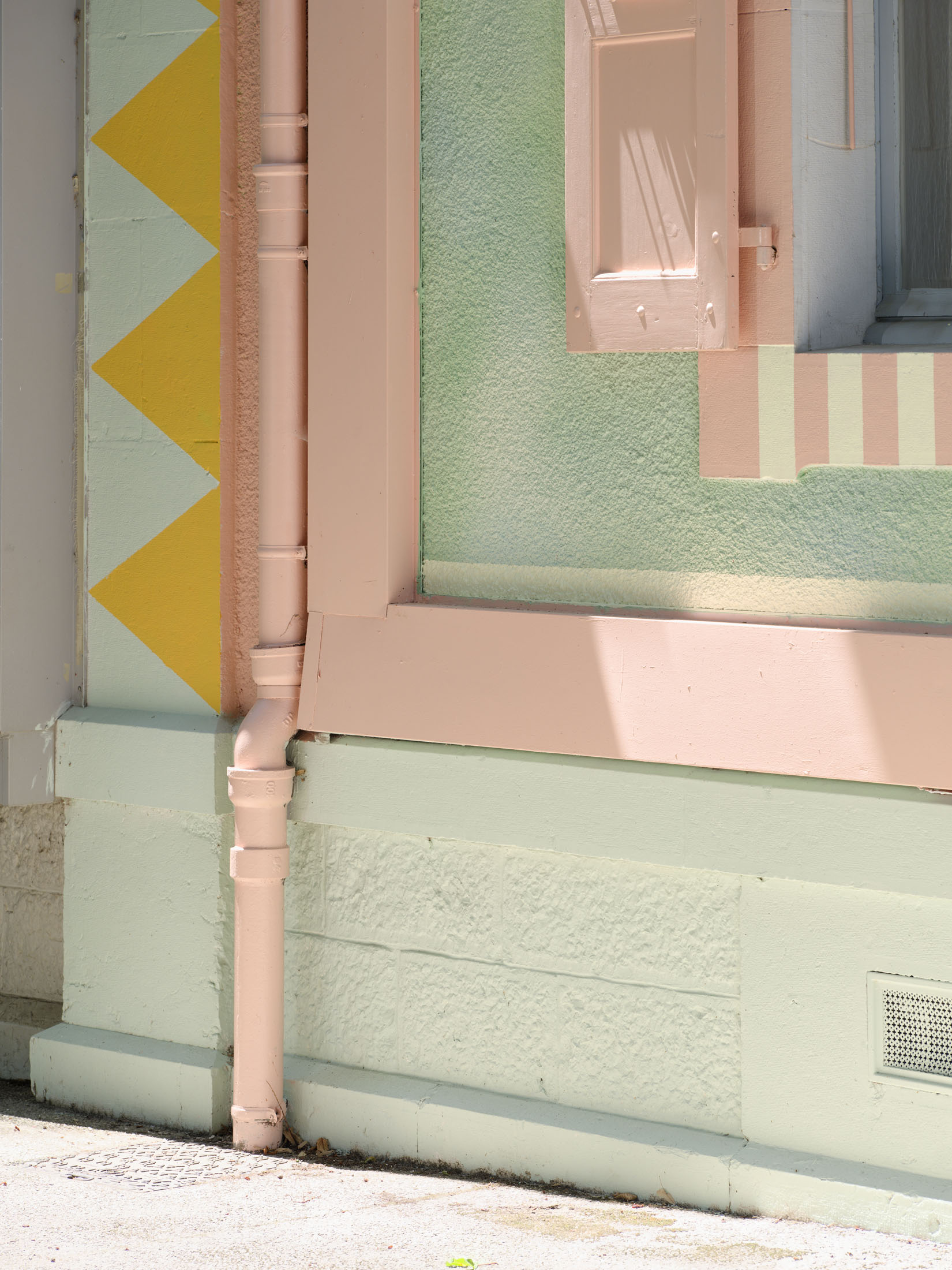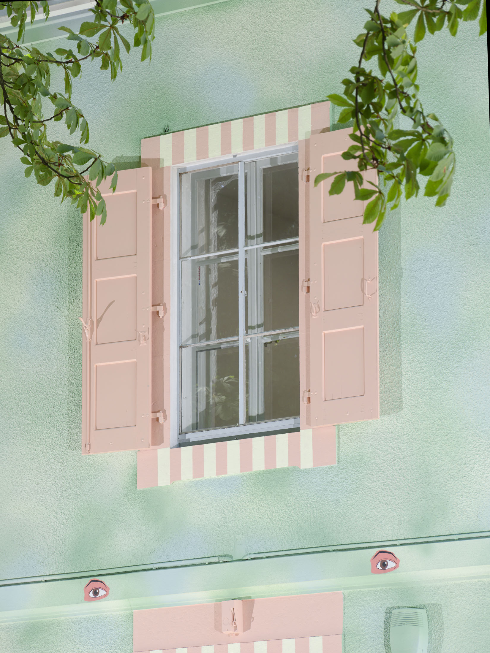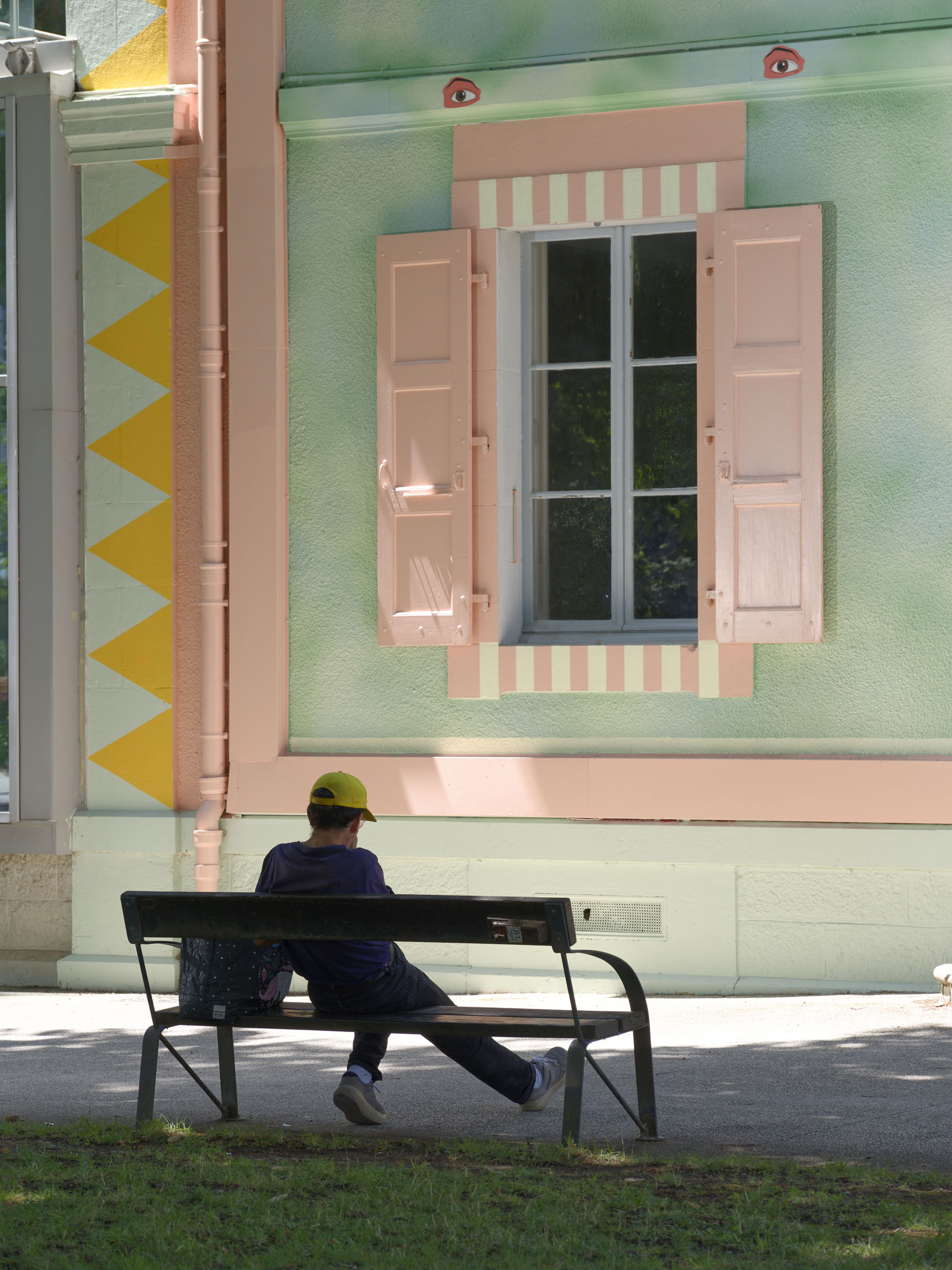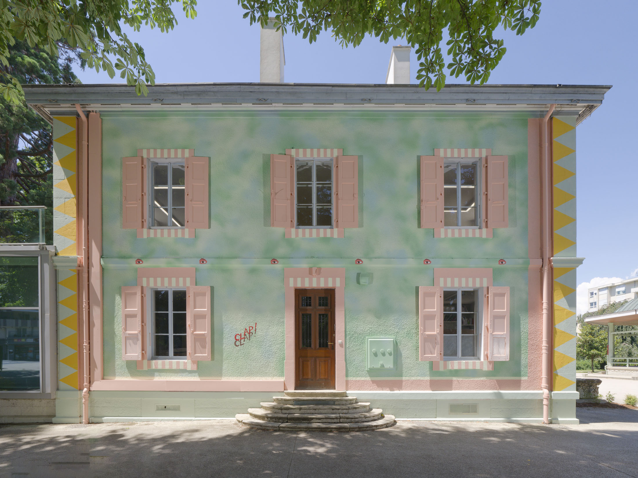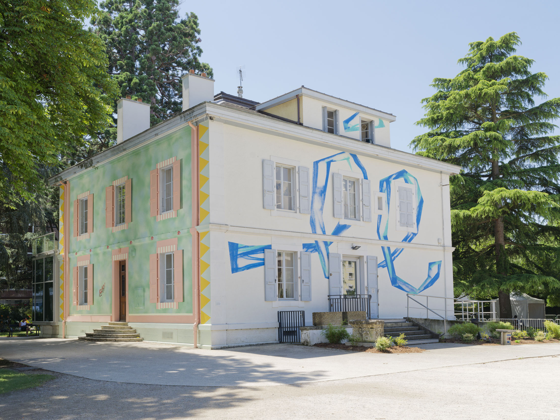 The facades of the Villa du Parc are striking markers of the artistic identity of the art center in Parc Montessuit and the city of Annemasse. They are custom-designed works of art created to match the scale of the building’s architecture and installed for several years. Friselis, the new east facade created by Hippolyte Hentgen, replaces Christophe Cuzin’s iconic red work Léger décalage (2006) and plays off Aimée, thenorth facade created in 2021 by Swiss painter Renée Levi.