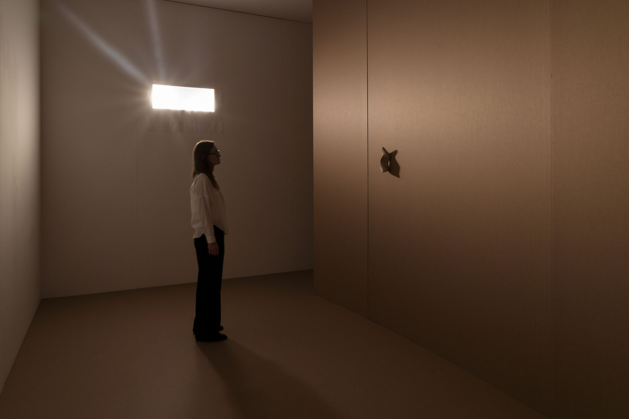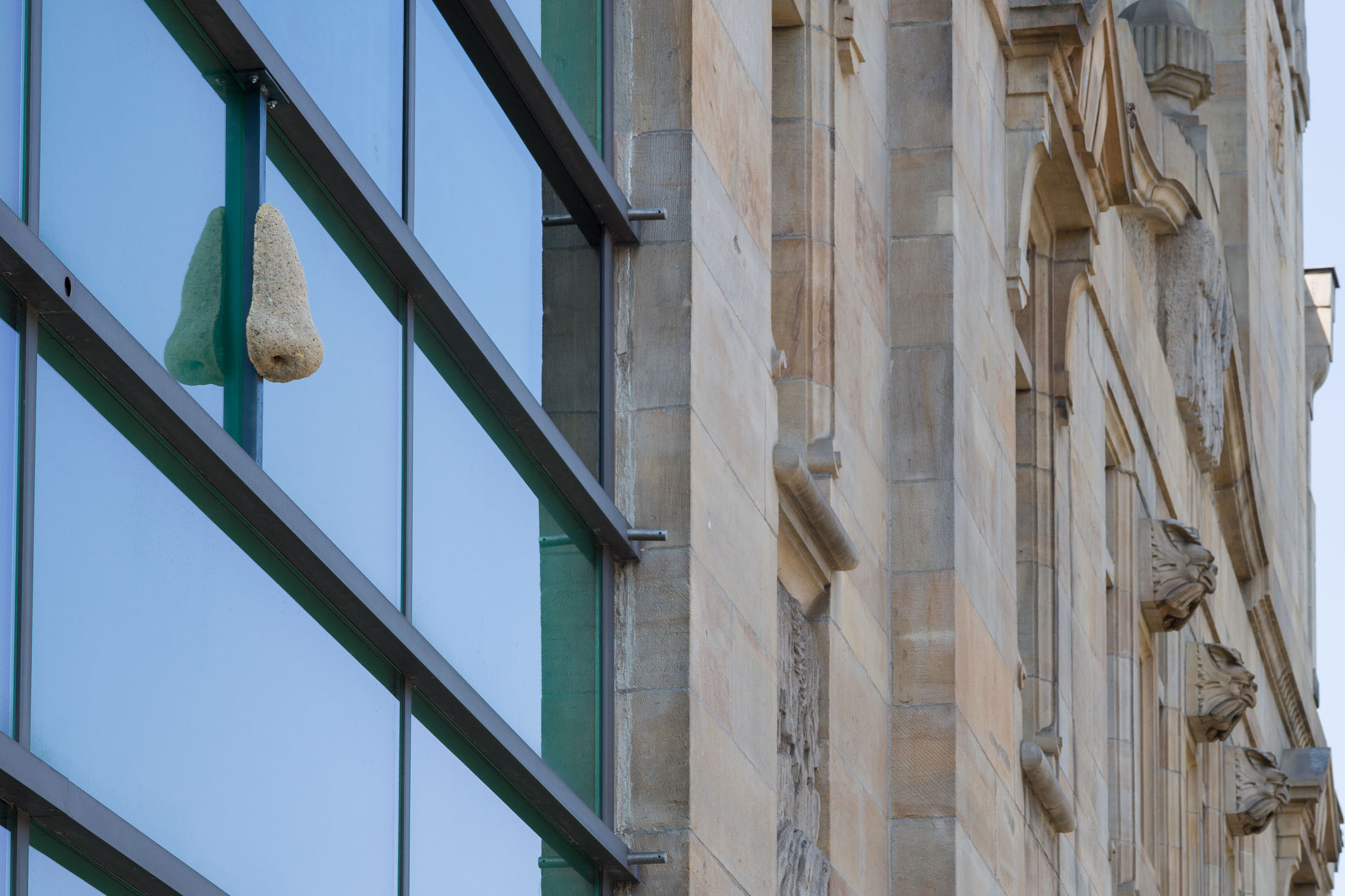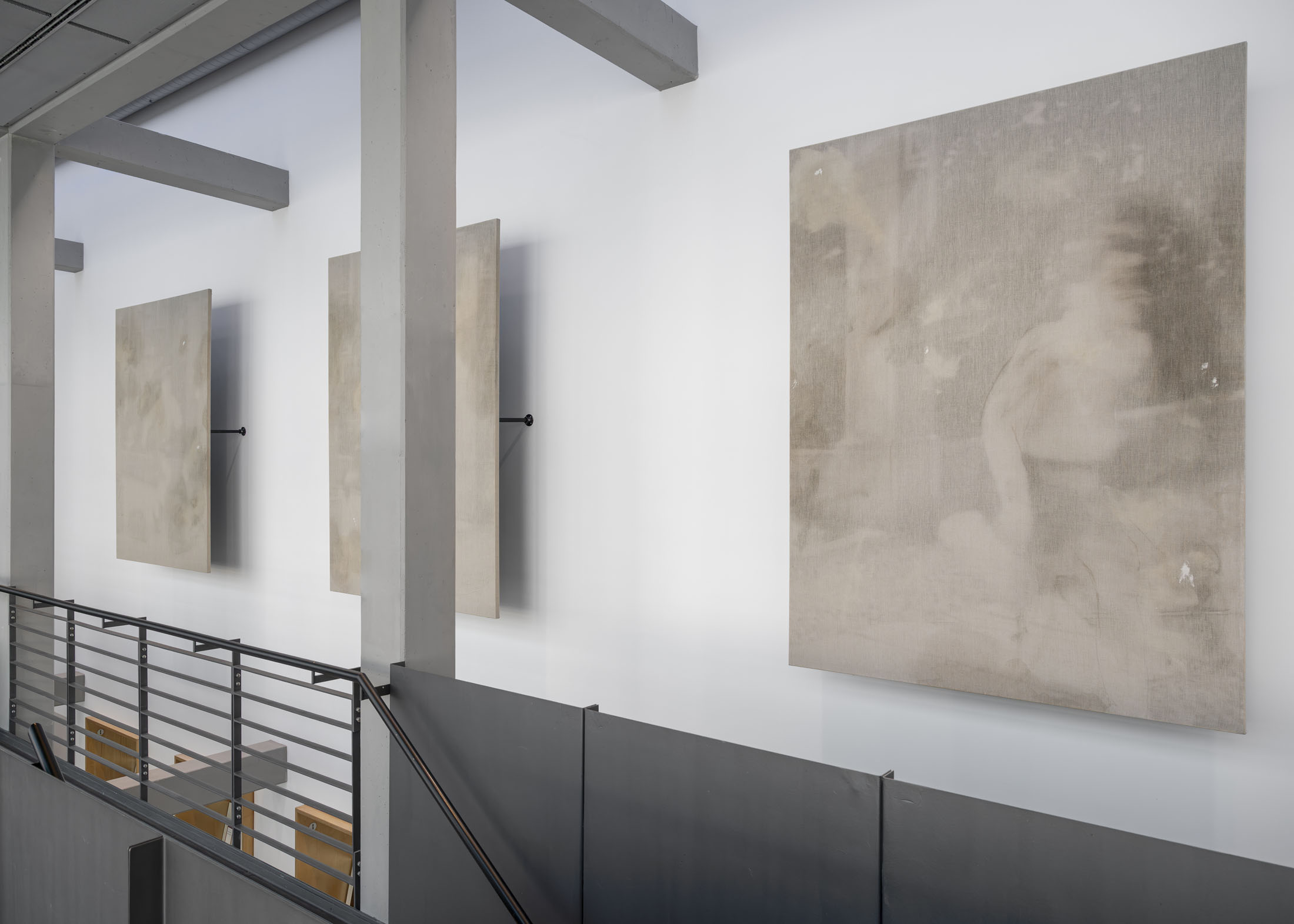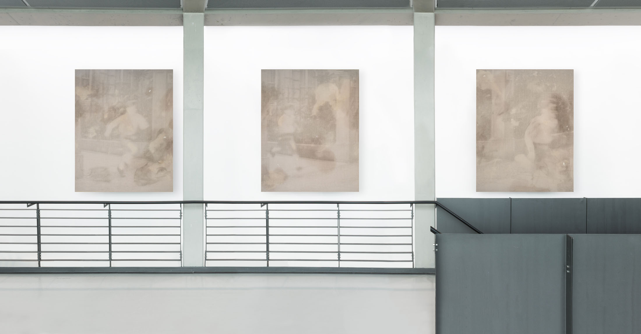 On the façade, Self-portraits as my father’s nose (2025) – proportionally enlarged nose sculptures made of seeds, in collaboration with his father, wait to be eaten by pigeons and other birds – their outlines might remain visible as traces. In the Café Tender Buttons, a triptych of raw linen works shows a running boy who seems to be moving forward out of the pictorial space as if in a filmic rewind– a quiet gesture of remembrance, a cinematic leap back into the past. Waelder’s use of materials and his works resist clear legibility and temporality. They conceive of memory not as reconstruction, but as a tentative movement along gaps, shifts, and sedimented surfaces where absence is most powerfully present.