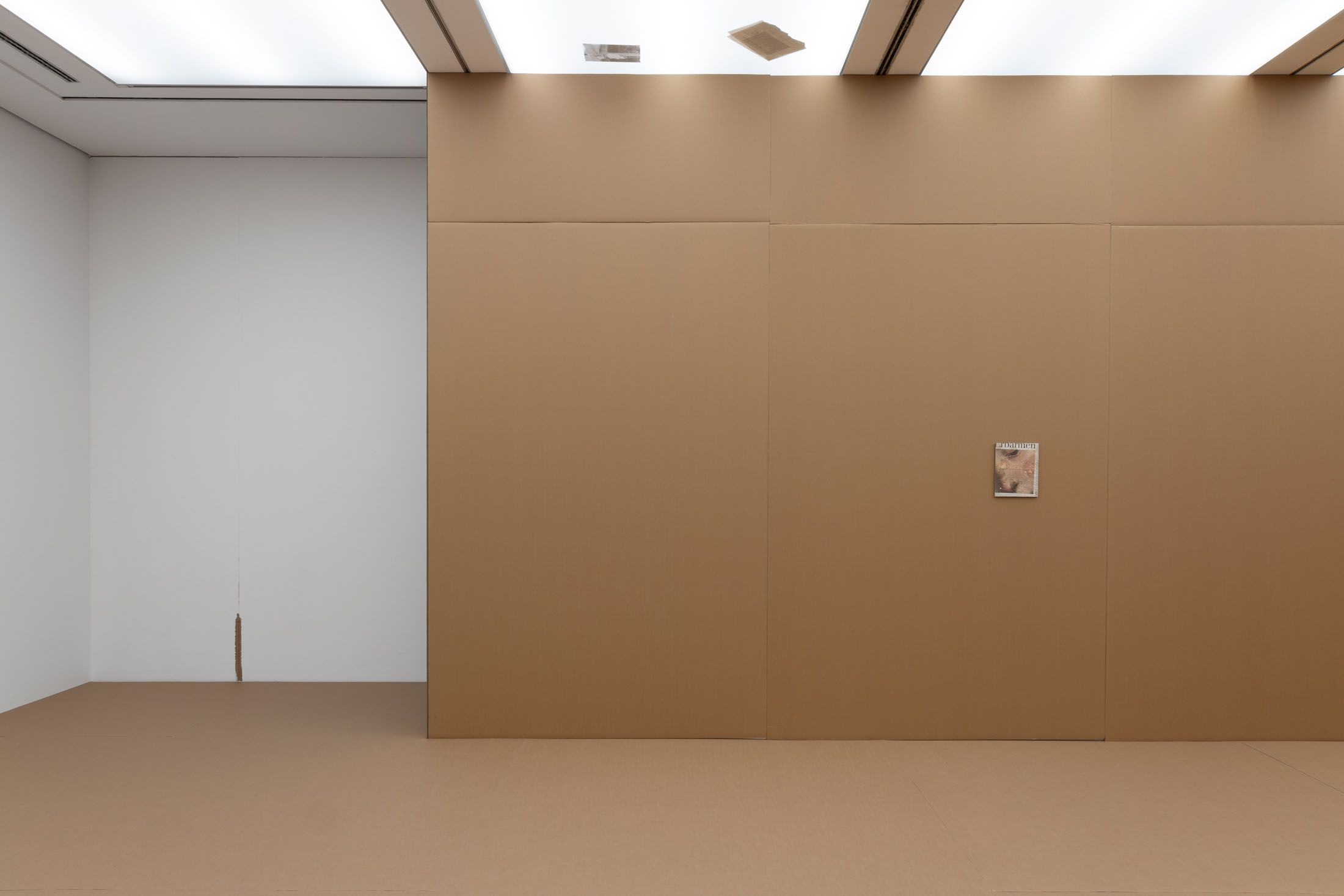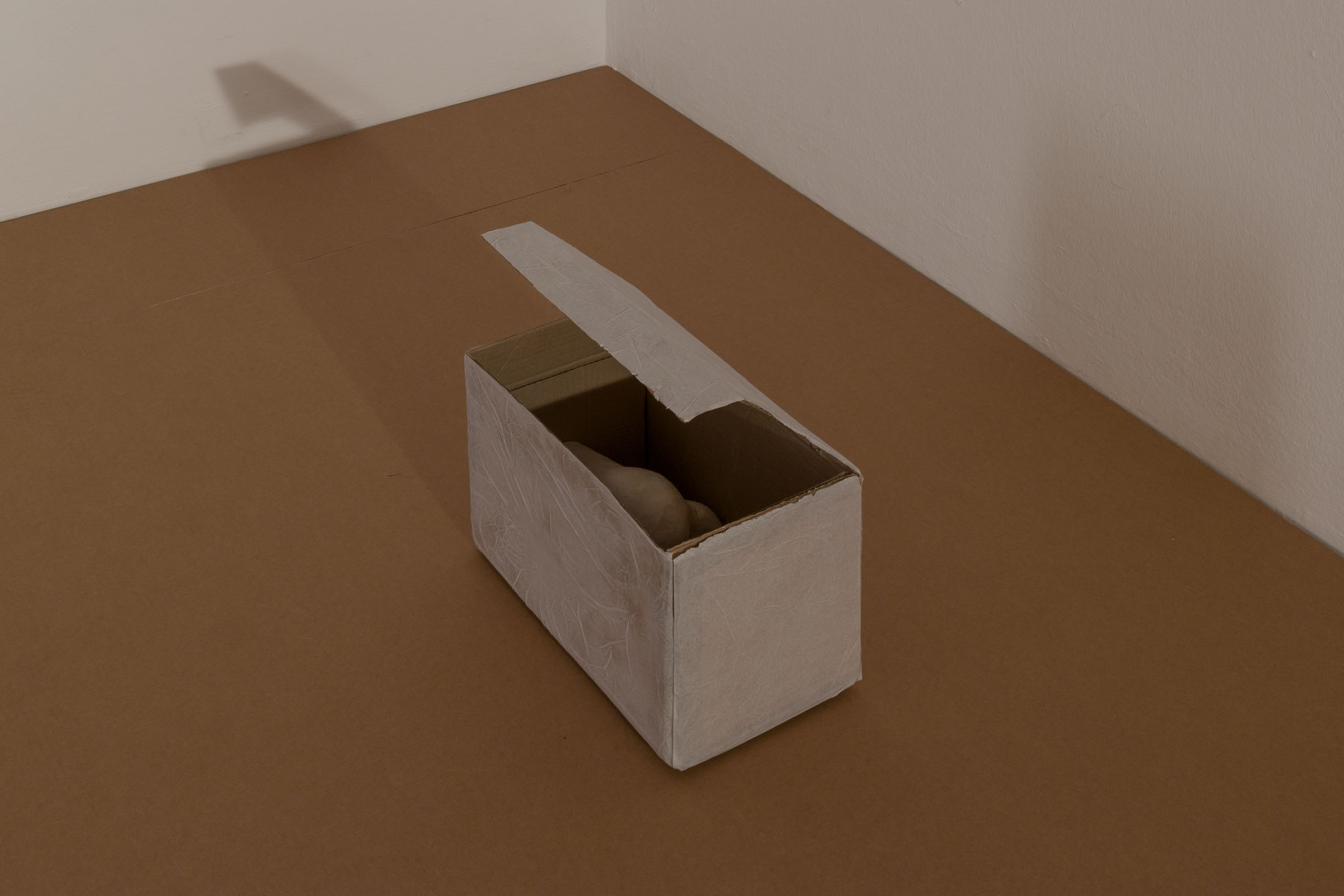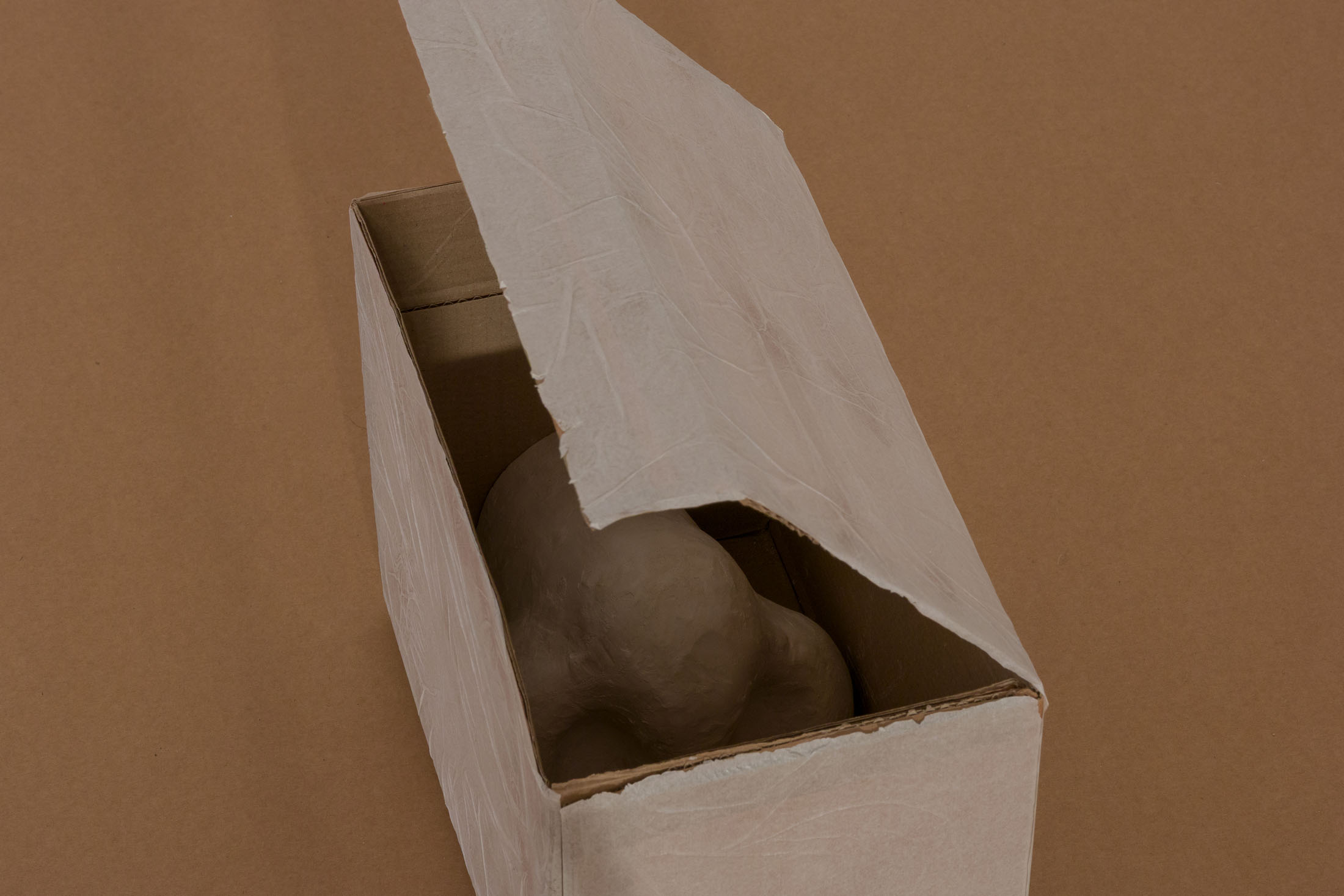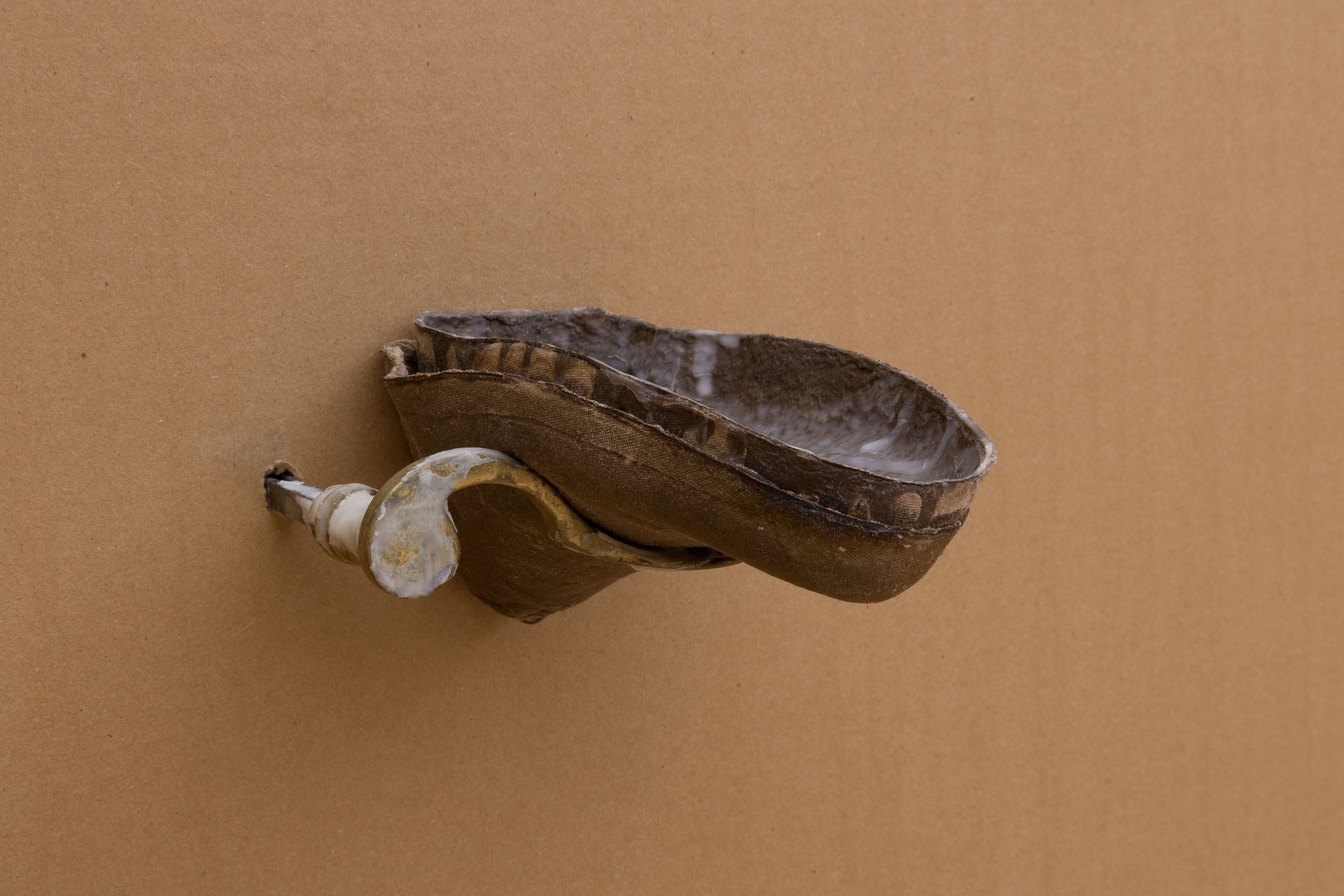 At the center of Waelder’s solo exhibition stands a labyrinthine structure made of cardboard, evoking the image of a packed moving box. The offset entrance of the arcaded hall diverts the gaze away from clear paths. Inside, sculptures, newspaper collages, a piano melody, and the materiality of cardboard and light condense into a dense assemblage—including a newspaper article covered with oats and traces of butter with the headline “Erbarmen” (“Mercy”), a deformed shoe last with a porcelain-like nose titled Sprain (38) (2023), and molded components from the Bystander (2025) series with dangling shoelaces. These are traces of domestic routines that elude concrete memory and yet evoke a strangely familiar atmosphere.