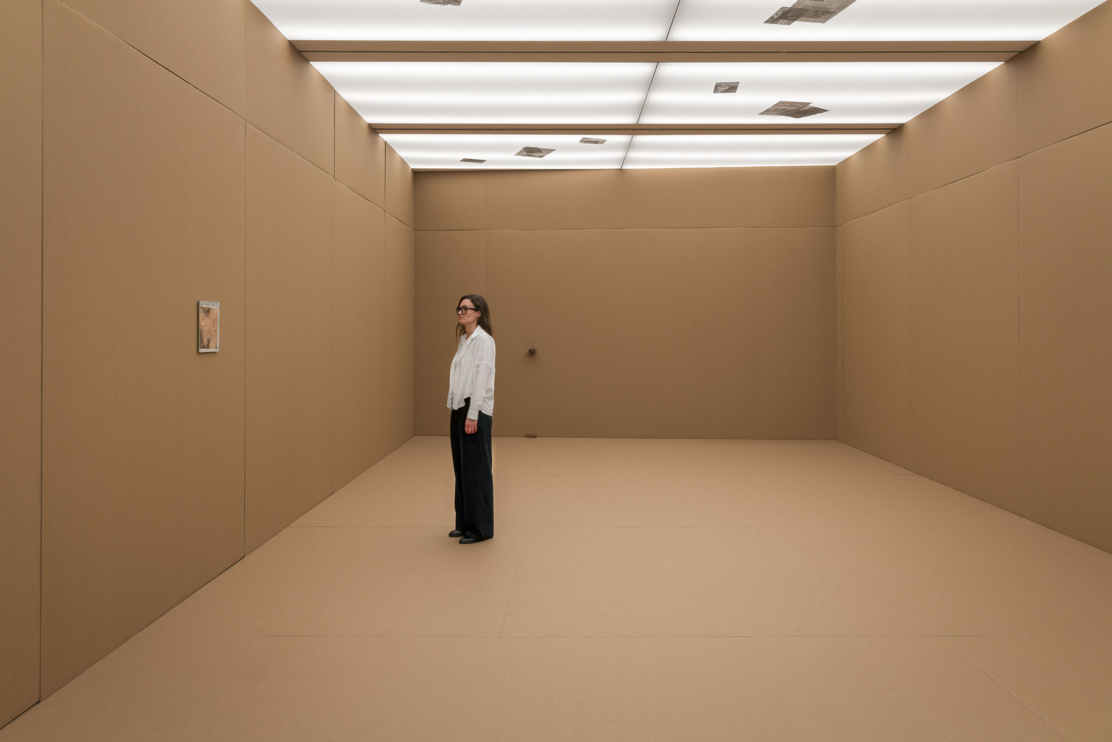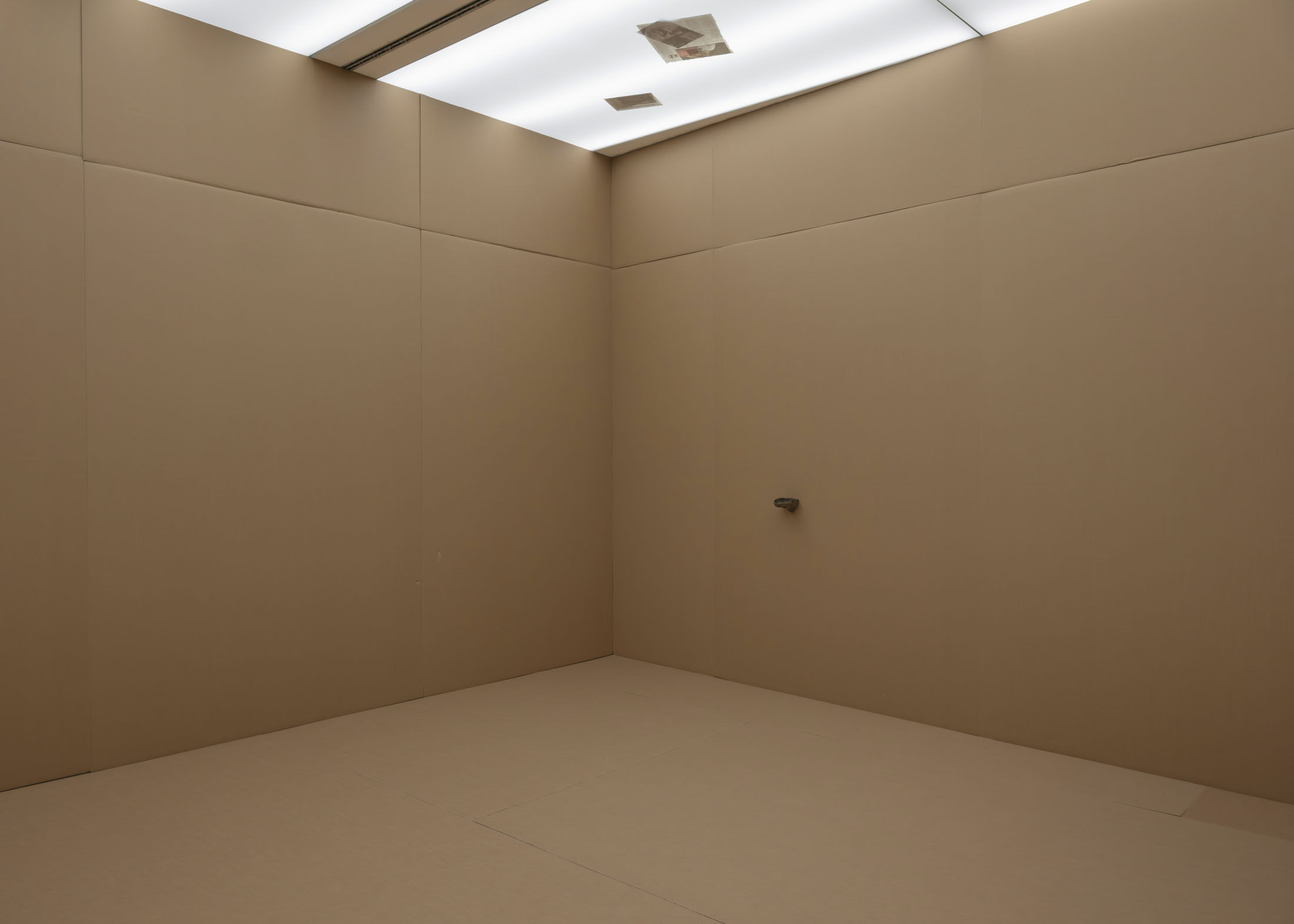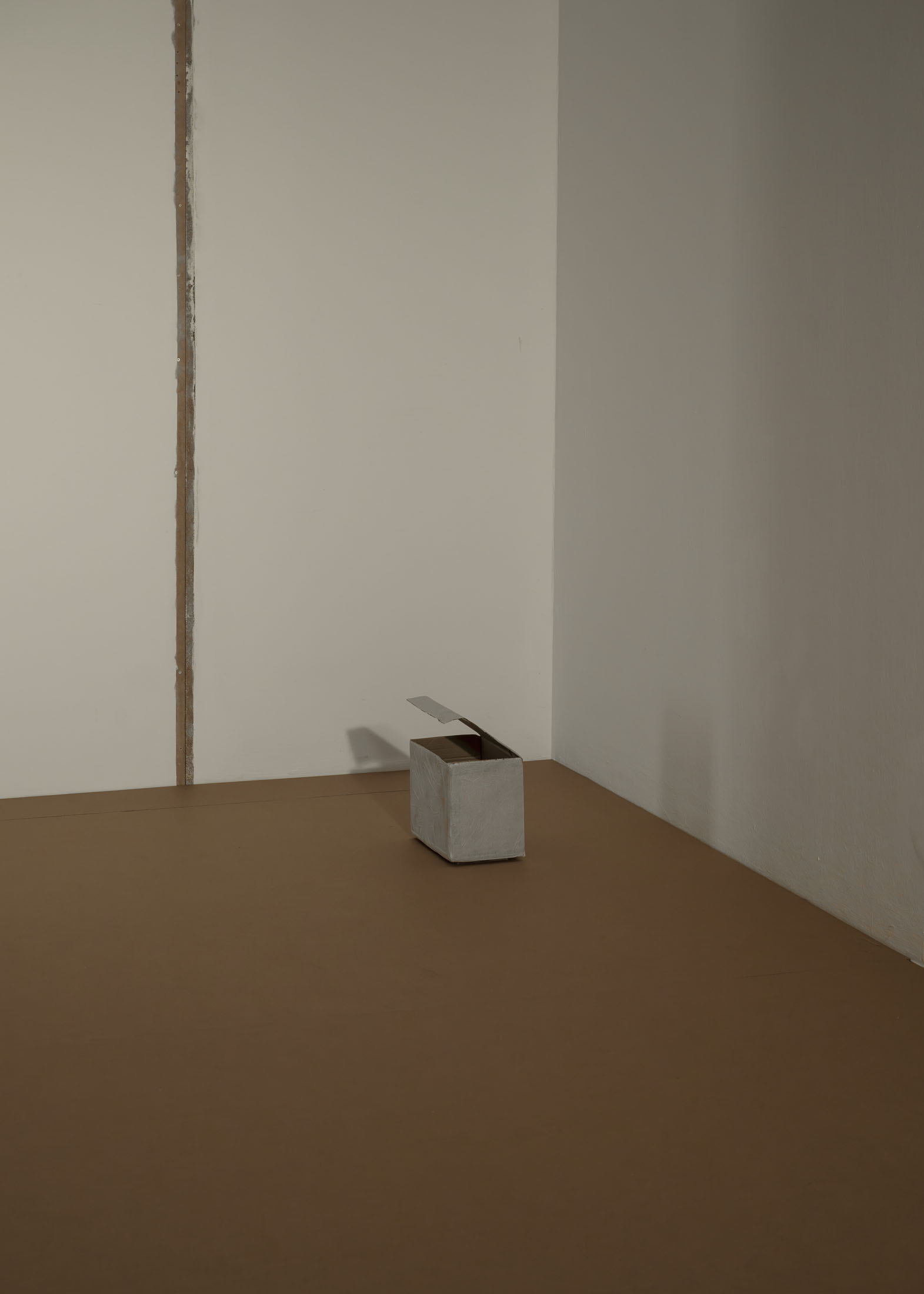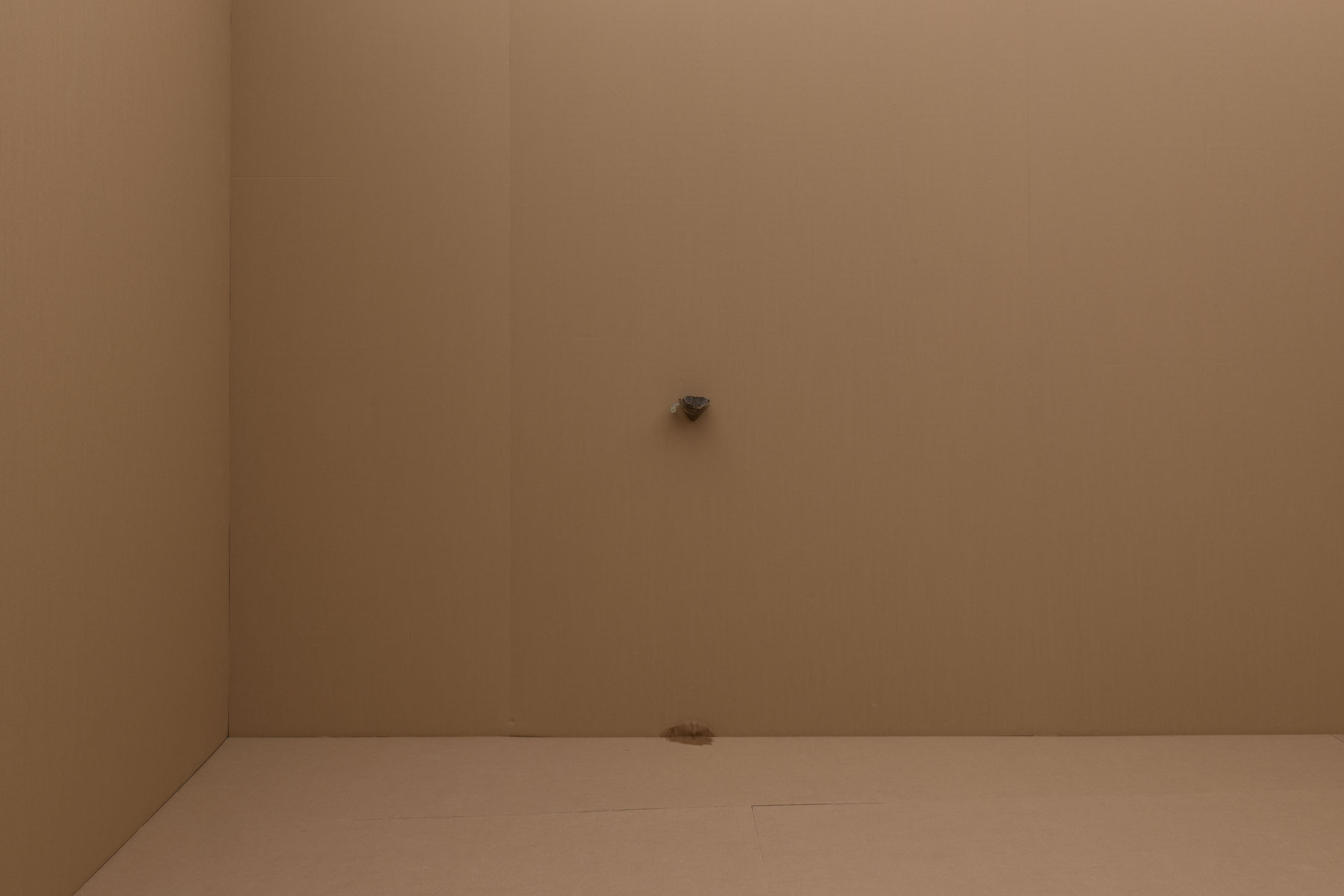 At the center of Waelder’s solo exhibition stands a labyrinthine structure made of cardboard, evoking the image of a packed moving box. The offset entrance of the arcaded hall diverts the gaze away from clear paths. Inside, sculptures, newspaper collages, a piano melody, and the materiality of cardboard and light condense into a dense assemblage—including a newspaper article covered with oats and traces of butter with the headline “Erbarmen” (“Mercy”), a deformed shoe last with a porcelain-like nose titled Sprain (38) (2023), and molded components from the Bystander (2025) series with dangling shoelaces. These are traces of domestic routines that elude concrete memory and yet evoke a strangely familiar atmosphere.