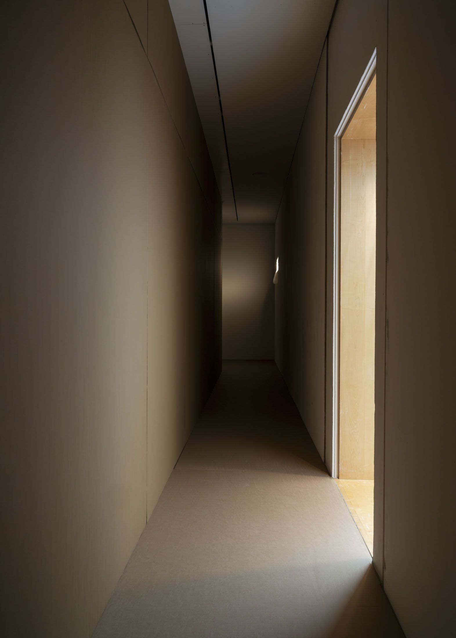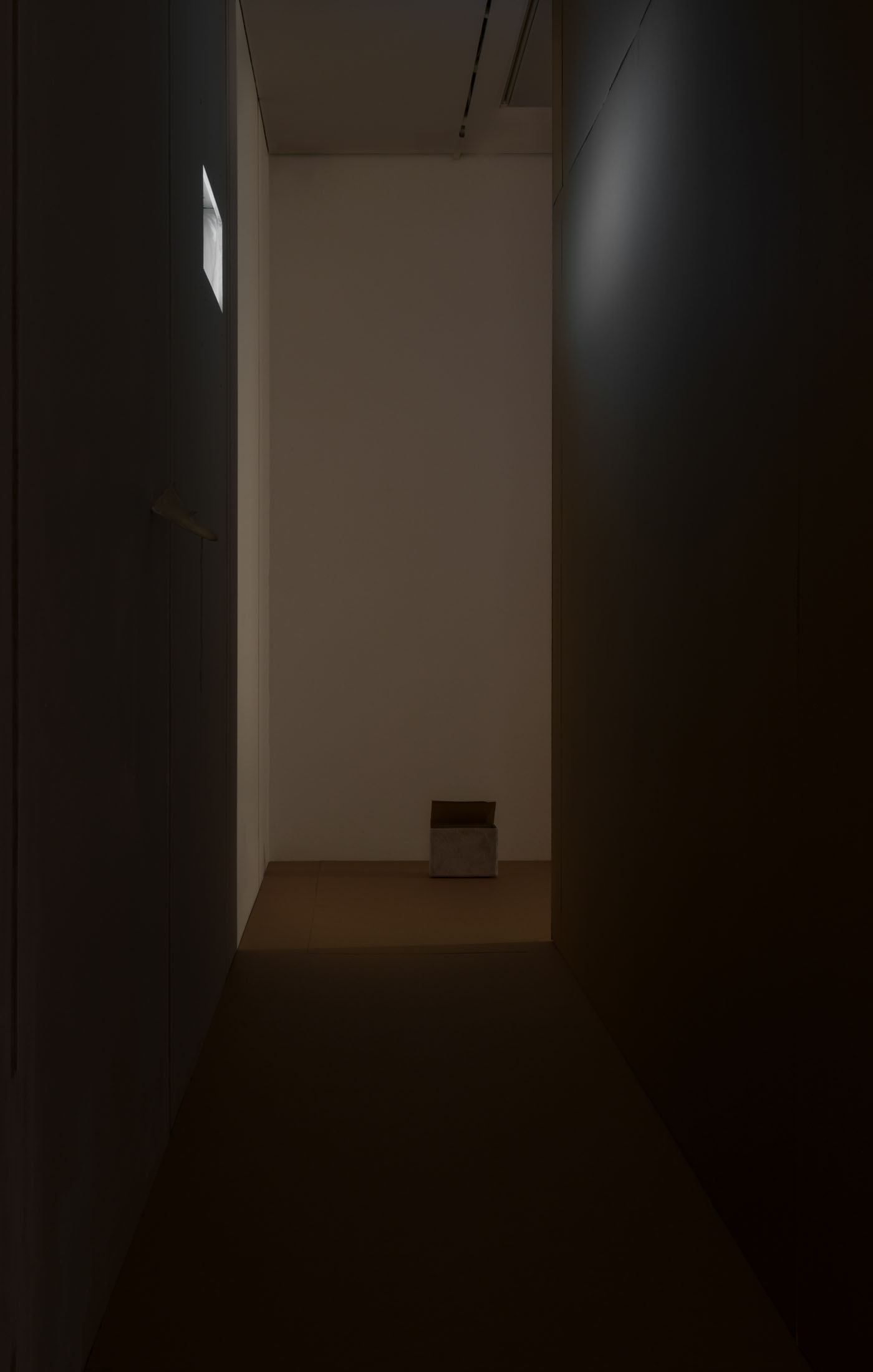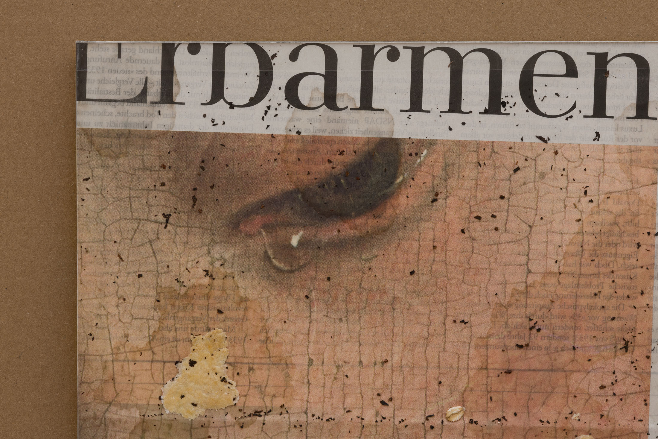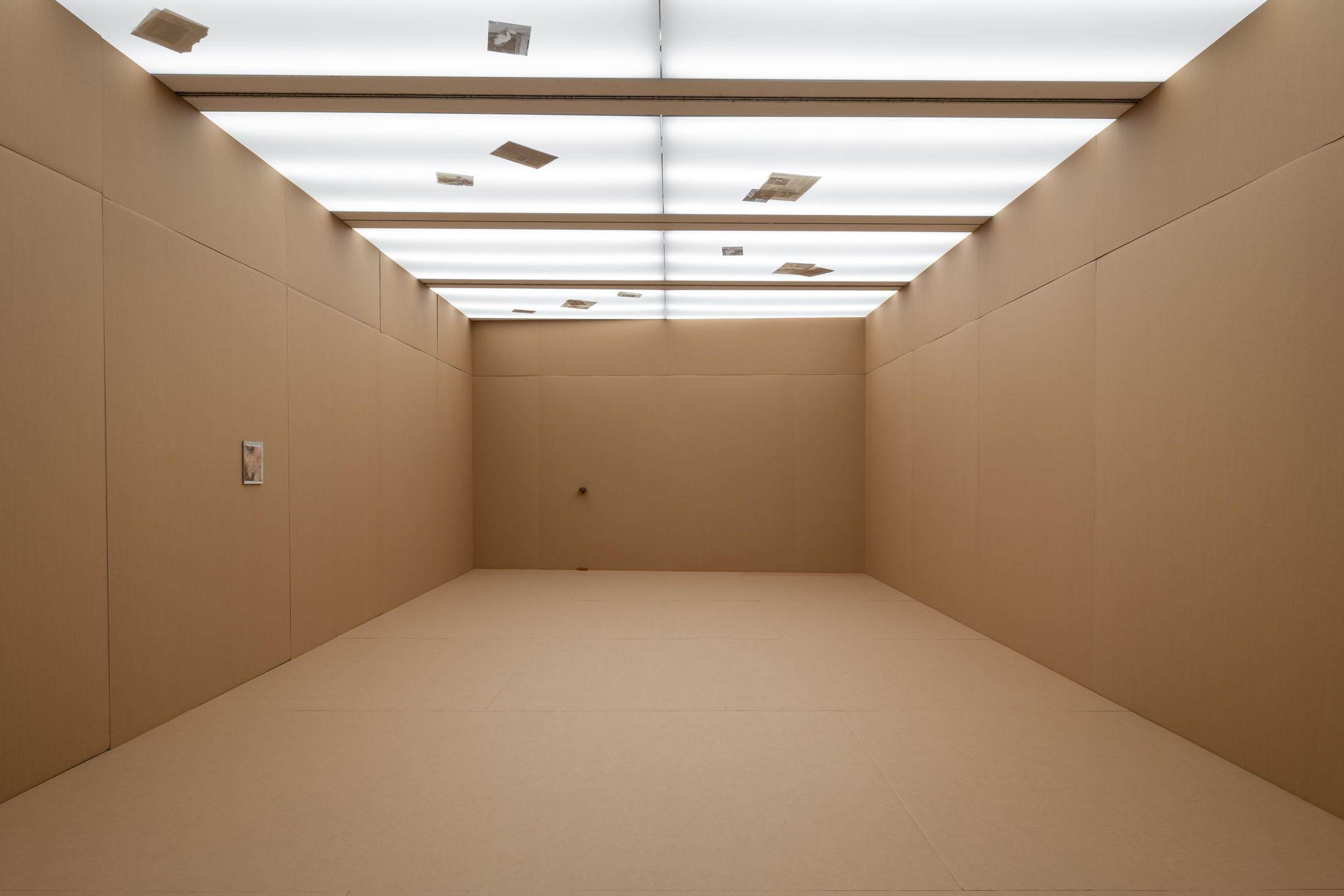 At the center of Waelder’s solo exhibition stands a labyrinthine structure made of cardboard, evoking the image of a packed moving box. The offset entrance of the arcaded hall diverts the gaze away from clear paths. Inside, sculptures, newspaper collages, a piano melody, and the materiality of cardboard and light condense into a dense assemblage—including a newspaper article covered with oats and traces of butter with the headline “Erbarmen” (“Mercy”), a deformed shoe last with a porcelain-like nose titled Sprain (38) (2023), and molded components from the Bystander (2025) series with dangling shoelaces. These are traces of domestic routines that elude concrete memory and yet evoke a strangely familiar atmosphere.