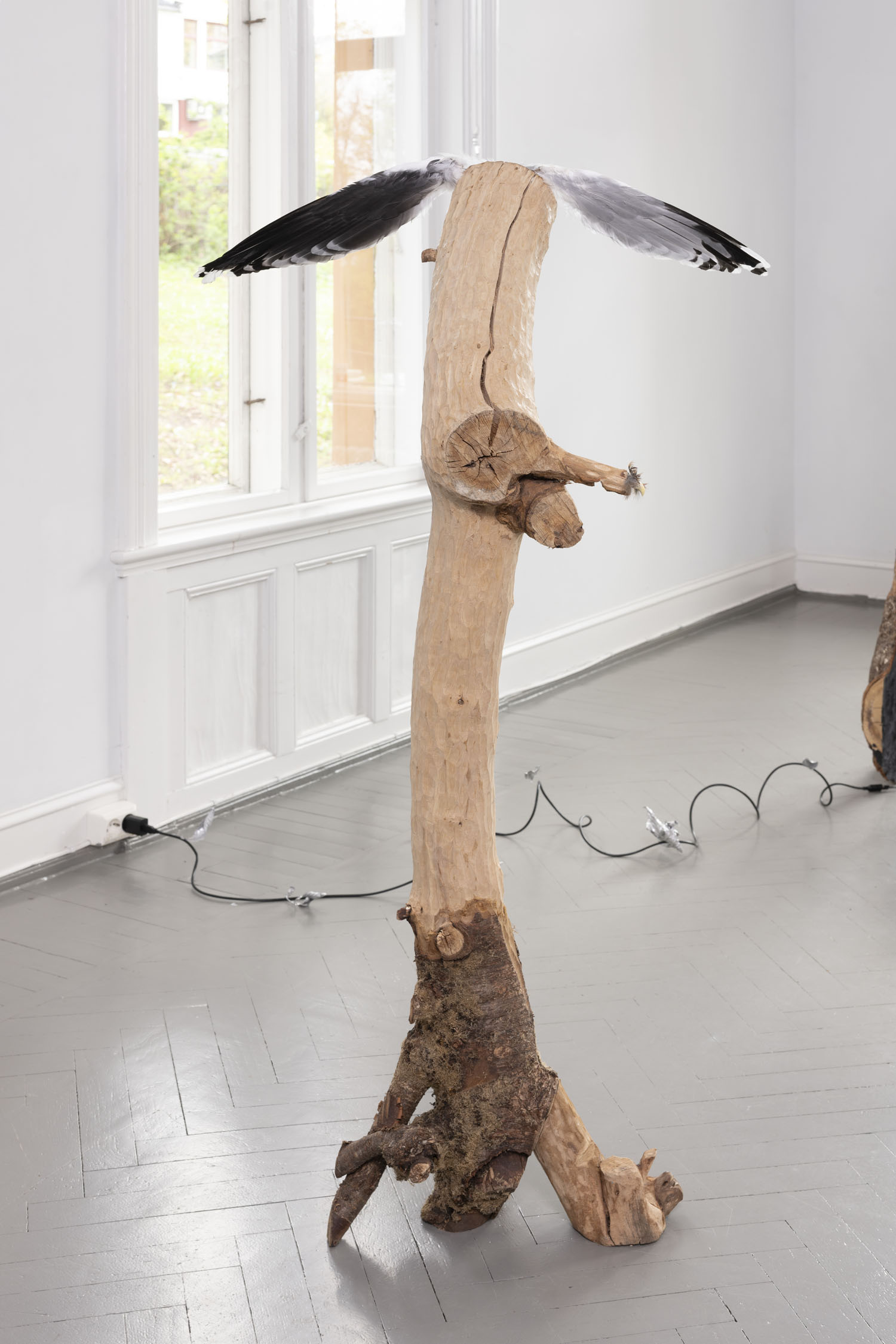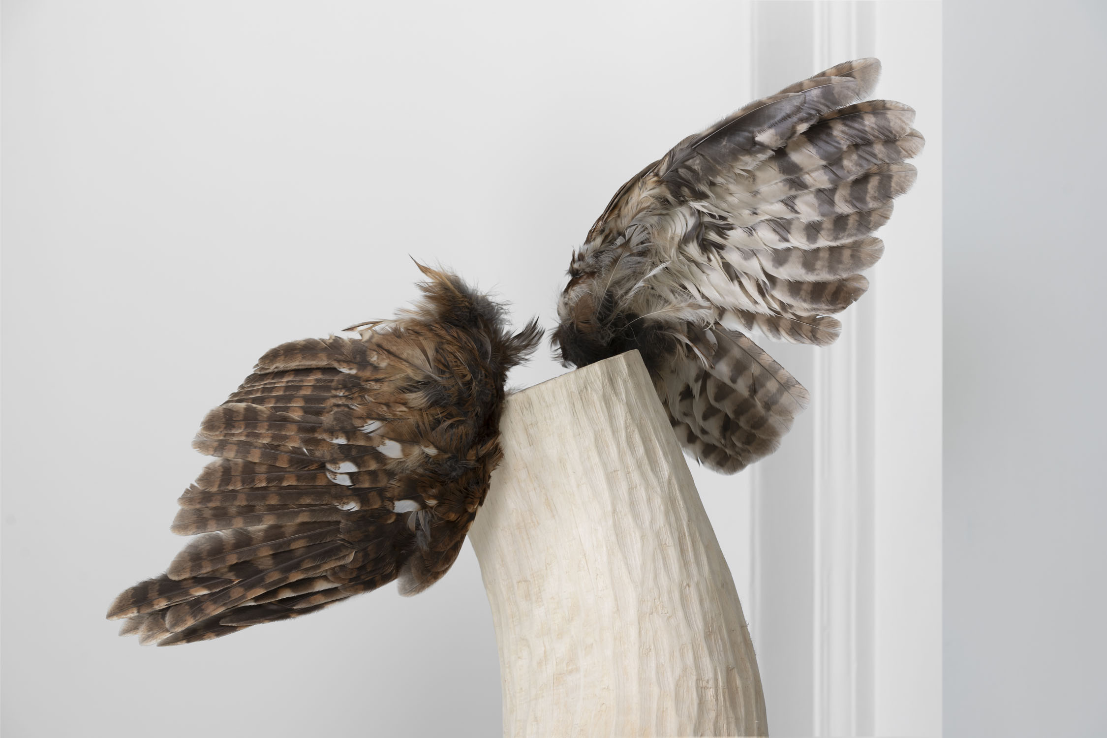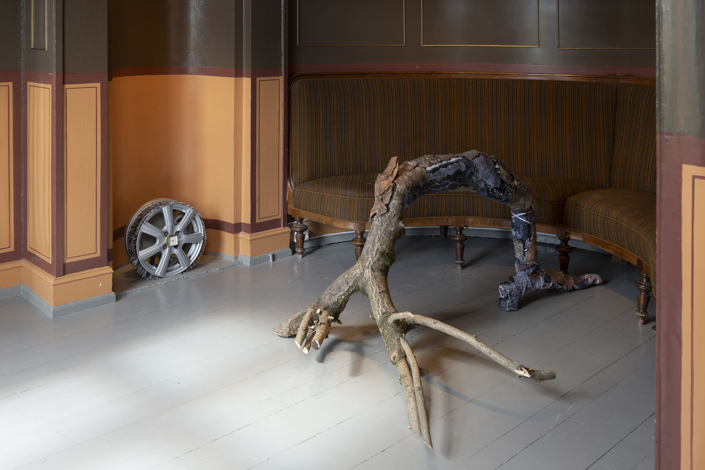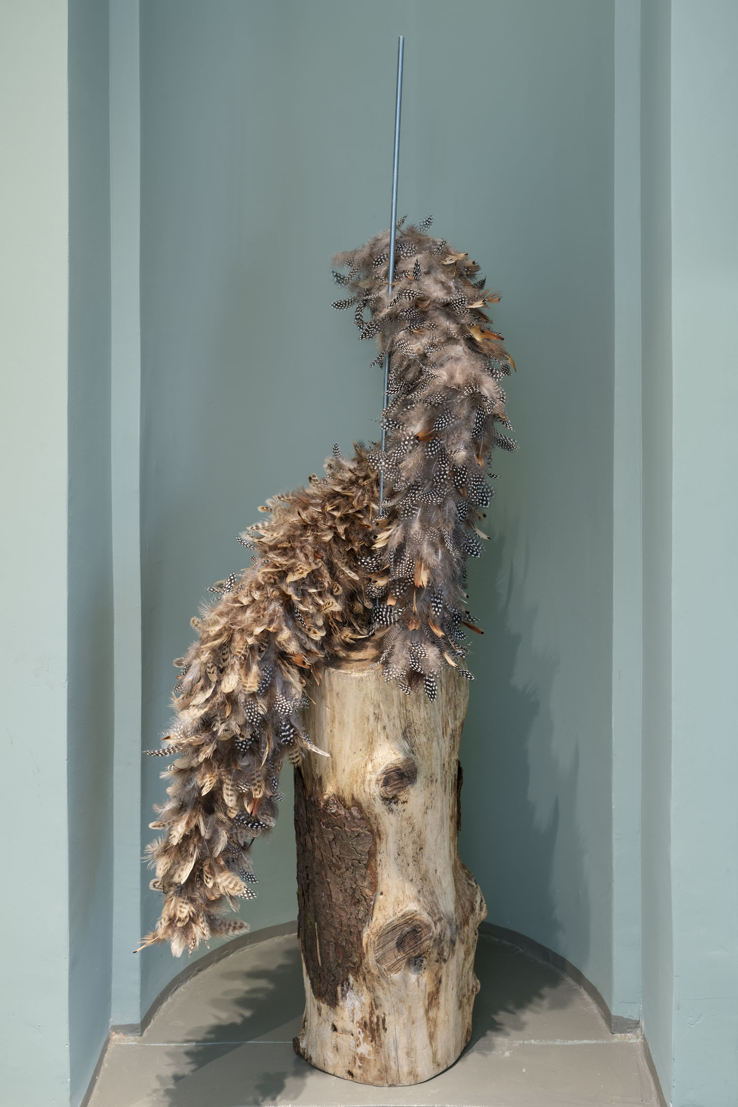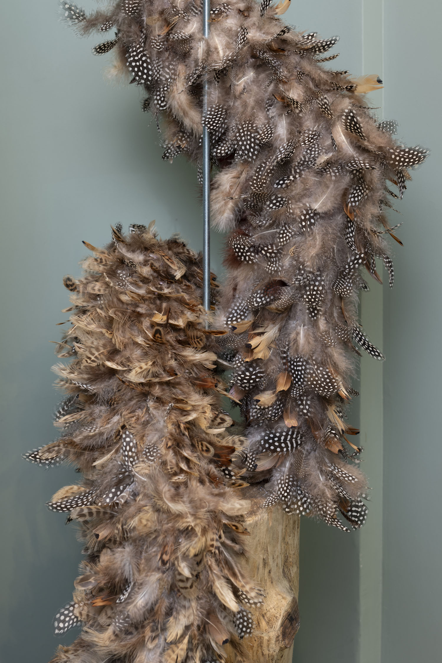 Rooted in what is discarded or concealed, Tysse gives new life to found materials, which she adorns, decorates and assembles. Bird wings, leaves, rims, and logs are cared for and combined into contemporary myths. The bird appears as an overarching mythical figure and metaphor for freedom—moving through a realm where human limits, structures, and hierarchies do not exist. To access that freedom, we have invented flying machines that mimic birds and lift us into the sky – but that also kill and threaten birds and their habitats every day. For Tysse, working with birds is also personal. As the daughter of an ornithologist, her works reflect fragmented memories from a childhood as the birdwatcher’s daughter.