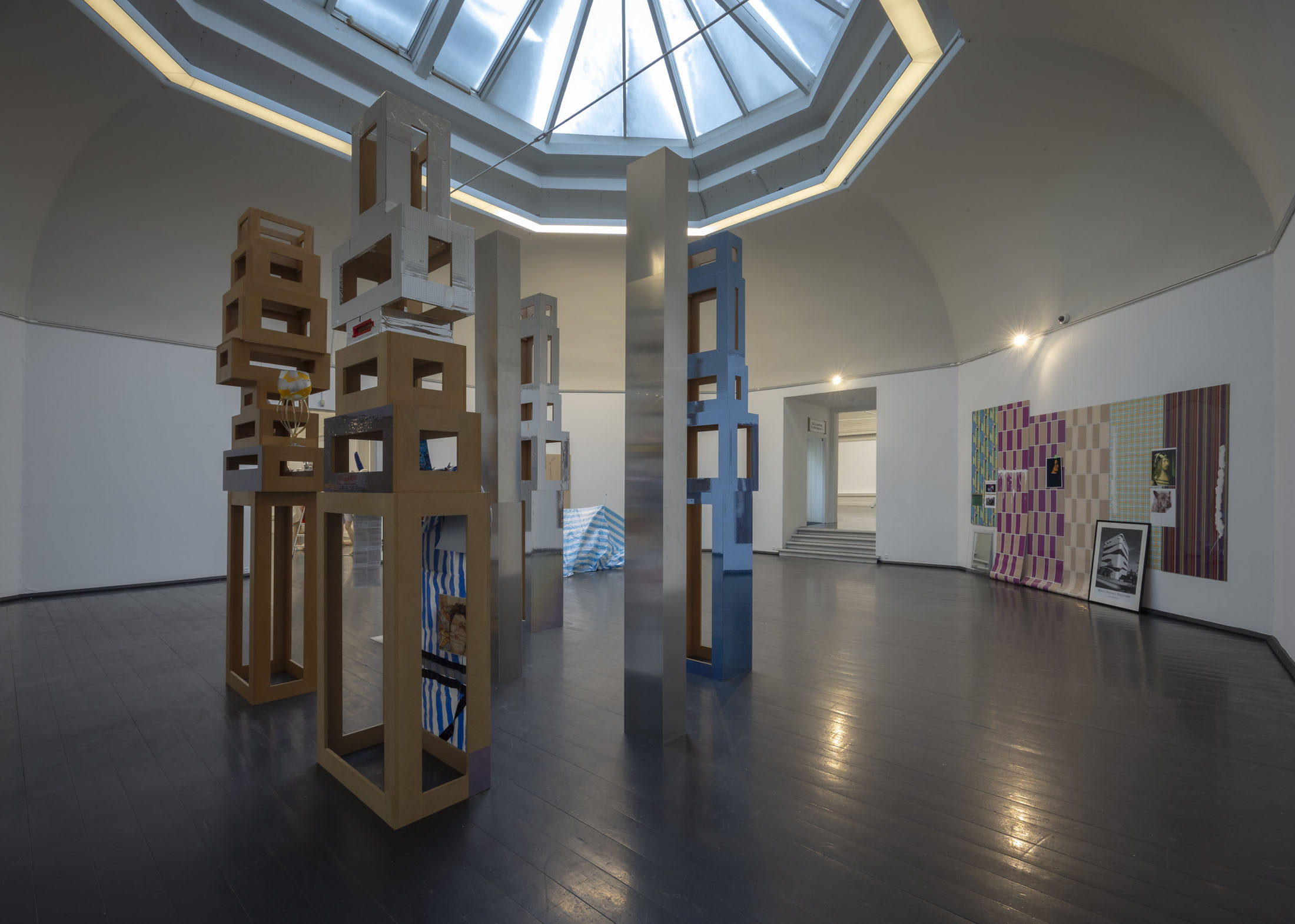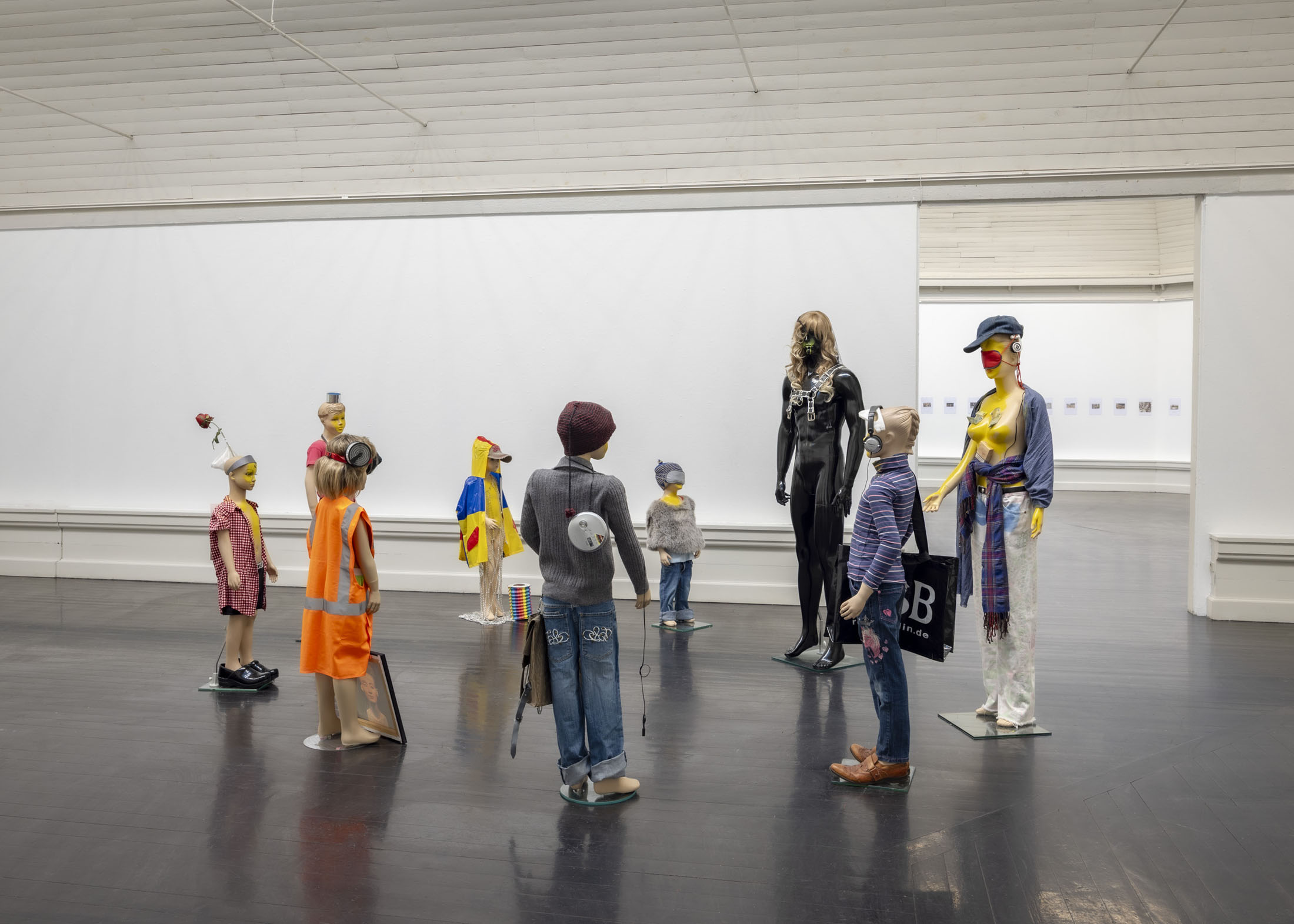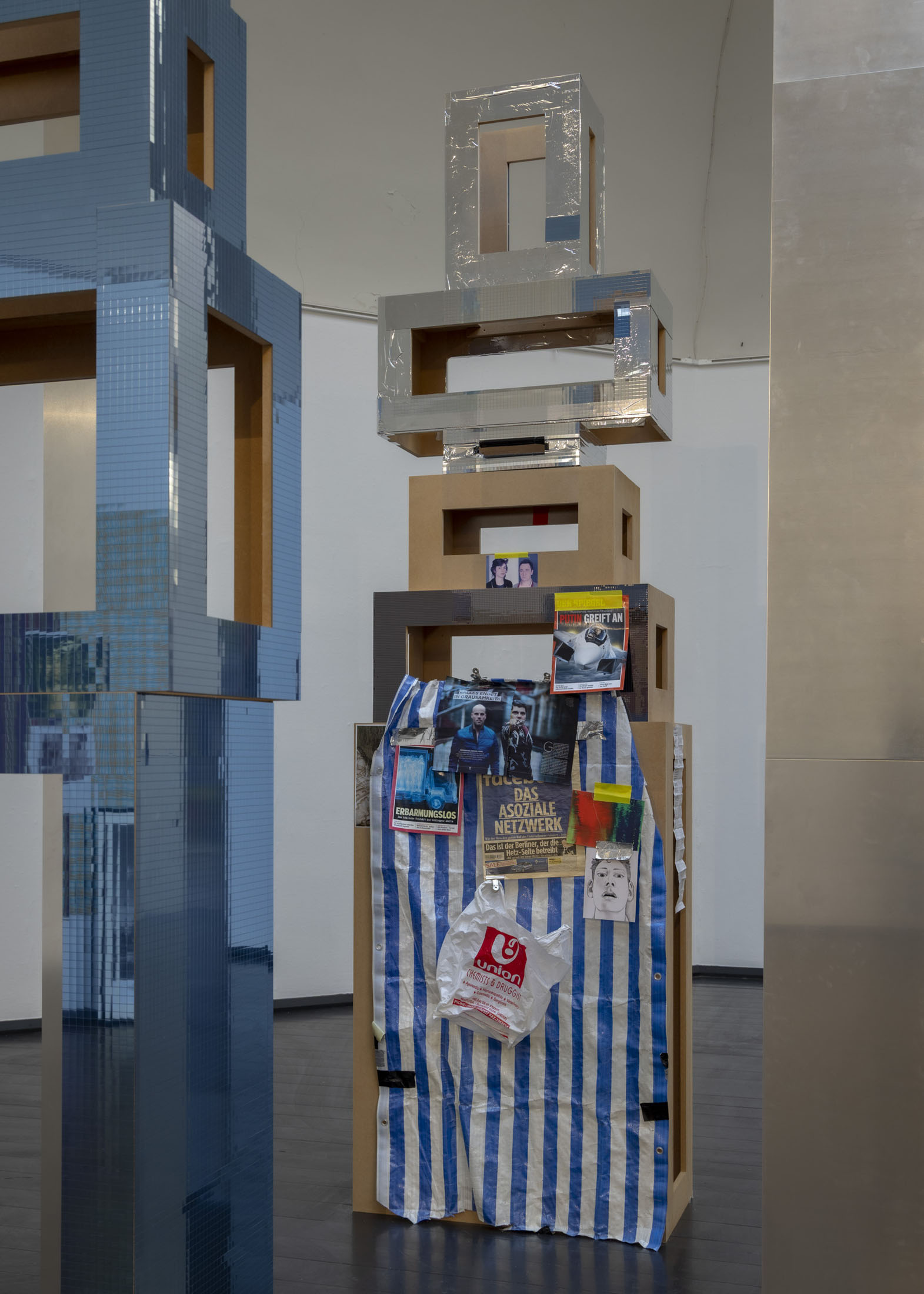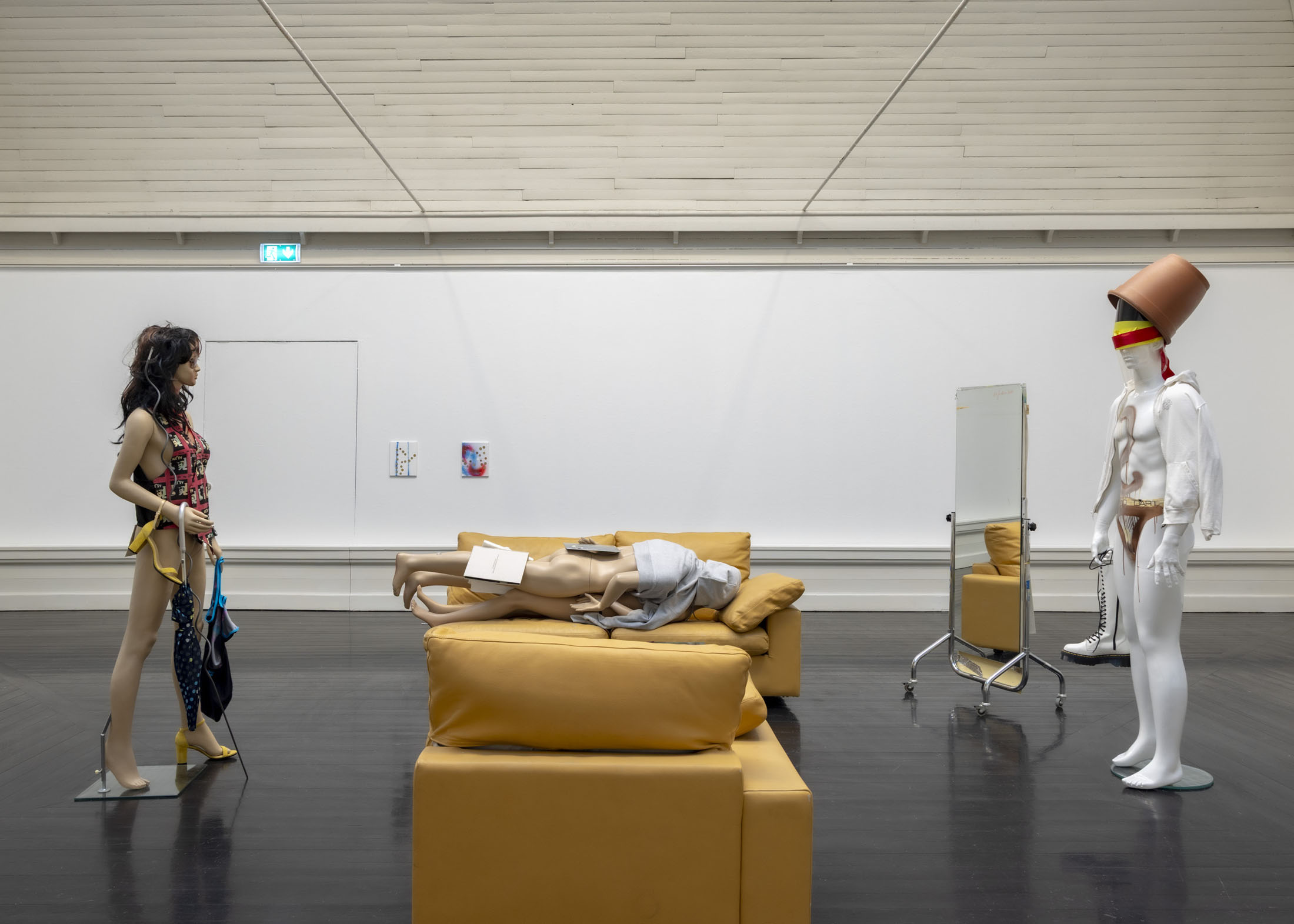 The exhibition further features the installation Science Fiction (To Be Content Here and Now) (2001), created in collaboration with Wolfgang Tillmans, as well as the sculpture Da Vinci (2003), composed of a series of airplane windows and produced in the aftermath of the terrorist attacks of 11 September 2001. Among the works are also Genzken’s characteristic mannequin installations from the 2010s, including Schauspieler III, 3 (2015), in which shop mannequins are staged as actors in a filmic scene that shift their status from idealised consumers toward more open, fictional, and future-oriented subjects. The sculpture Untitled (4 Türme, 3 Stelen) (2015) brings together seven tower-like structures that mimic both the skyscrapers of the modern metropolis and stacks of products in a supermarket or warehouse. In the painting series Geldbilder (2014–16), Genzken explores, with precision and irony, the relationship between painting and economics.