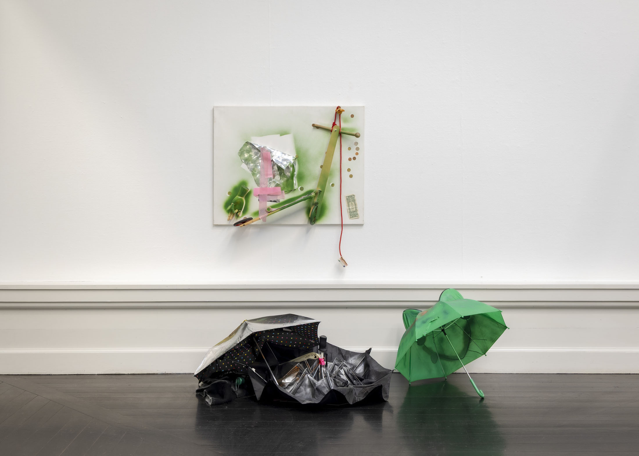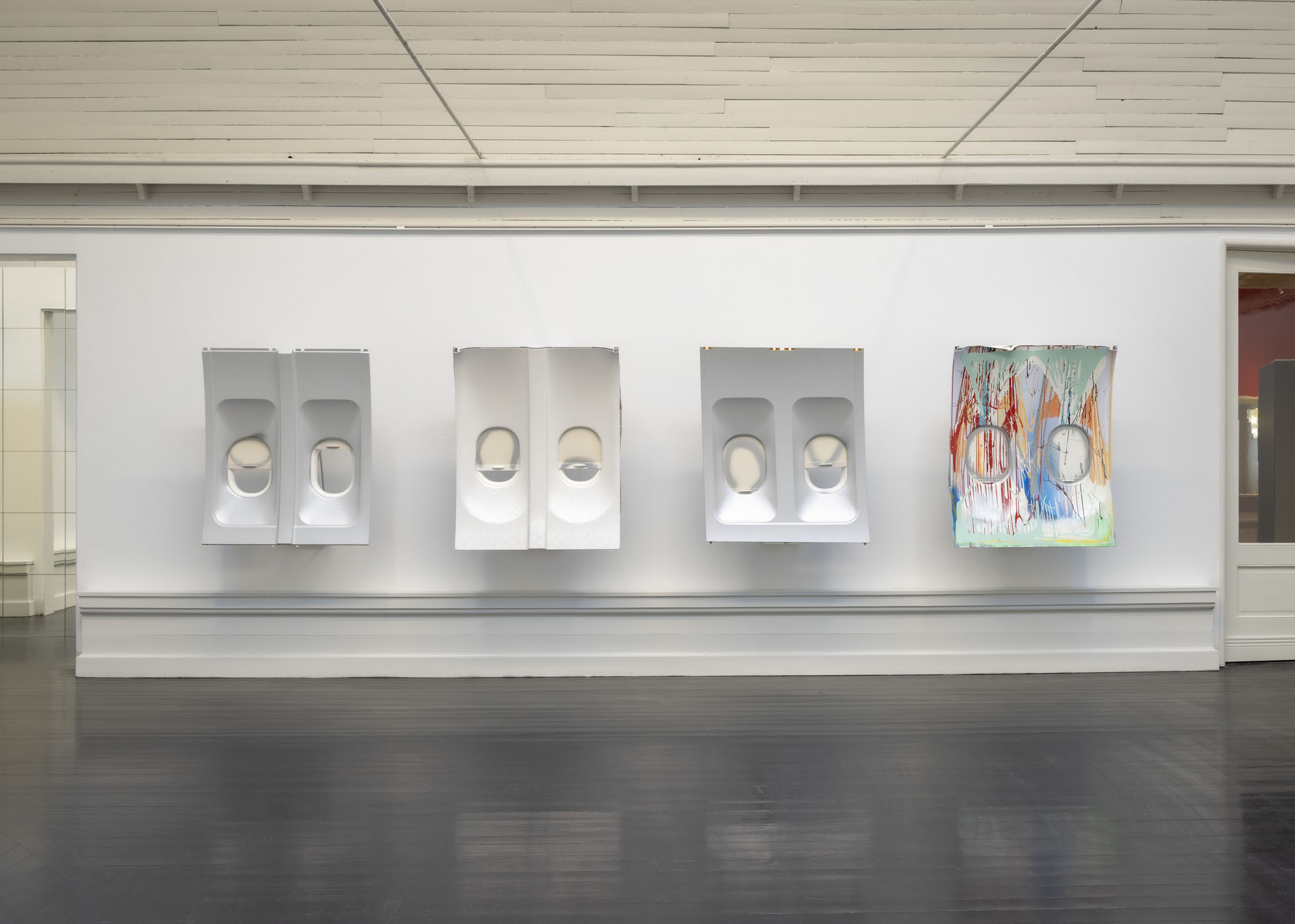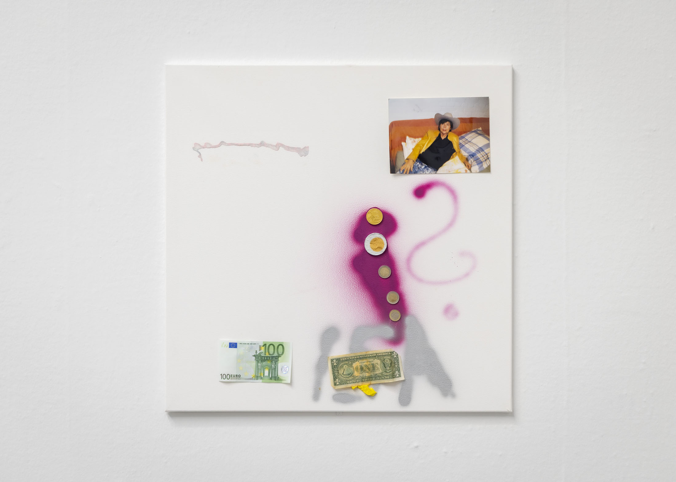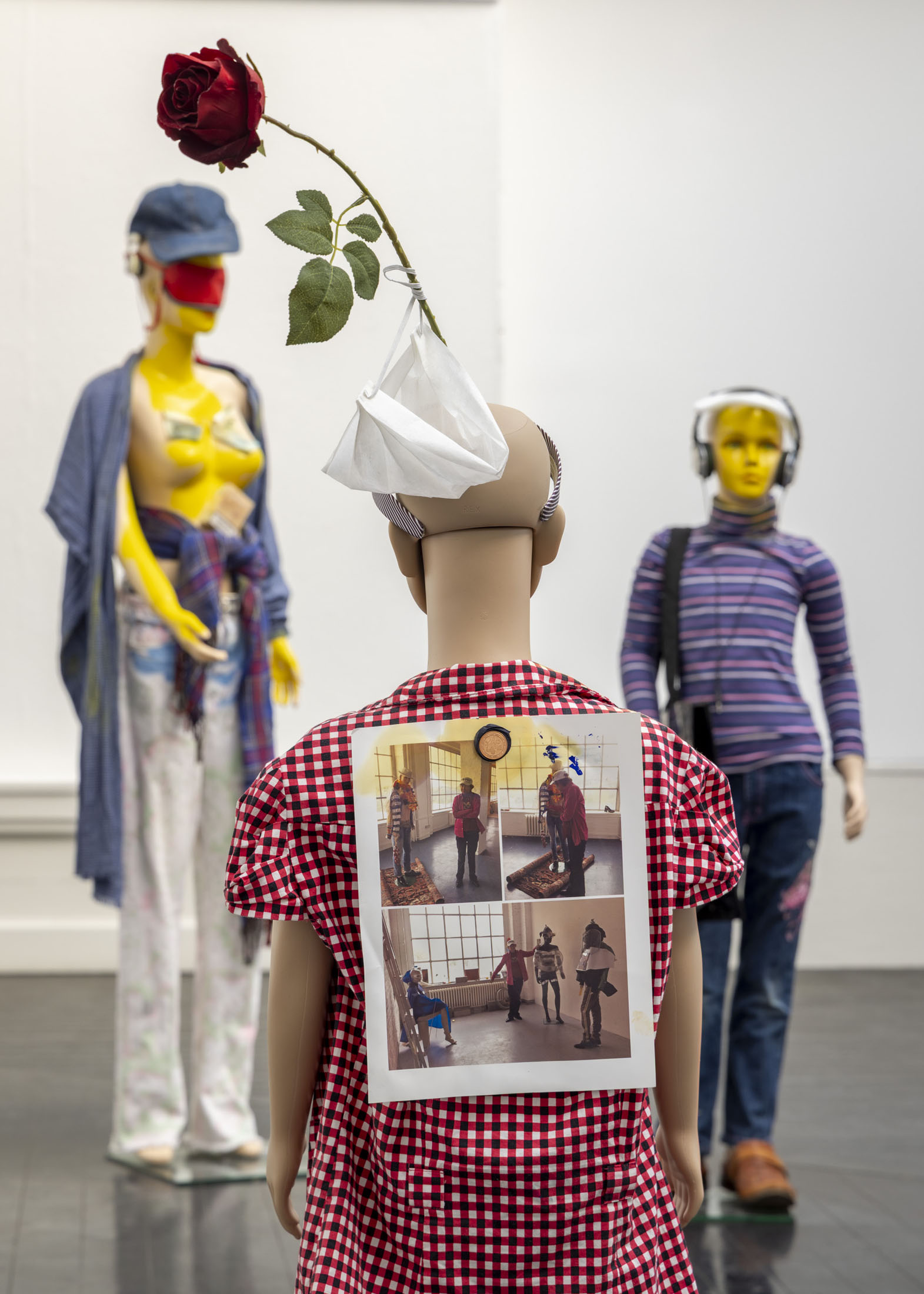 The exhibition further features the installation Science Fiction (To Be Content Here and Now) (2001), created in collaboration with Wolfgang Tillmans, as well as the sculpture Da Vinci (2003), composed of a series of airplane windows and produced in the aftermath of the terrorist attacks of 11 September 2001. Among the works are also Genzken’s characteristic mannequin installations from the 2010s, including Schauspieler III, 3 (2015), in which shop mannequins are staged as actors in a filmic scene that shift their status from idealised consumers toward more open, fictional, and future-oriented subjects. The sculpture Untitled (4 Türme, 3 Stelen) (2015) brings together seven tower-like structures that mimic both the skyscrapers of the modern metropolis and stacks of products in a supermarket or warehouse. In the painting series Geldbilder (2014–16), Genzken explores, with precision and irony, the relationship between painting and economics.