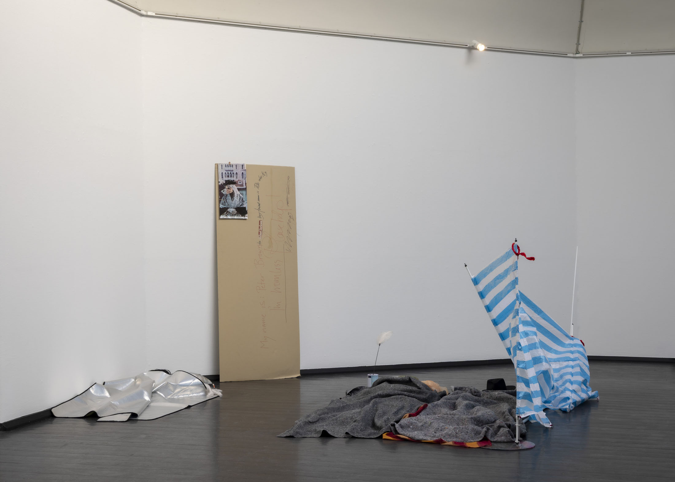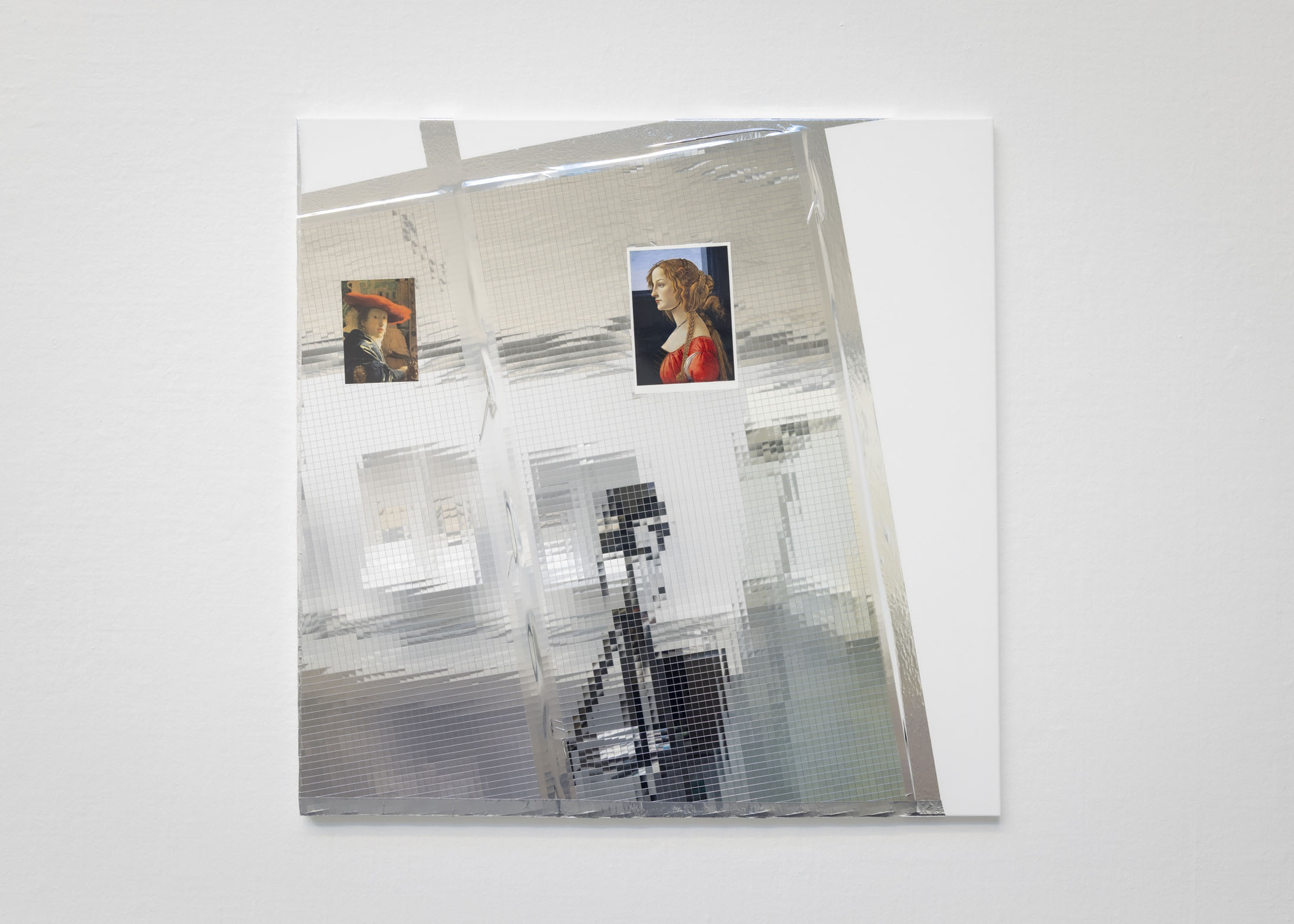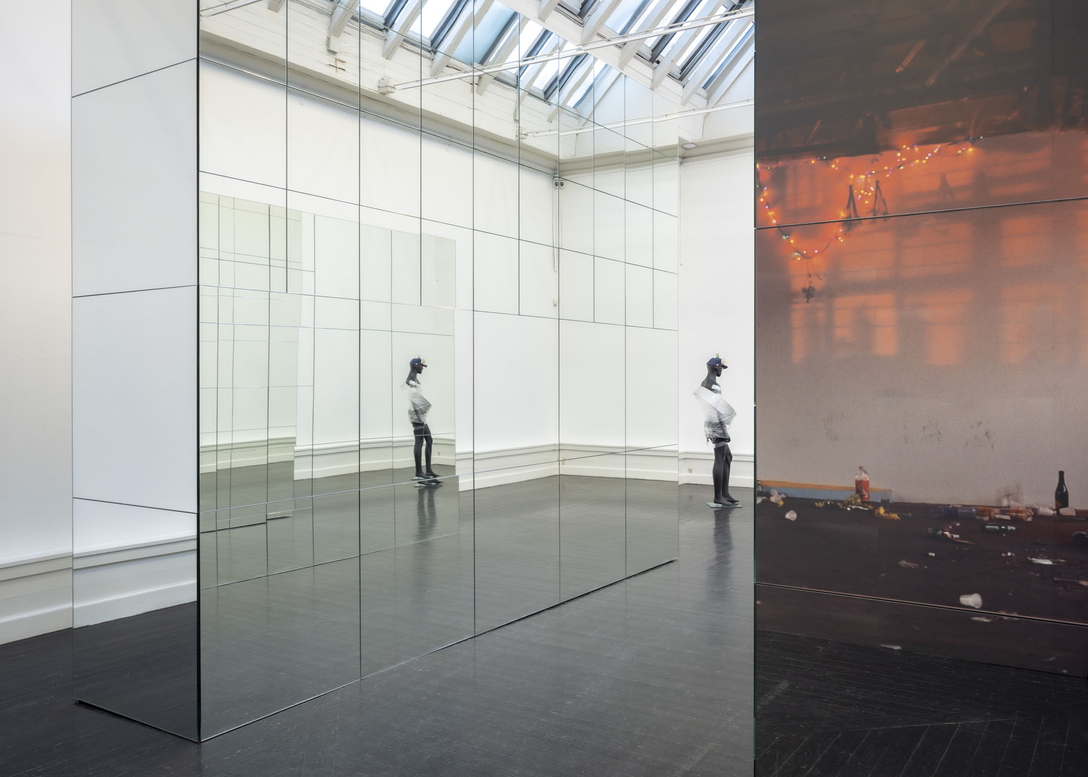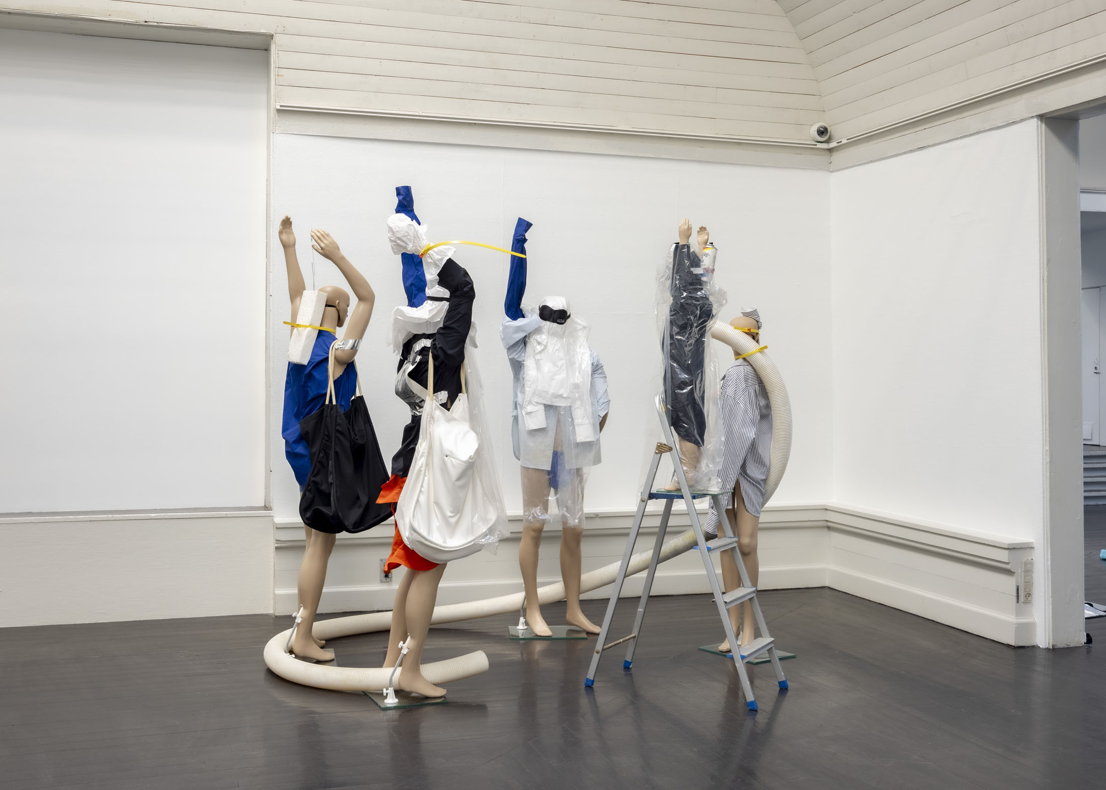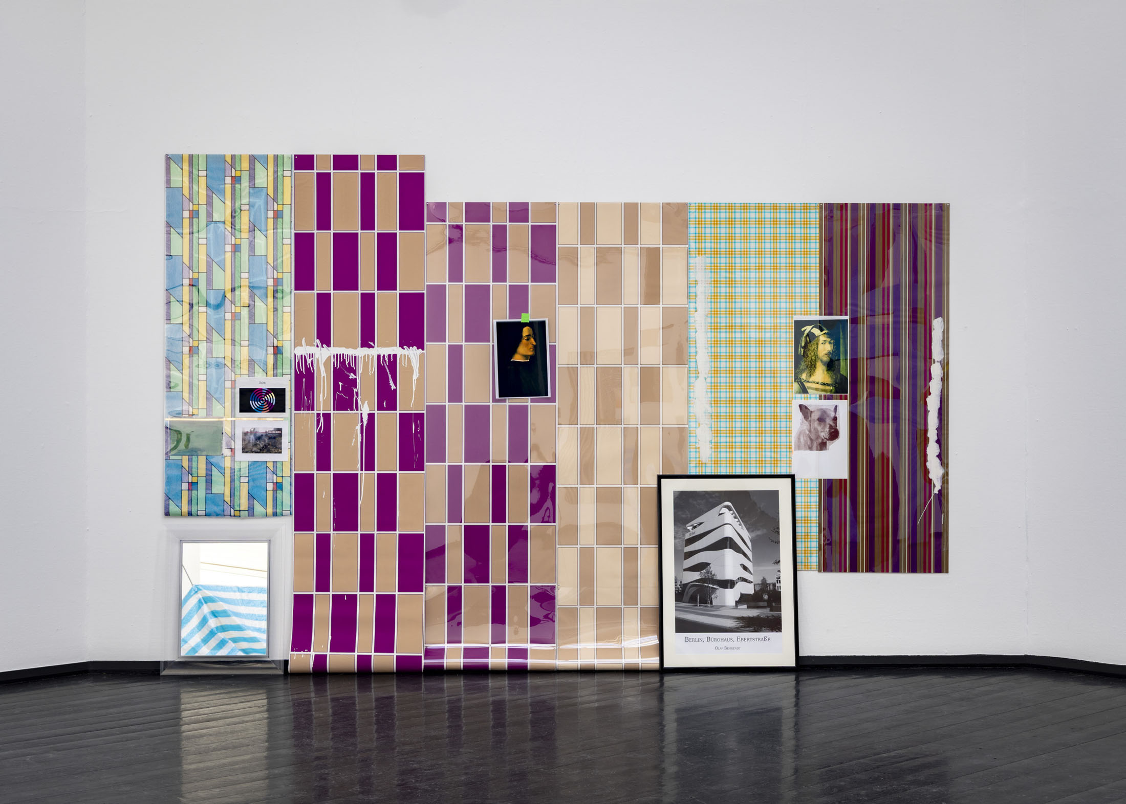 The exhibition further features the installation Science Fiction (To Be Content Here and Now) (2001), created in collaboration with Wolfgang Tillmans, as well as the sculpture Da Vinci (2003), composed of a series of airplane windows and produced in the aftermath of the terrorist attacks of 11 September 2001. Among the works are also Genzken’s characteristic mannequin installations from the 2010s, including Schauspieler III, 3 (2015), in which shop mannequins are staged as actors in a filmic scene that shift their status from idealised consumers toward more open, fictional, and future-oriented subjects. The sculpture Untitled (4 Türme, 3 Stelen) (2015) brings together seven tower-like structures that mimic both the skyscrapers of the modern metropolis and stacks of products in a supermarket or warehouse. In the painting series Geldbilder (2014–16), Genzken explores, with precision and irony, the relationship between painting and economics.