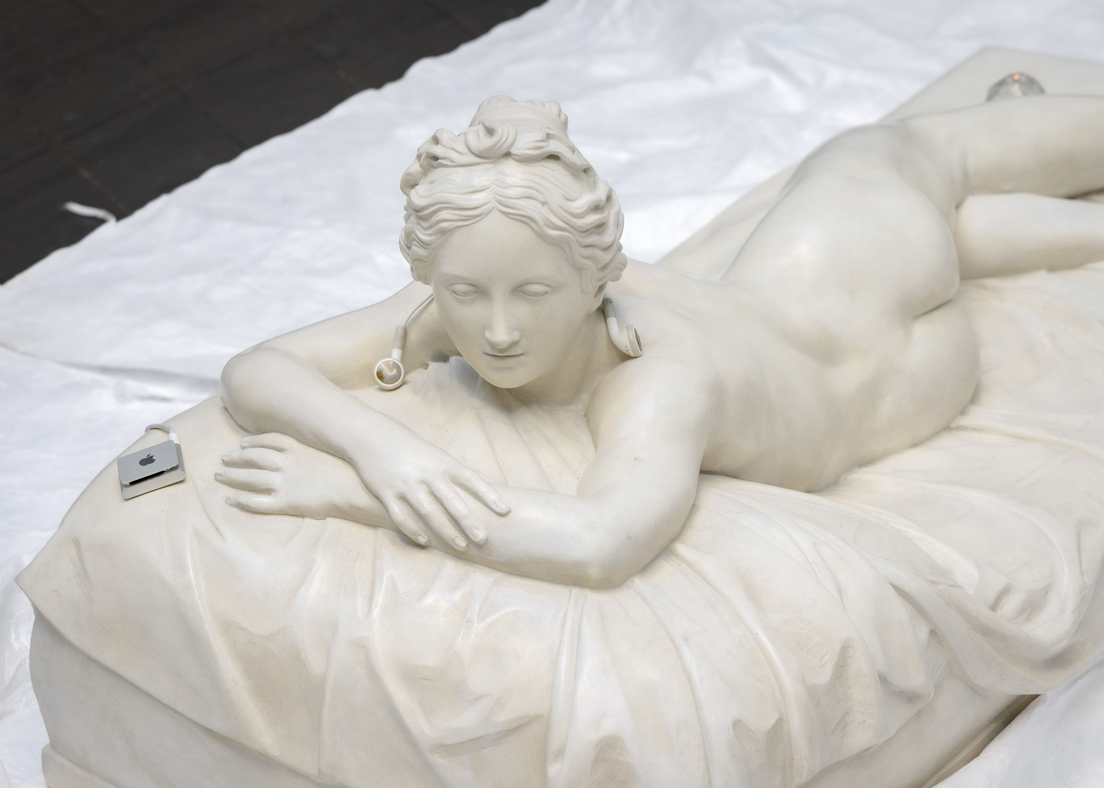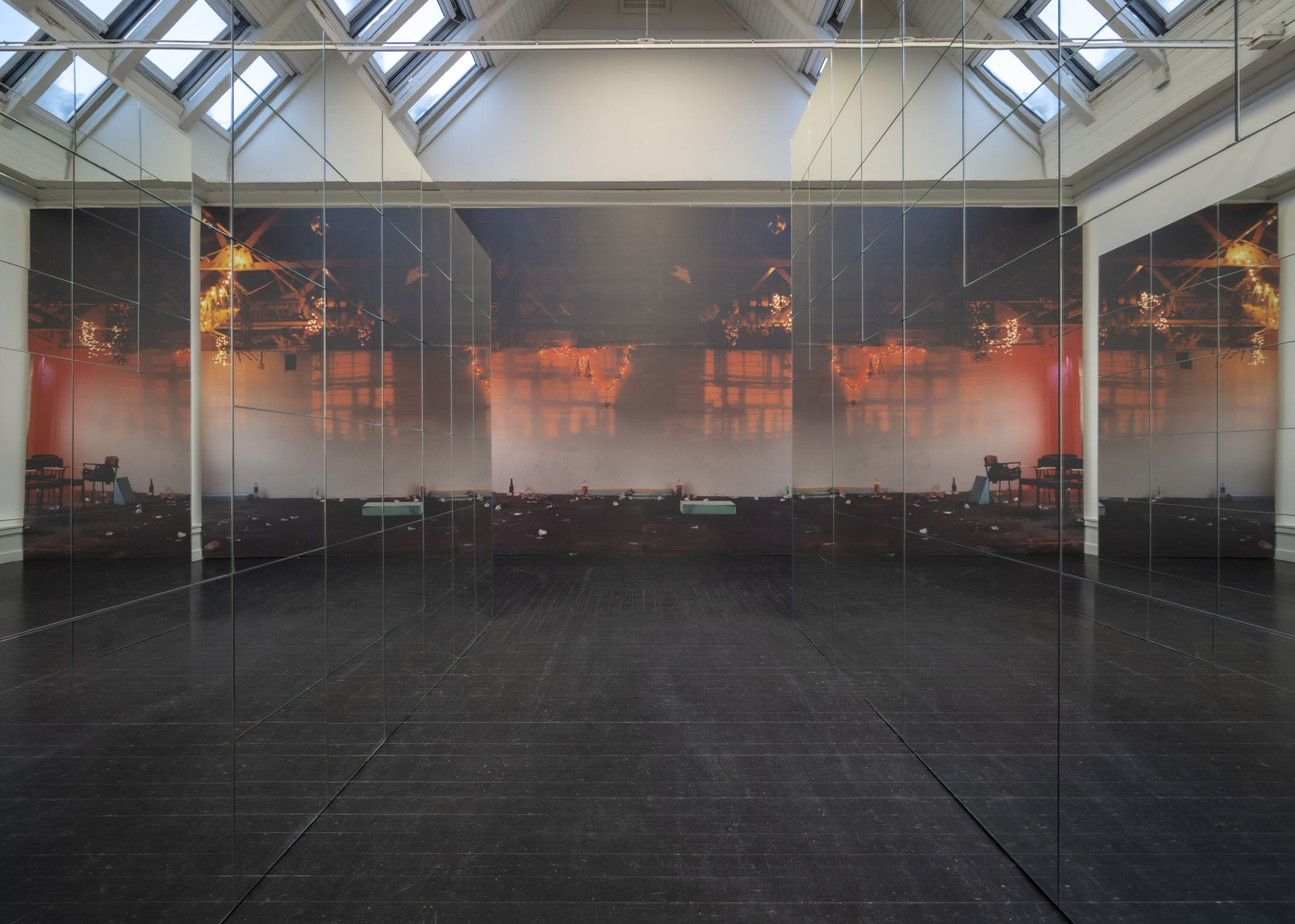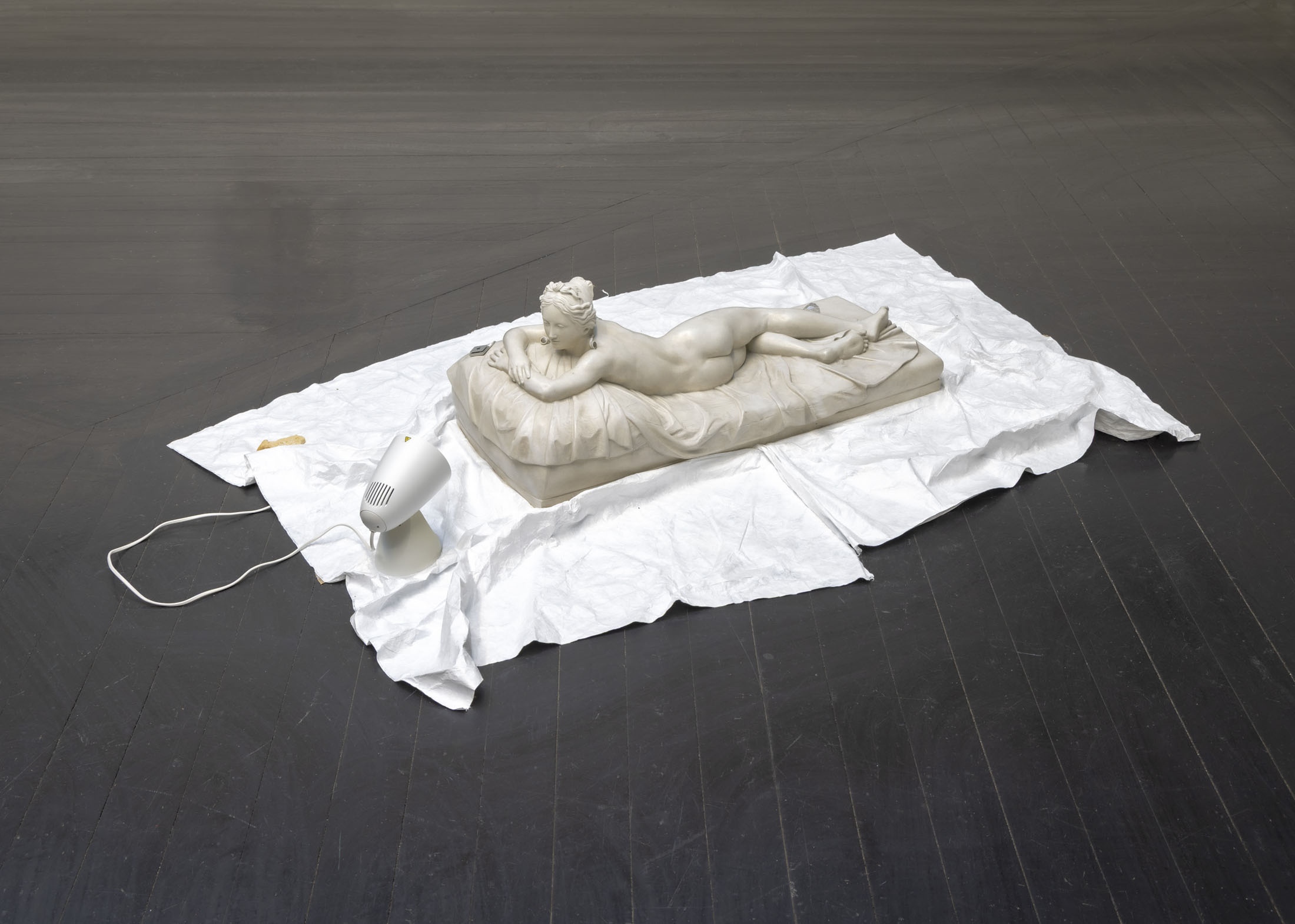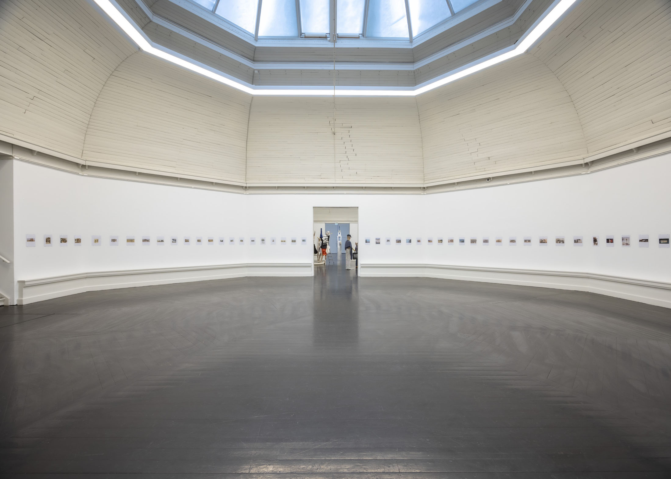 The exhibition further features the installation Science Fiction (To Be Content Here and Now) (2001), created in collaboration with Wolfgang Tillmans, as well as the sculpture Da Vinci (2003), composed of a series of airplane windows and produced in the aftermath of the terrorist attacks of 11 September 2001. Among the works are also Genzken’s characteristic mannequin installations from the 2010s, including Schauspieler III, 3 (2015), in which shop mannequins are staged as actors in a filmic scene that shift their status from idealised consumers toward more open, fictional, and future-oriented subjects. The sculpture Untitled (4 Türme, 3 Stelen) (2015) brings together seven tower-like structures that mimic both the skyscrapers of the modern metropolis and stacks of products in a supermarket or warehouse. In the painting series Geldbilder (2014–16), Genzken explores, with precision and irony, the relationship between painting and economics.