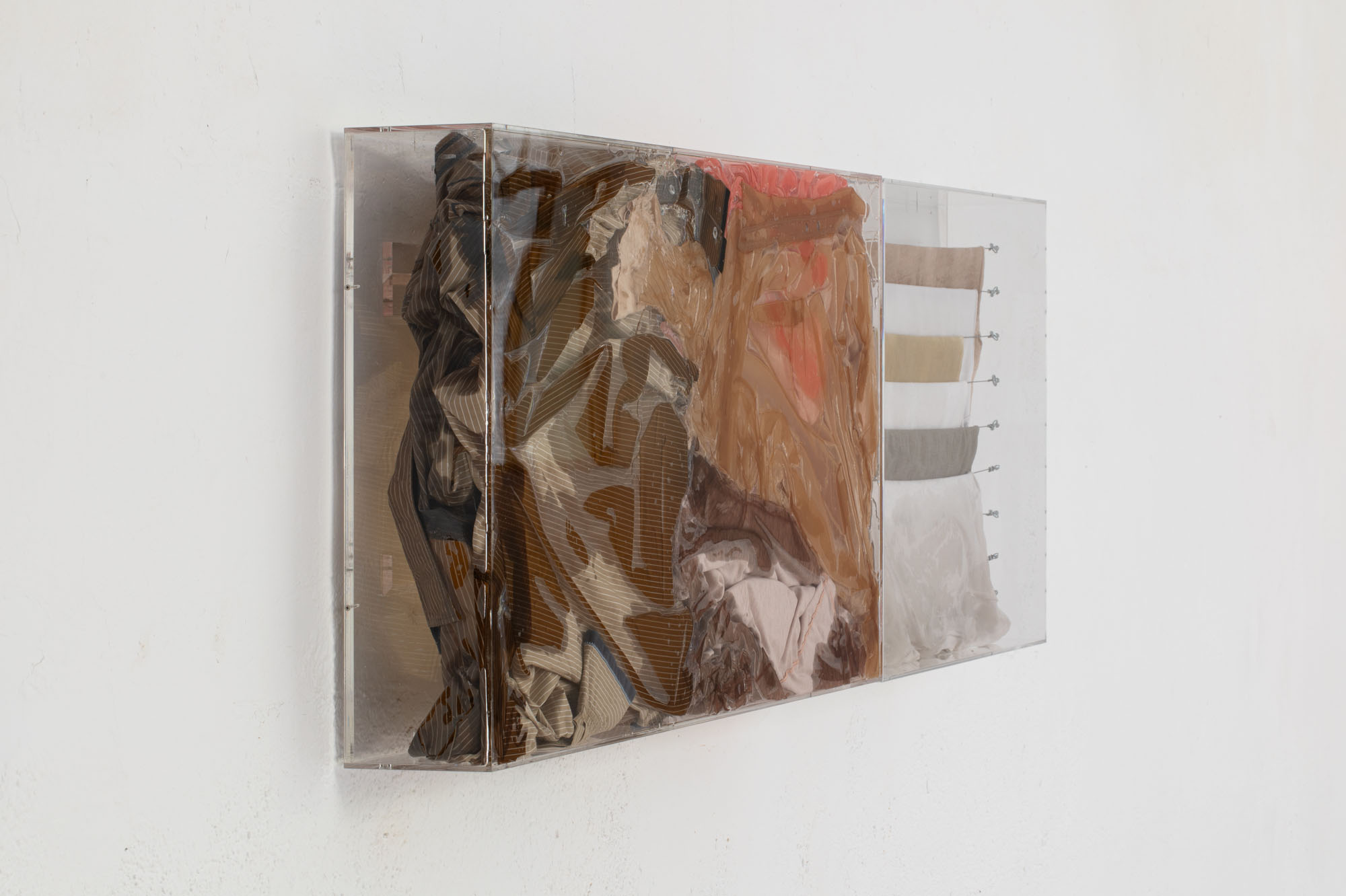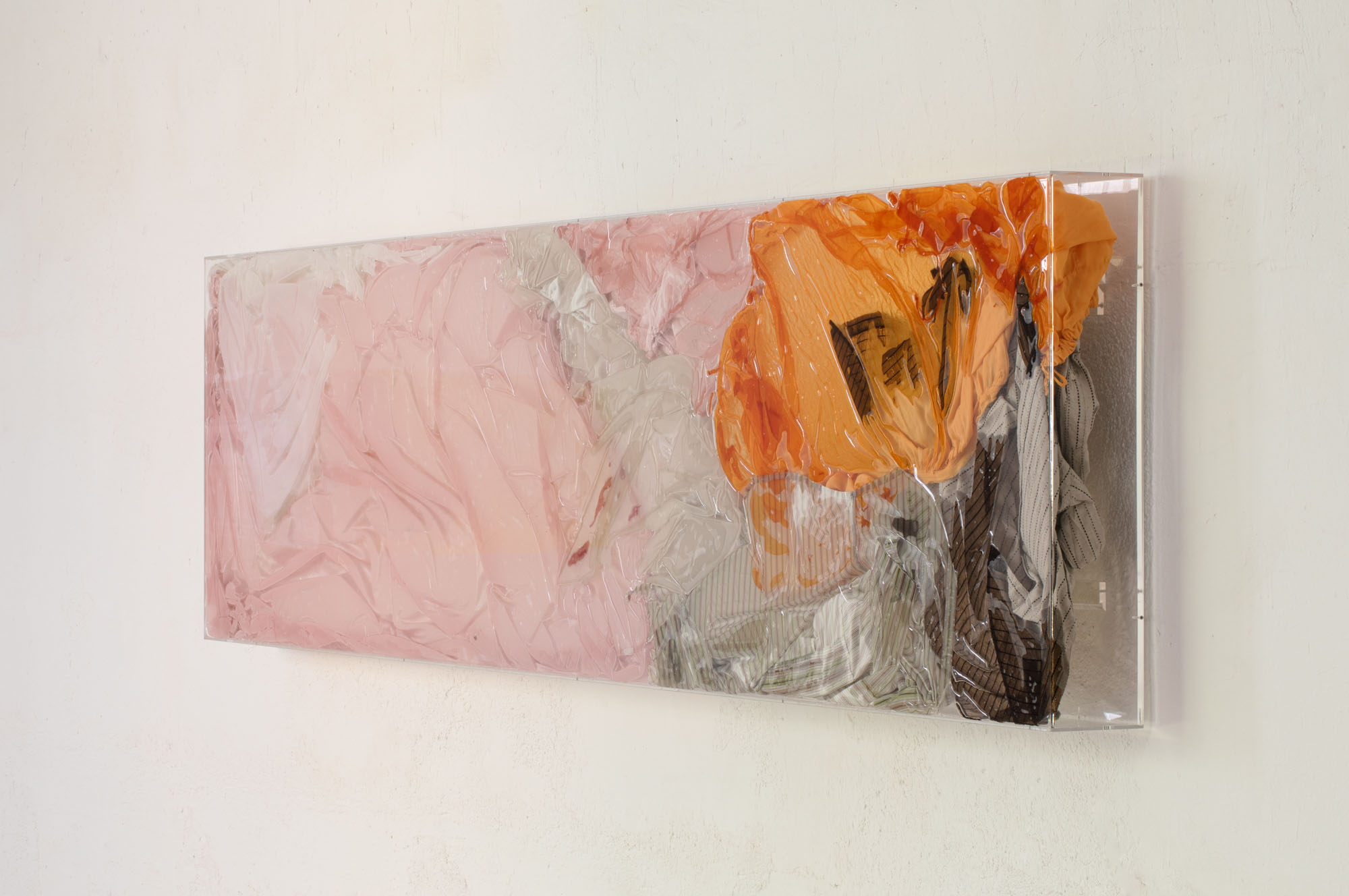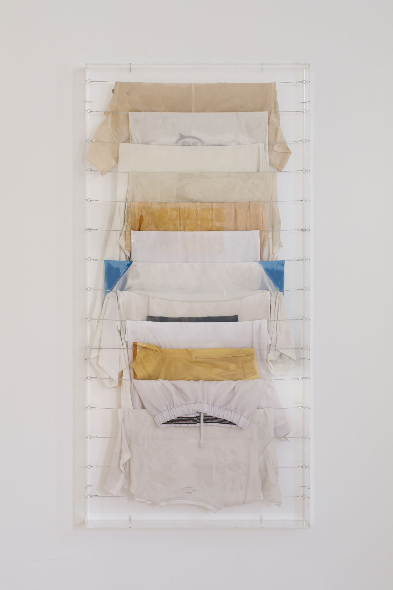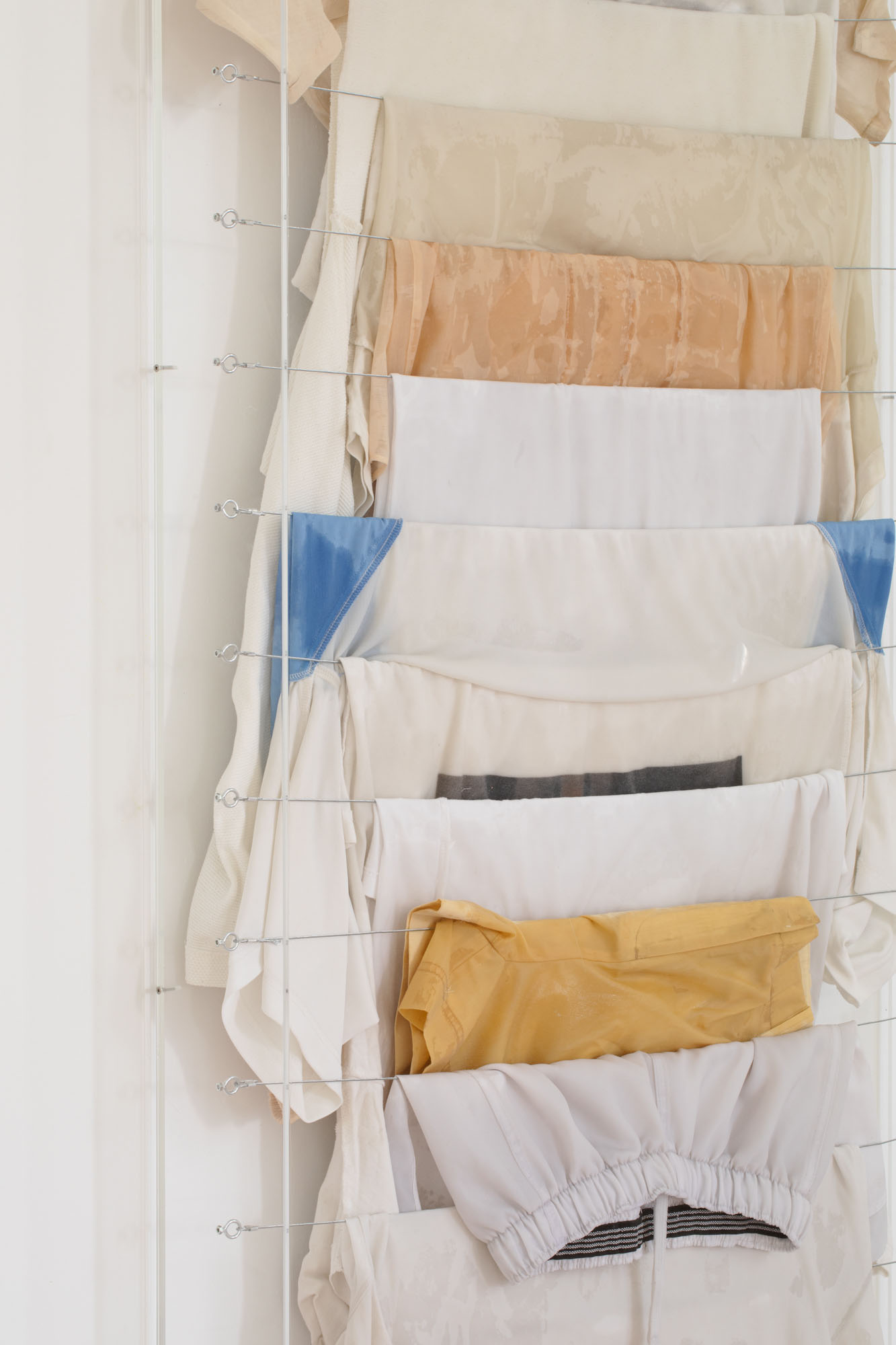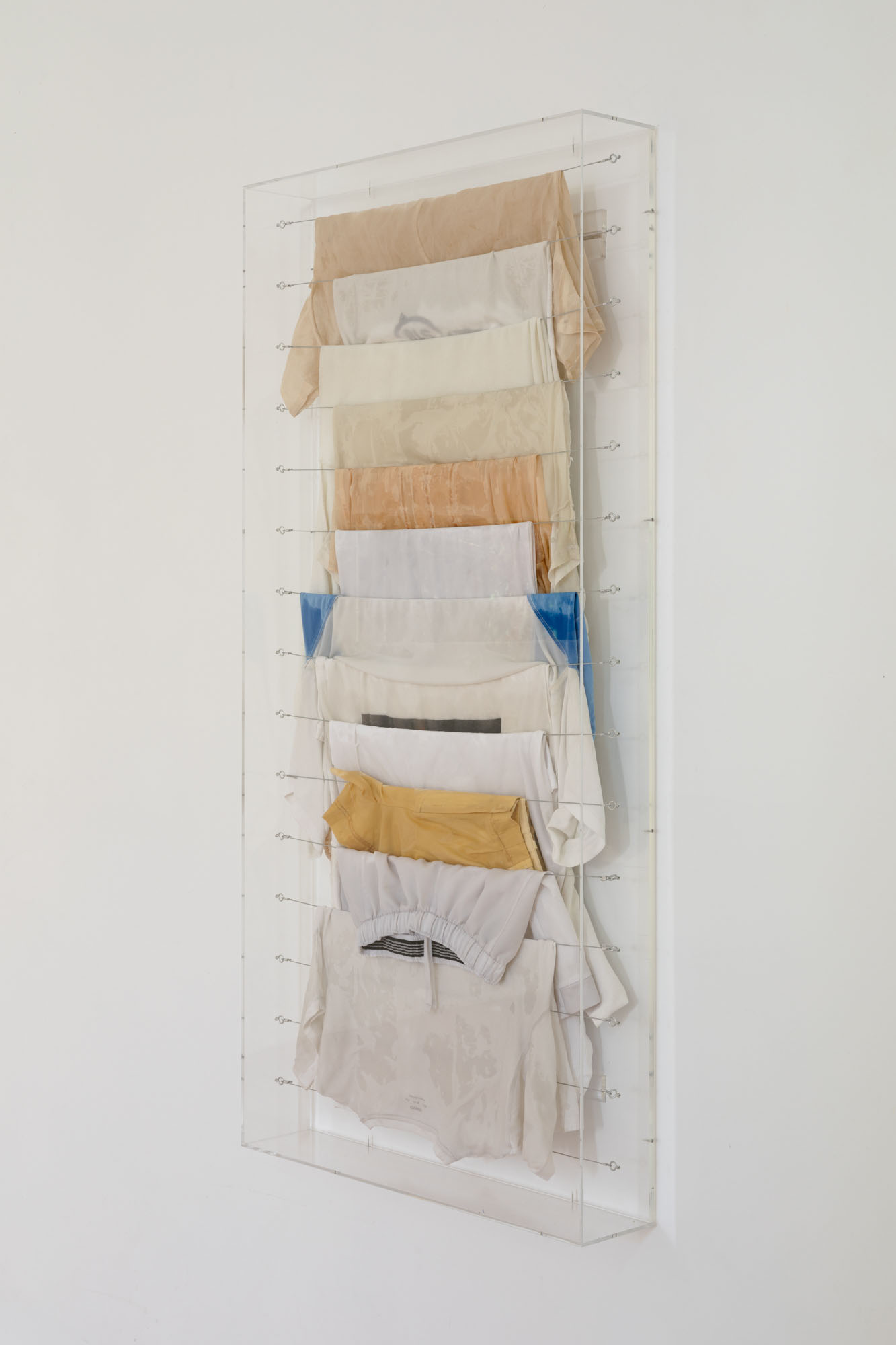 I imagine that all your conversations are almost like this exhibition. Timelines (or cross-cuts of time)—clean dissections, slicing through the body of time to study it archaeologically. You move in two languages and sometimes four different accents. Against the clotheslines so meticulously and vertically arranged, your Coladas [‘Washing cycles’] speak a language that is equally abstract but expressive, and shaped like the horizon. The Y-axis is like the left hemisphere of the brain: logical, mathematical, analytical, craving order. The X-axis is its counterpart: passionate, chaotic, prone to fantasy. Together, they form a grid. Resin helps you petrify in a practically liquid state. It mimics the gloss of water and soap, like an oil stain still fresh on the canvas even after the decades. Everything wrapped in Plexiglas, a material you use both to cover and to display content, like a vitrine holding a relic of the past in a museum. Working inside the box, you arrange, move, and sculpt the fabrics like brushstrokes.