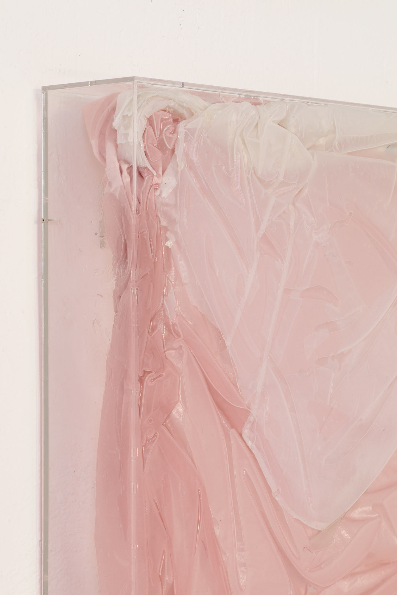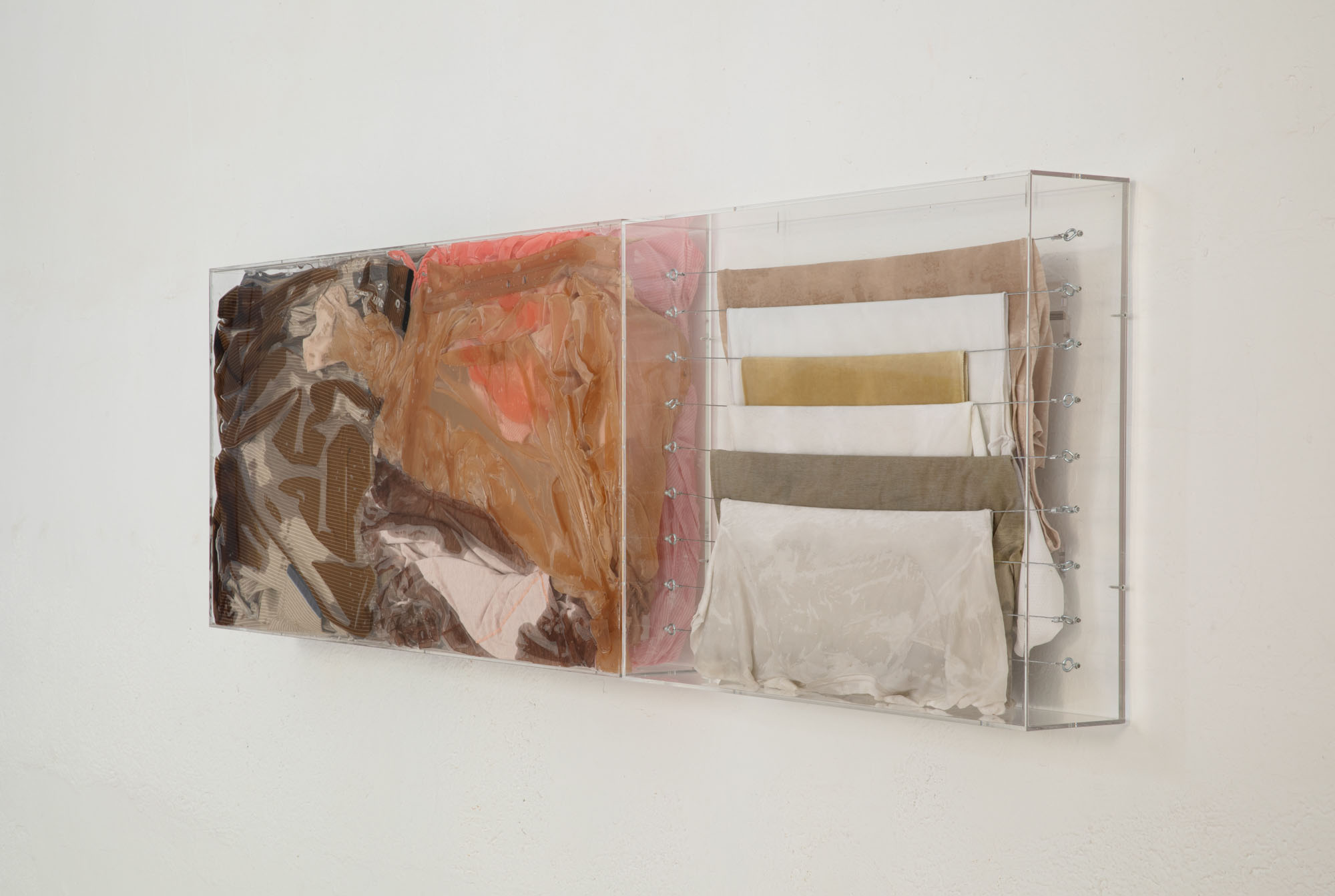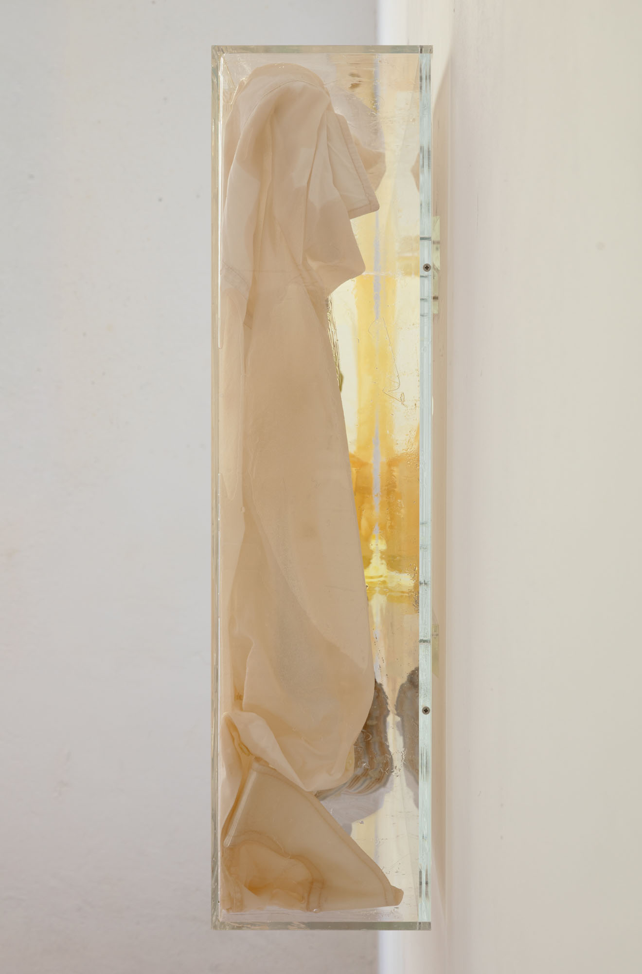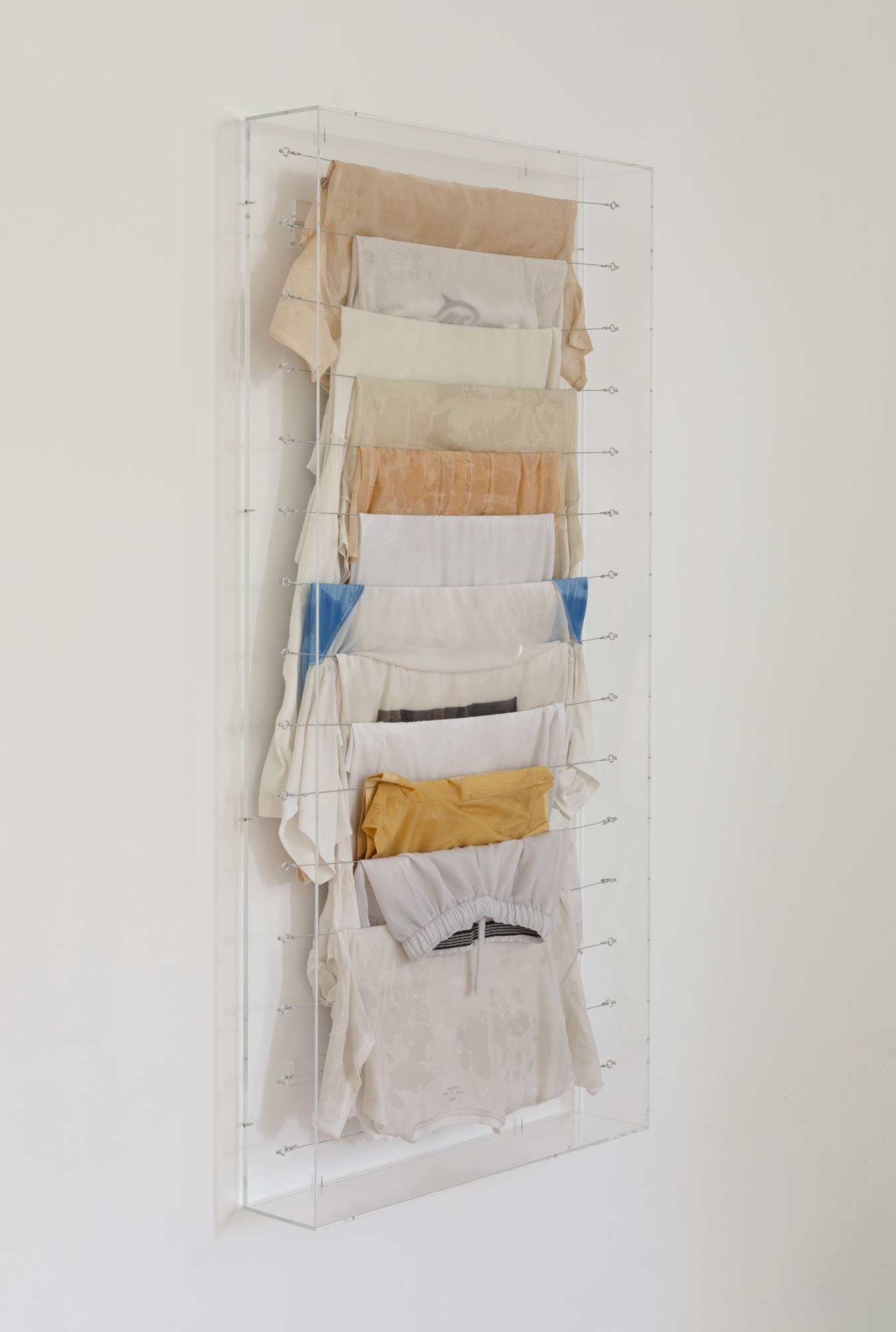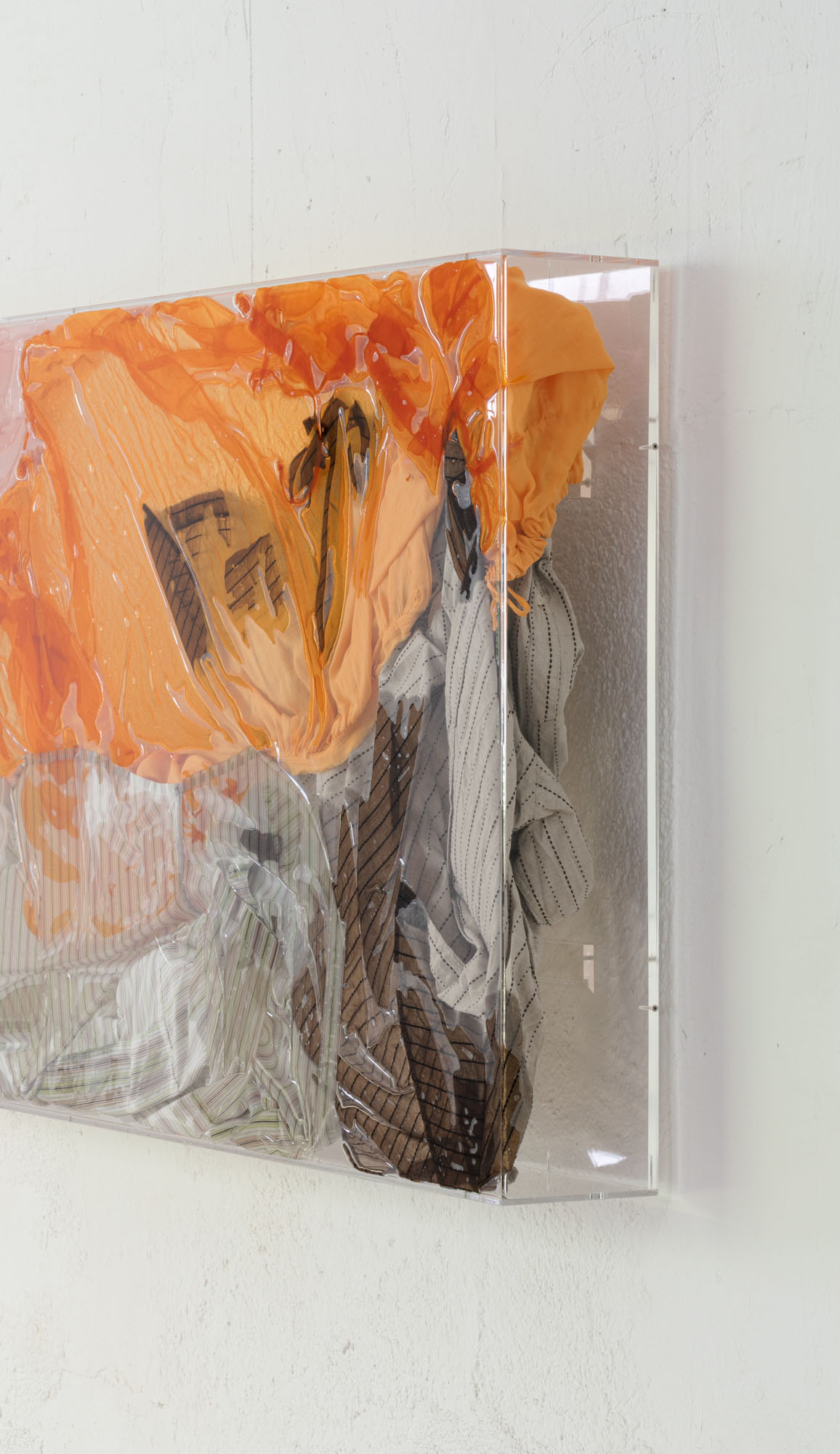 I imagine that all your conversations are almost like this exhibition. Timelines (or cross-cuts of time)—clean dissections, slicing through the body of time to study it archaeologically. You move in two languages and sometimes four different accents. Against the clotheslines so meticulously and vertically arranged, your Coladas [‘Washing cycles’] speak a language that is equally abstract but expressive, and shaped like the horizon. The Y-axis is like the left hemisphere of the brain: logical, mathematical, analytical, craving order. The X-axis is its counterpart: passionate, chaotic, prone to fantasy. Together, they form a grid. Resin helps you petrify in a practically liquid state. It mimics the gloss of water and soap, like an oil stain still fresh on the canvas even after the decades. Everything wrapped in Plexiglas, a material you use both to cover and to display content, like a vitrine holding a relic of the past in a museum. Working inside the box, you arrange, move, and sculpt the fabrics like brushstrokes.