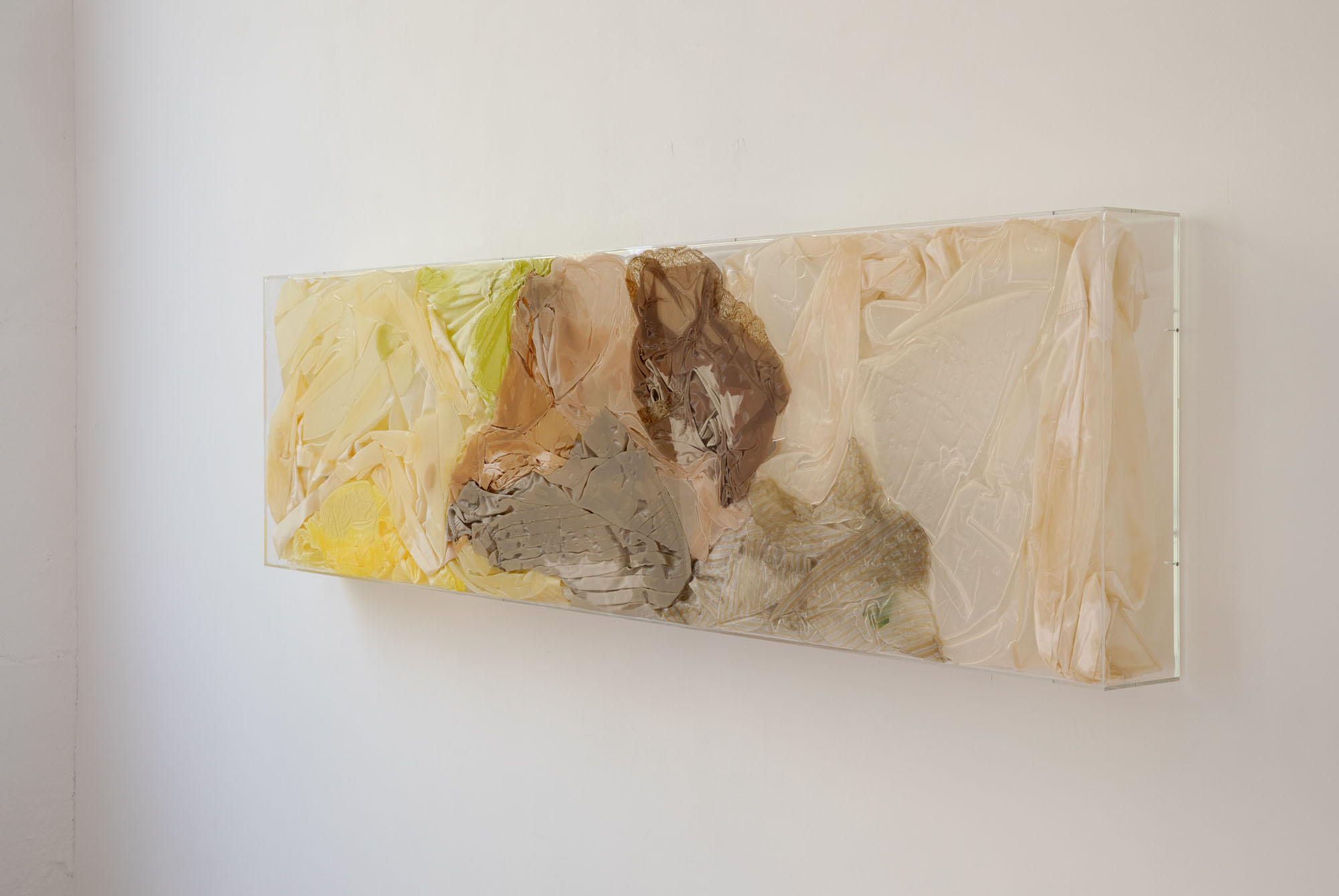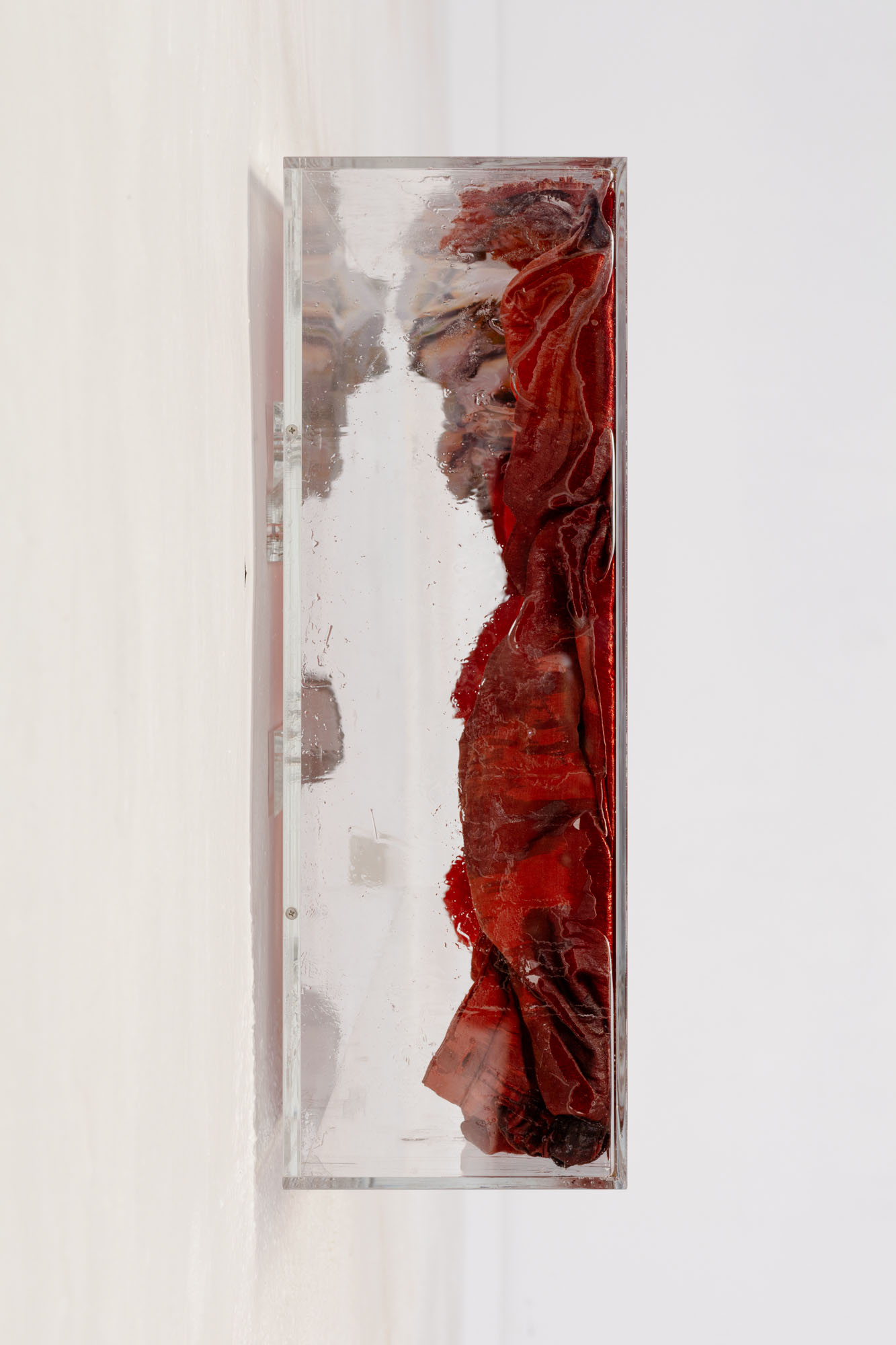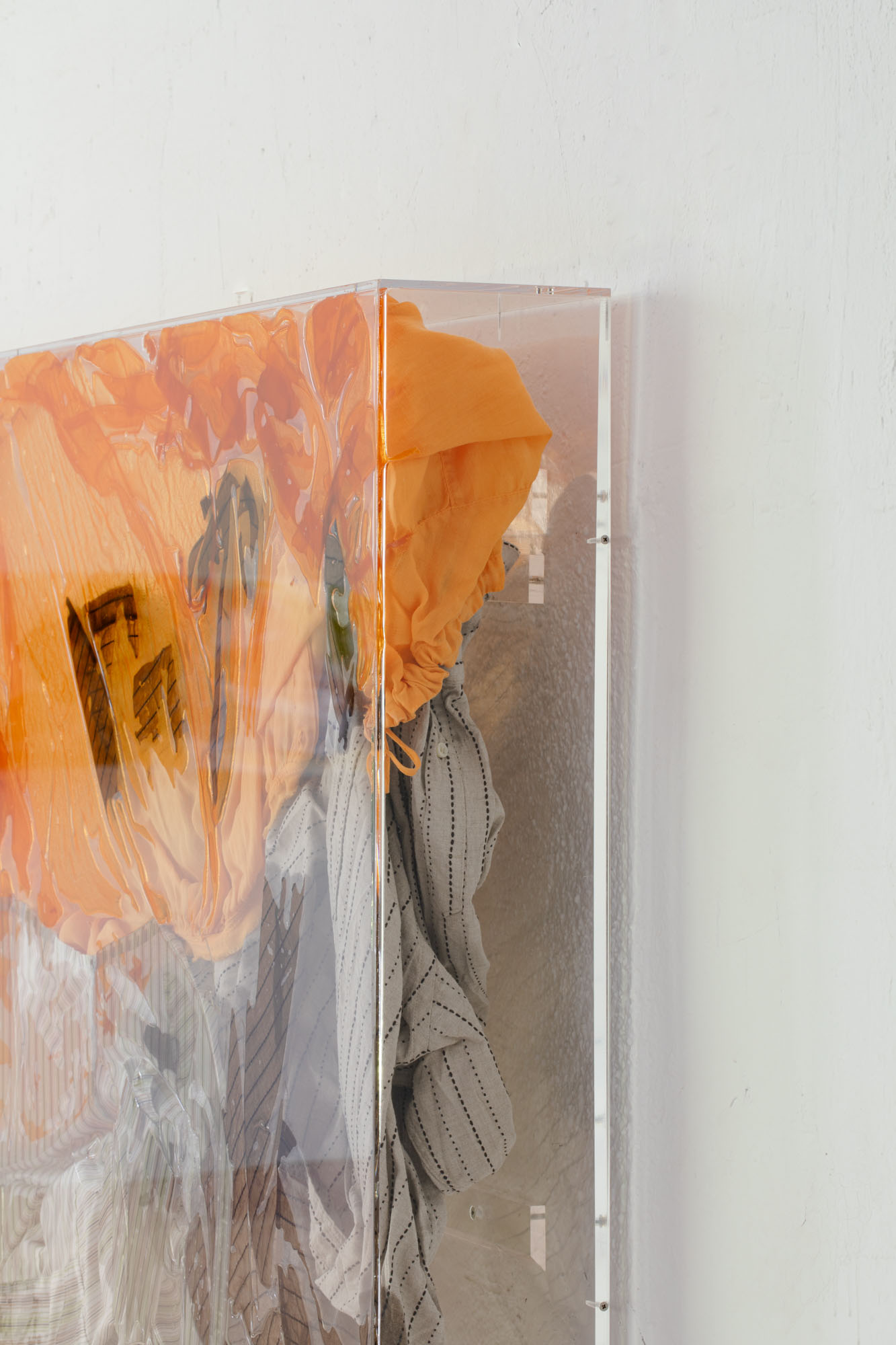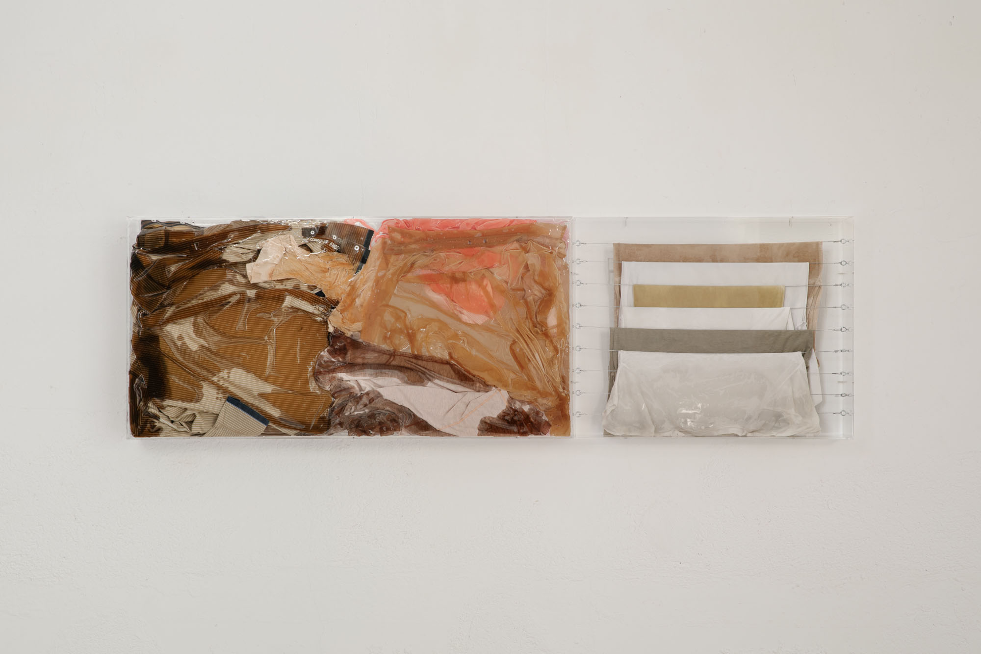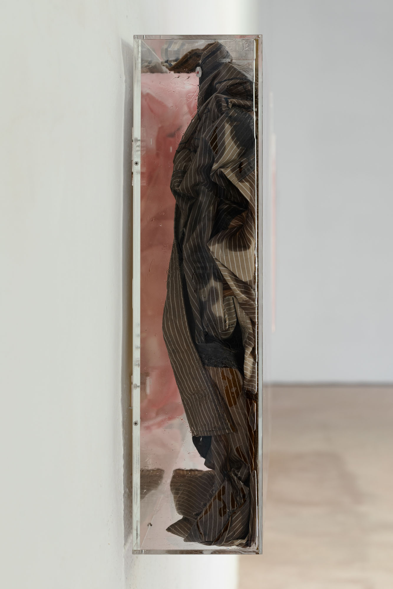 I imagine that all your conversations are almost like this exhibition. Timelines (or cross-cuts of time)—clean dissections, slicing through the body of time to study it archaeologically. You move in two languages and sometimes four different accents. Against the clotheslines so meticulously and vertically arranged, your Coladas [‘Washing cycles’] speak a language that is equally abstract but expressive, and shaped like the horizon. The Y-axis is like the left hemisphere of the brain: logical, mathematical, analytical, craving order. The X-axis is its counterpart: passionate, chaotic, prone to fantasy. Together, they form a grid. Resin helps you petrify in a practically liquid state. It mimics the gloss of water and soap, like an oil stain still fresh on the canvas even after the decades. Everything wrapped in Plexiglas, a material you use both to cover and to display content, like a vitrine holding a relic of the past in a museum. Working inside the box, you arrange, move, and sculpt the fabrics like brushstrokes.