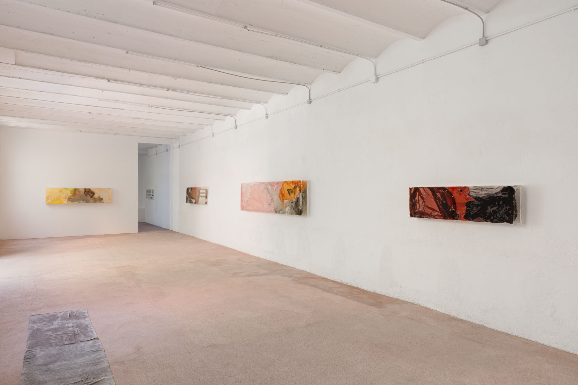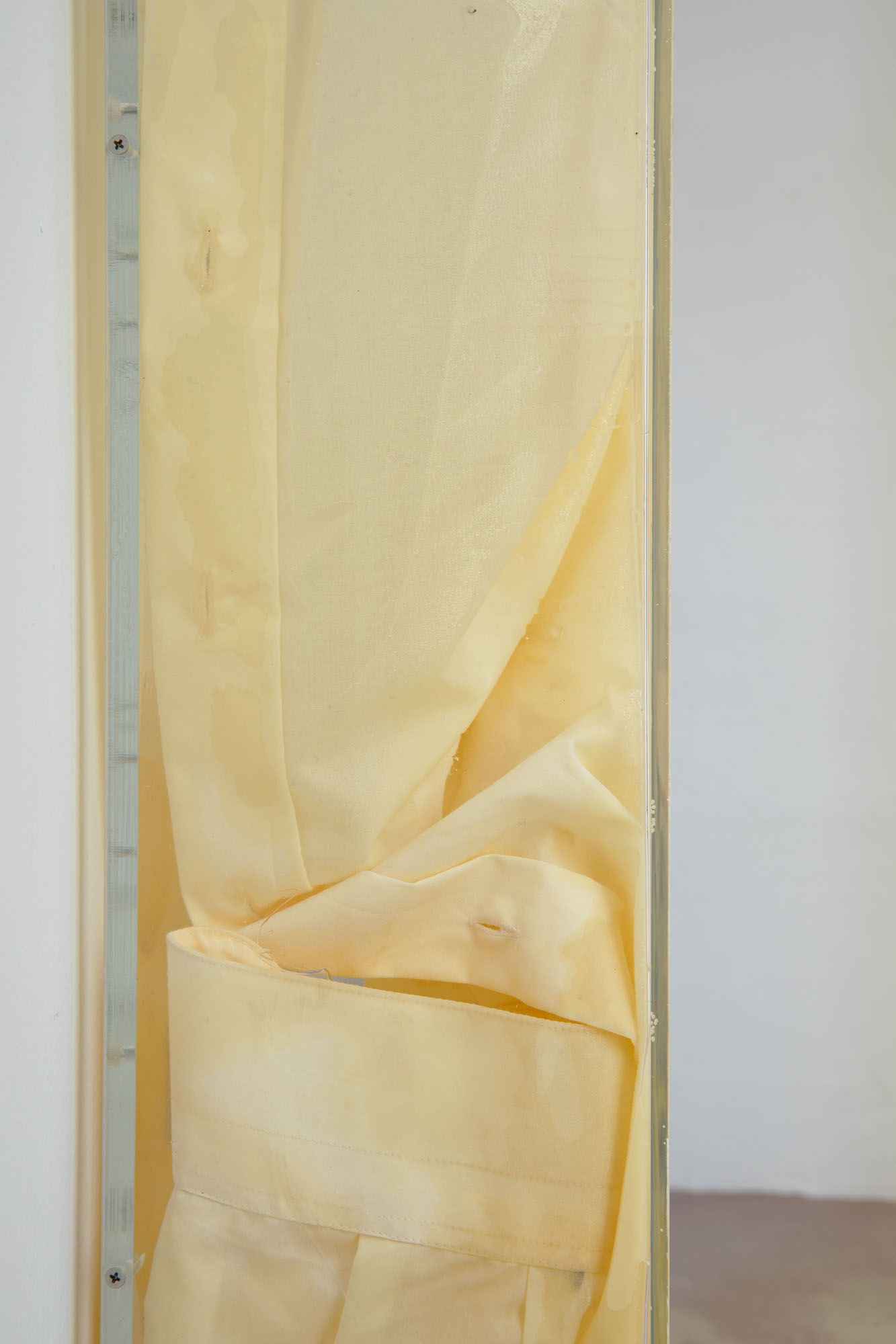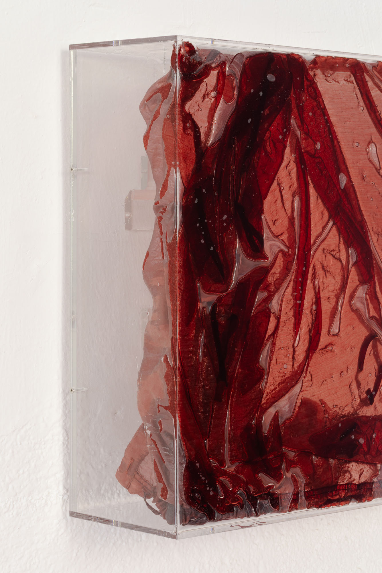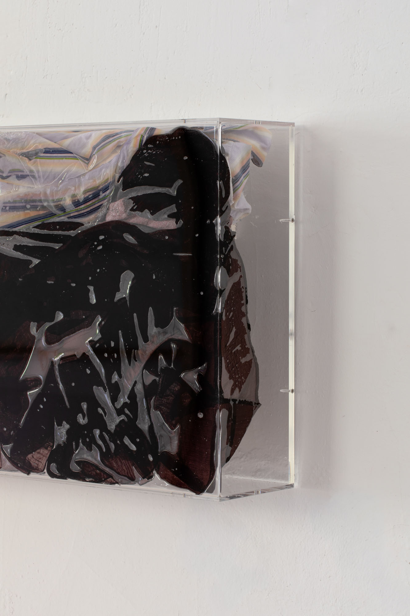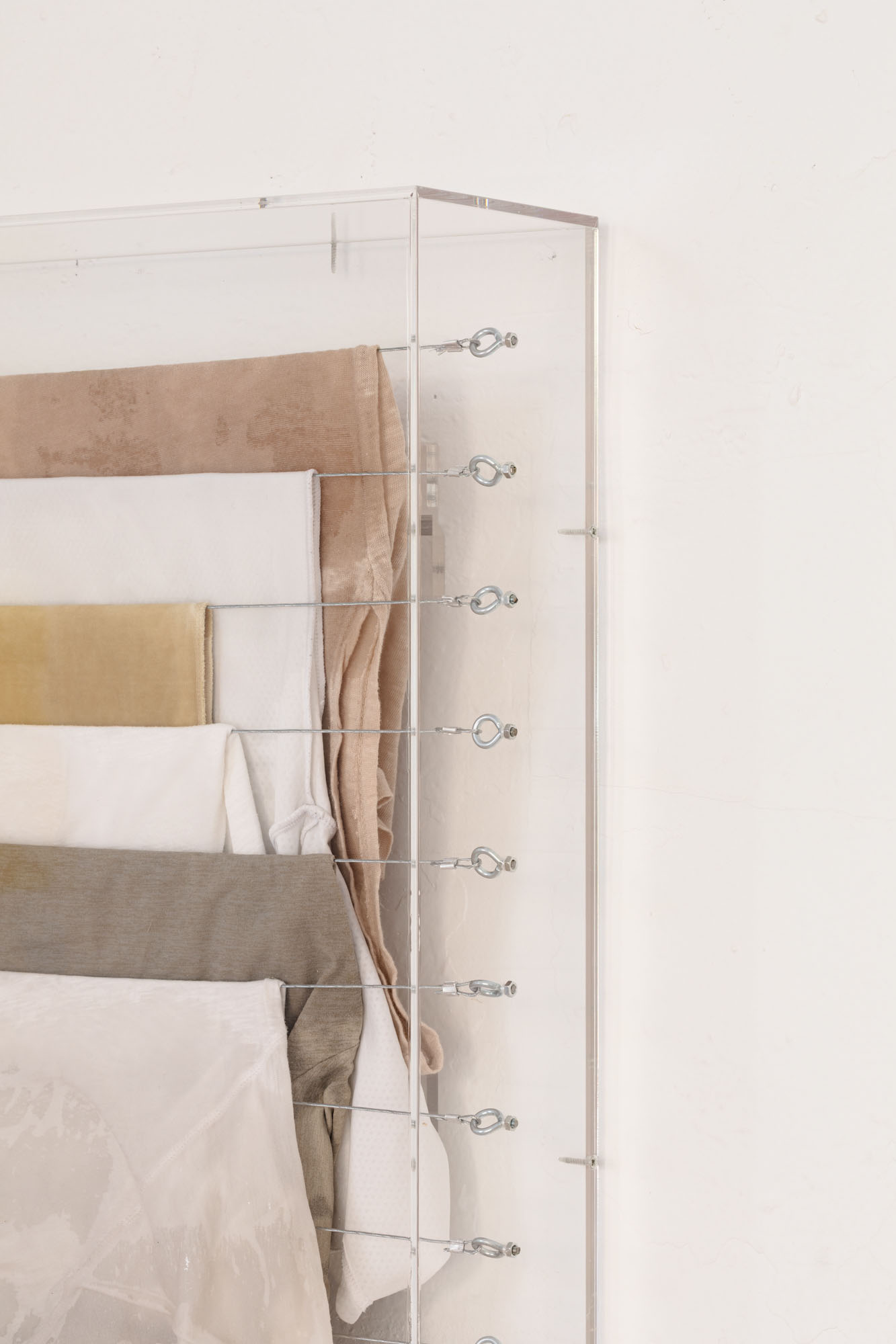I imagine that all your conversations are almost like this exhibition. Timelines (or cross-cuts of time)—clean dissections, slicing through the body of time to study it archaeologically. You move in two languages and sometimes four different accents. Against the clotheslines so meticulously and vertically arranged, your Coladas [‘Washing cycles’] speak a language that is equally abstract but expressive, and shaped like the horizon. The Y-axis is like the left hemisphere of the brain: logical, mathematical, analytical, craving order. The X-axis is its counterpart: passionate, chaotic, prone to fantasy. Together, they form a grid. Resin helps you petrify in a practically liquid state. It mimics the gloss of water and soap, like an oil stain still fresh on the canvas even after the decades. Everything wrapped in Plexiglas, a material you use both to cover and to display content, like a vitrine holding a relic of the past in a museum. Working inside the box, you arrange, move, and sculpt the fabrics like brushstrokes.