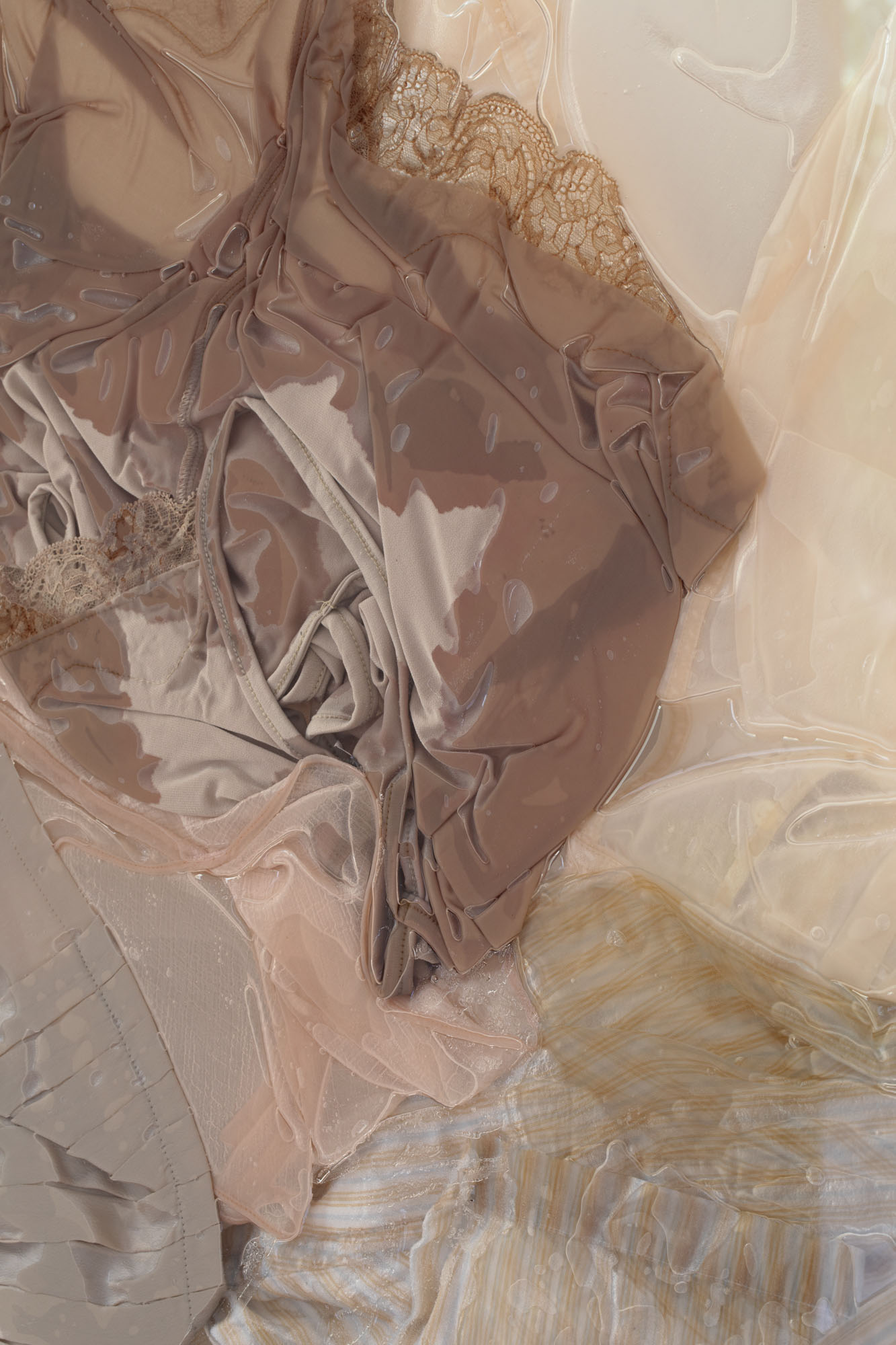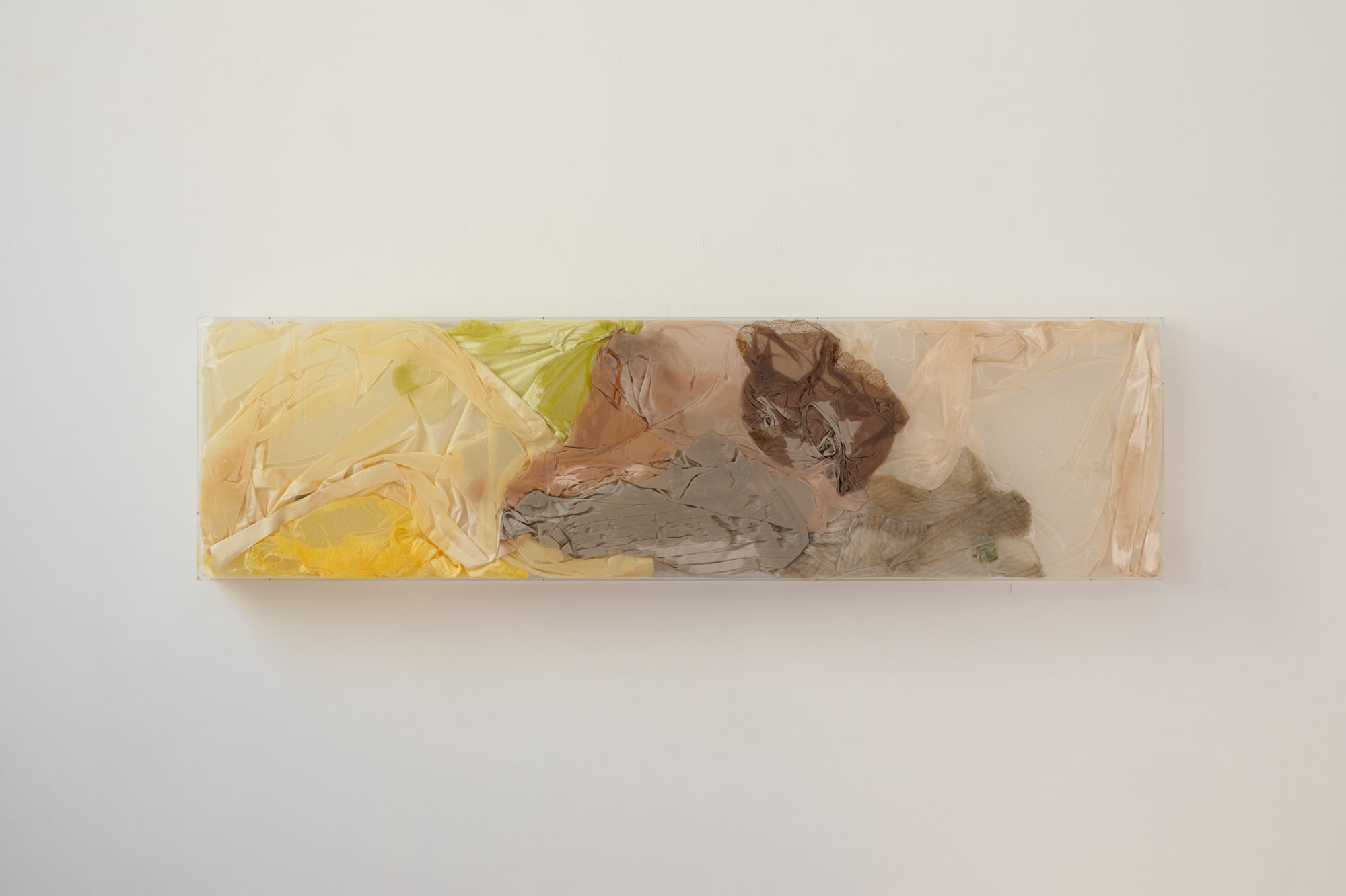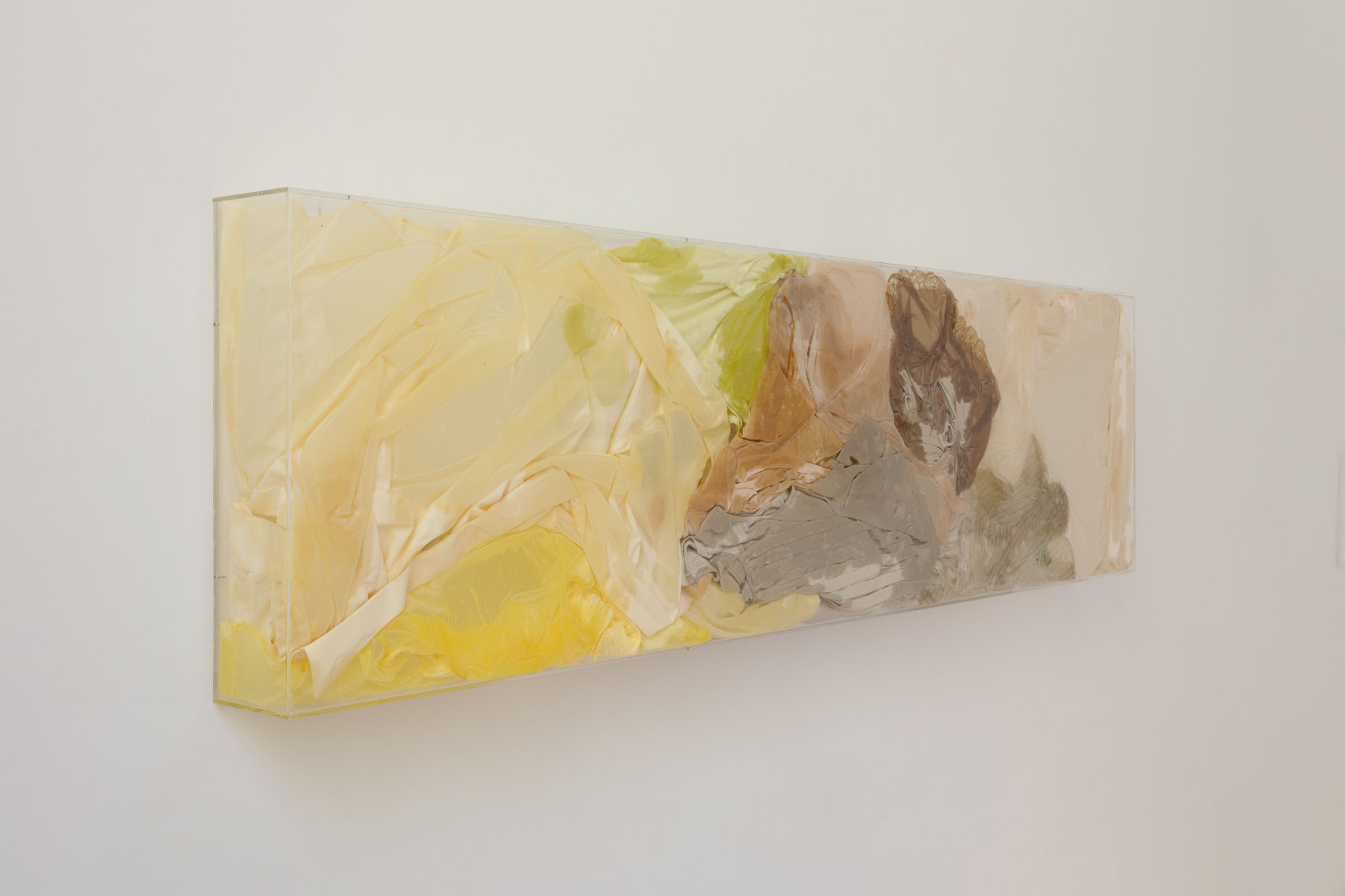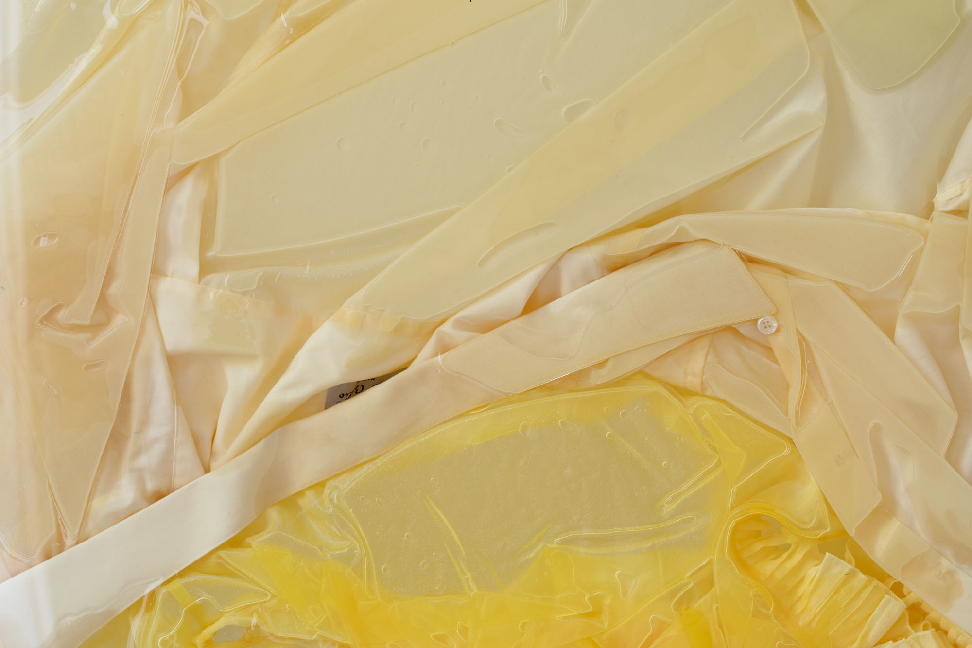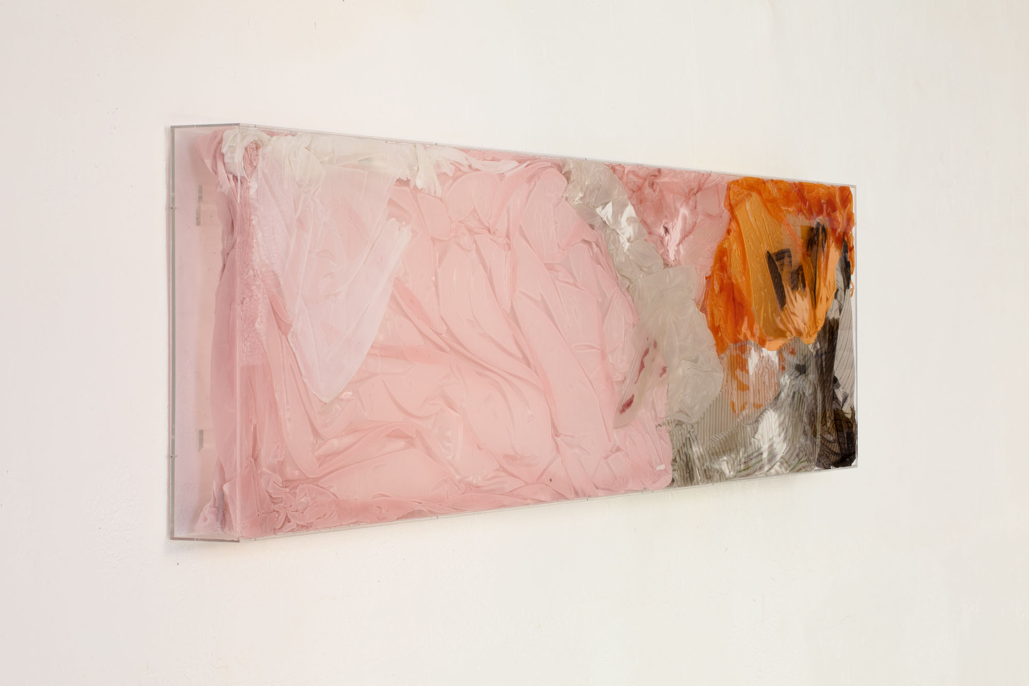 I imagine that all your conversations are almost like this exhibition. Timelines (or cross-cuts of time)—clean dissections, slicing through the body of time to study it archaeologically. You move in two languages and sometimes four different accents. Against the clotheslines so meticulously and vertically arranged, your Coladas [‘Washing cycles’] speak a language that is equally abstract but expressive, and shaped like the horizon. The Y-axis is like the left hemisphere of the brain: logical, mathematical, analytical, craving order. The X-axis is its counterpart: passionate, chaotic, prone to fantasy. Together, they form a grid. Resin helps you petrify in a practically liquid state. It mimics the gloss of water and soap, like an oil stain still fresh on the canvas even after the decades. Everything wrapped in Plexiglas, a material you use both to cover and to display content, like a vitrine holding a relic of the past in a museum. Working inside the box, you arrange, move, and sculpt the fabrics like brushstrokes.