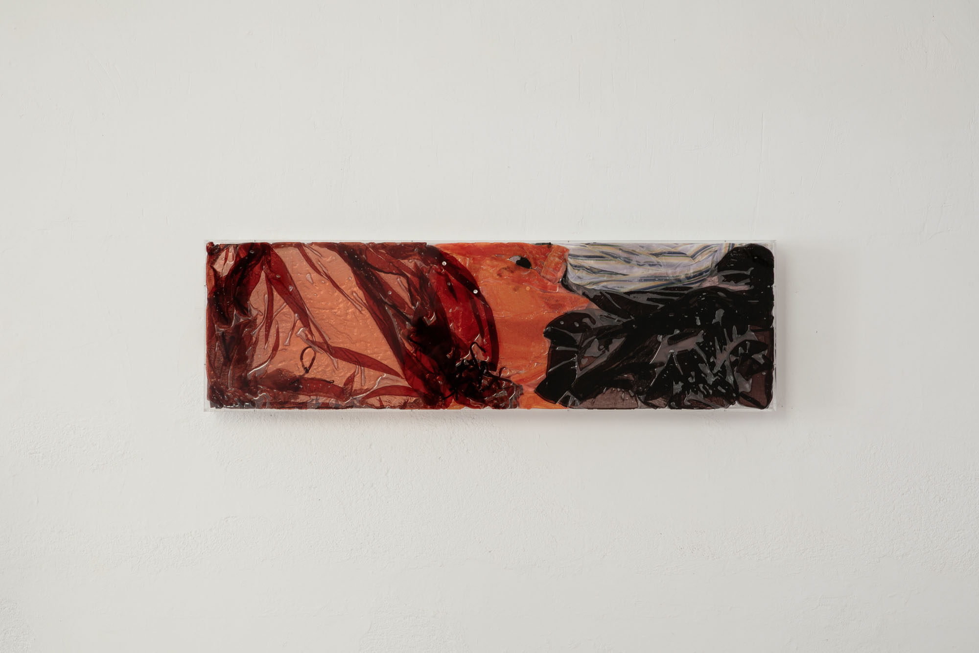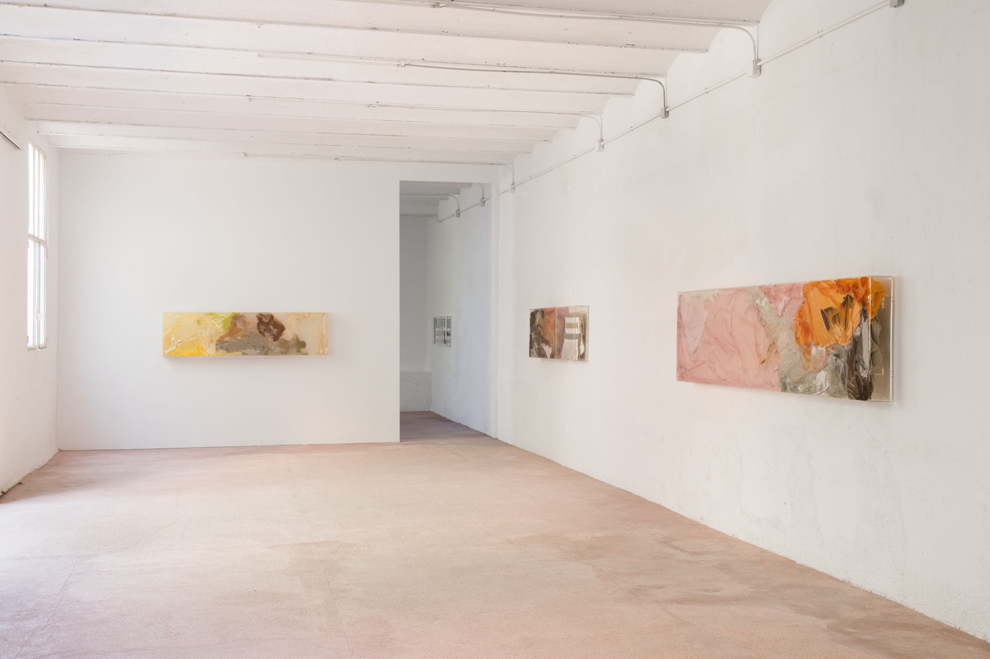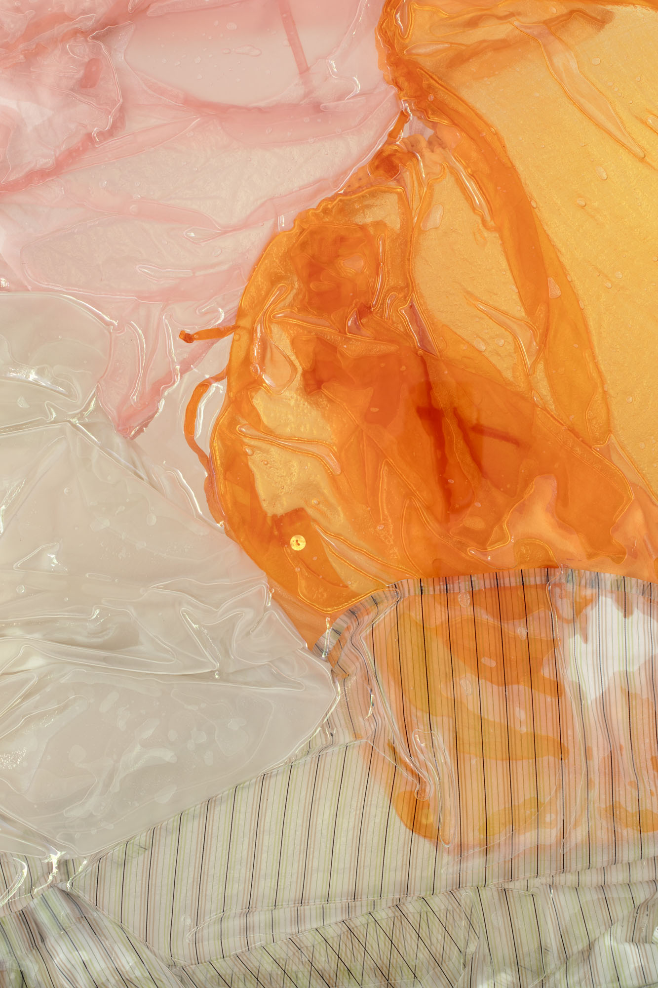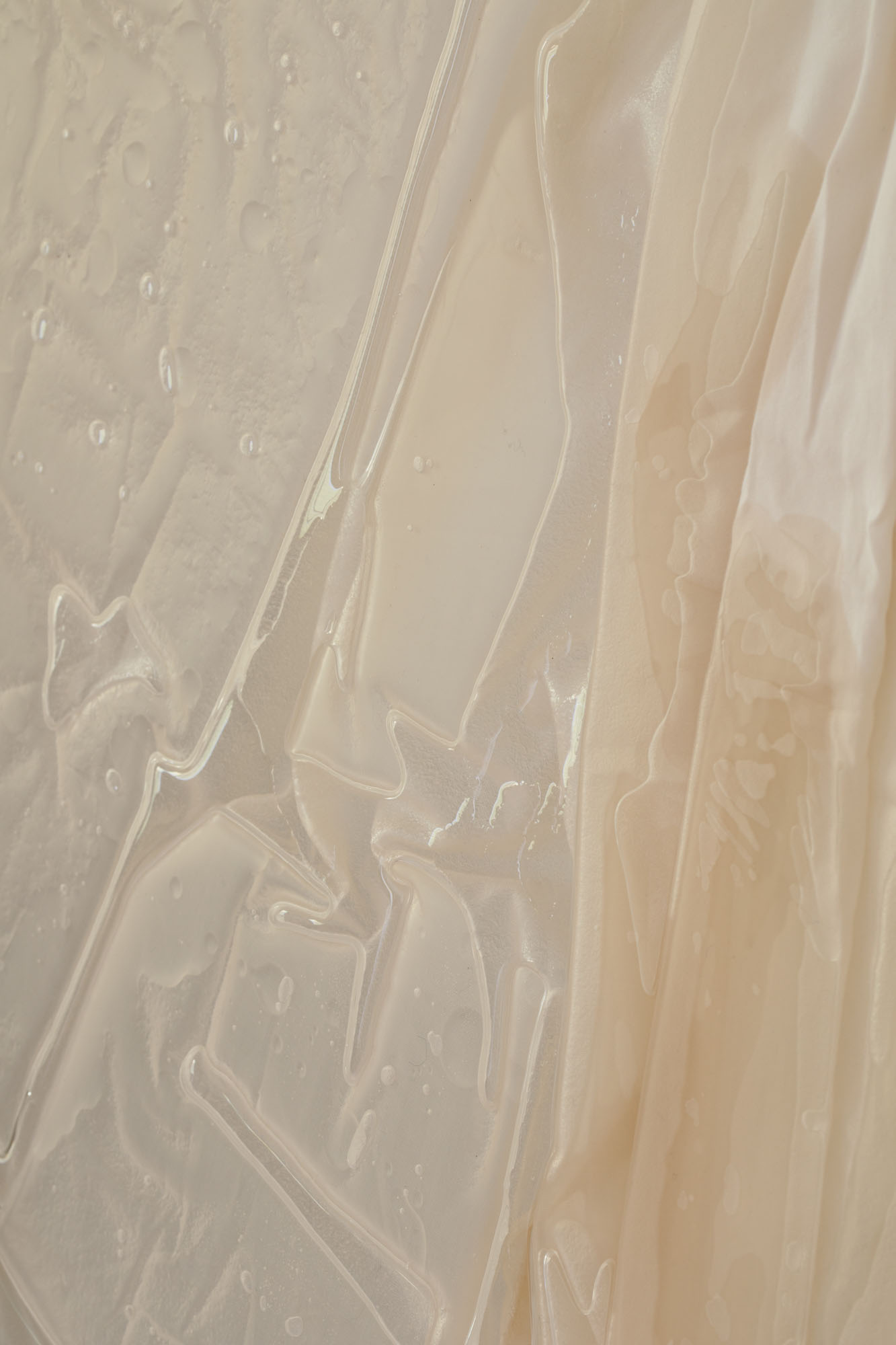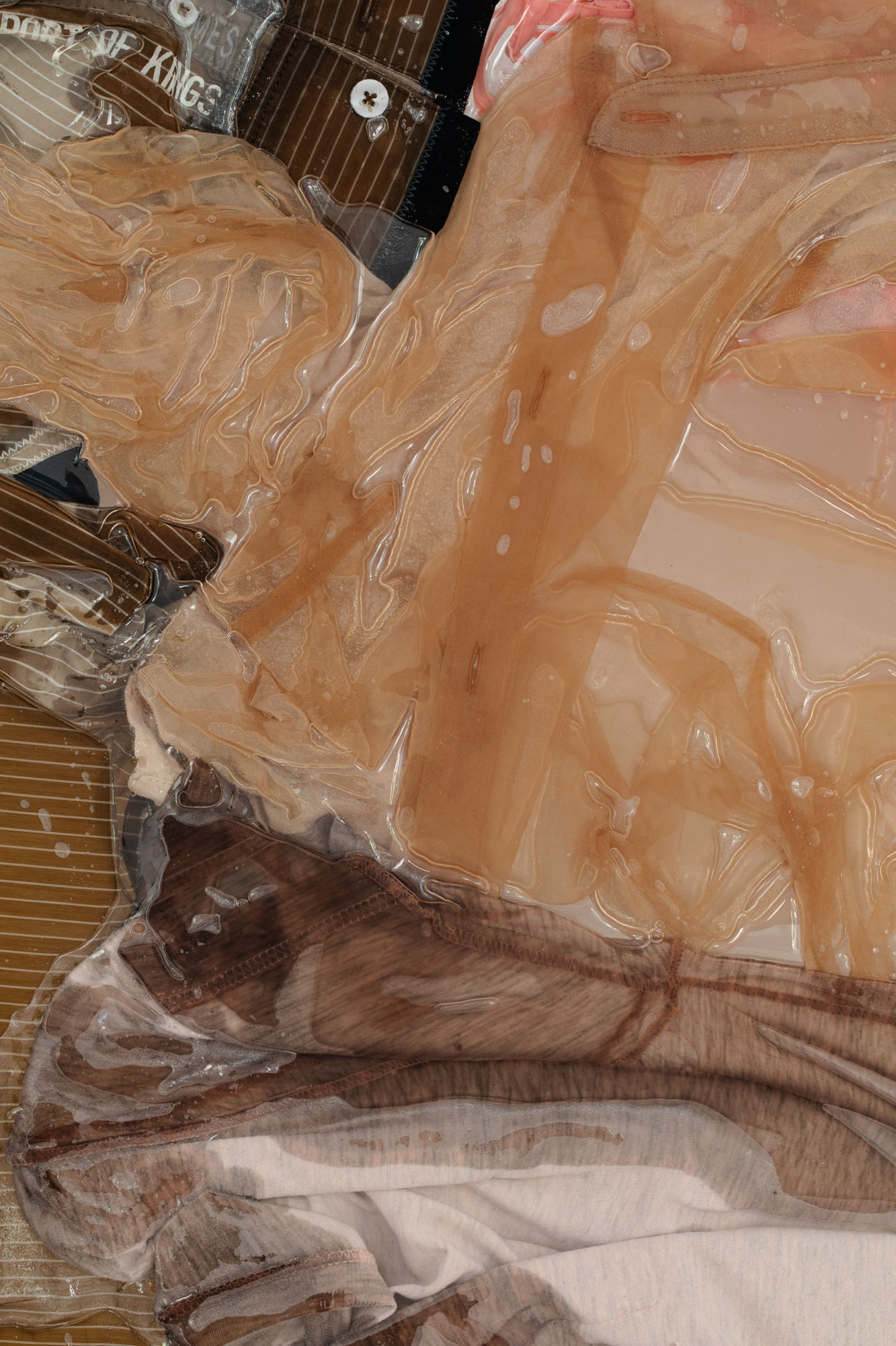 I imagine that all your conversations are almost like this exhibition. Timelines (or cross-cuts of time)—clean dissections, slicing through the body of time to study it archaeologically. You move in two languages and sometimes four different accents. Against the clotheslines so meticulously and vertically arranged, your Coladas [‘Washing cycles’] speak a language that is equally abstract but expressive, and shaped like the horizon. The Y-axis is like the left hemisphere of the brain: logical, mathematical, analytical, craving order. The X-axis is its counterpart: passionate, chaotic, prone to fantasy. Together, they form a grid. Resin helps you petrify in a practically liquid state. It mimics the gloss of water and soap, like an oil stain still fresh on the canvas even after the decades. Everything wrapped in Plexiglas, a material you use both to cover and to display content, like a vitrine holding a relic of the past in a museum. Working inside the box, you arrange, move, and sculpt the fabrics like brushstrokes.