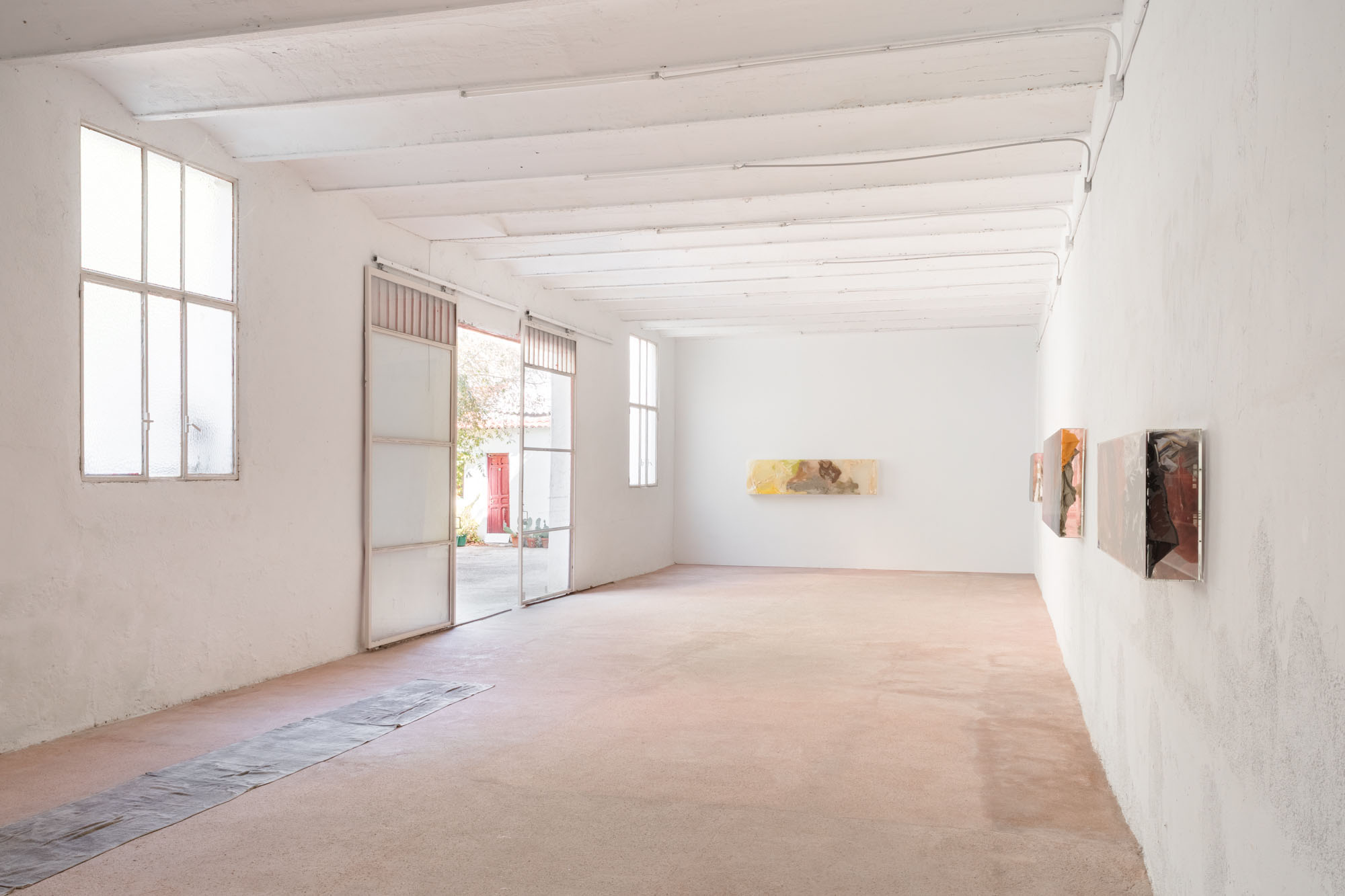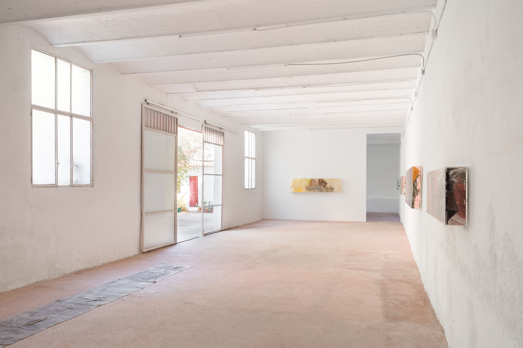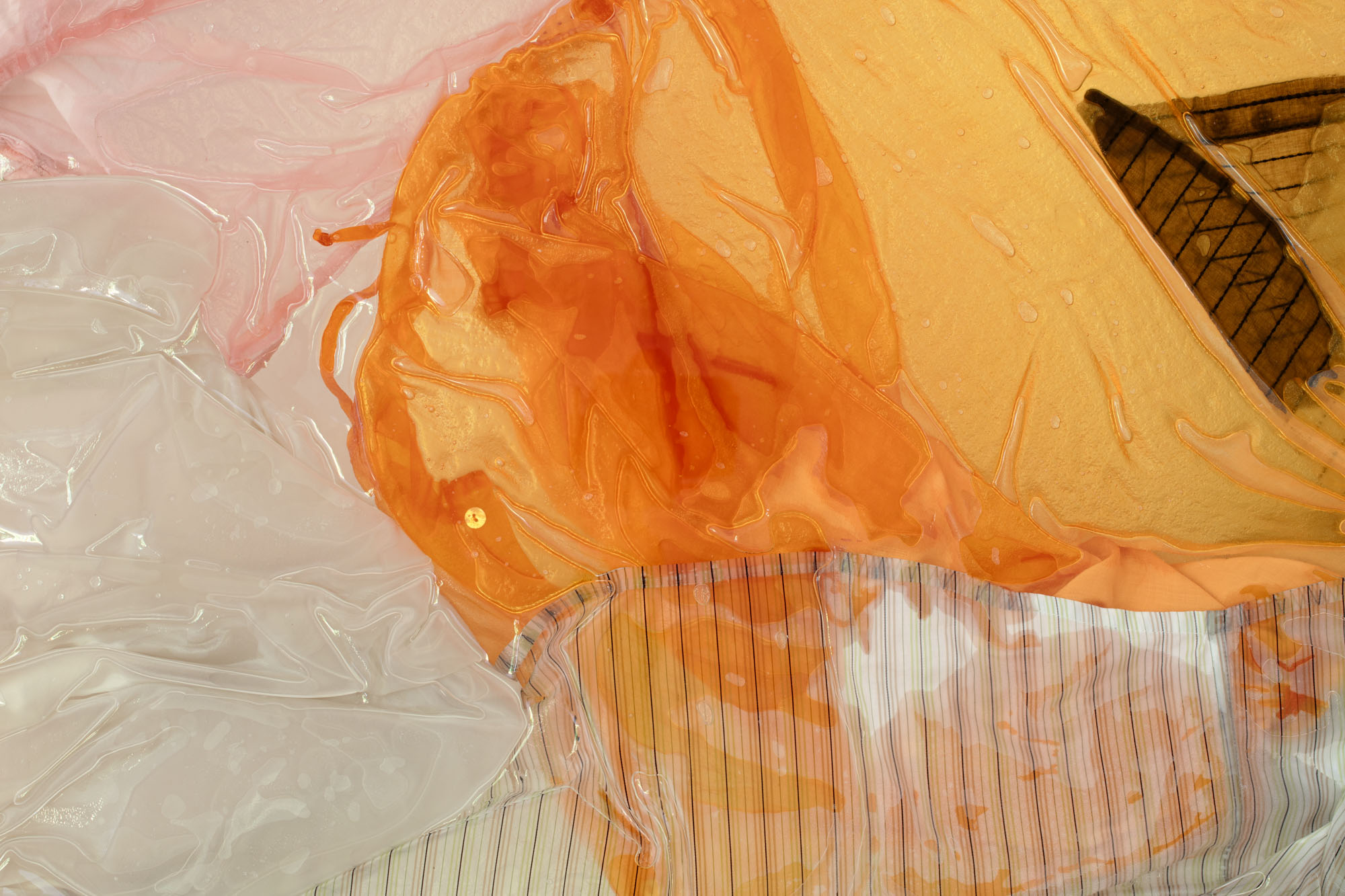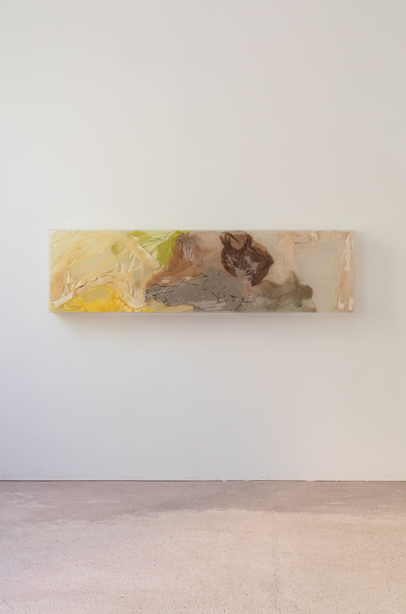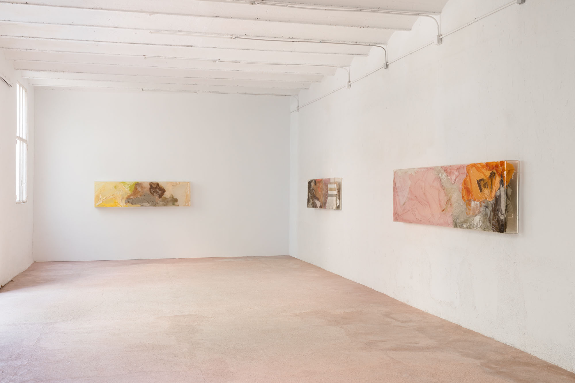 I imagine that all your conversations are almost like this exhibition. Timelines (or cross-cuts of time)—clean dissections, slicing through the body of time to study it archaeologically. You move in two languages and sometimes four different accents. Against the clotheslines so meticulously and vertically arranged, your Coladas [‘Washing cycles’] speak a language that is equally abstract but expressive, and shaped like the horizon. The Y-axis is like the left hemisphere of the brain: logical, mathematical, analytical, craving order. The X-axis is its counterpart: passionate, chaotic, prone to fantasy. Together, they form a grid. Resin helps you petrify in a practically liquid state. It mimics the gloss of water and soap, like an oil stain still fresh on the canvas even after the decades. Everything wrapped in Plexiglas, a material you use both to cover and to display content, like a vitrine holding a relic of the past in a museum. Working inside the box, you arrange, move, and sculpt the fabrics like brushstrokes.