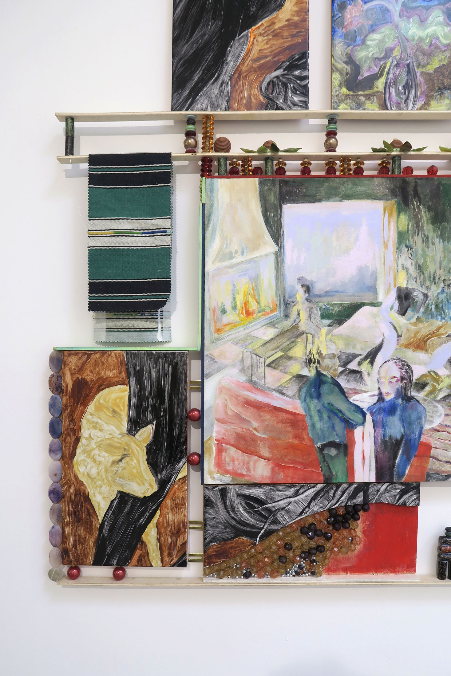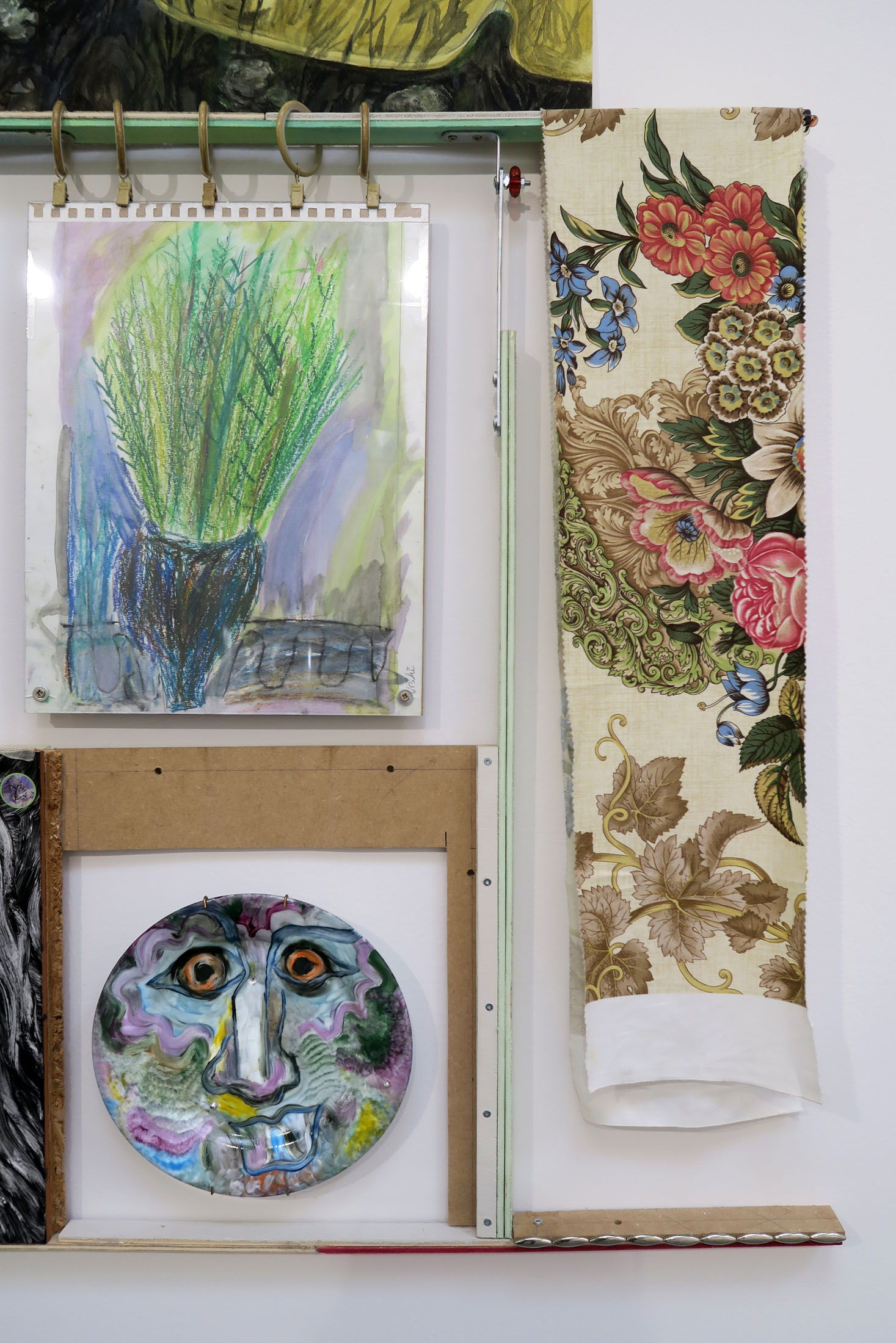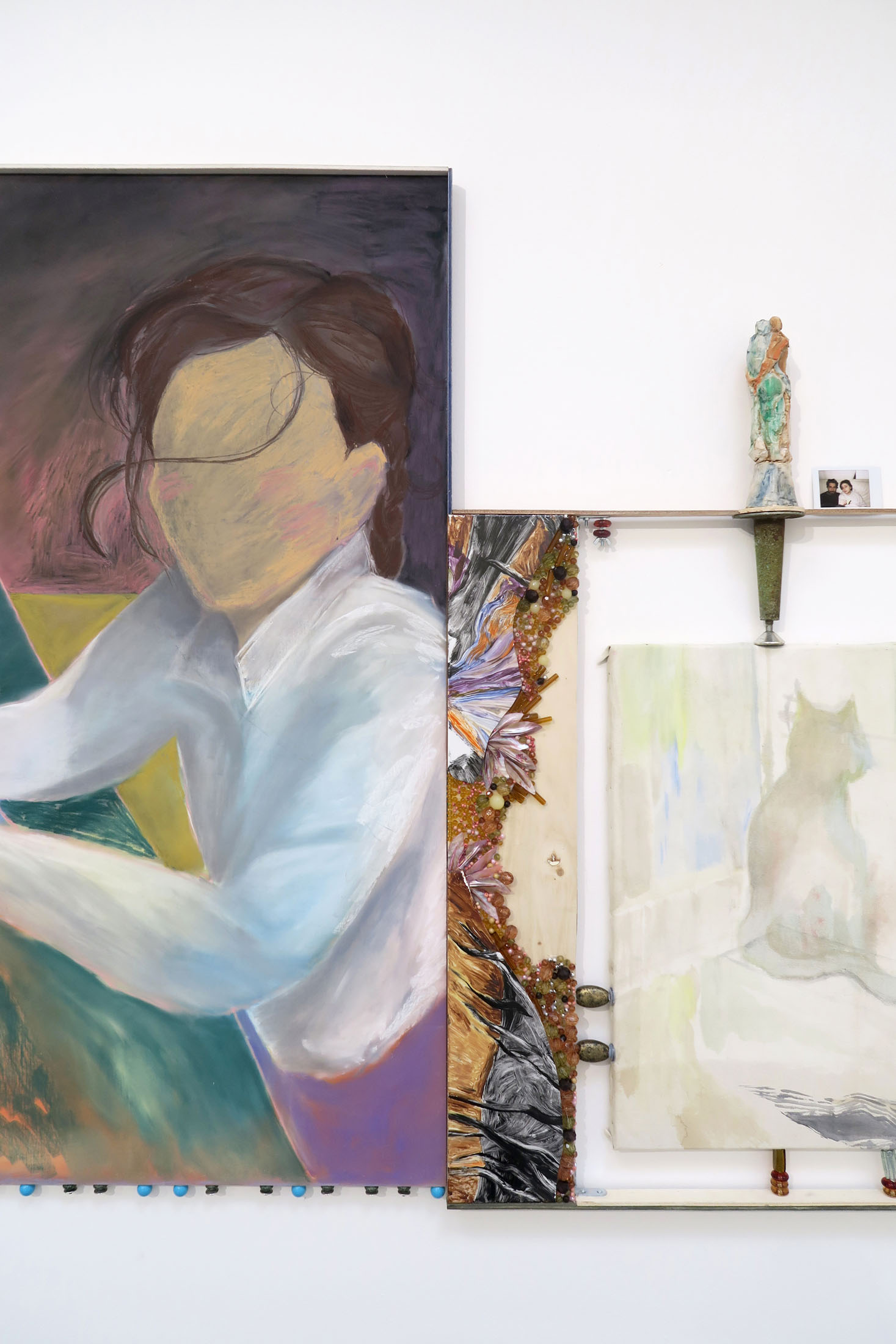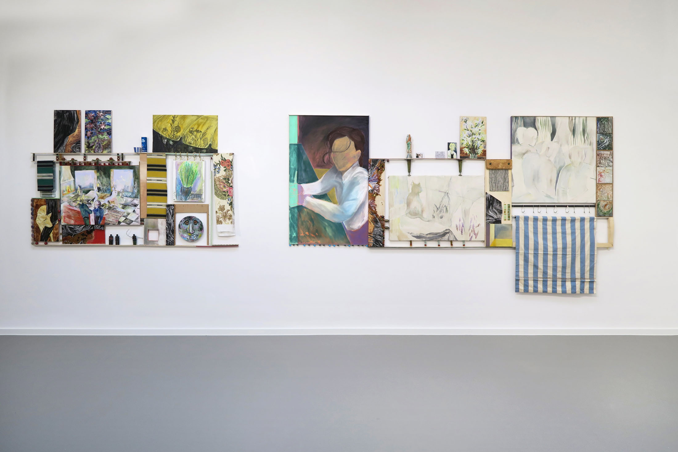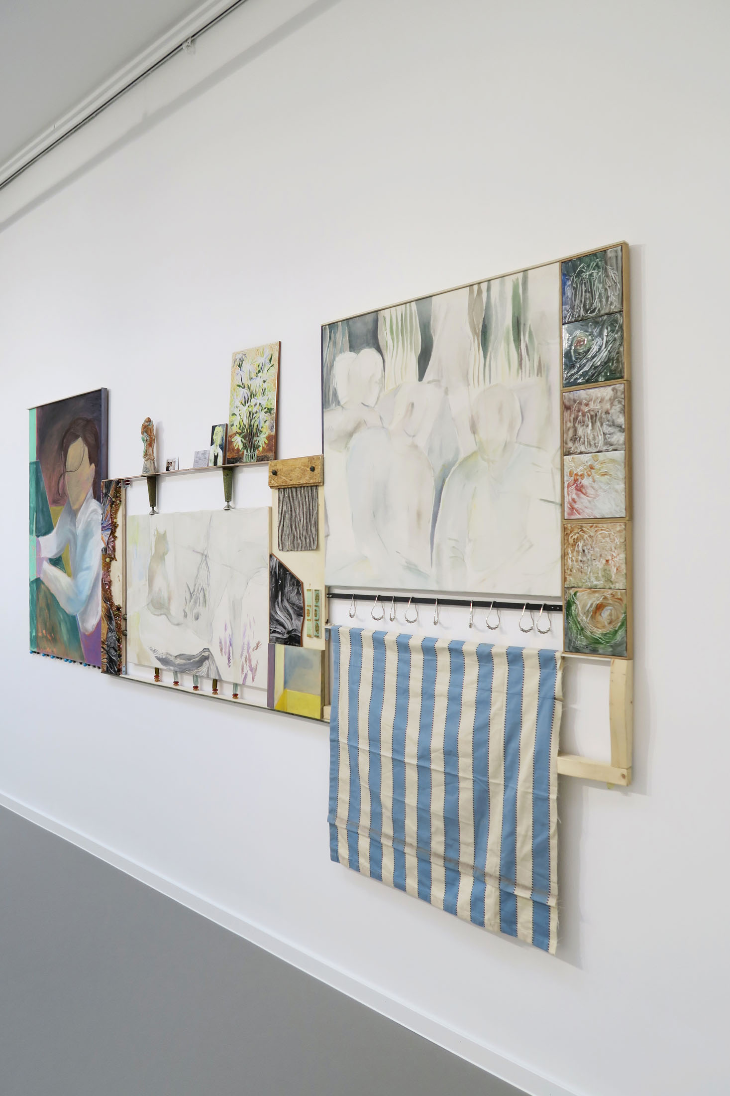 At the entrance, the work Barrier – consisting of a movable gate and a painting – greets visitors. It references rural labor and animal husbandry while also addressing notions of boundaries and belonging. As the first threshold of the exhibition, it marks the passage from the familiar into Jacent’s distinctive cosmos. On the upper floor, a band of objects and materials unfolds like an open, fragmentary timeline. Fabric remnants, floral motifs, small figurines, and pieces of jewelry evoke biographical moments and scenes from daily life. Some elements appear as quick sketches, others condense into more complex image fields, forming a rhythm of moods and memories.
