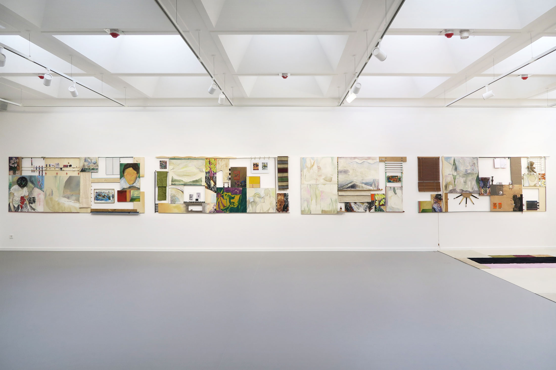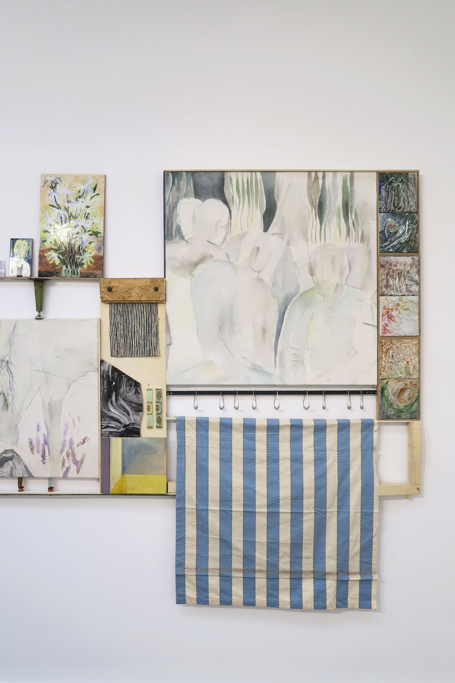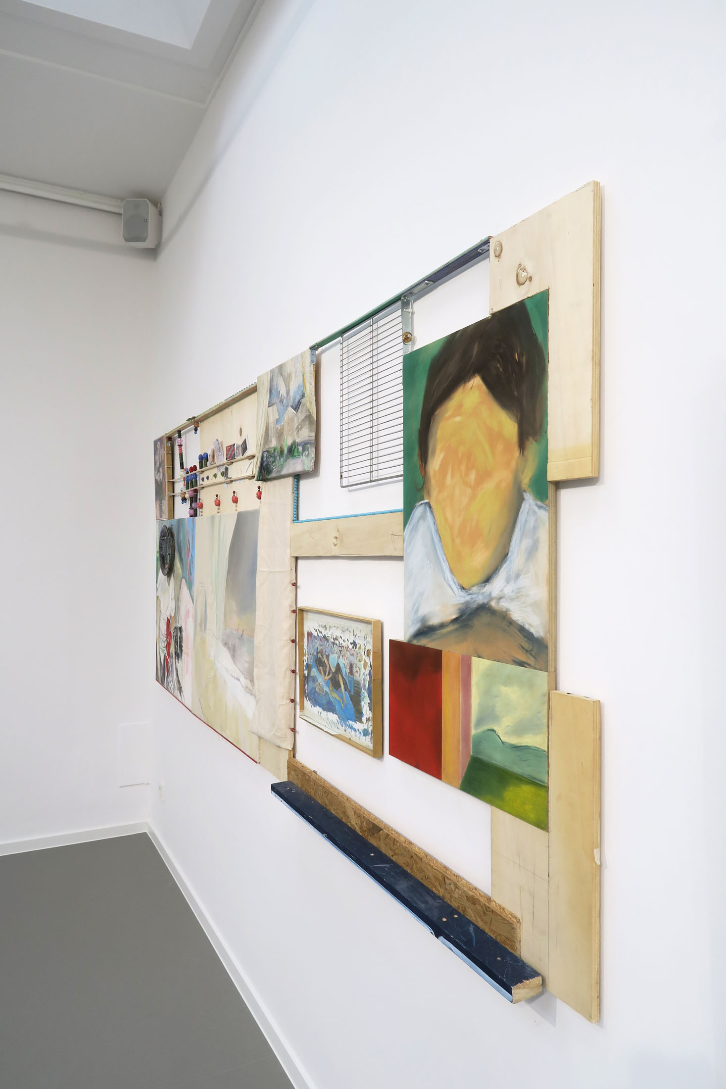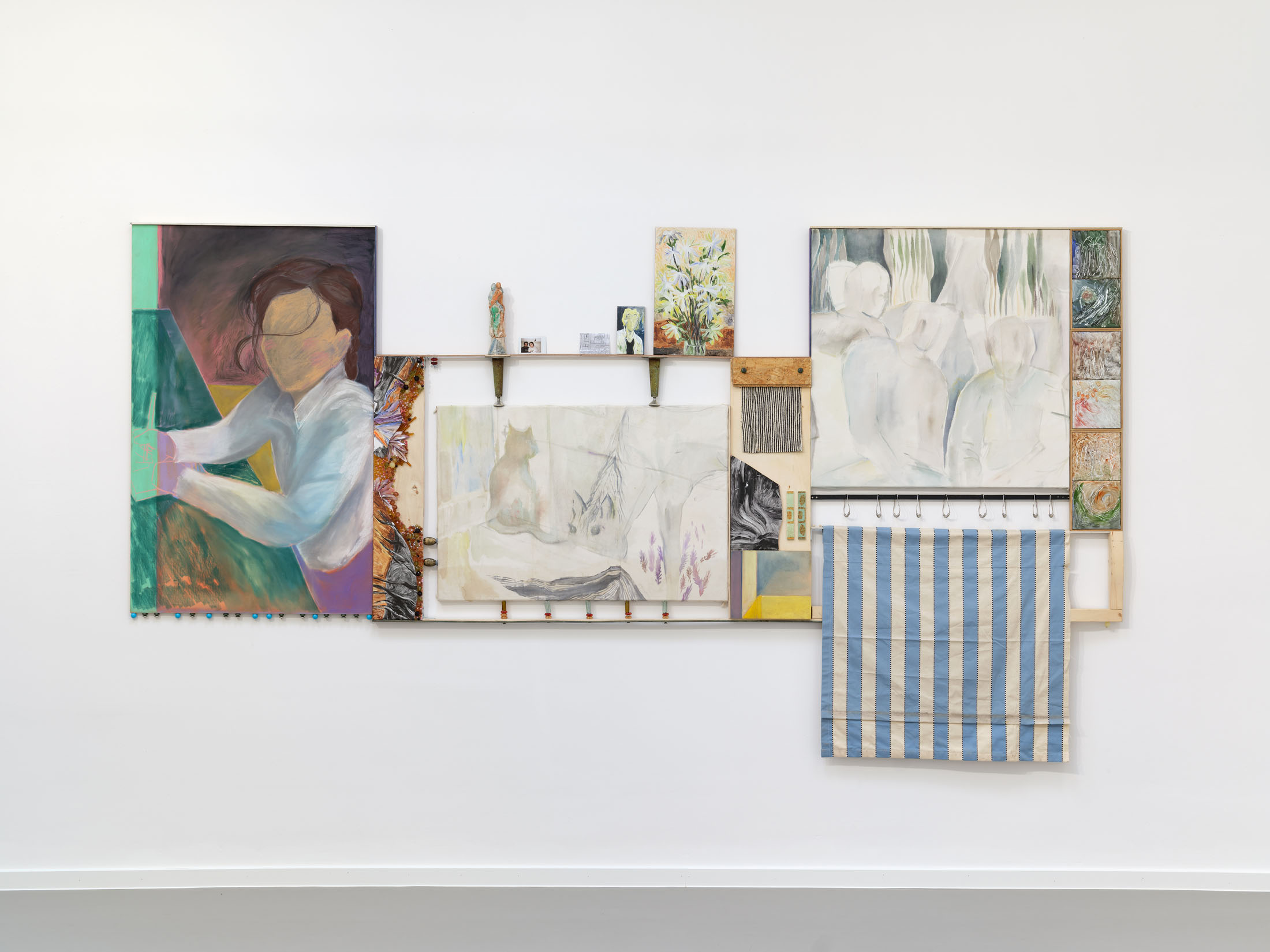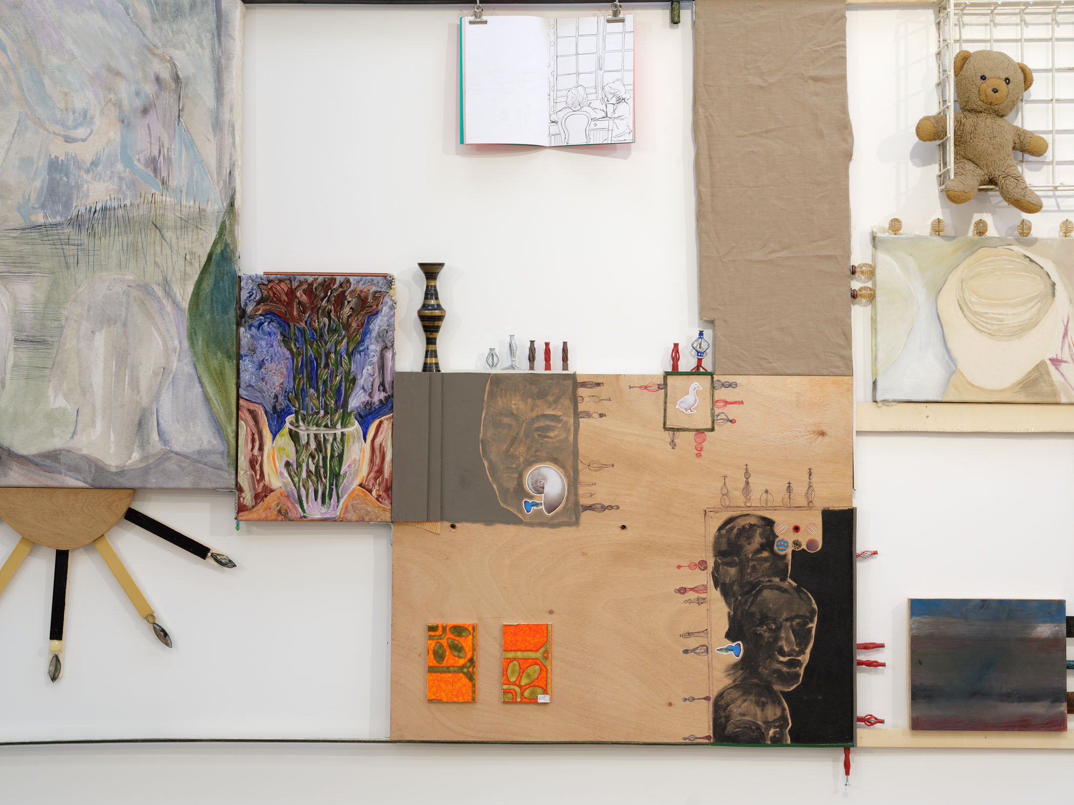 At the entrance, the work Barrier – consisting of a movable gate and a painting – greets visitors. It references rural labor and animal husbandry while also addressing notions of boundaries and belonging. As the first threshold of the exhibition, it marks the passage from the familiar into Jacent’s distinctive cosmos. On the upper floor, a band of objects and materials unfolds like an open, fragmentary timeline. Fabric remnants, floral motifs, small figurines, and pieces of jewelry evoke biographical moments and scenes from daily life. Some elements appear as quick sketches, others condense into more complex image fields, forming a rhythm of moods and memories.